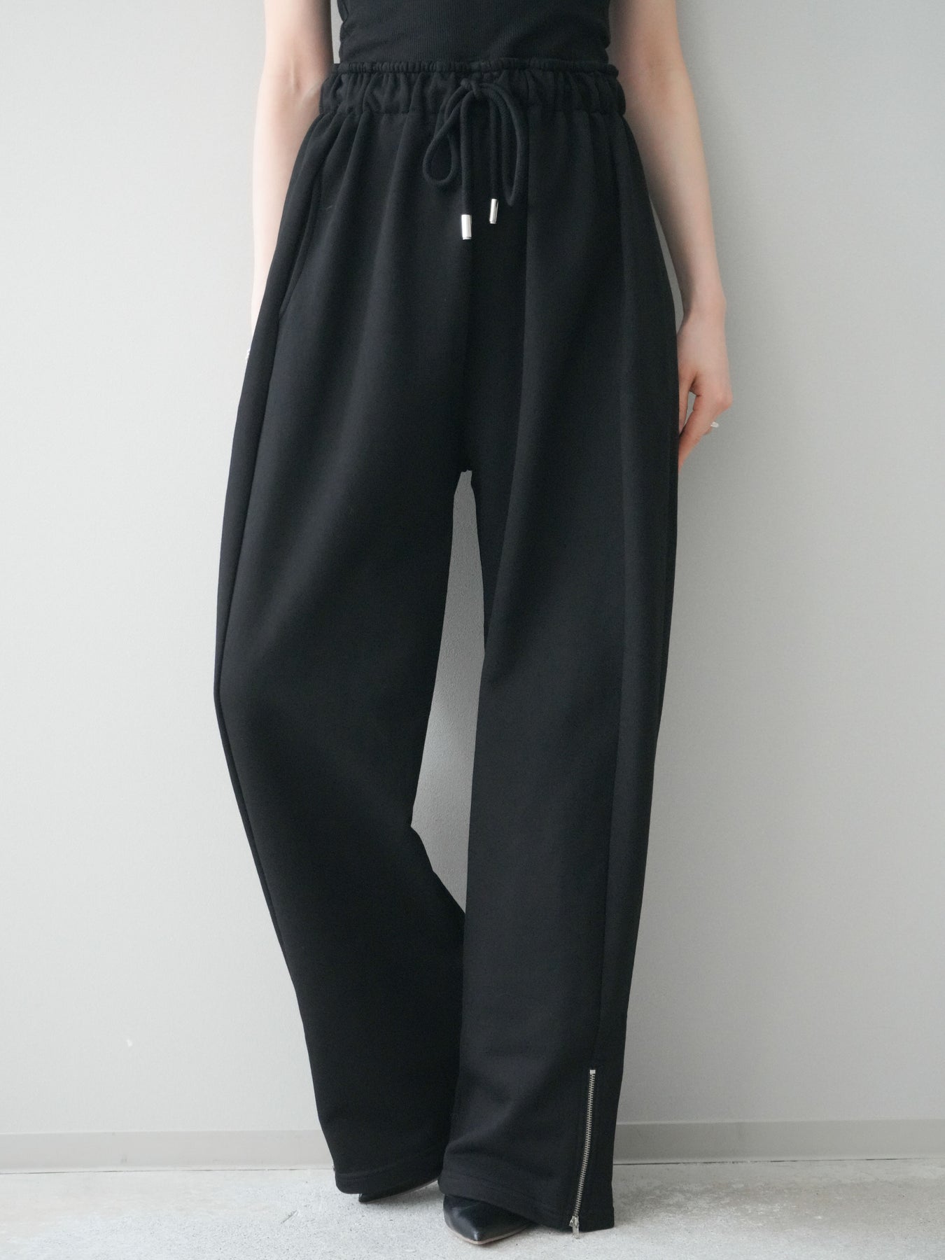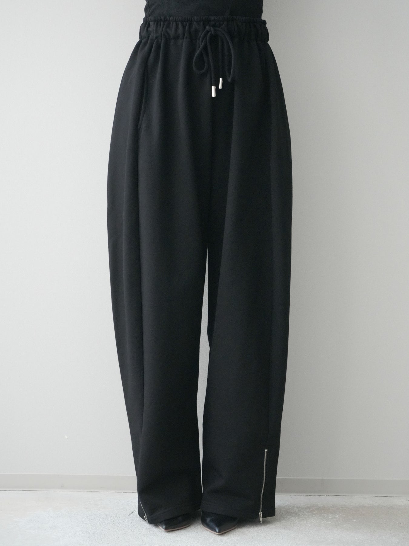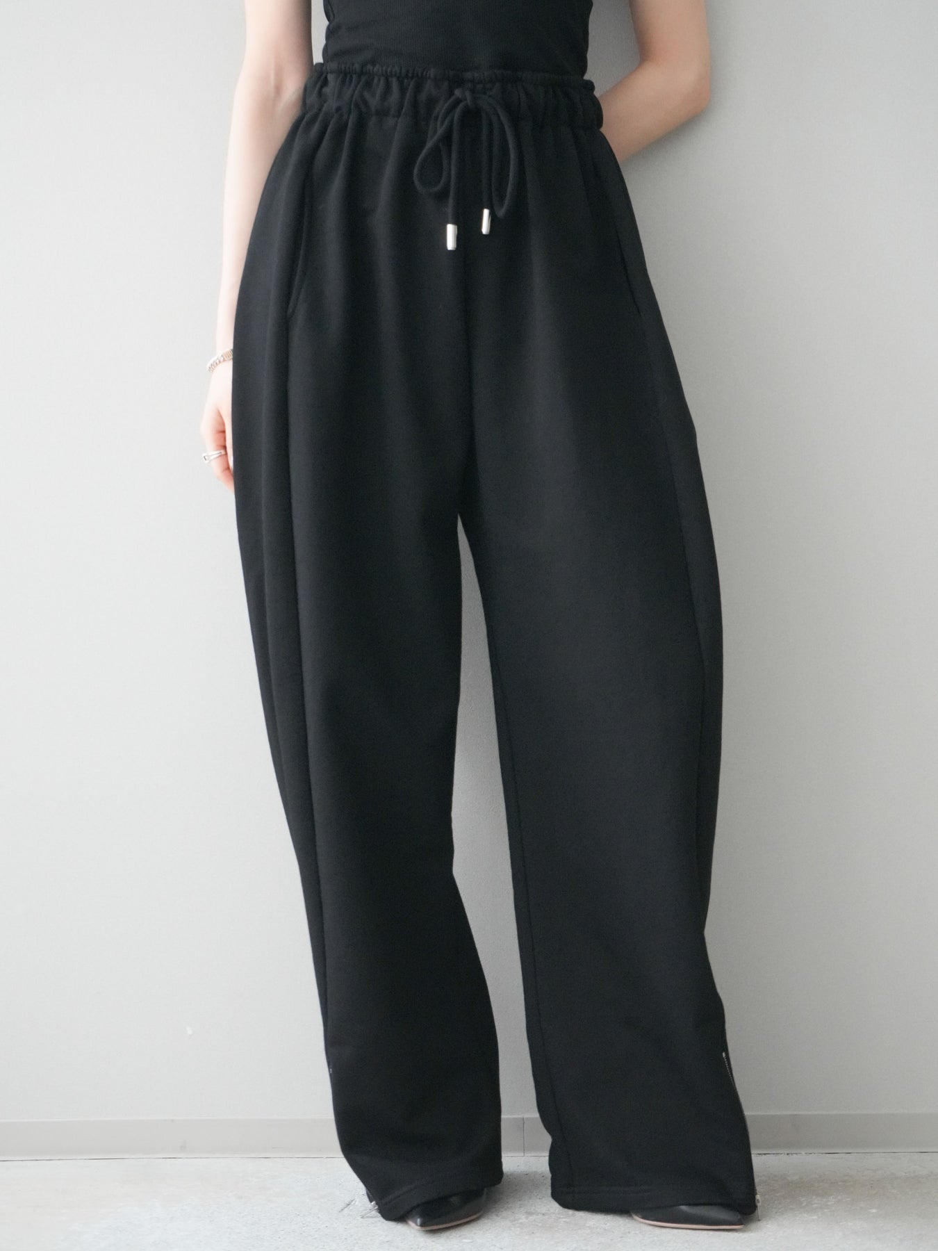 リラックス感と洗練された印象を兼ね備えたスエット素材のワイドパンツ。程よく落ち感のあるシルエットが脚のラインを拾いにくく、自然に体型をカバーしてくれます。ウエストはゴム仕様で穿き心地が良く、デイリー使いにも取り入れやすいデザイン。裾にはZIPを施し、開閉によってシルエットや足元の印象に変化をつけられるのもポイントです。カジュアルになりすぎず、きれいめトップスとも相性が良いため、幅広いスタイリングに活躍する一本です。