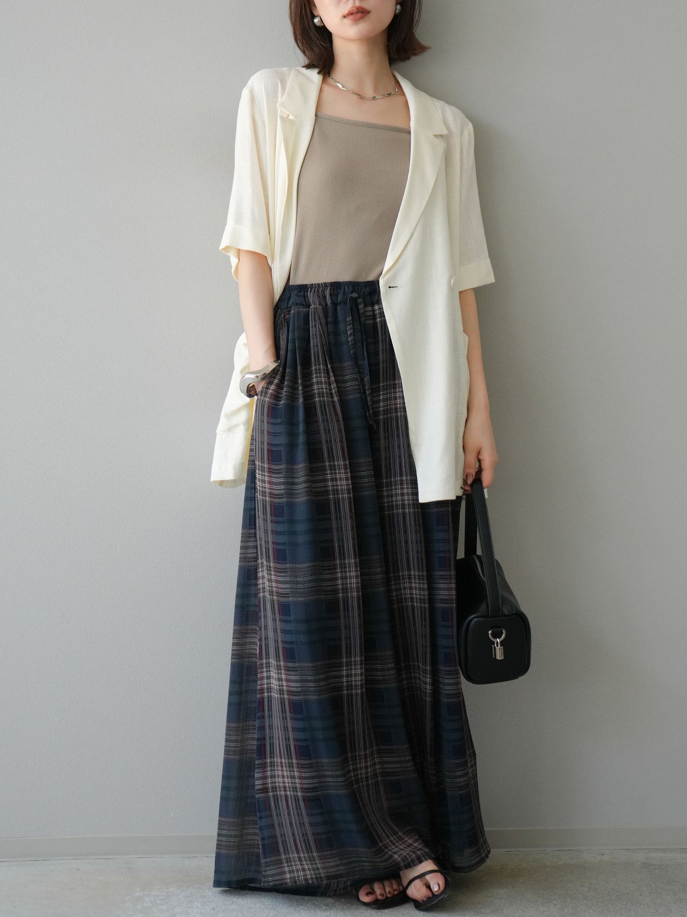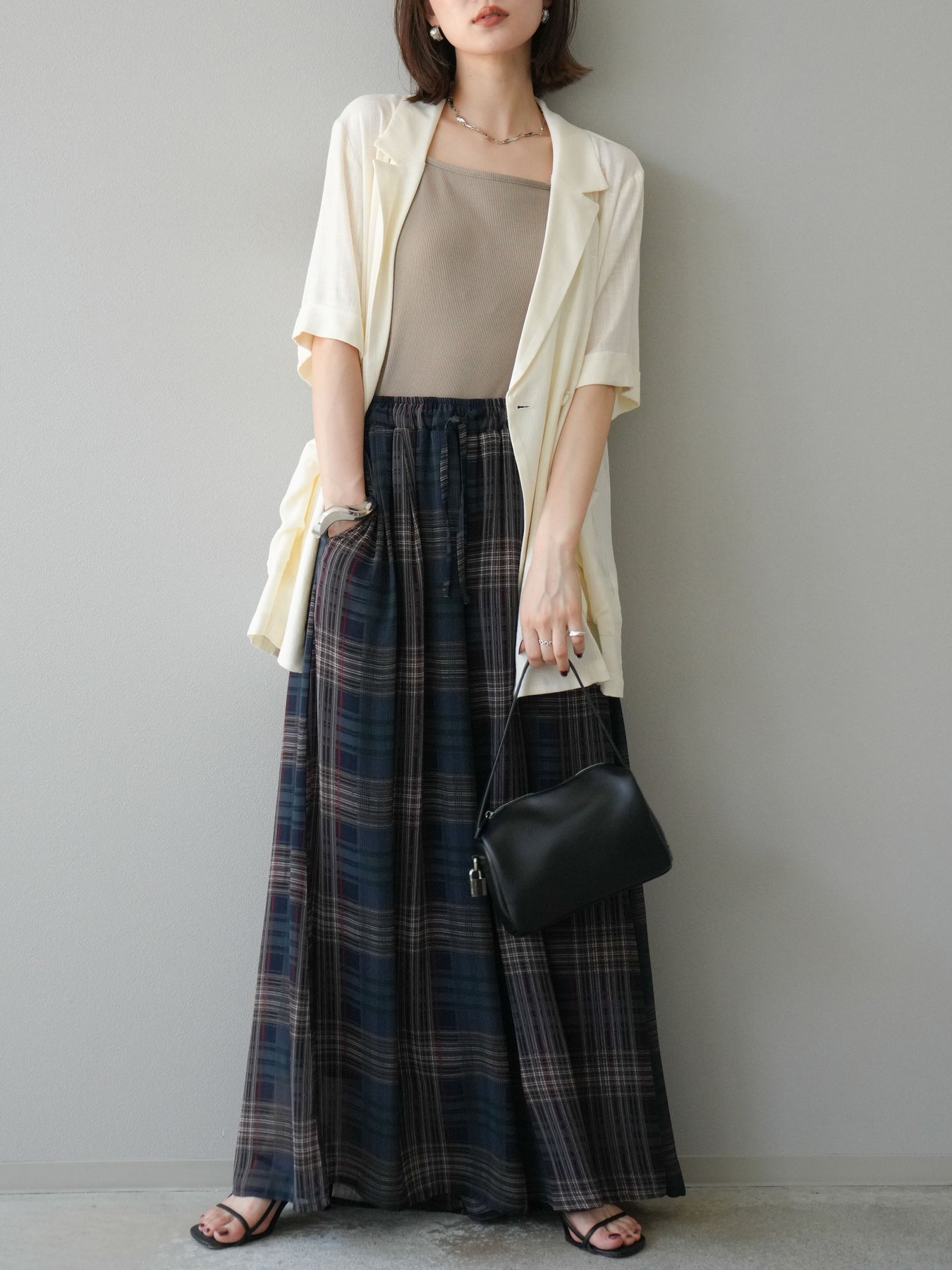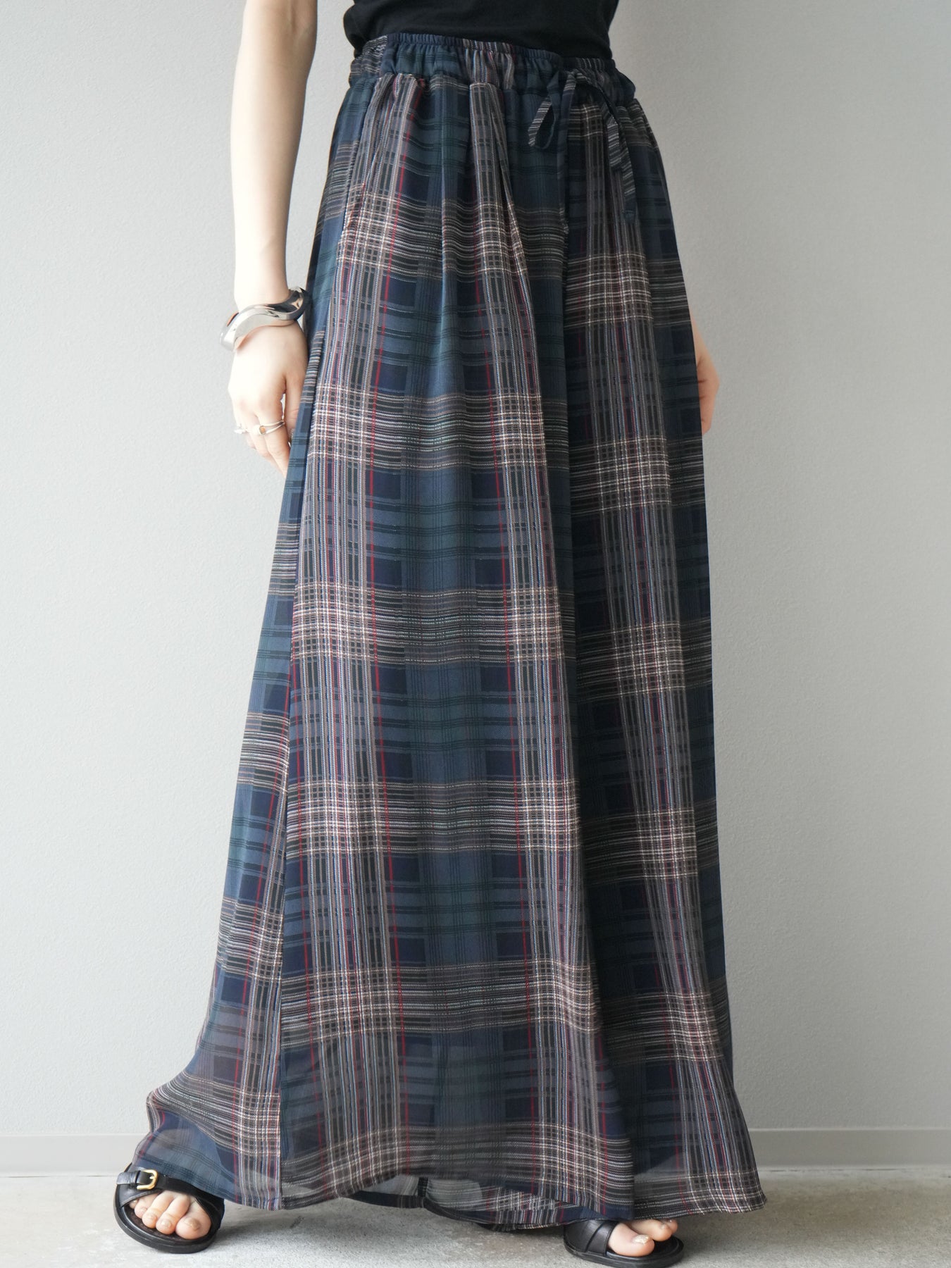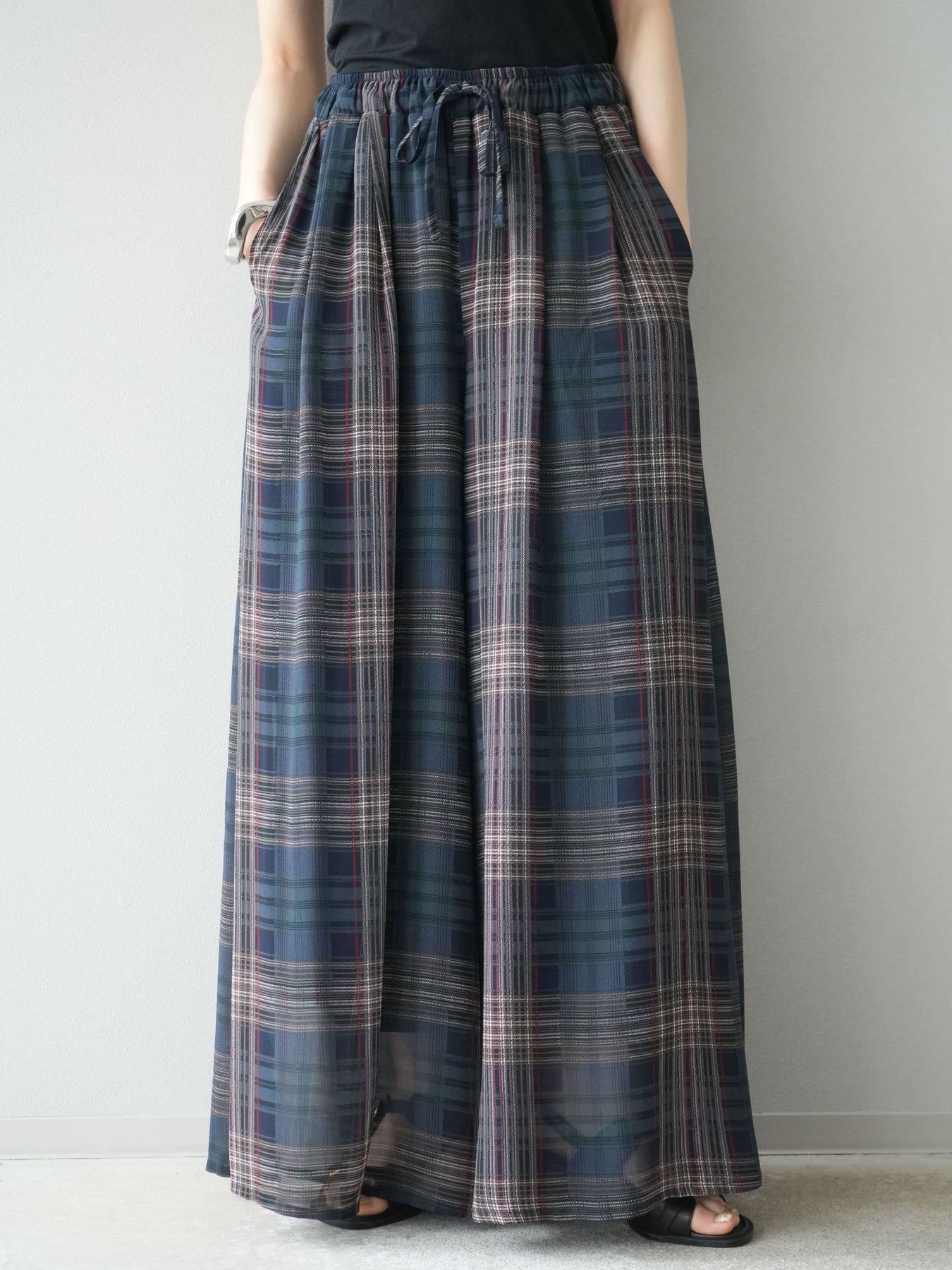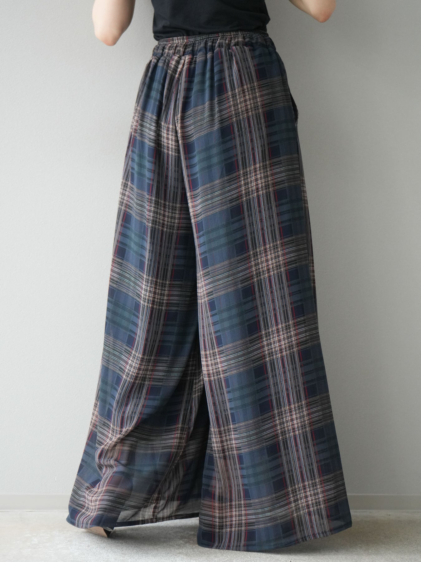 這款寬鬆褲休閒成熟,深色格紋圖案搭配透視布料,更能襯托出季節的氛圍。適度的透明度營造出輕盈飄逸的感覺,是一條既能提升時尚感又不失休閒感的褲子。 腰部採用全彈性設計,並配有抽繩,穿著舒適。布料厚實,垂墜感十足,讓您隨動作優雅擺動。 這是一款引人注目的單品,只需搭配一件簡單的上衣即可為您的服裝增添亮點。