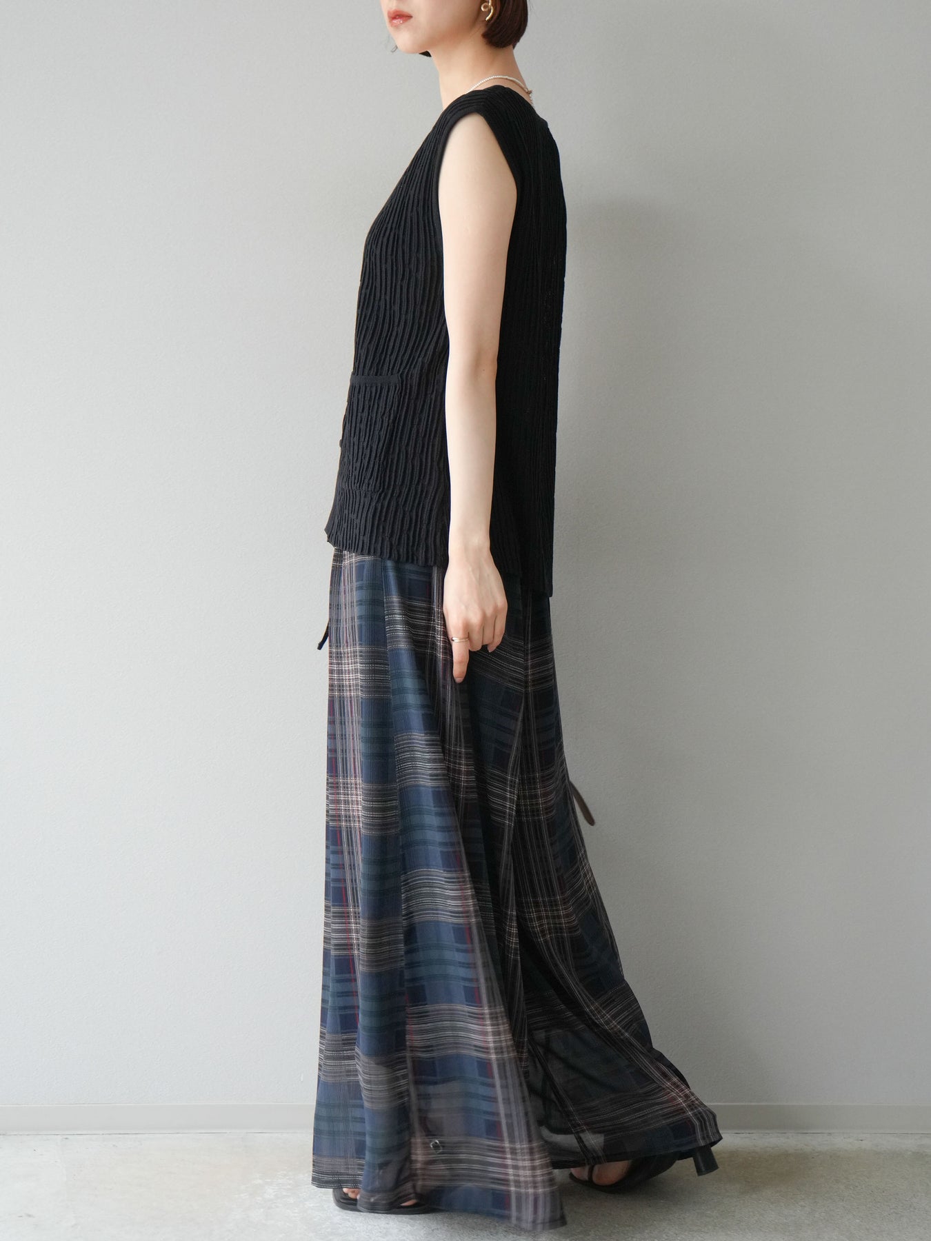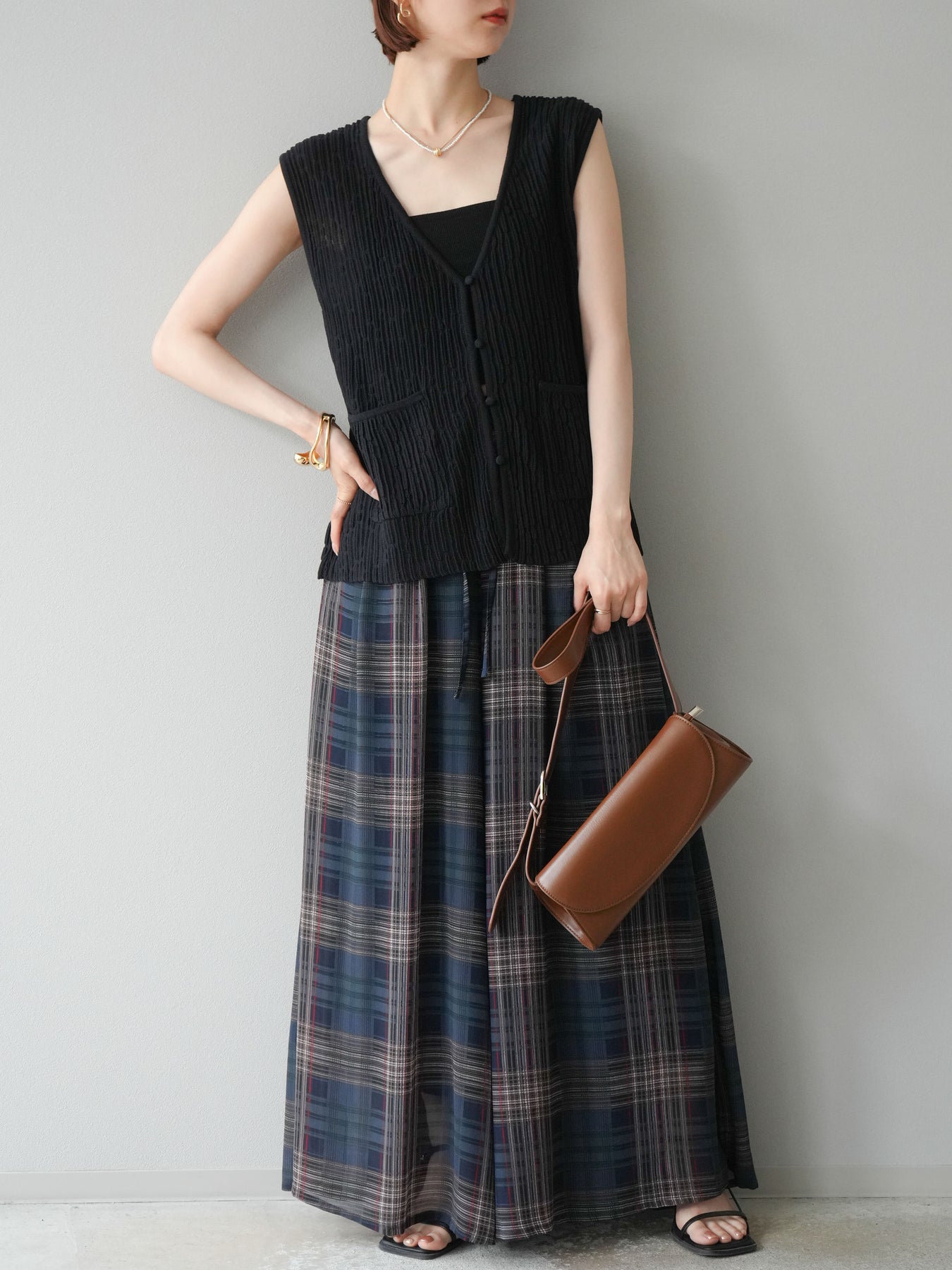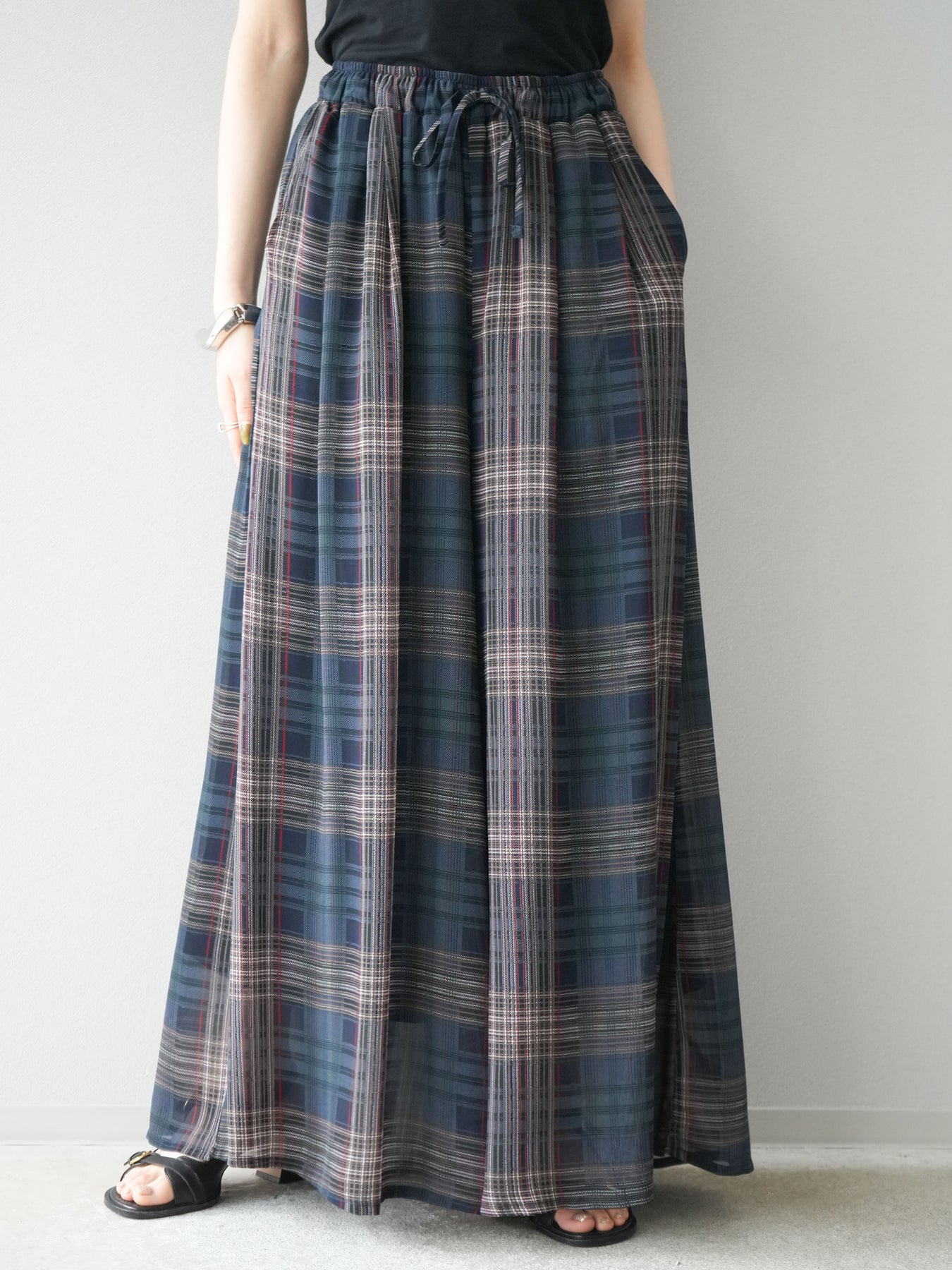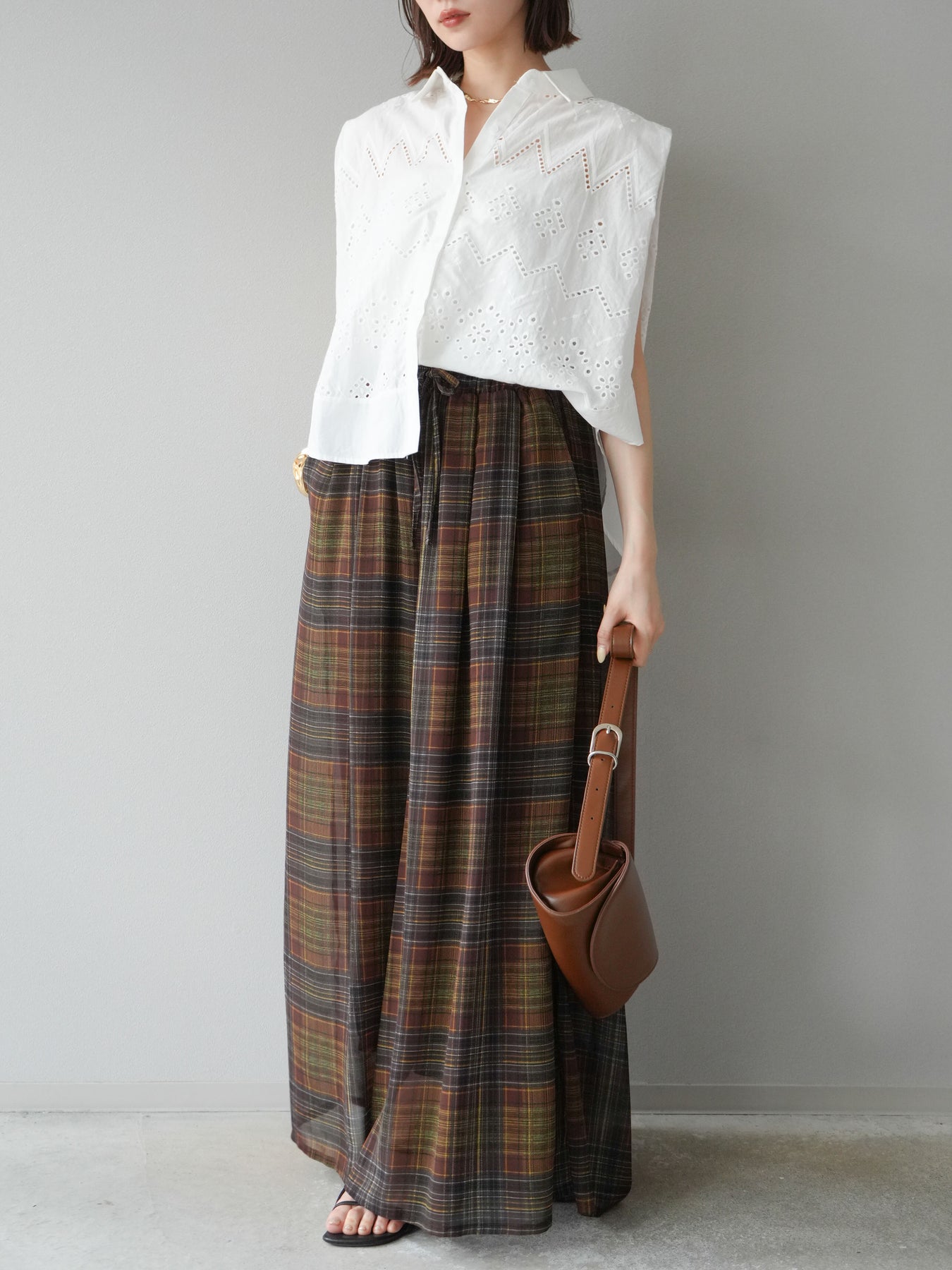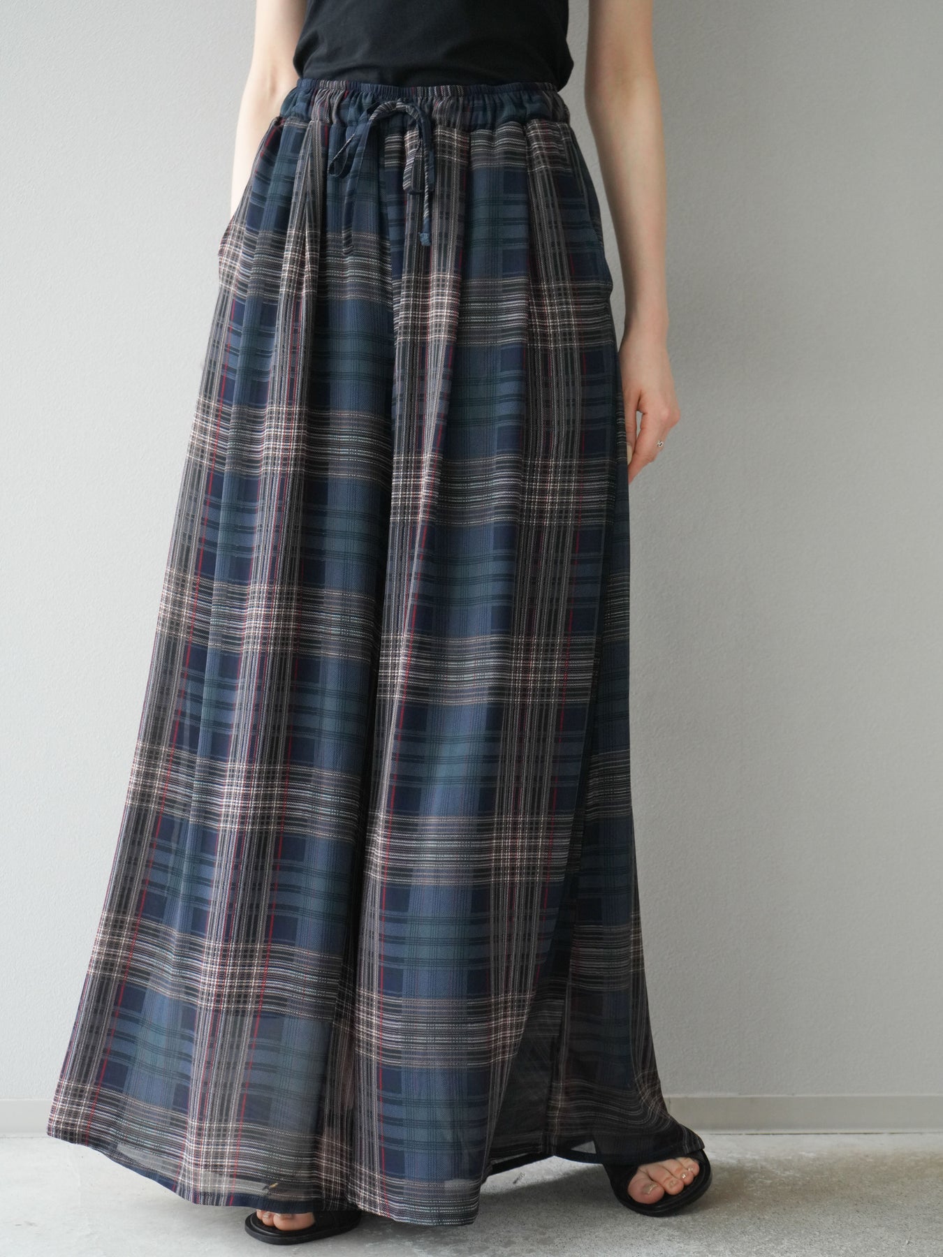 這款寬鬆褲休閒成熟,深色格紋圖案搭配透視布料,更能襯托出季節的氛圍。適度的透明度營造出輕盈飄逸的感覺,是一條既能提升時尚感又不失休閒感的褲子。 腰部採用全彈性設計,並配有抽繩,穿著舒適。布料厚實,垂墜感十足,讓您隨動作優雅擺動。 這是一款引人注目的單品,只需搭配一件簡單的上衣即可為您的服裝增添亮點。