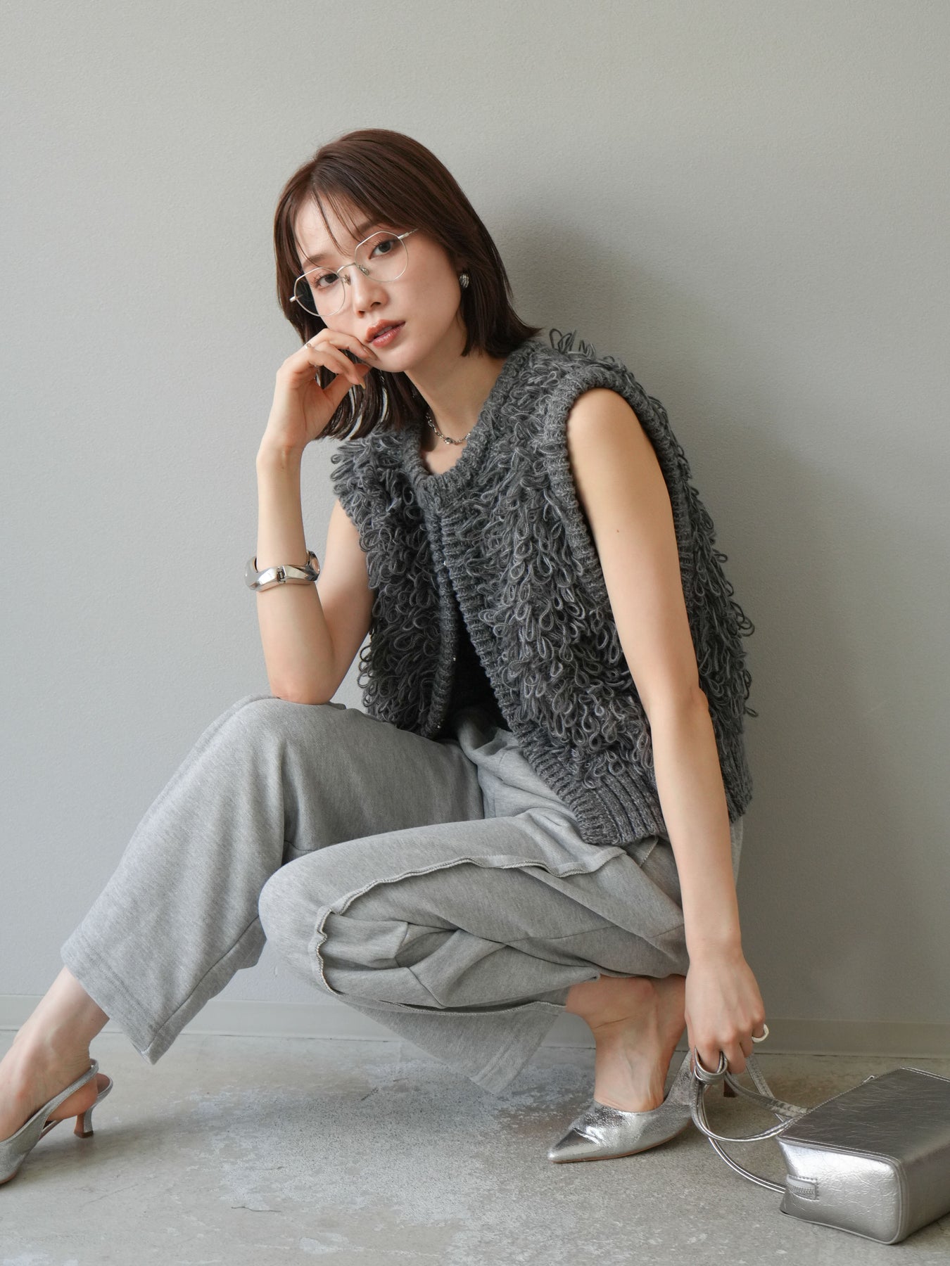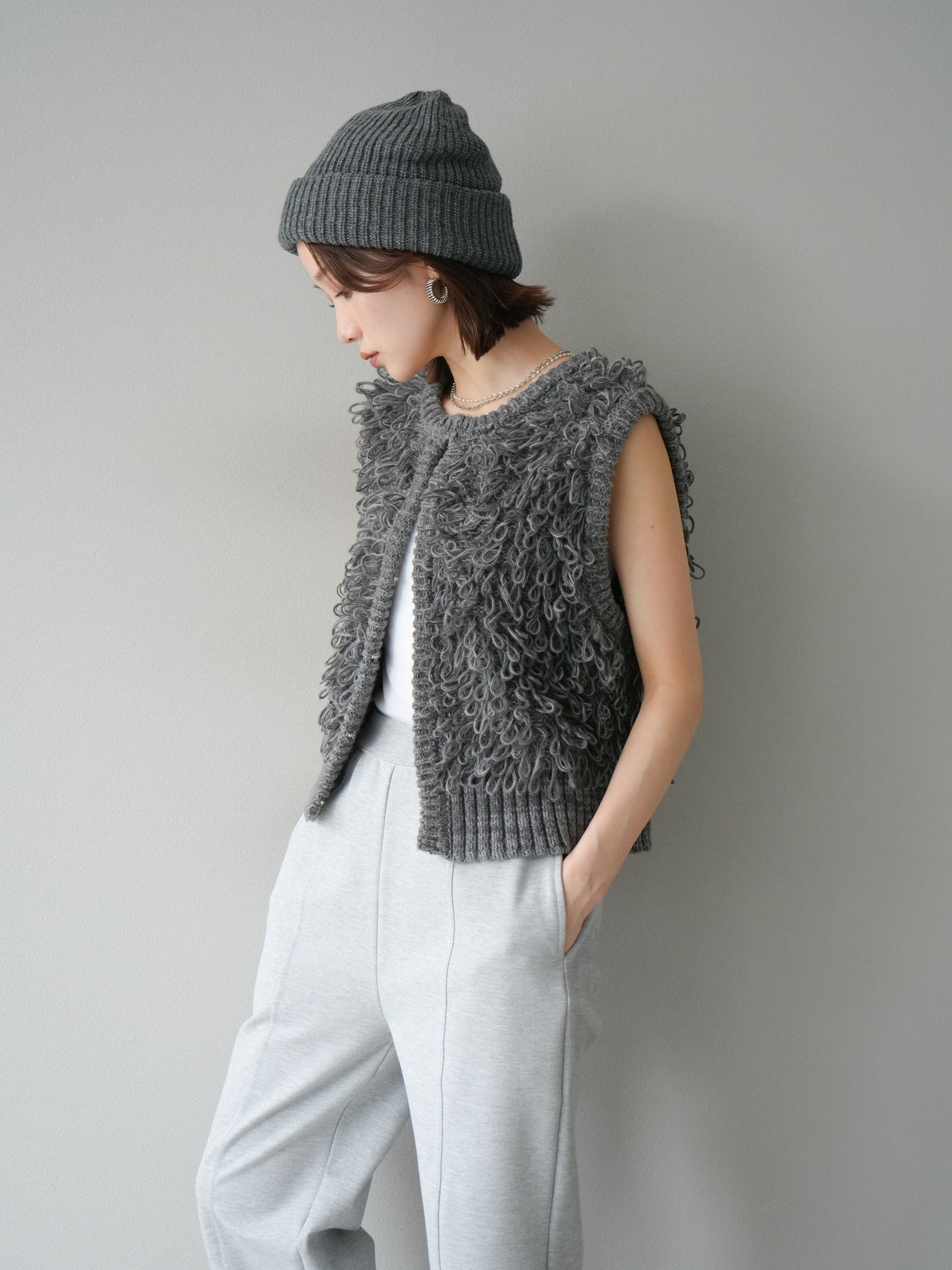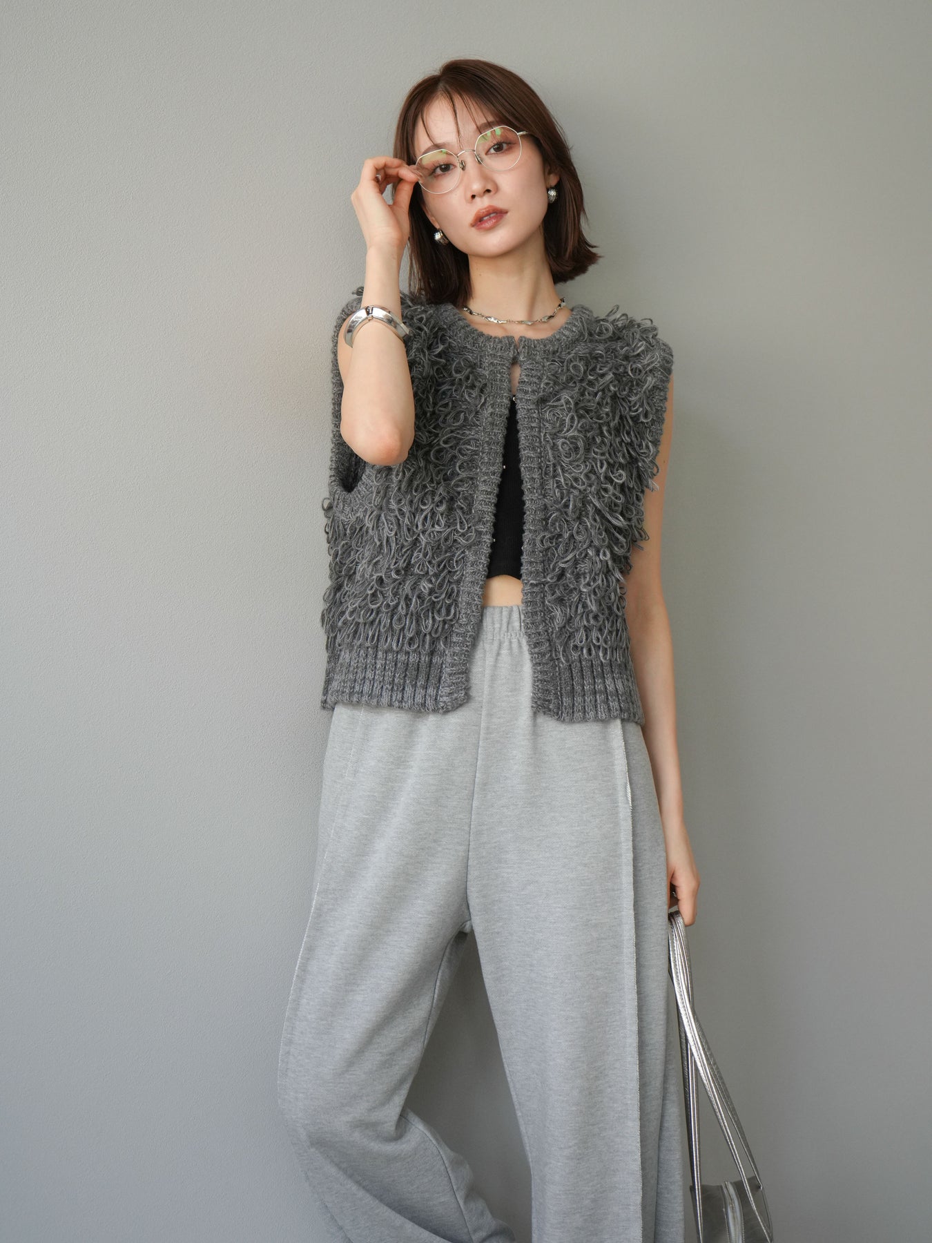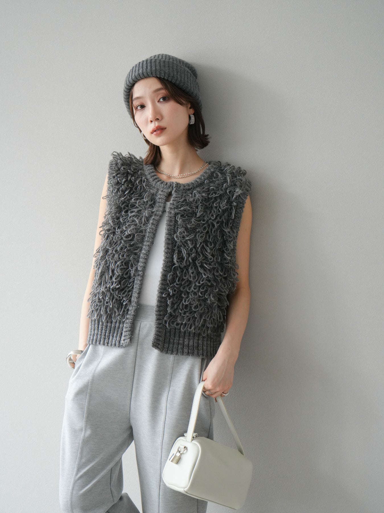 立体感のあるループ編みが印象的なニットベスト。フロントはホック留めで軽やかに羽織れる仕様になっており、カットソーやシャツとのレイヤードで表情豊かなスタイリングが楽しめます。存在感がありながらも合わせやすく、シーズンを通して活躍するアイテムです。 ※ボトムス、キャミソール(インナー)以外の商品は一律でインナーは付属していません。