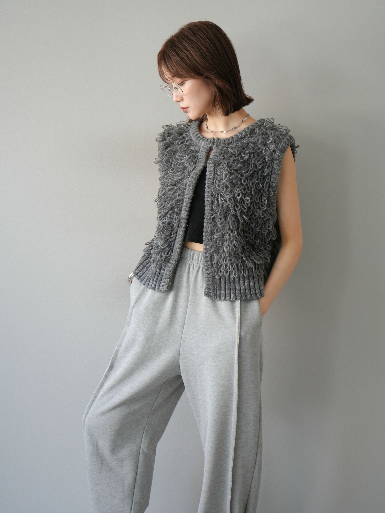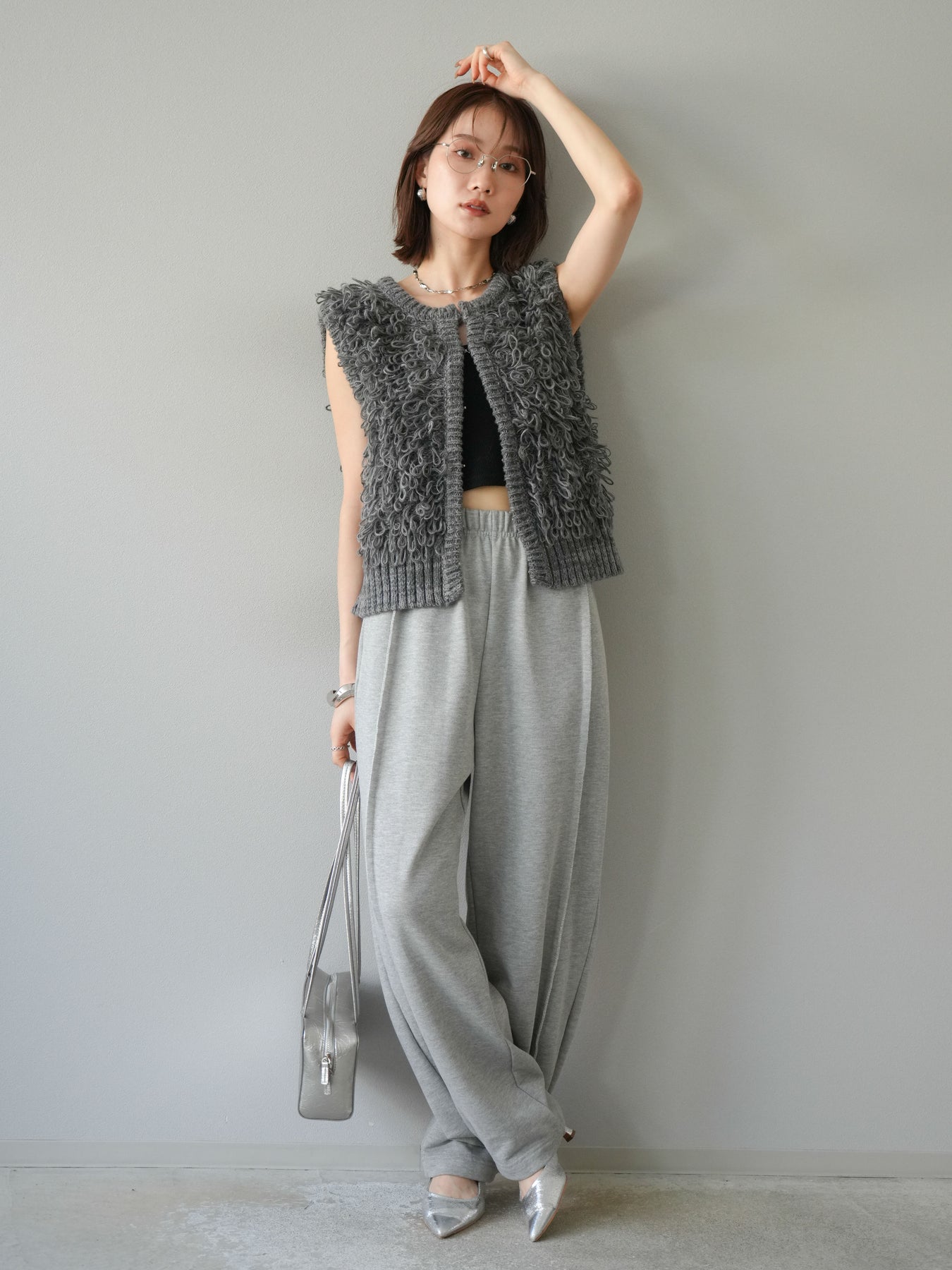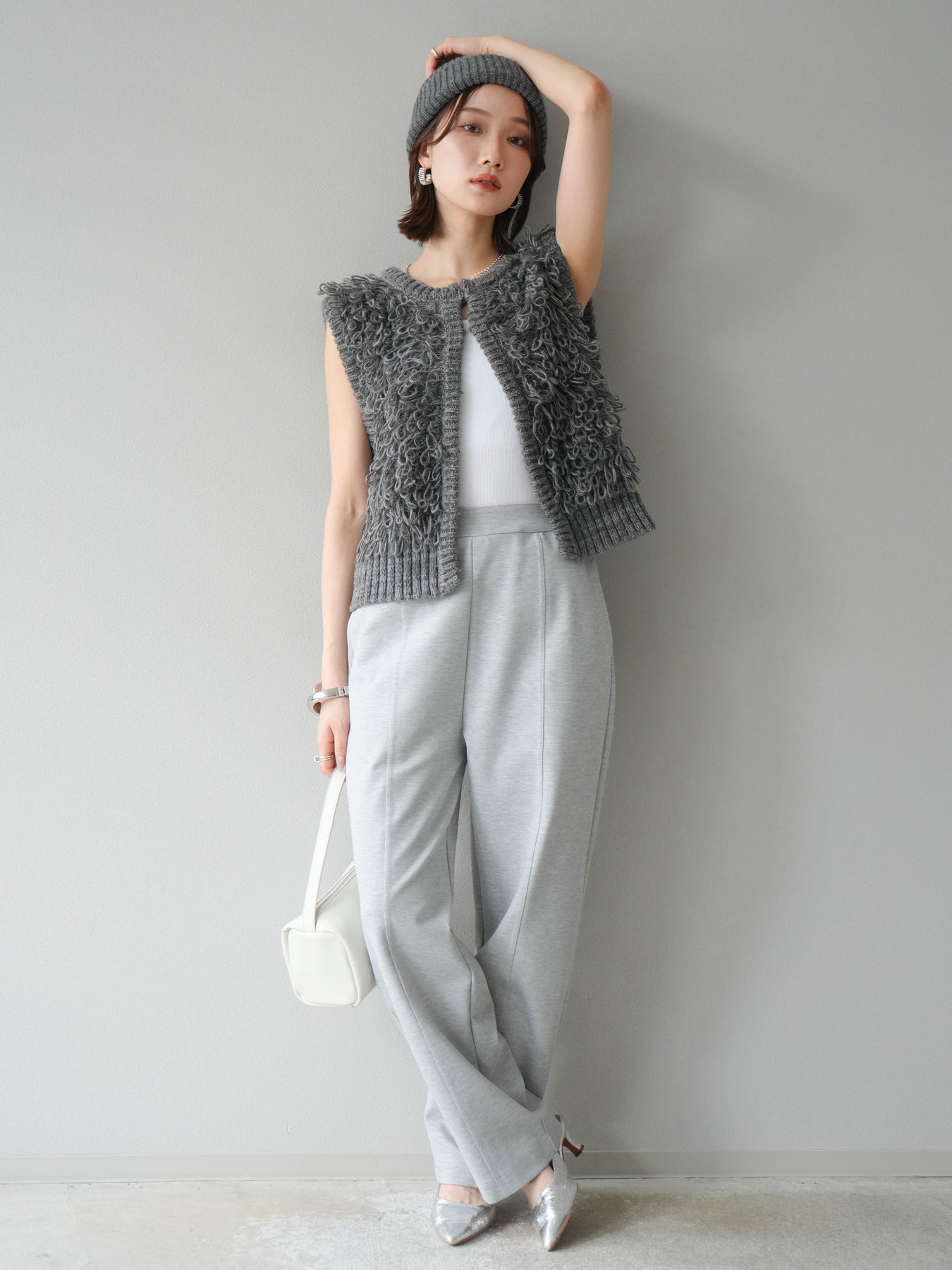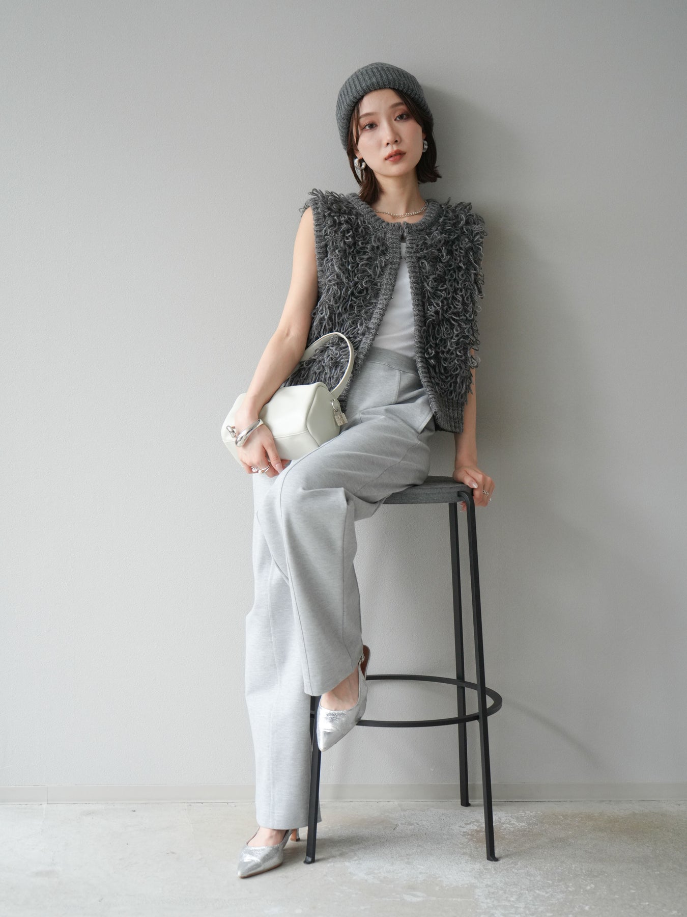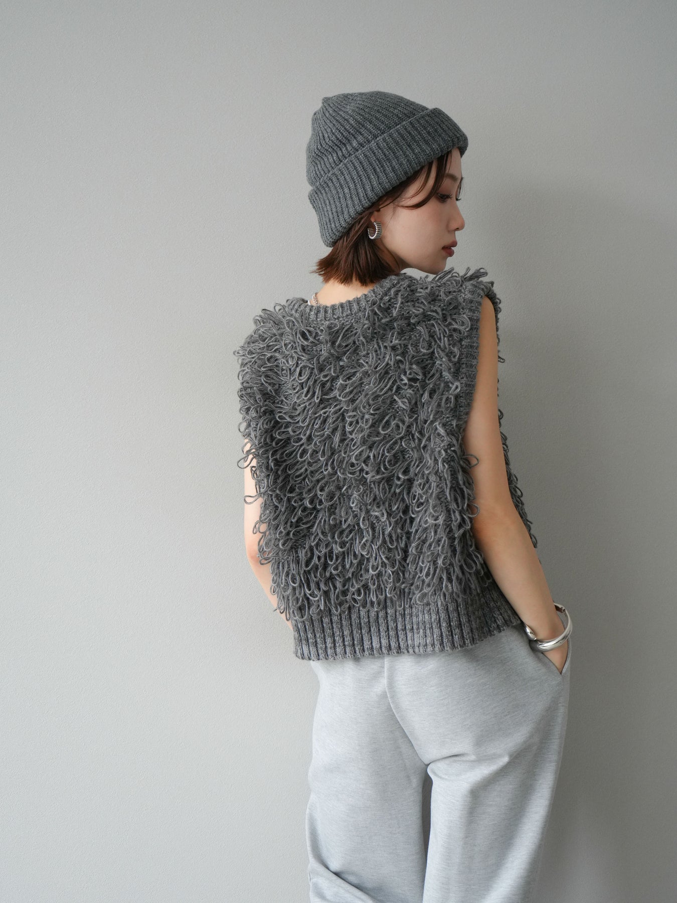 立体感のあるループ編みが印象的なニットベスト。フロントはホック留めで軽やかに羽織れる仕様になっており、カットソーやシャツとのレイヤードで表情豊かなスタイリングが楽しめます。存在感がありながらも合わせやすく、シーズンを通して活躍するアイテムです。 ※ボトムス、キャミソール(インナー)以外の商品は一律でインナーは付属していません。