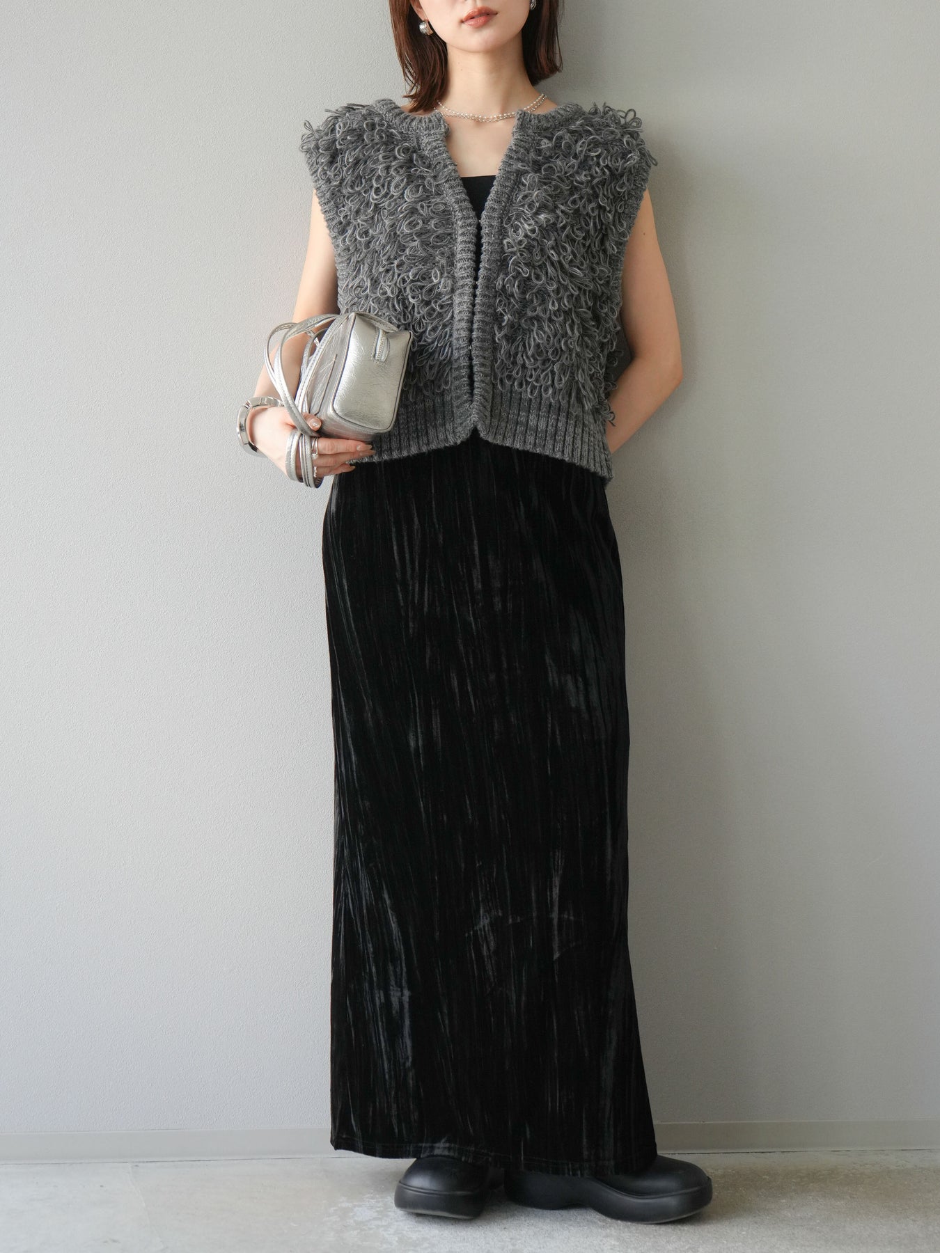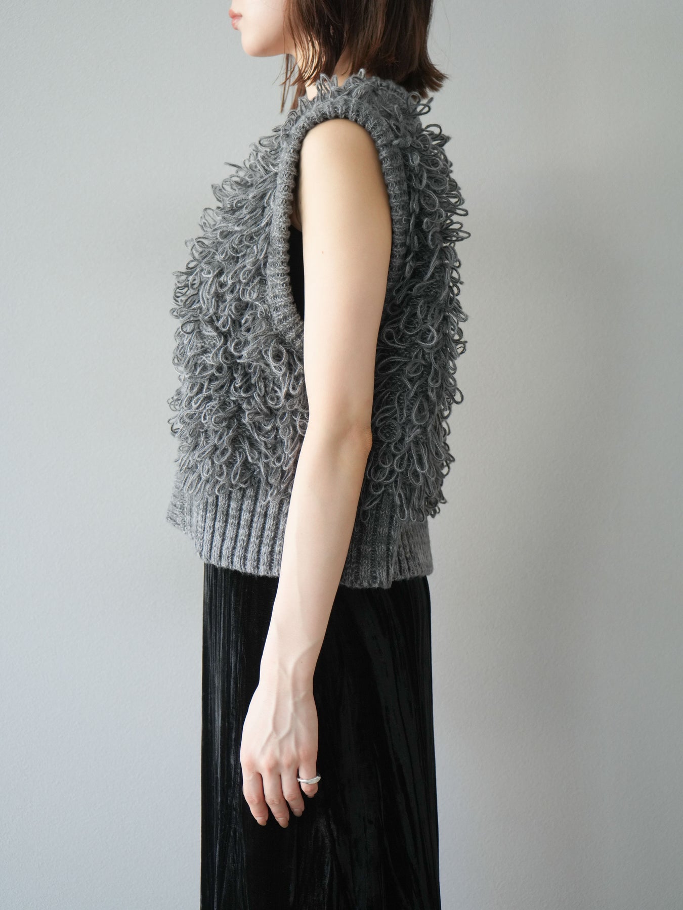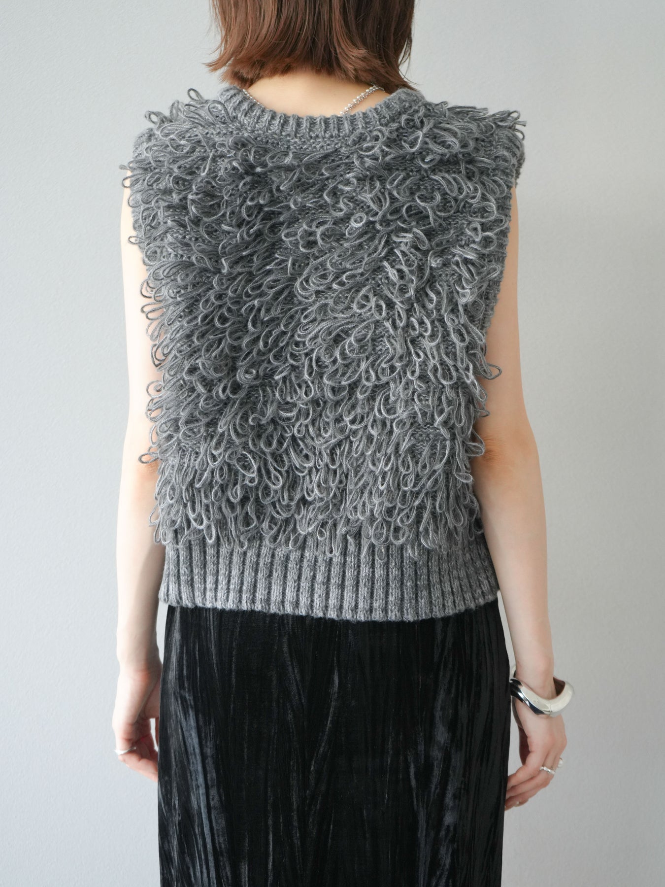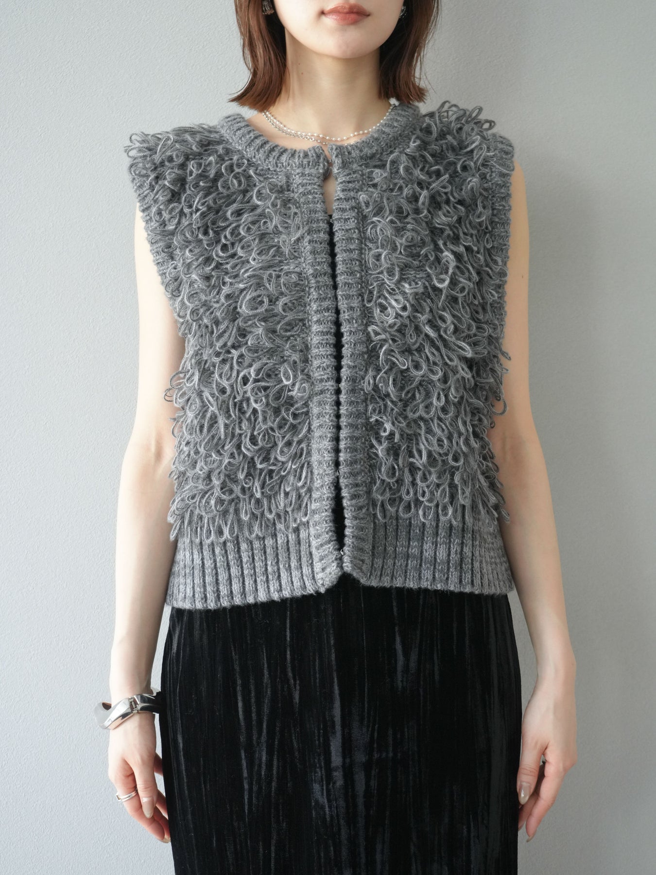 立体感のあるループ編みが印象的なニットベスト。フロントはホック留めで軽やかに羽織れる仕様になっており、カットソーやシャツとのレイヤードで表情豊かなスタイリングが楽しめます。存在感がありながらも合わせやすく、シーズンを通して活躍するアイテムです。 ※ボトムス、キャミソール(インナー)以外の商品は一律でインナーは付属していません。