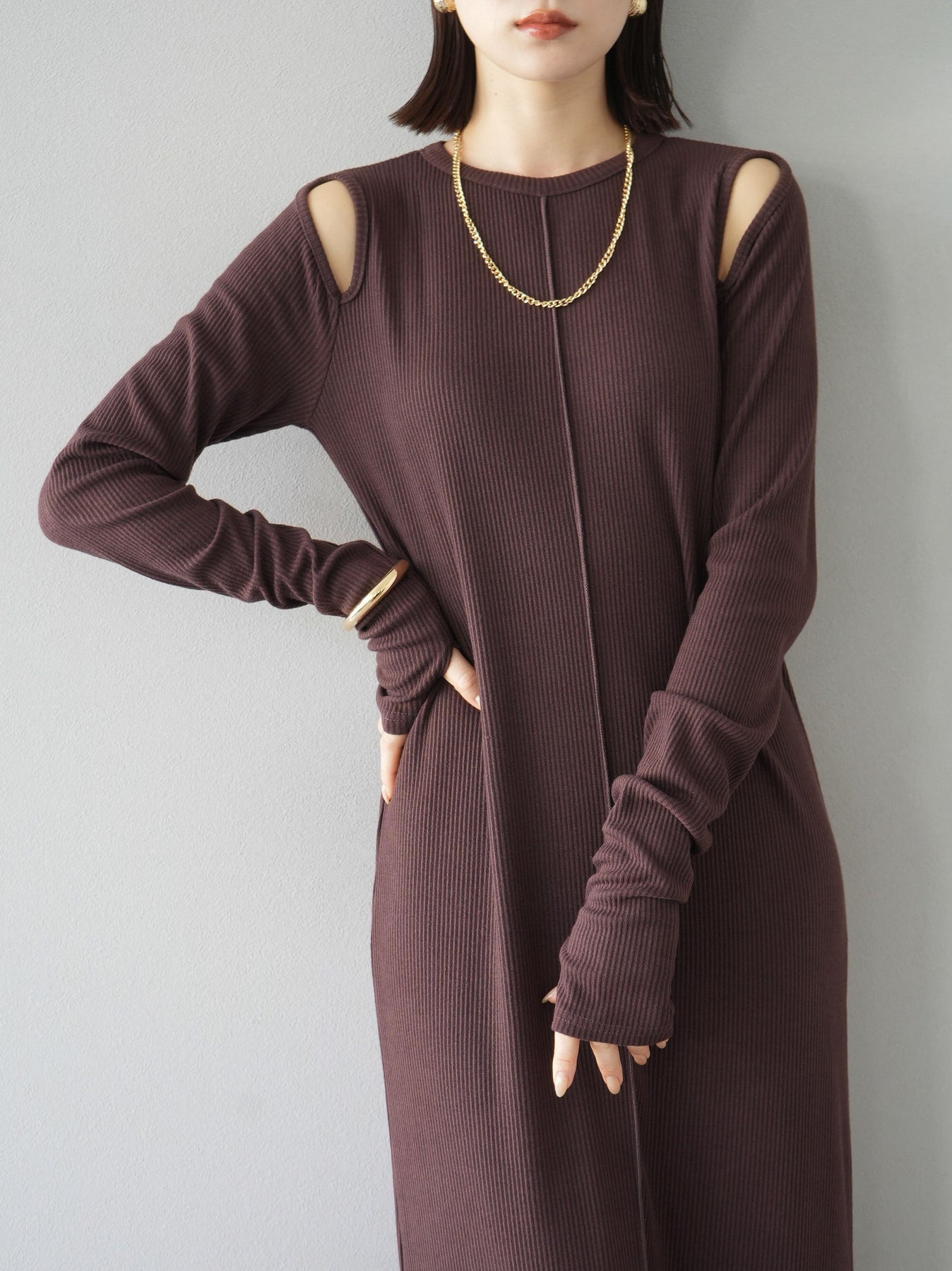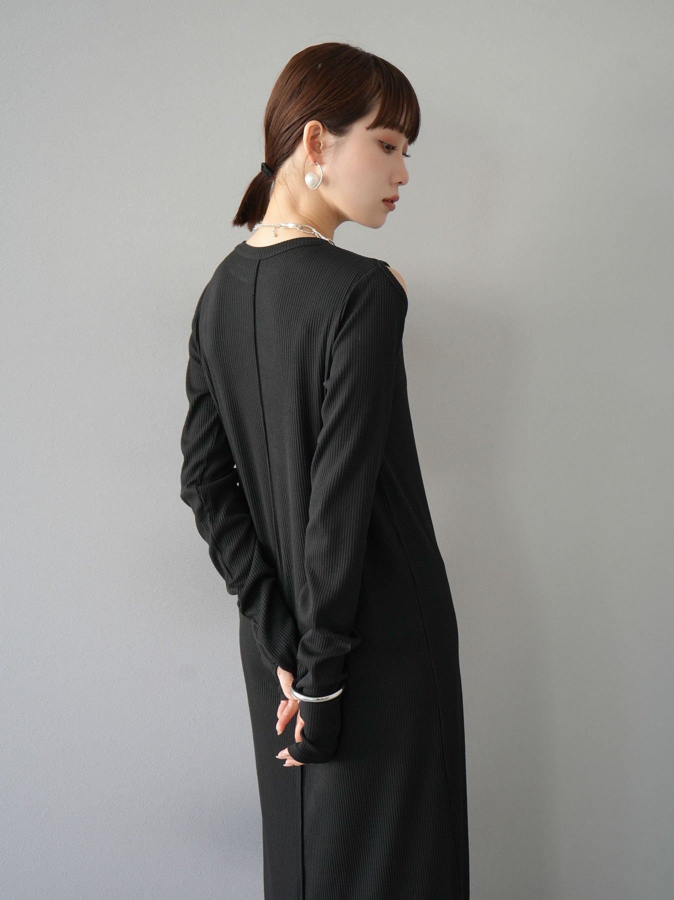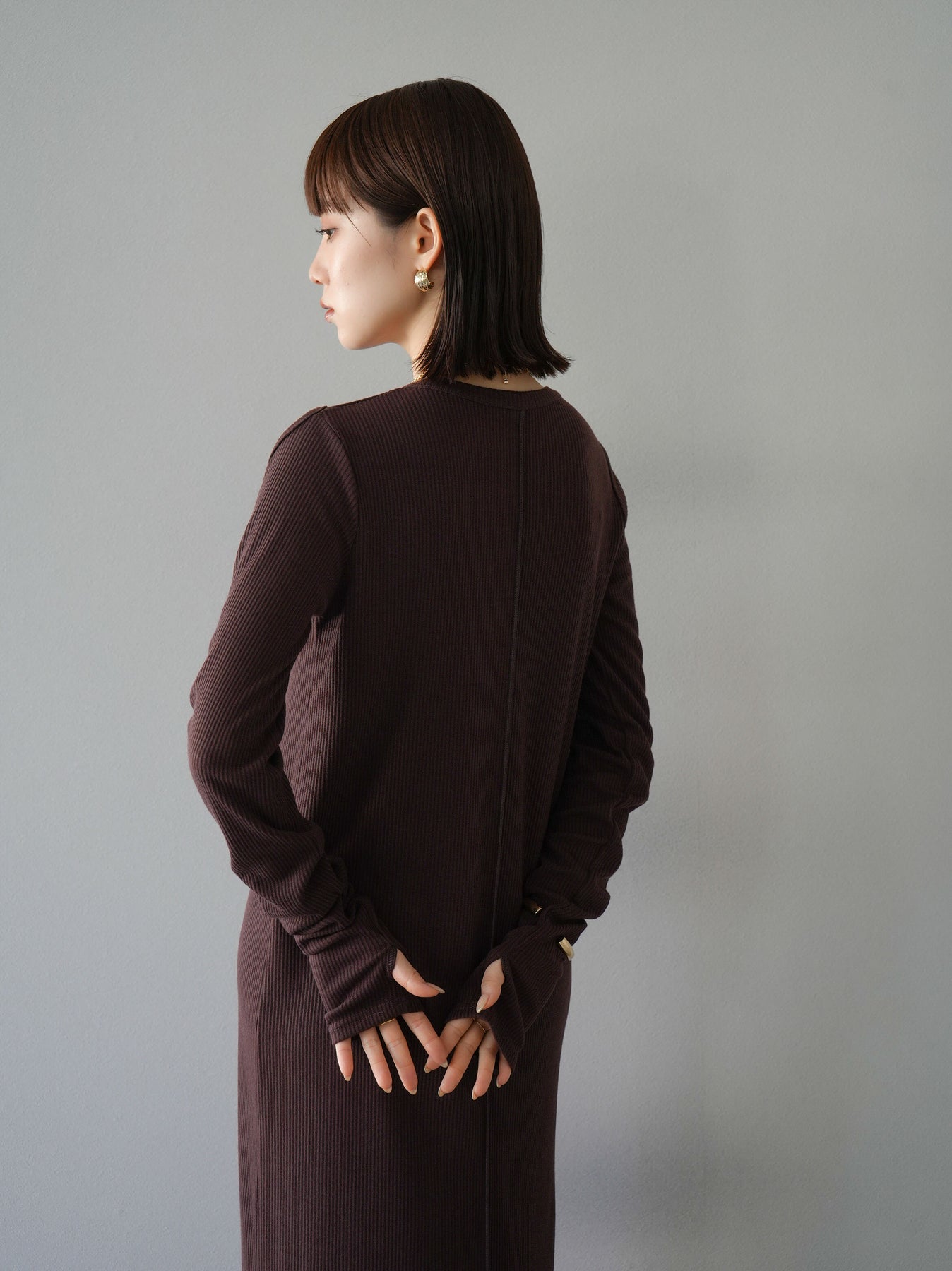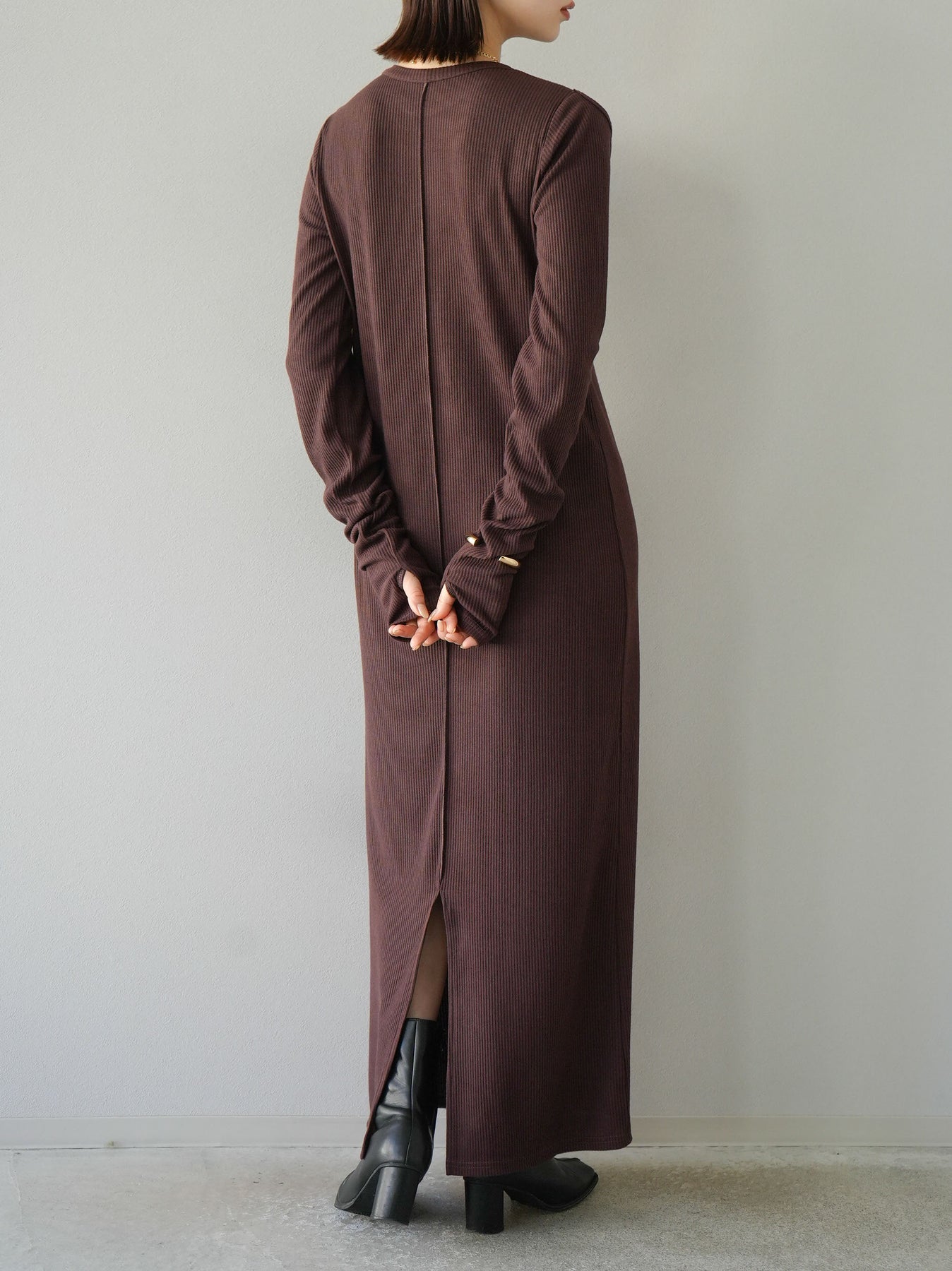 羅紋長袖連身裙,採用時尚剪裁設計。完美貼合和彈性材質打造出女性化的輪廓。袖口上的拇指孔增添了時尚感。有多種風格可供選擇,從休閒到優雅。 *除下裝和吊帶背心(內衣)以外的產品都是統一的,不包括內衣。