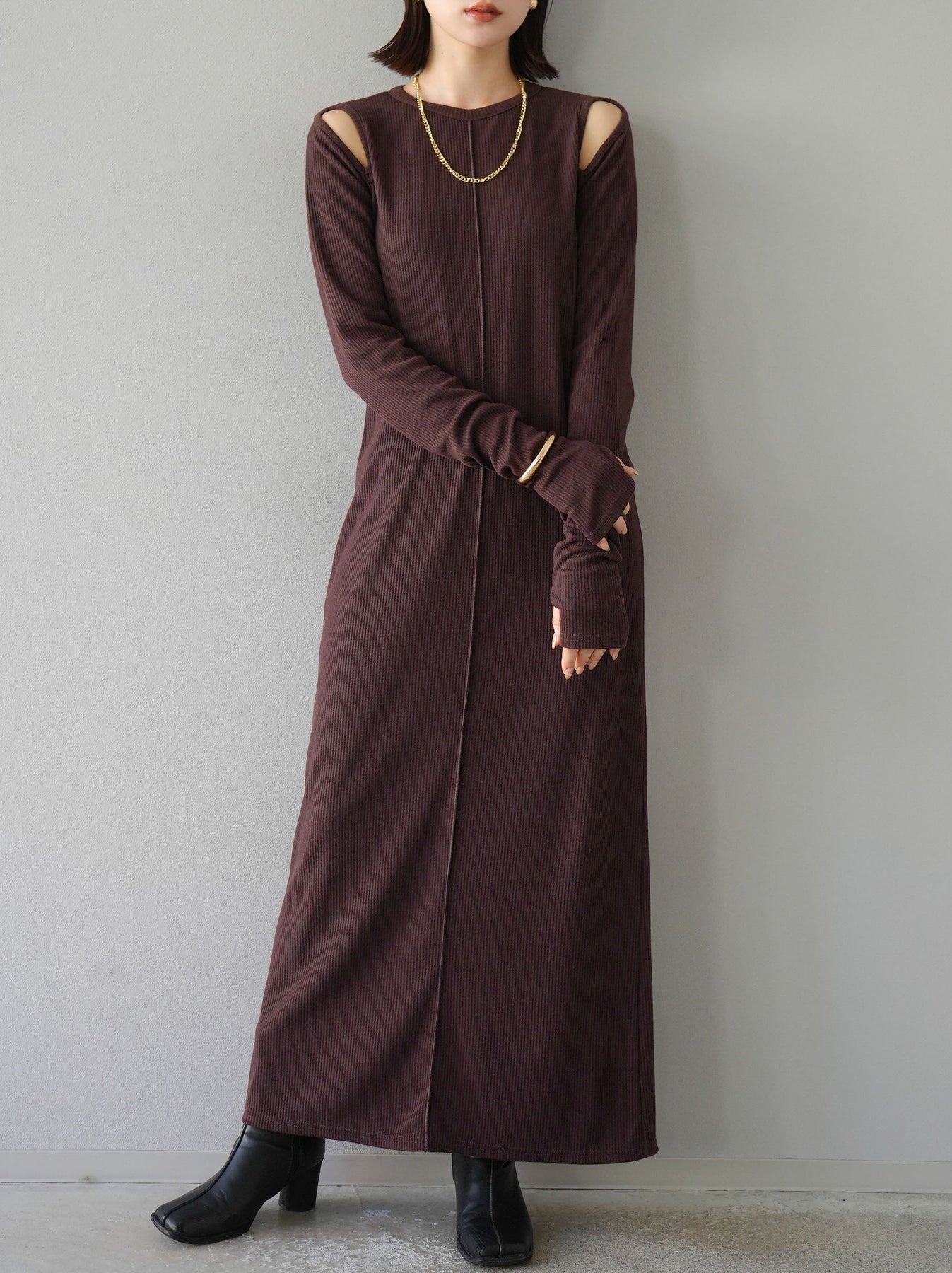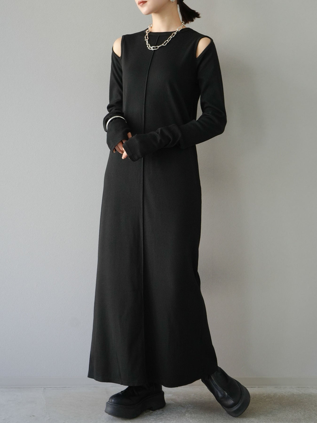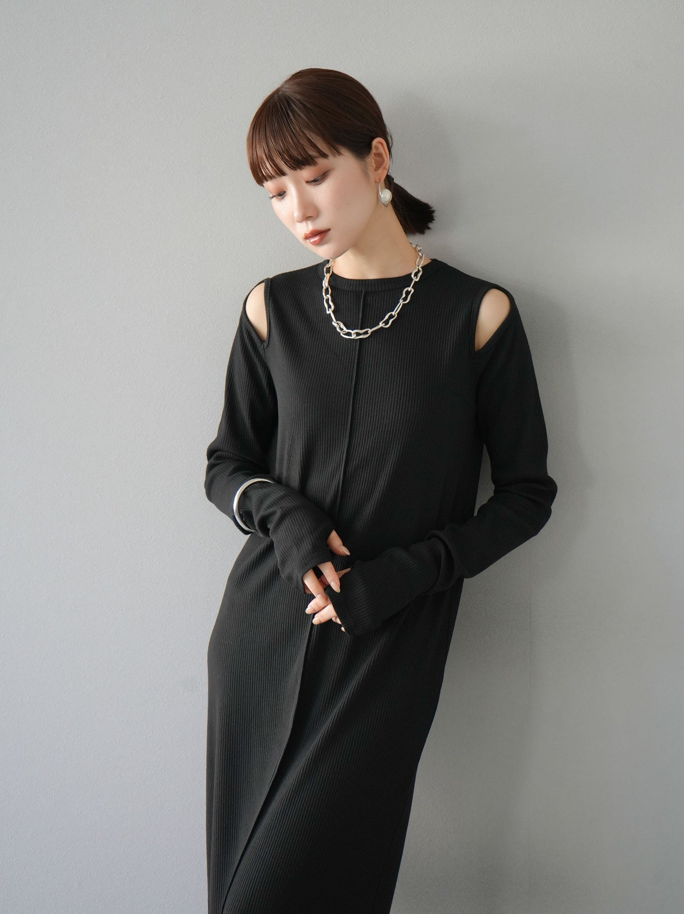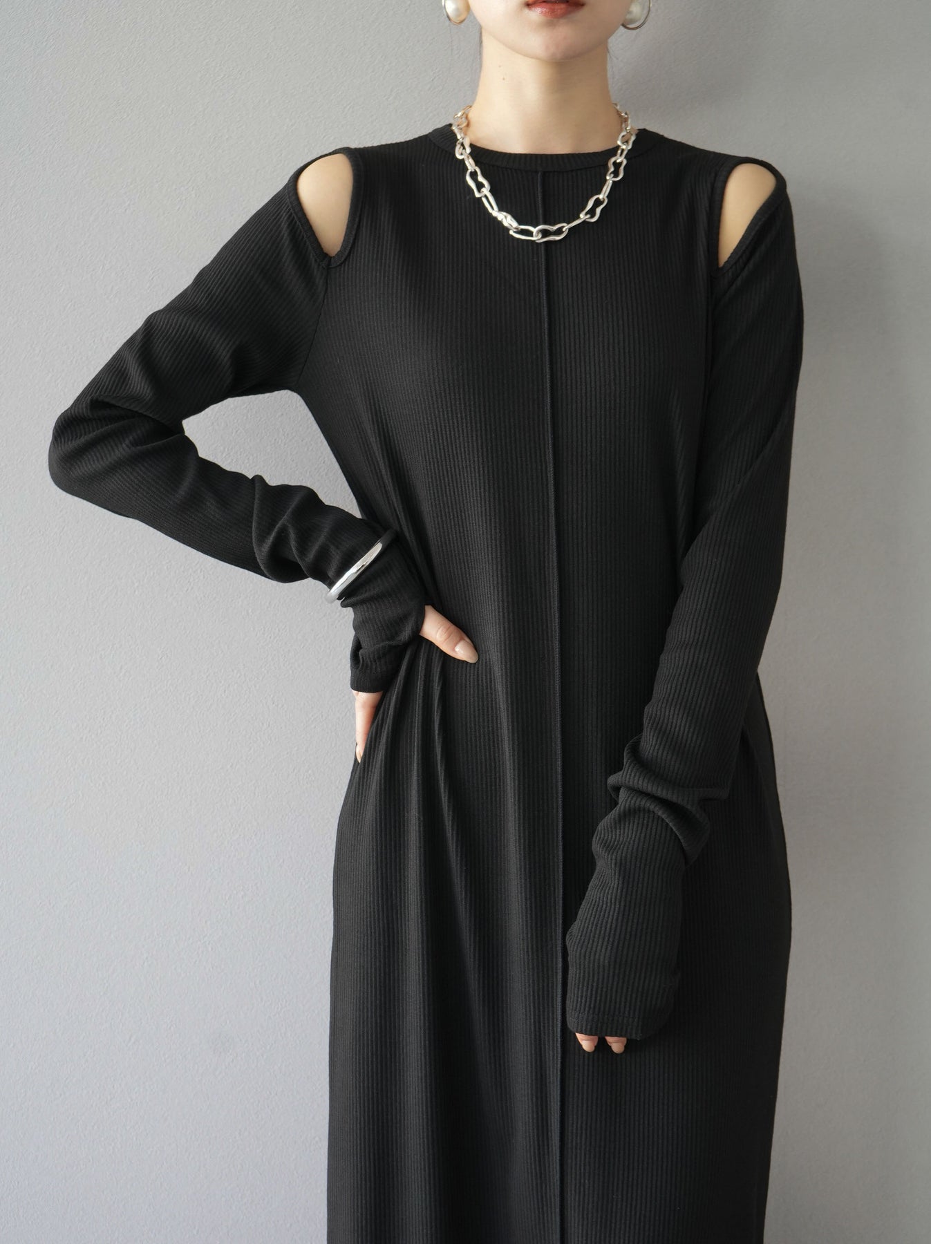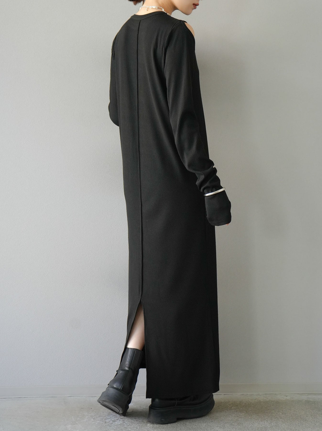 羅紋長袖連身裙,採用時尚剪裁設計。完美貼合和彈性材質打造出女性化的輪廓。袖口上的拇指孔增添了時尚感。有多種風格可供選擇,從休閒到優雅。 *除下裝和吊帶背心(內衣)以外的產品都是統一的,不包括內衣。