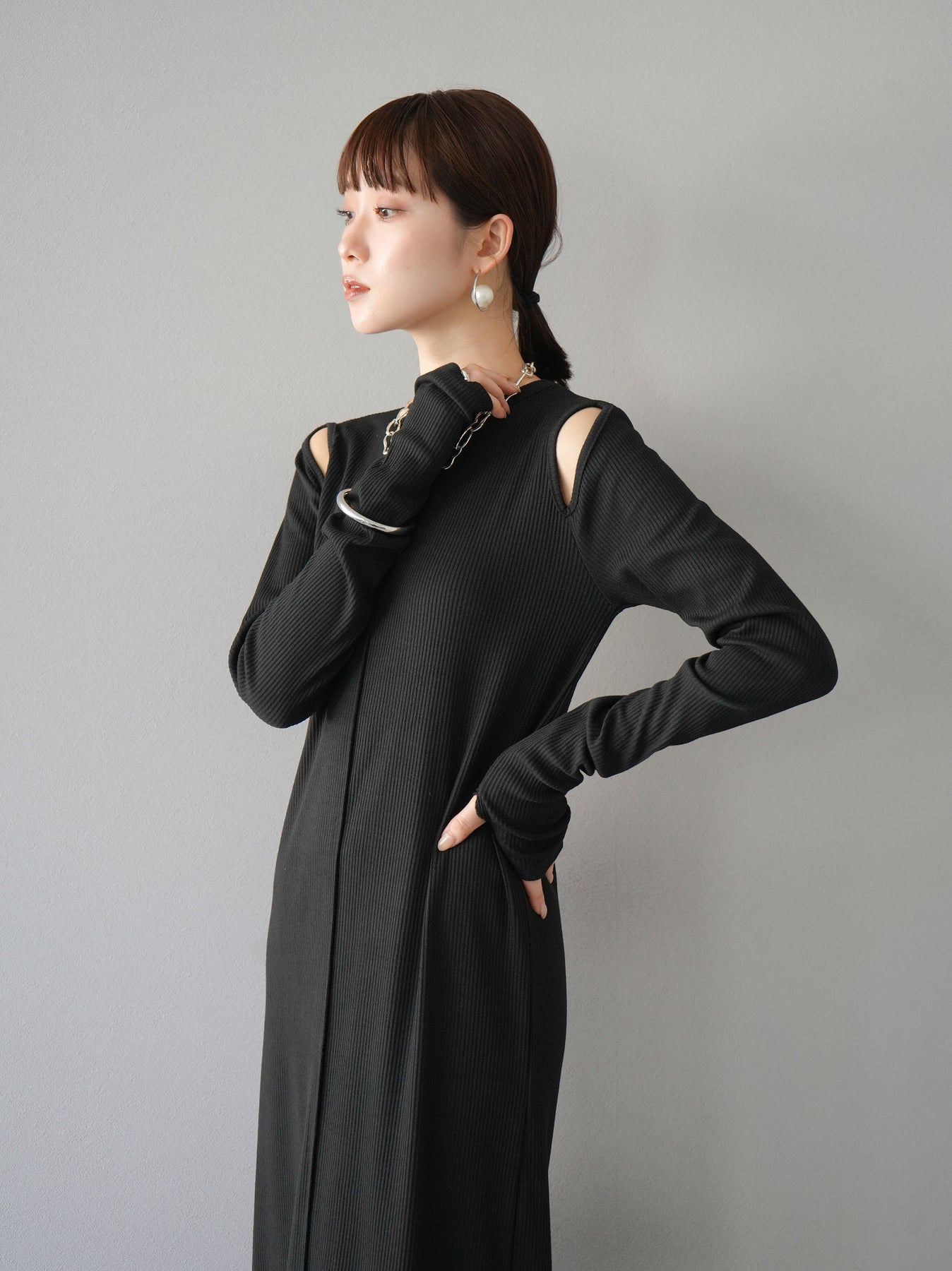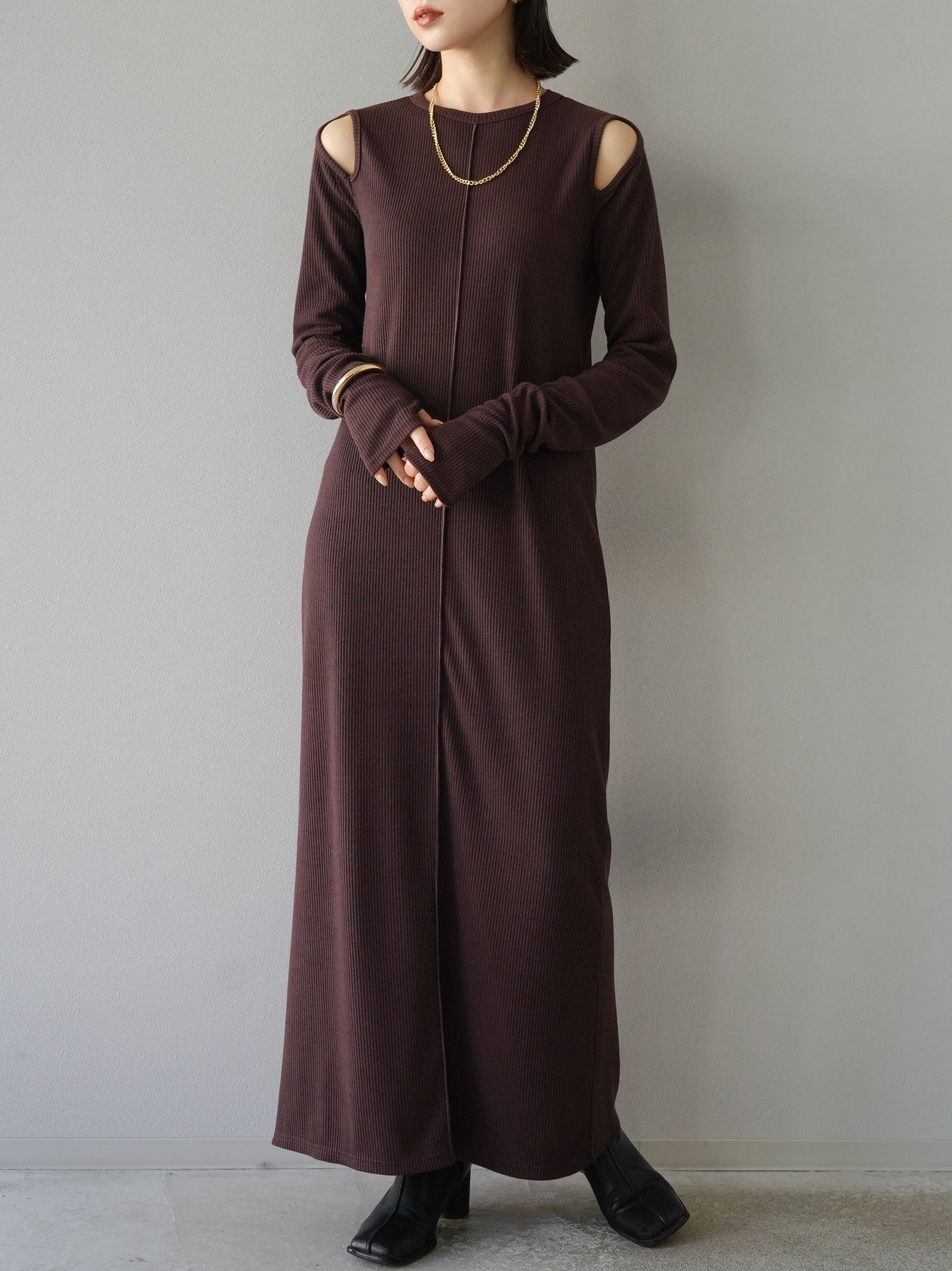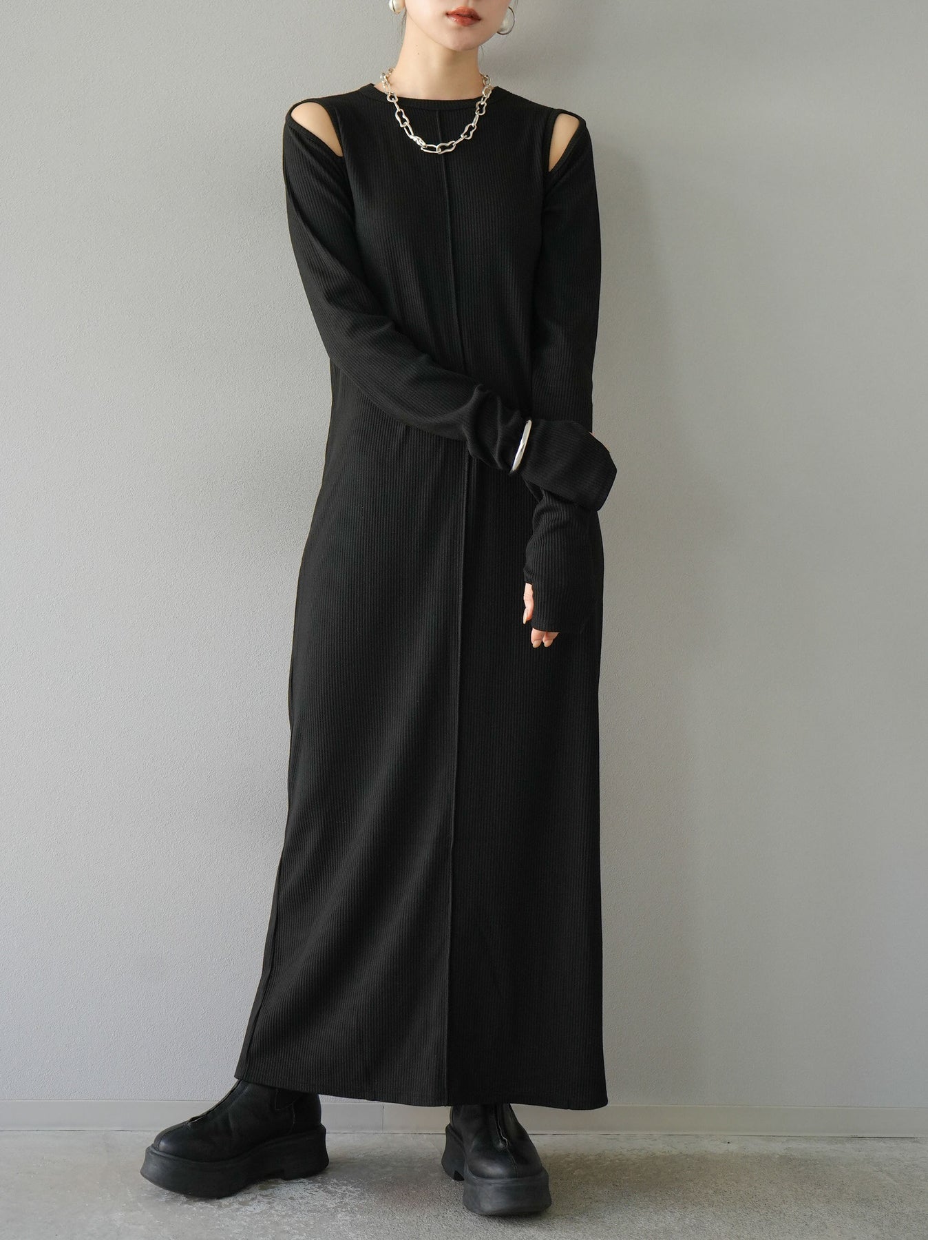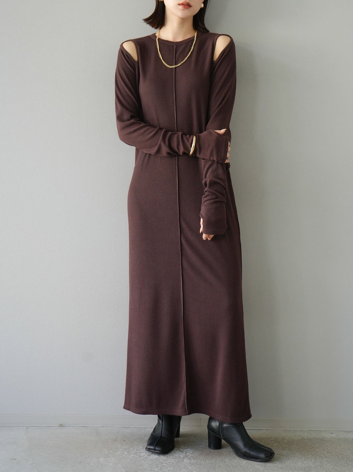 羅紋長袖連身裙,採用時尚剪裁設計。完美貼合和彈性材質打造出女性化的輪廓。袖口上的拇指孔增添了時尚感。有多種風格可供選擇,從休閒到優雅。 *除下裝和吊帶背心(內衣)以外的產品都是統一的,不包括內衣。
