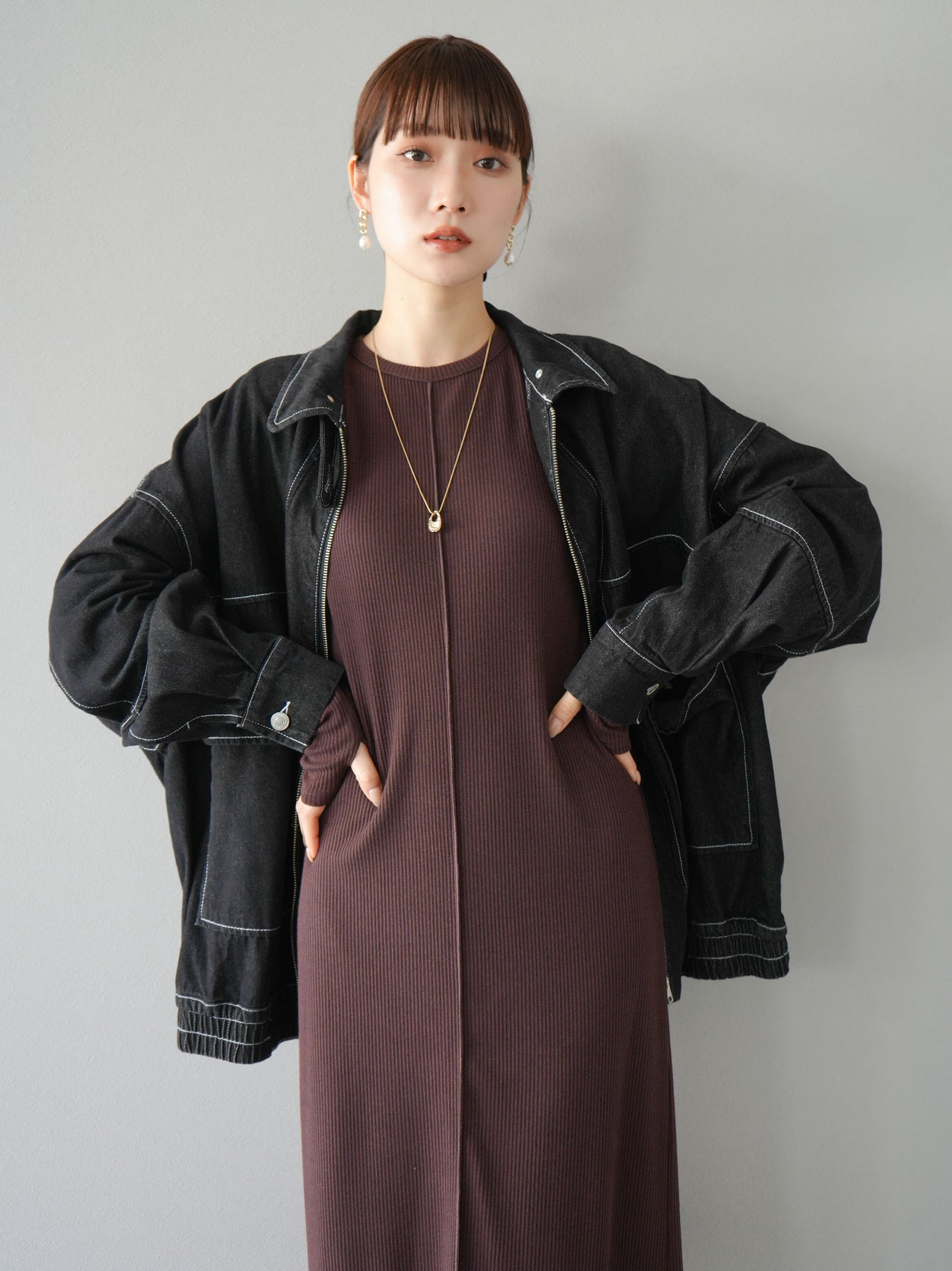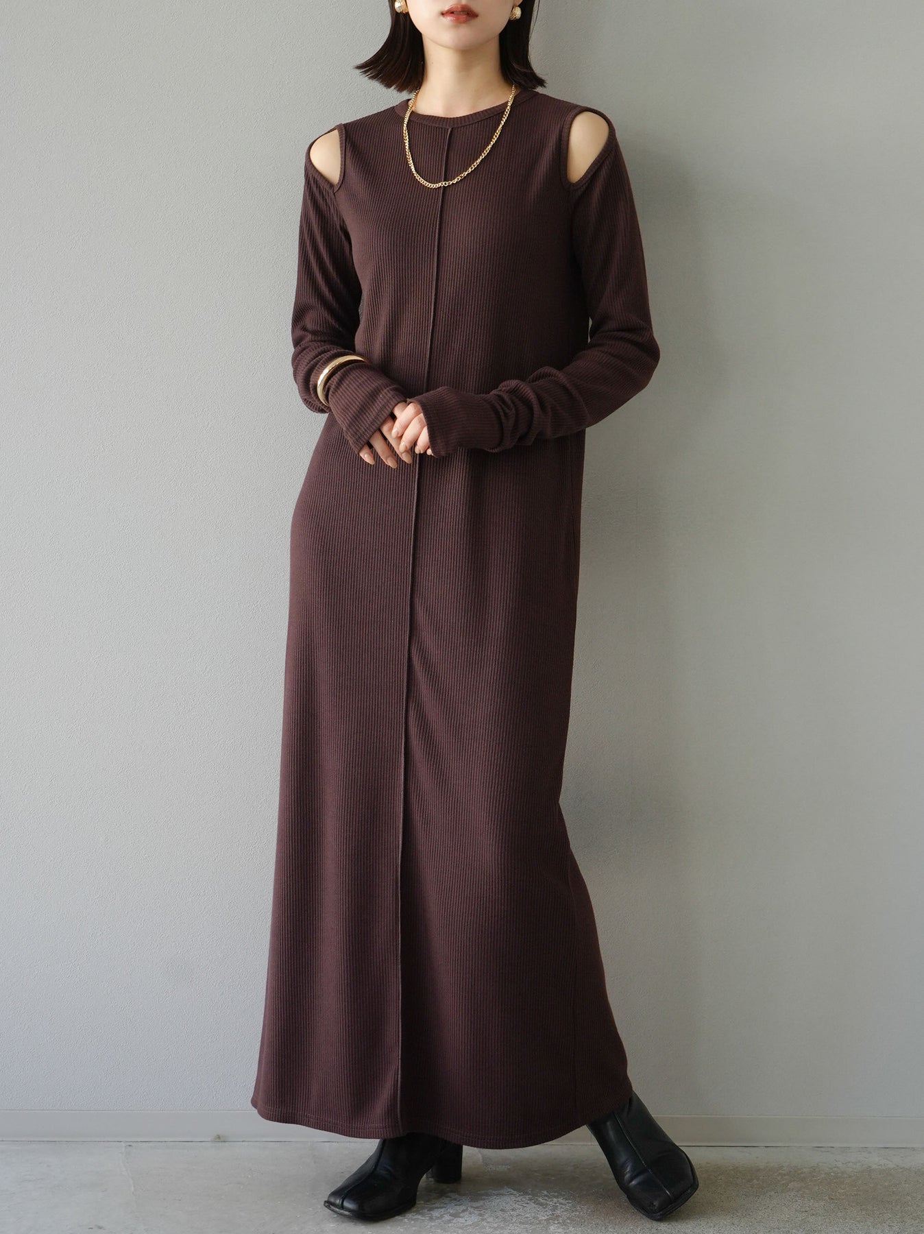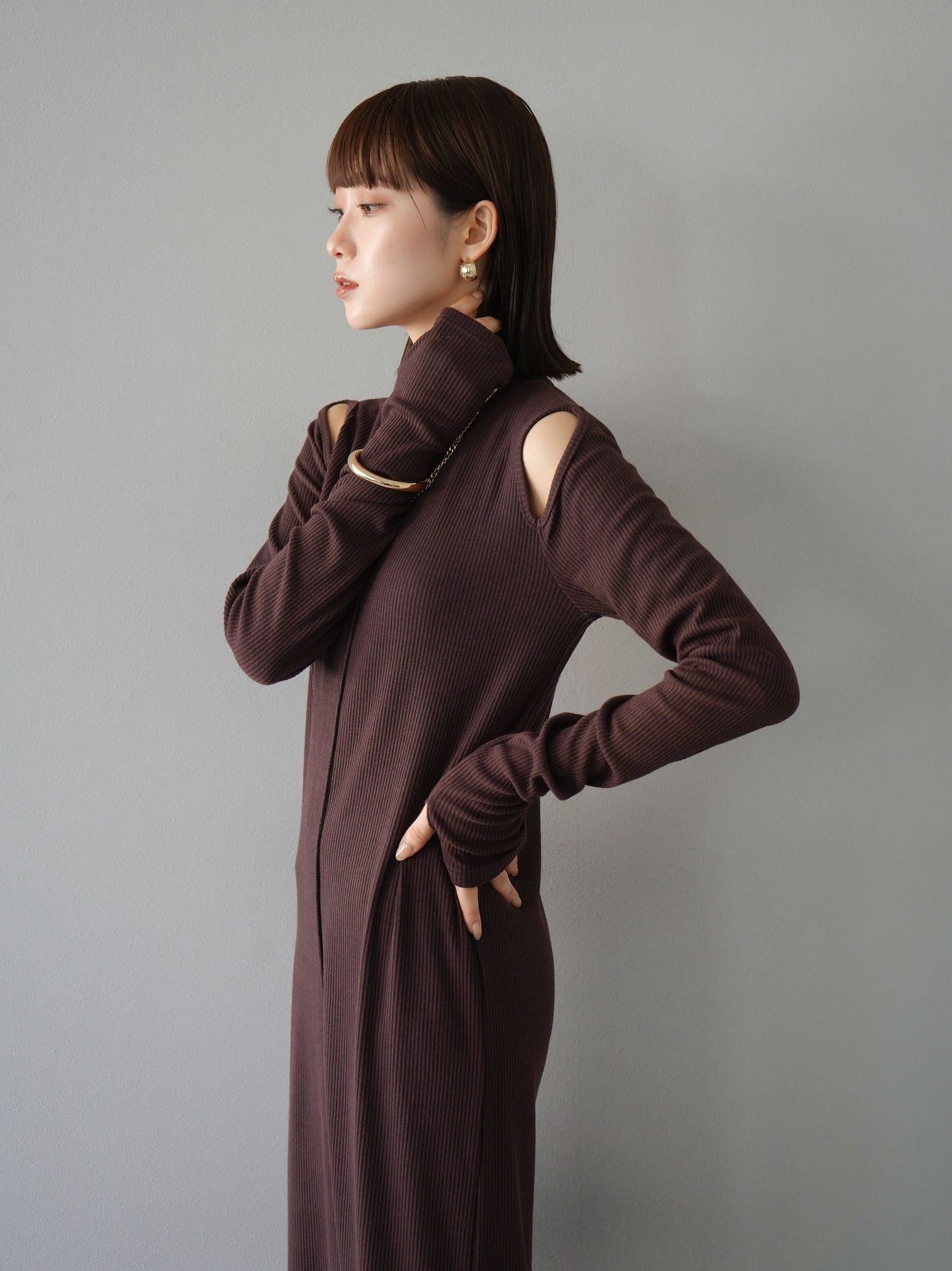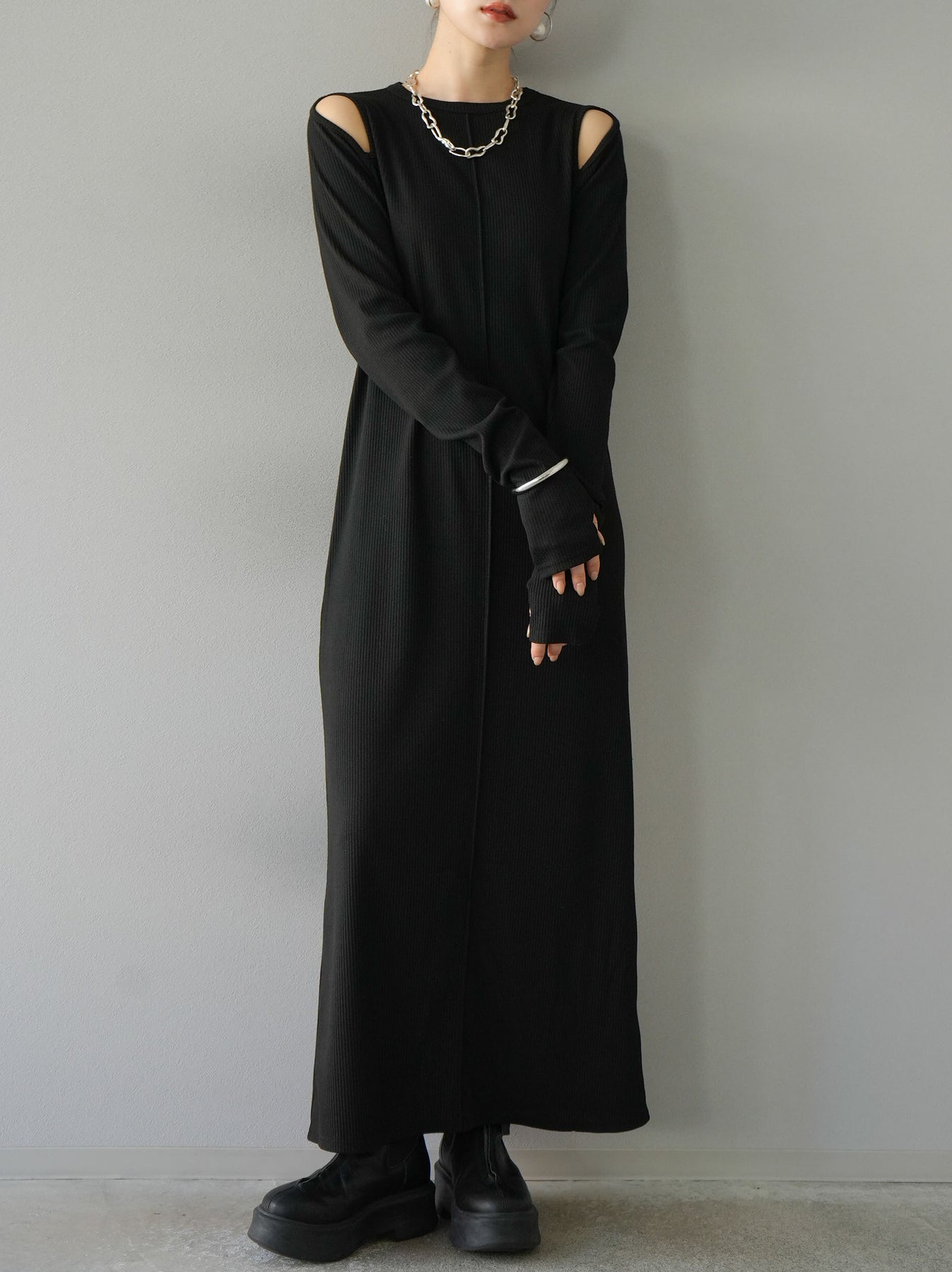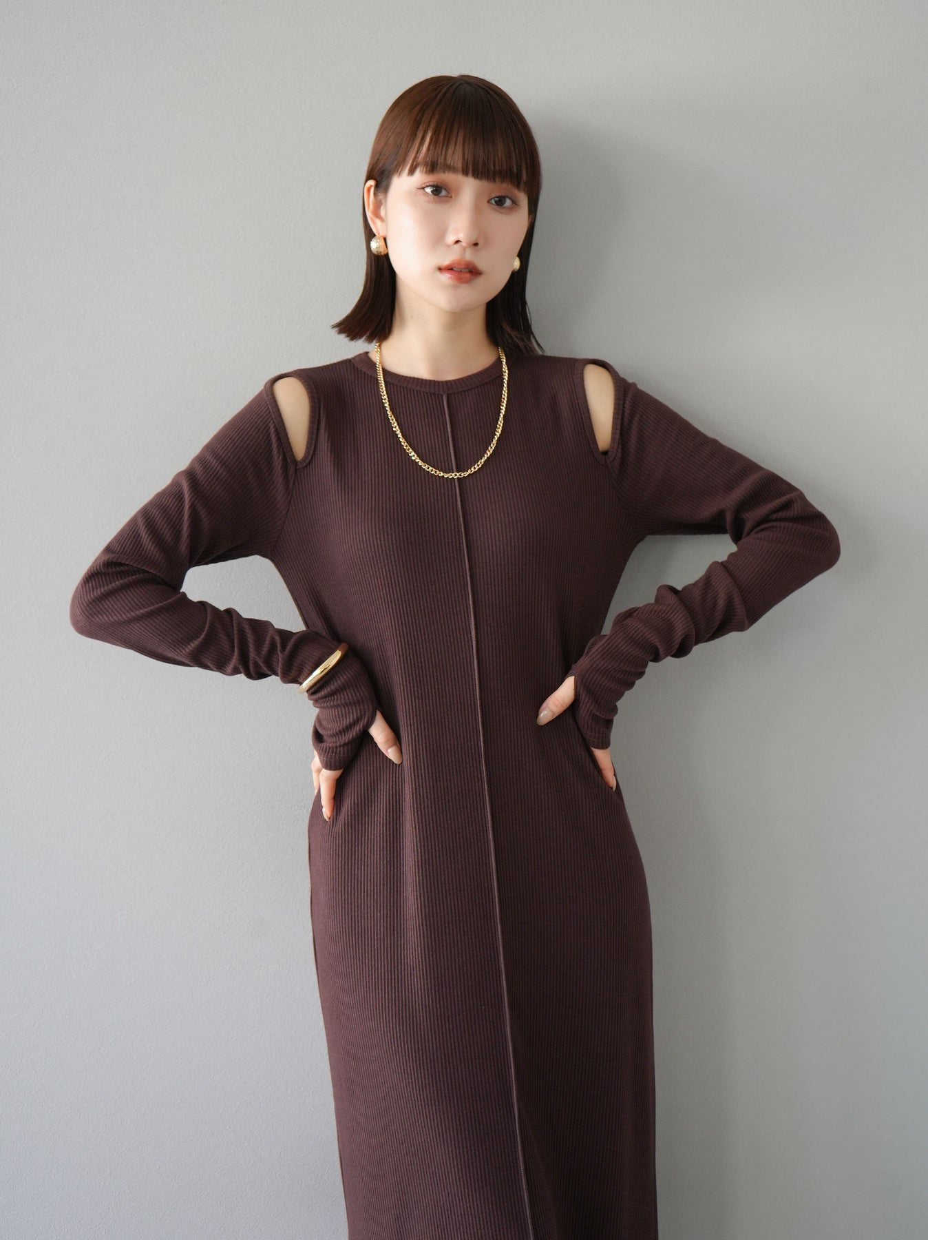 羅紋長袖連身裙,採用時尚剪裁設計。完美貼合和彈性材質打造出女性化的輪廓。袖口上的拇指孔增添了時尚感。有多種風格可供選擇,從休閒到優雅。 *除下裝和吊帶背心(內衣)以外的產品都是統一的,不包括內衣。