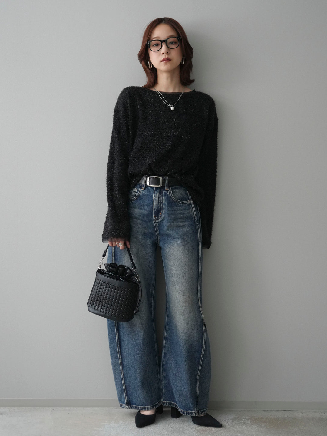 [SET]ラメシャギートップス+サイド切替カーブデニムパンツ(2set)