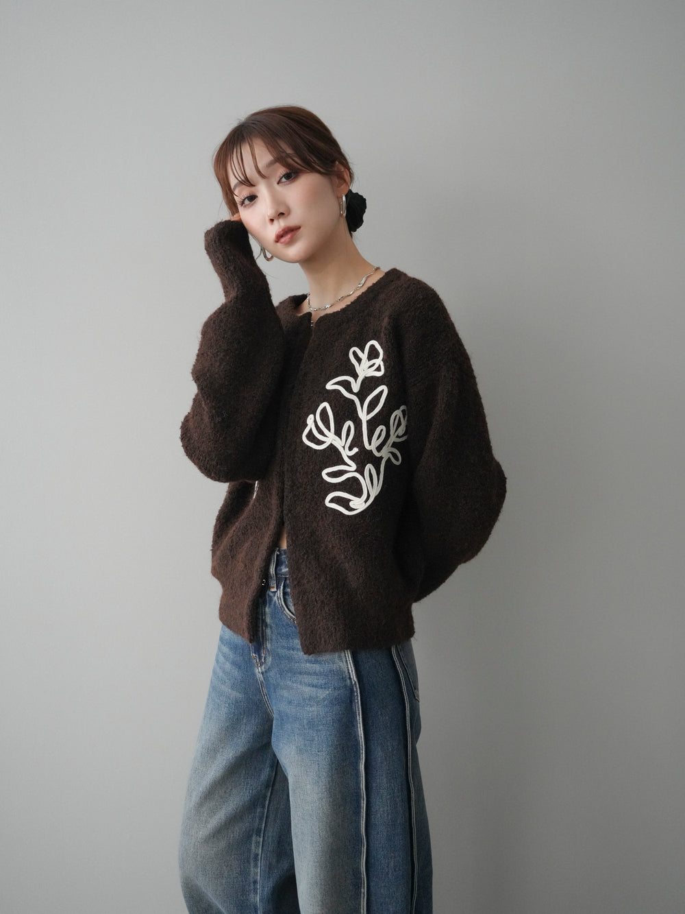 [SET]テープ刺繍ホック開きブークレニットカーディガン+サイド切替カーブデニムパンツ(2set)