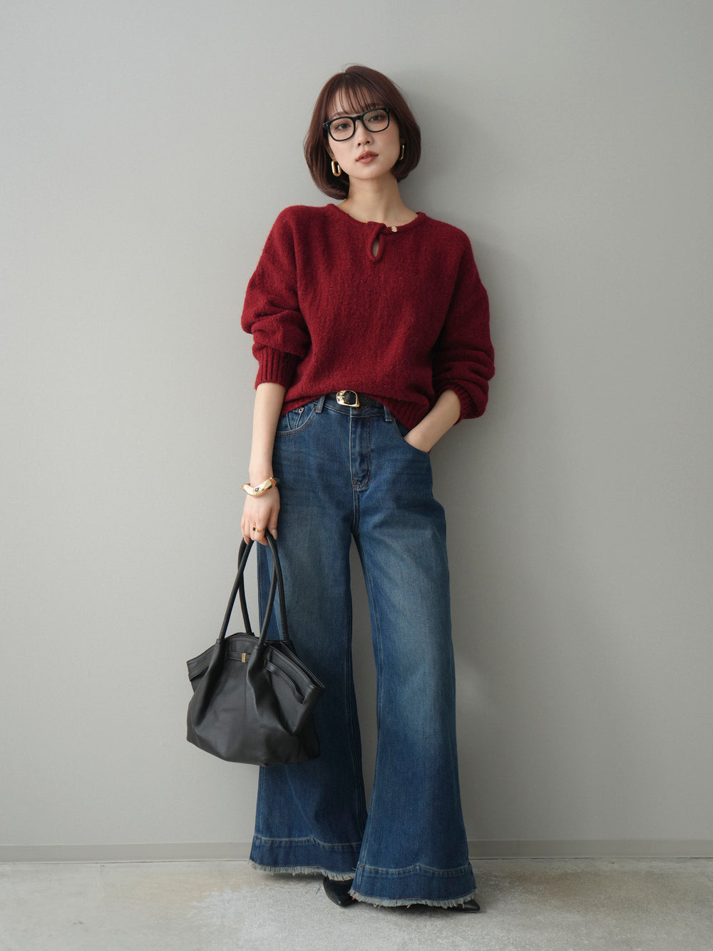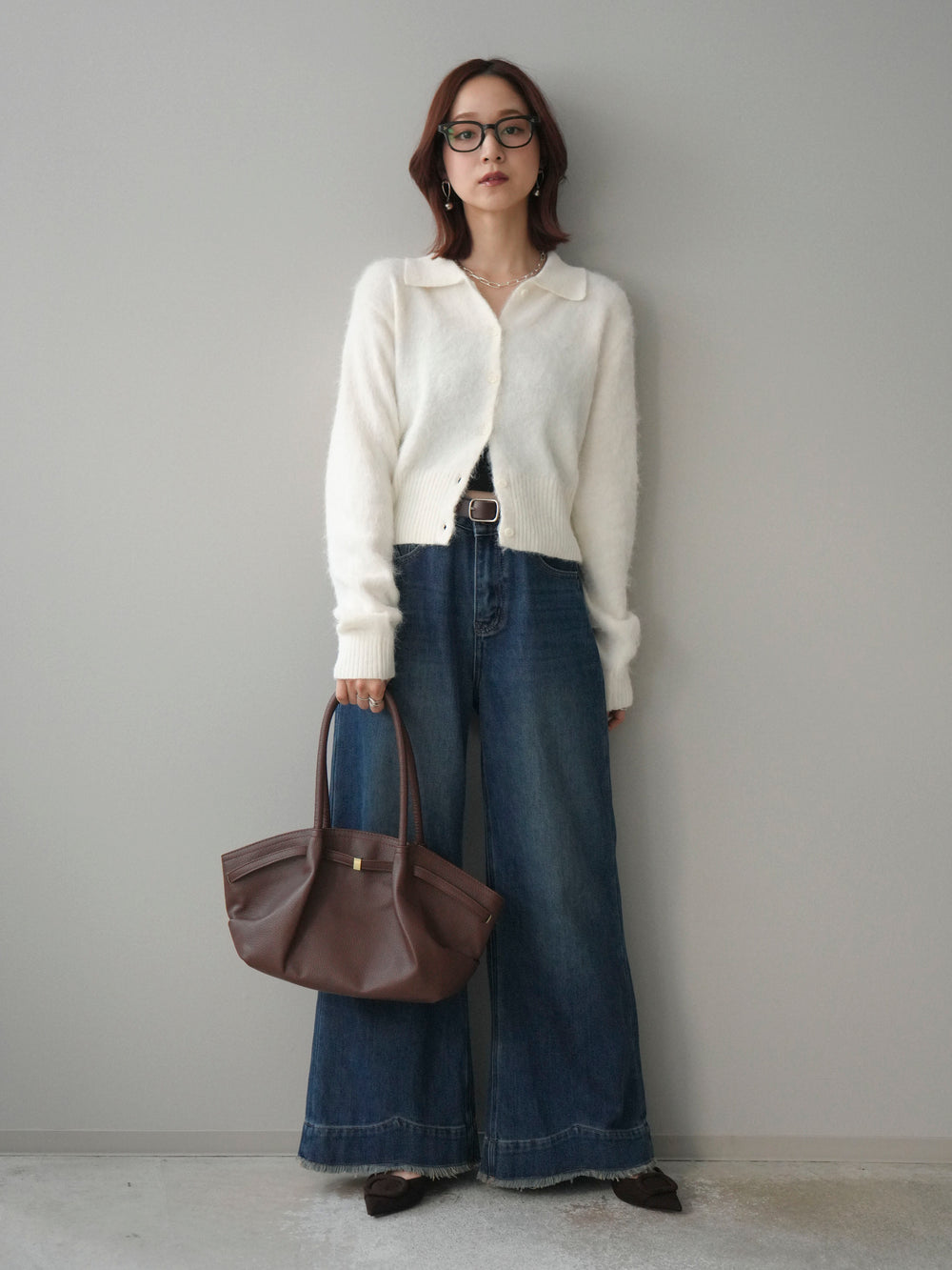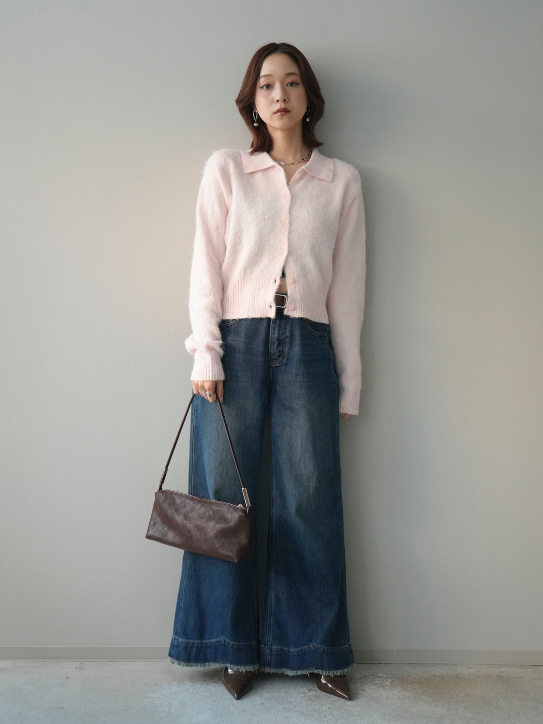 [SET]モヘア衿付きボタンプルオーバー+裏起毛裾フリンジワイドデニムパンツ(2set)