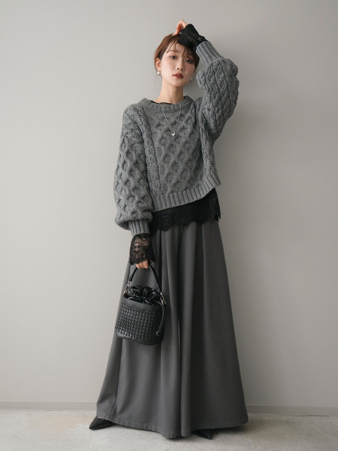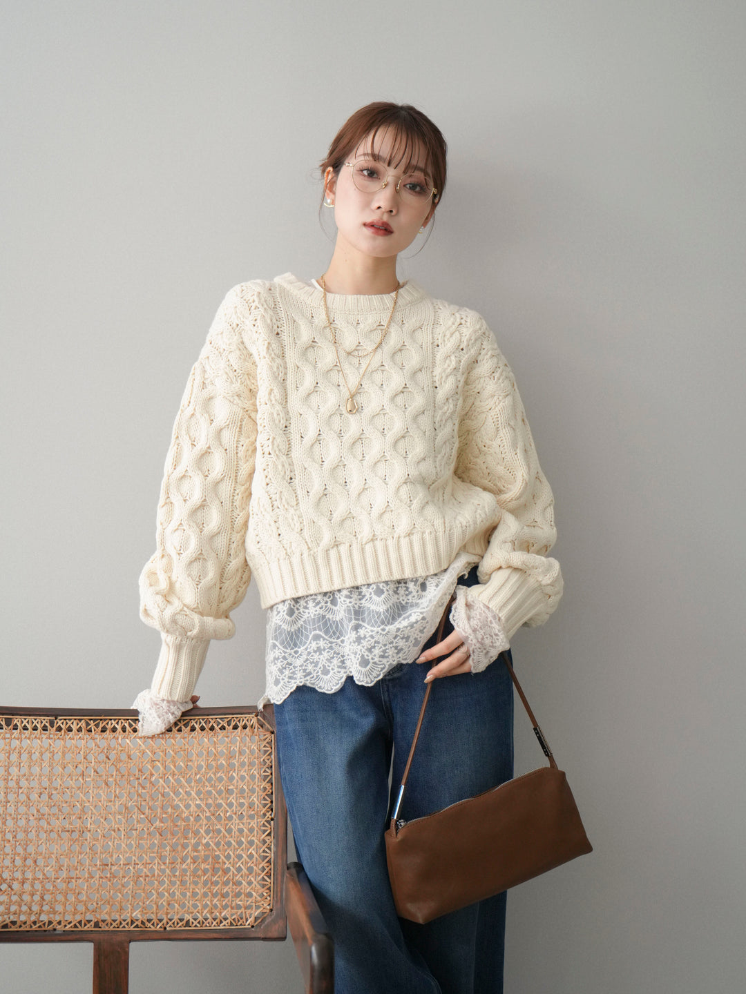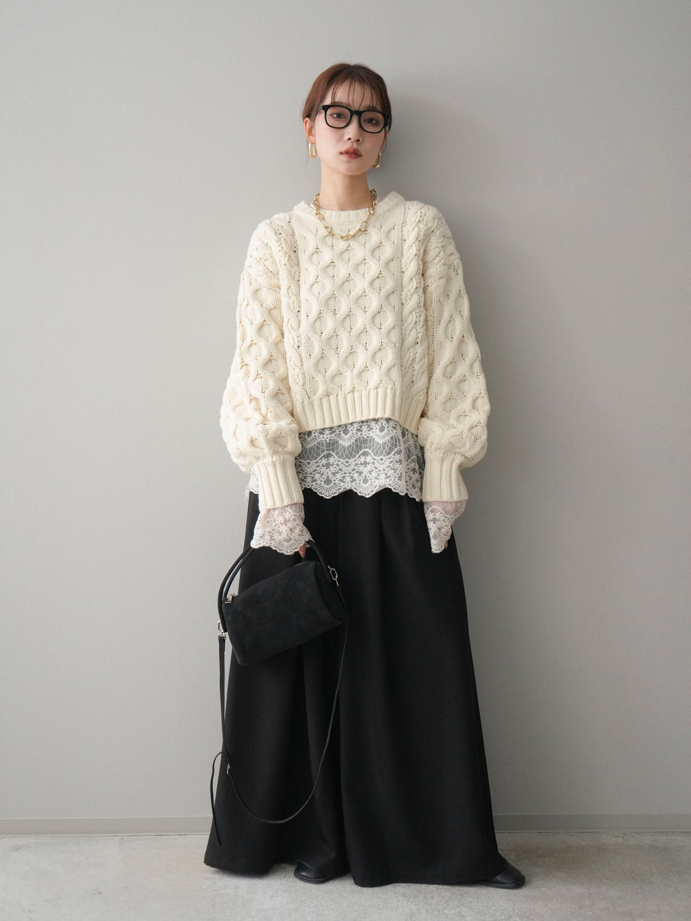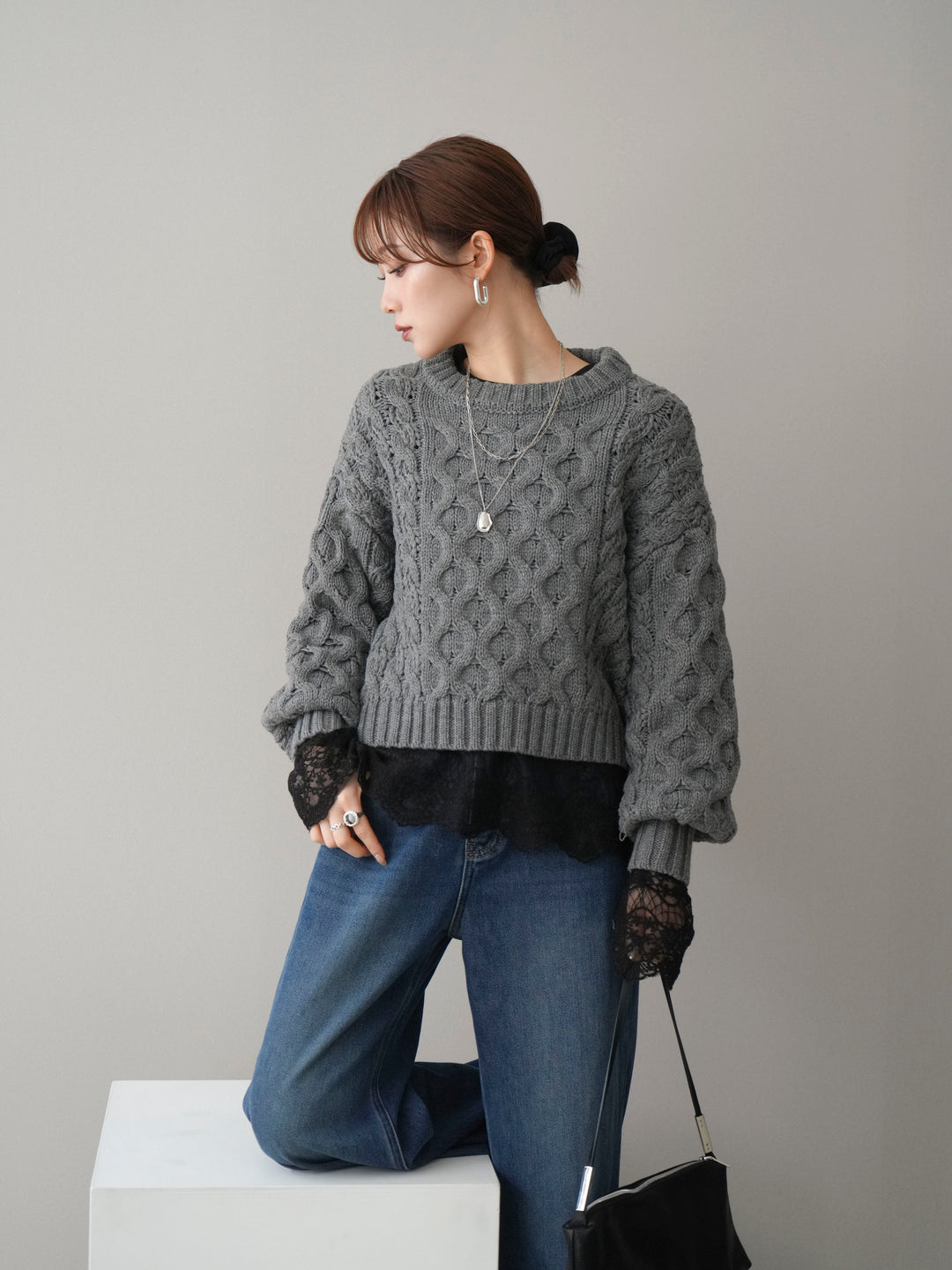 [SET]バルキーケーブルクロップドニットプルオーバー+チュールレーストップス(2set)