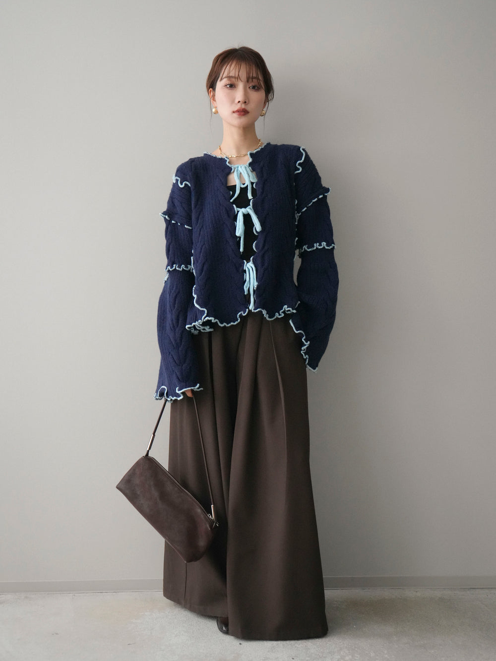 [SET]フロントリボン配色メローニットカーディガン+テープベルトタックバギーパンツ(2set)