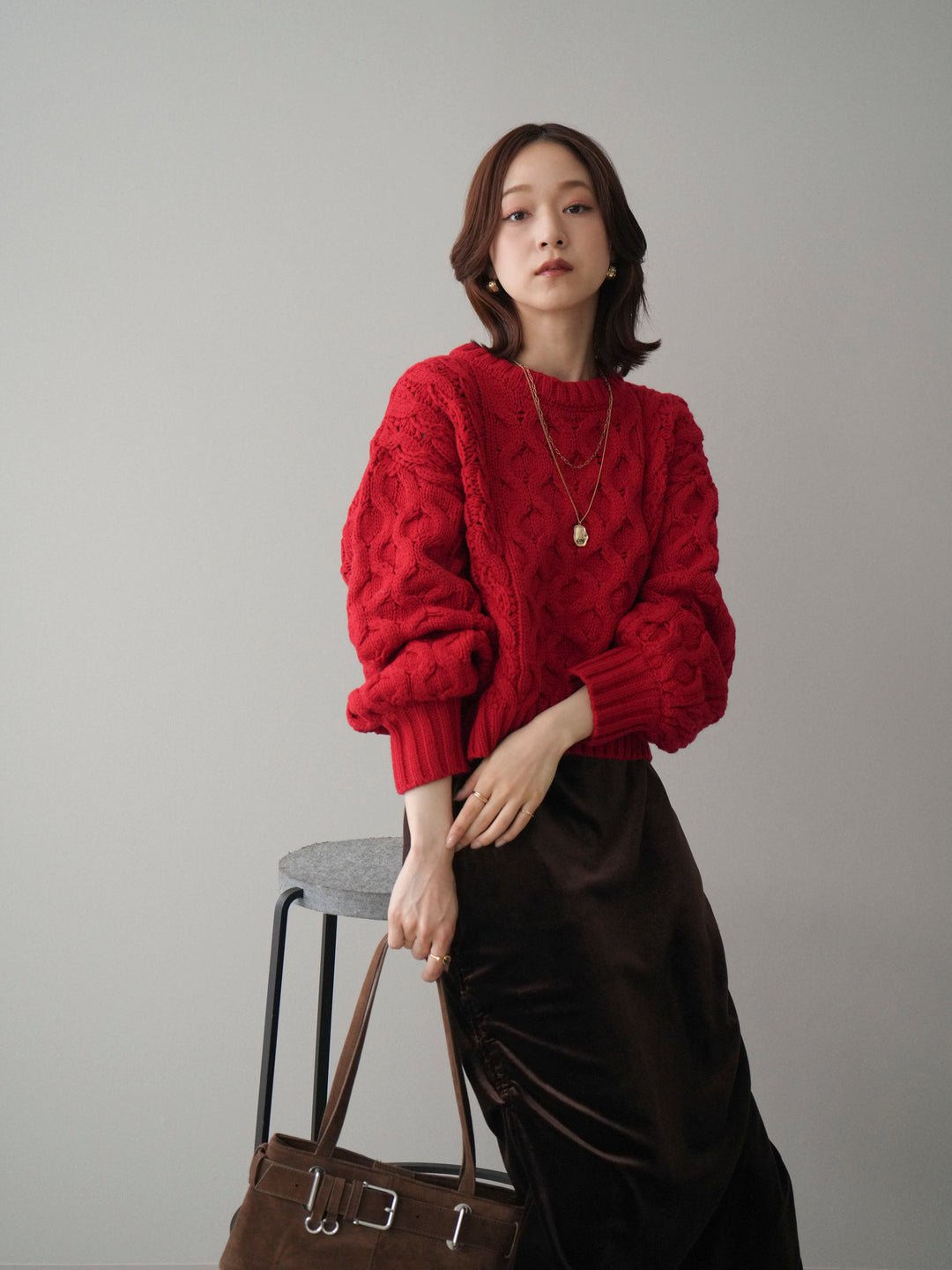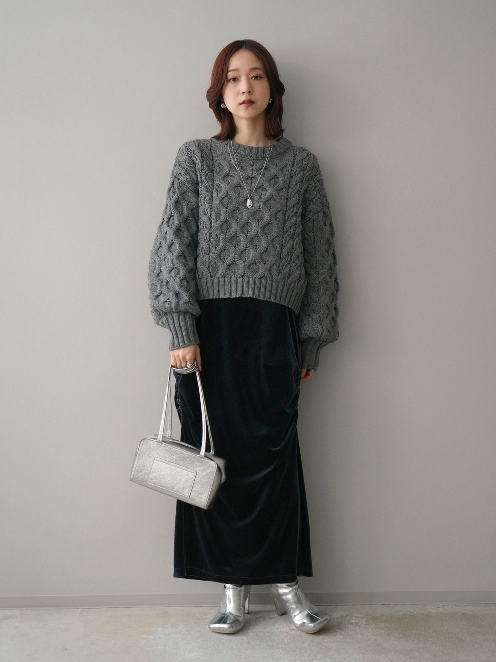 [SET]バルキーケーブルクロップドニットプルオーバー+ギャザーベロアスカート(2set)