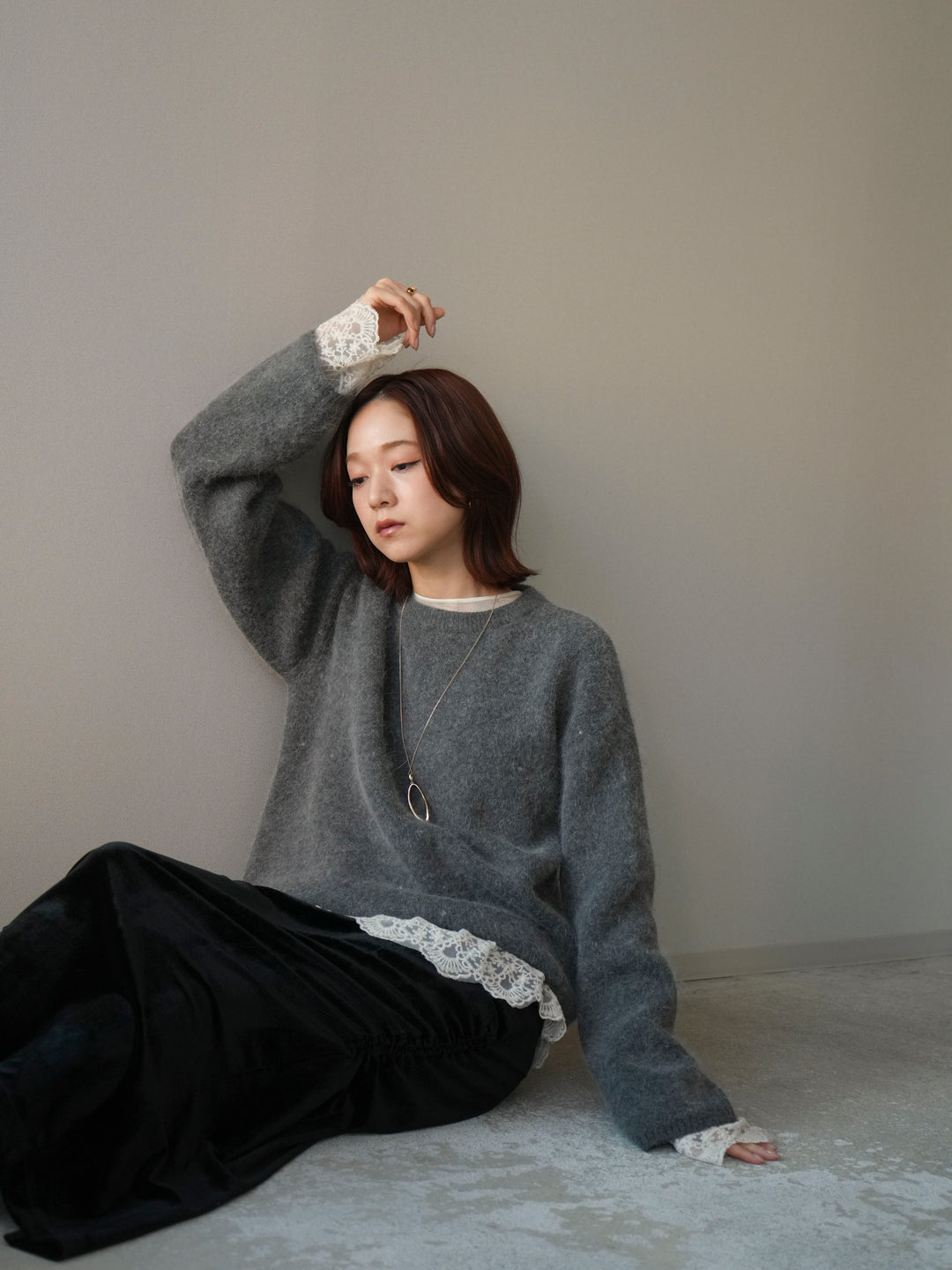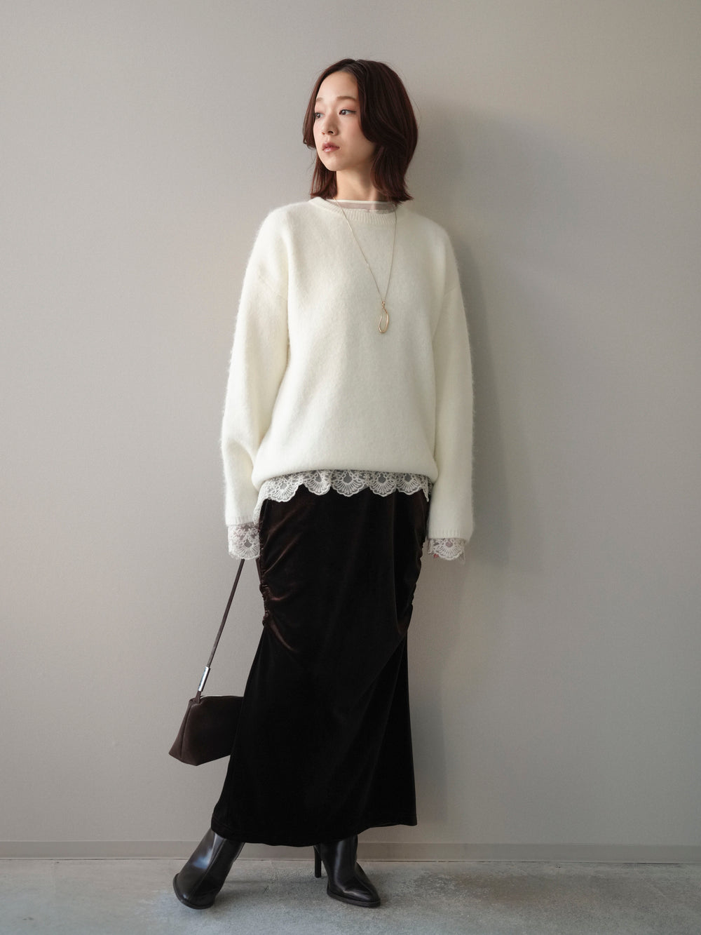 [SET]アンゴラタッチクルーネックニットプルオーバー+チュールレーストップス+ギャザーベロアスカート(3set)