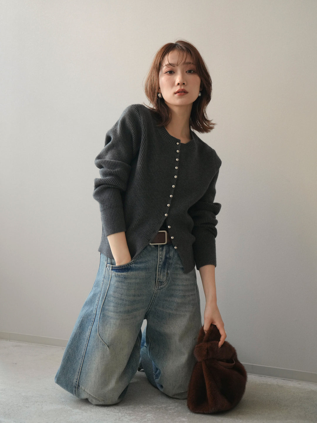 [SET]シルバーボタン畦編みニットカーディガン+ベルト付カーブデニムパンツ(2set)