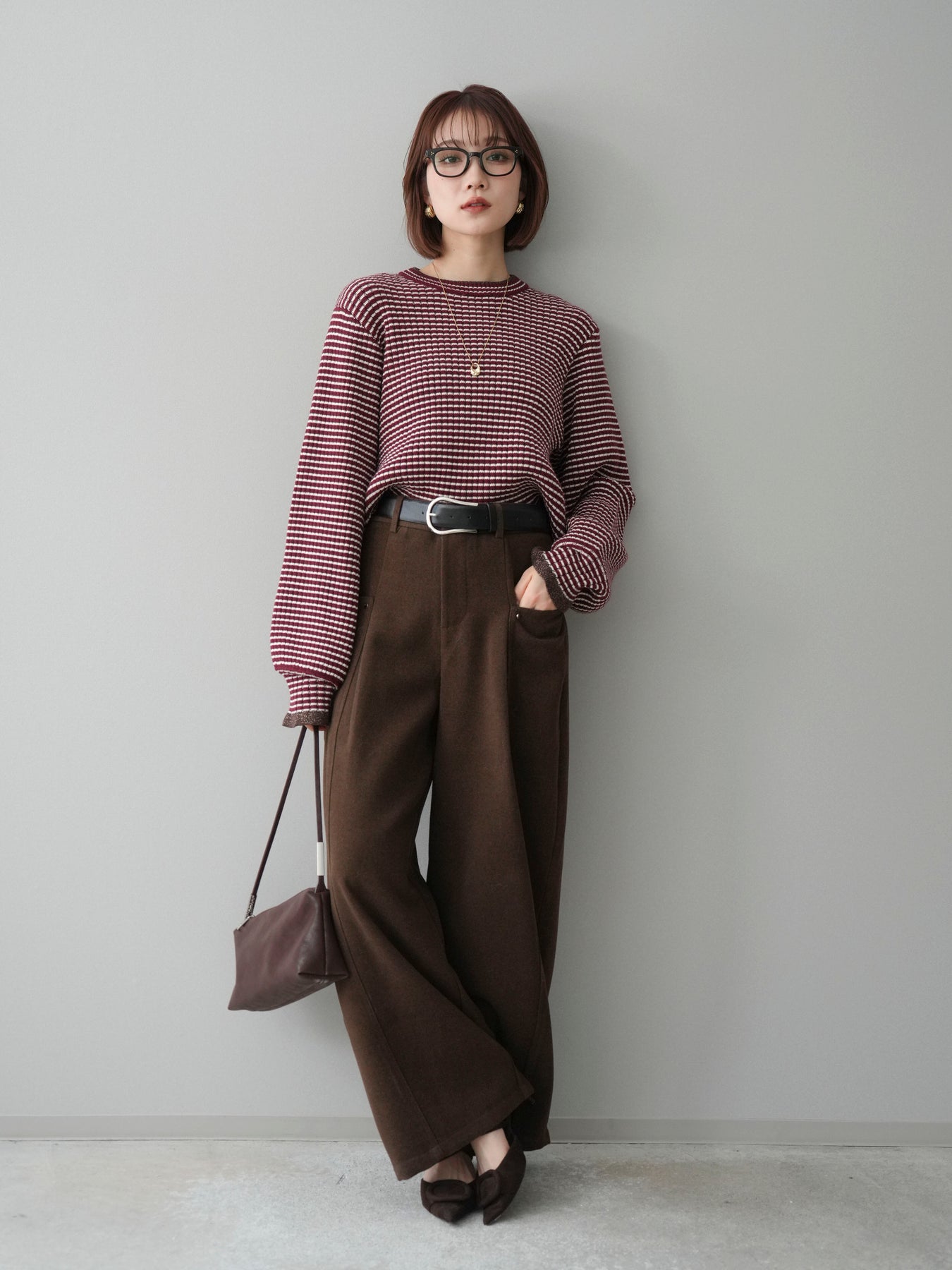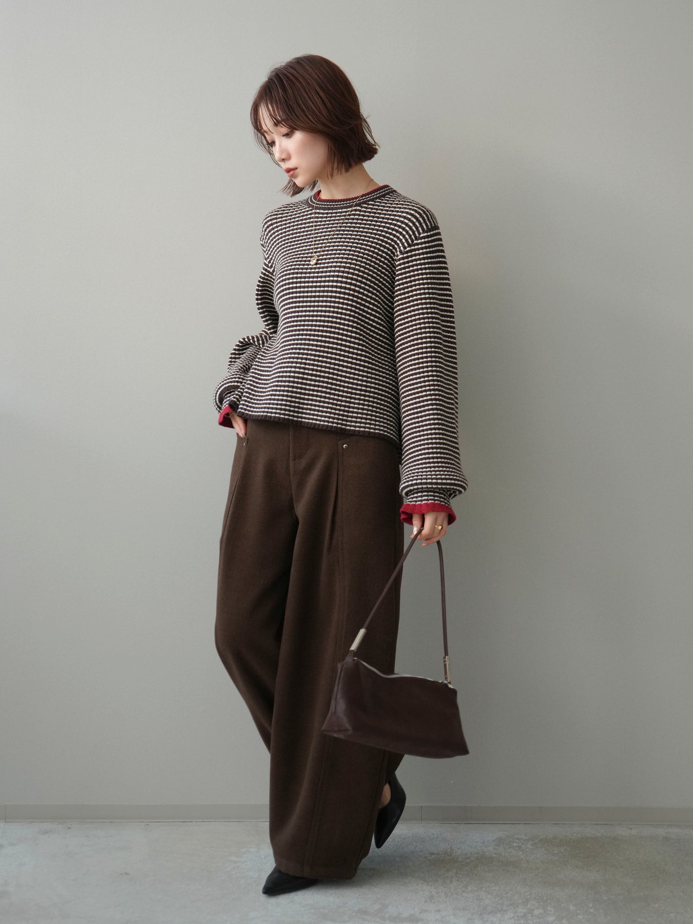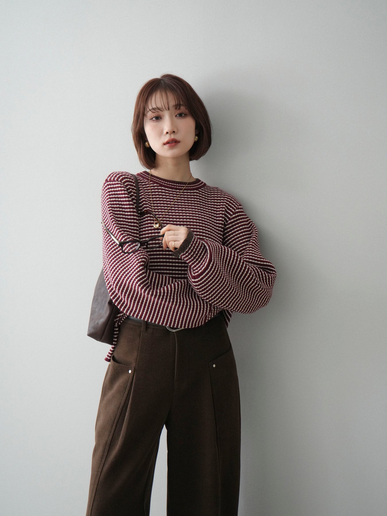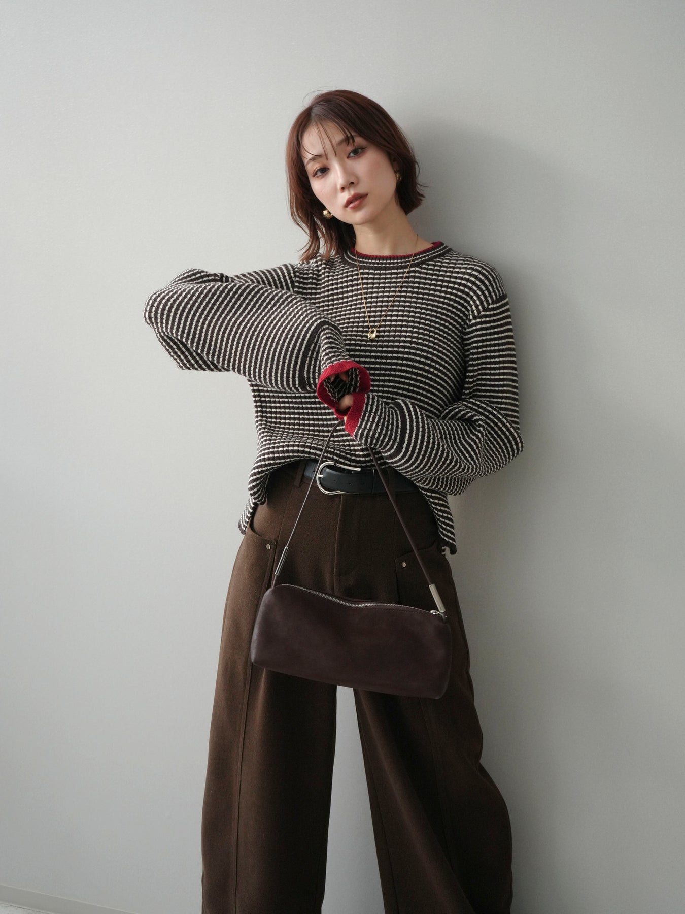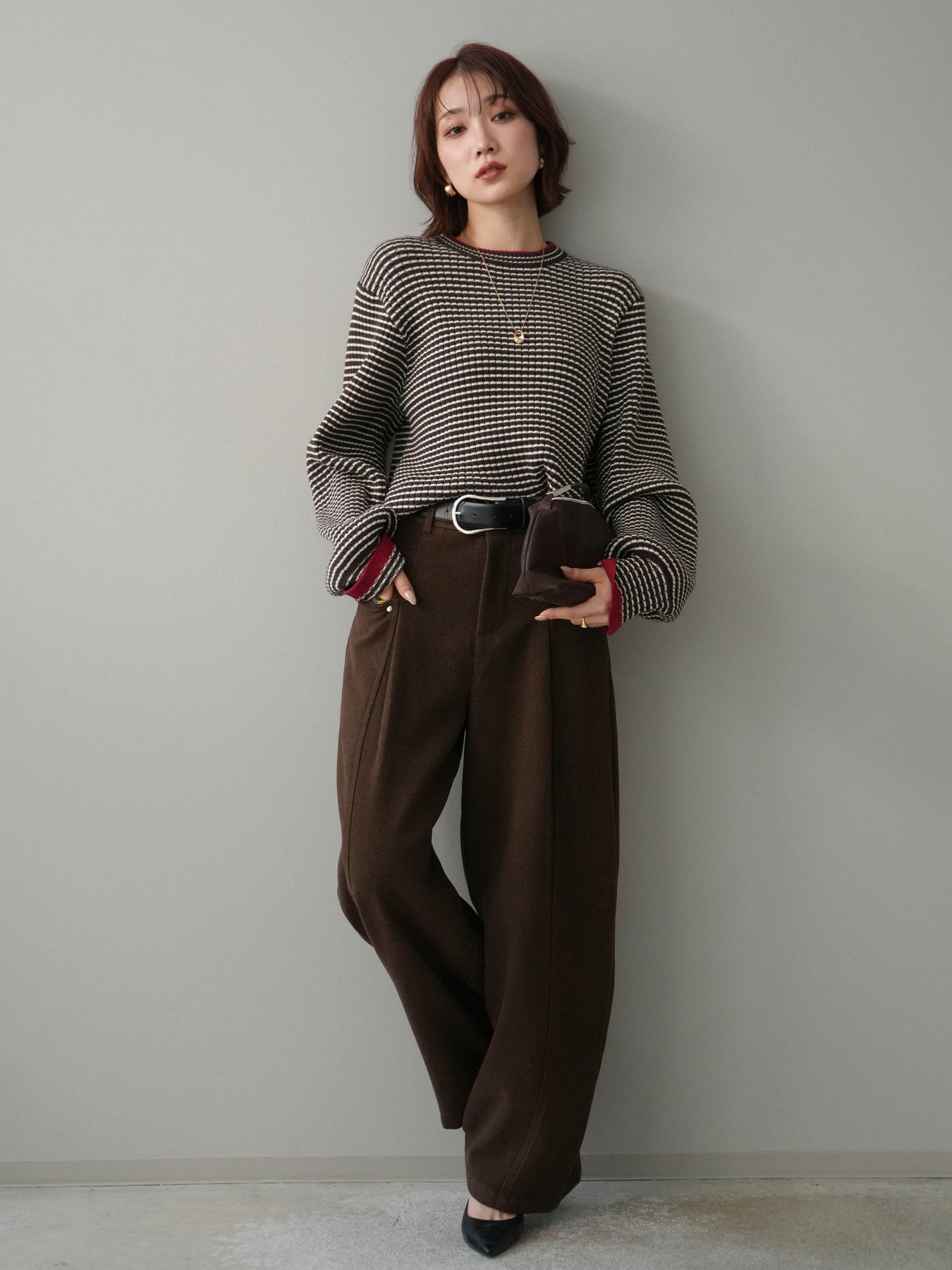 [SET]ラメ異素材ボーダーリブニットプルオーバー+ベルト付起毛コクーンパンツ(2set)