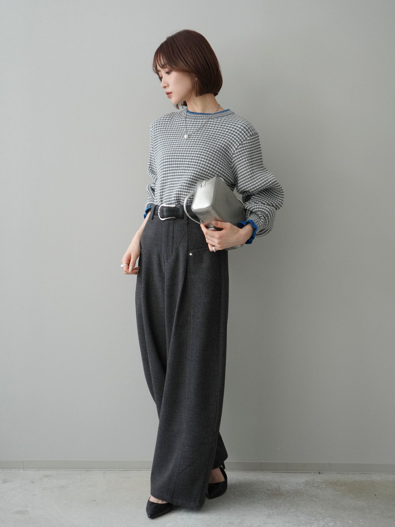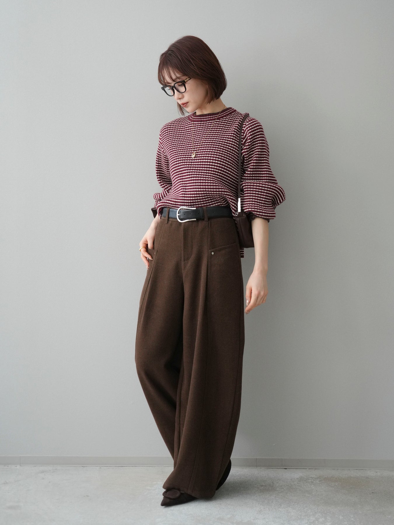 起毛感のある素材を使用したコクーンシルエットのパンツ。ベルト付きデザインでウエスト周りをすっきりと見せつつ、立体的なフォルムがこなれた印象を演出します。合わせるトップスを選ばず、デイリーからきれいめまで幅広く活躍する一着です。