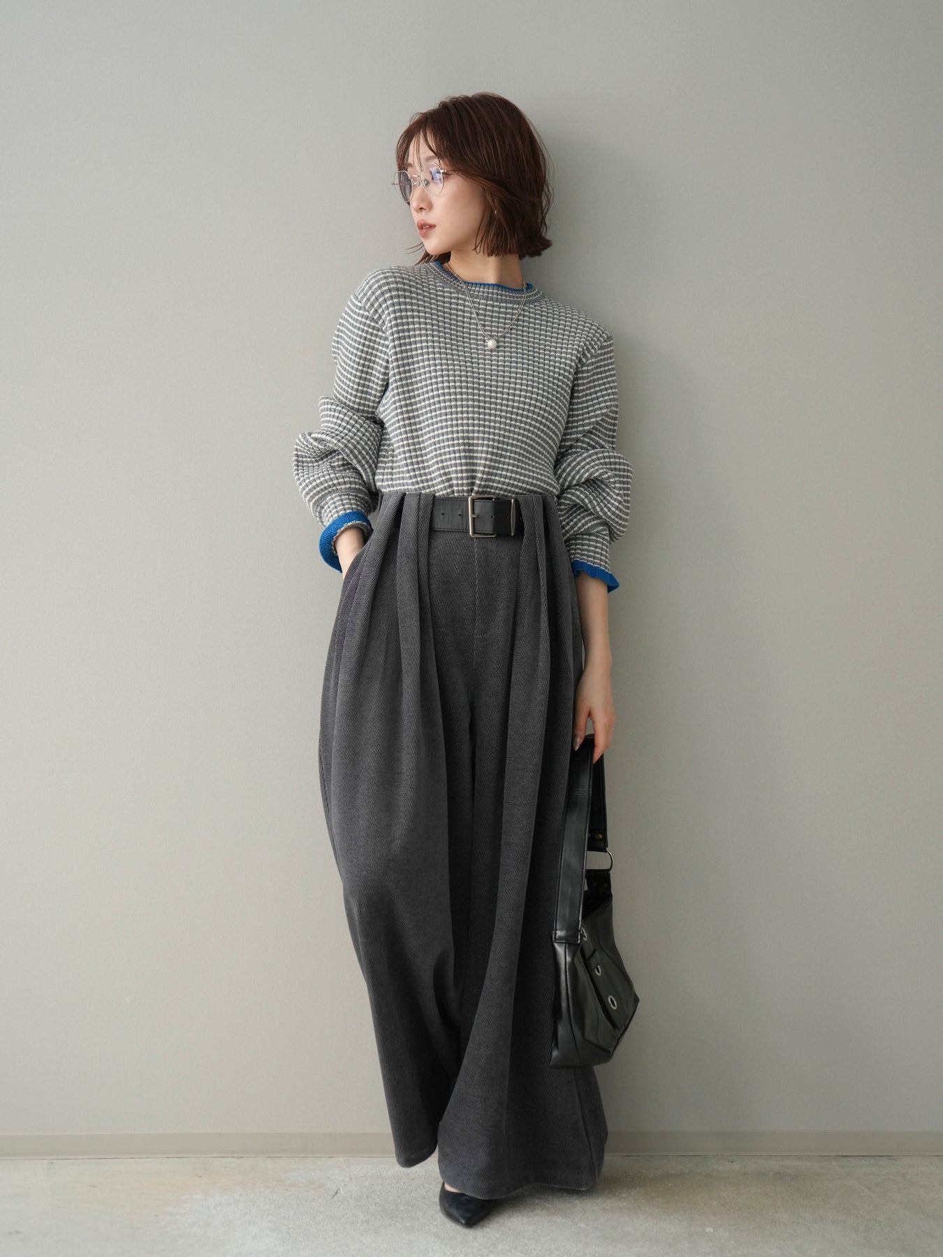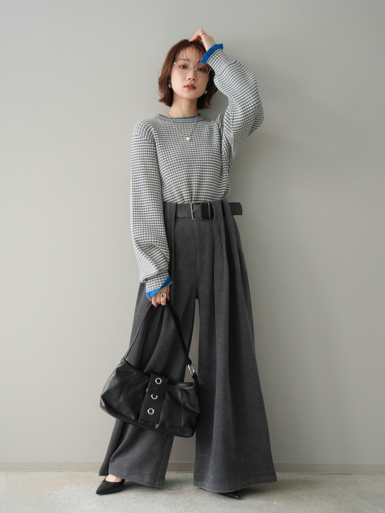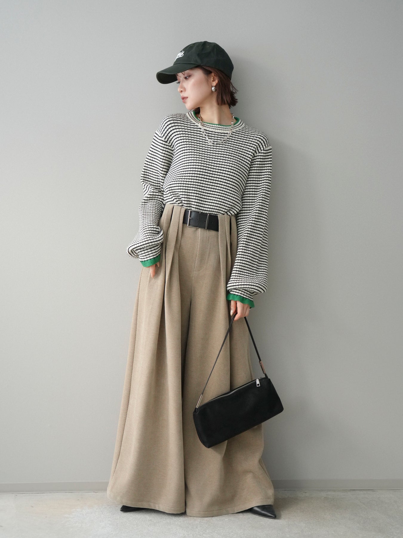 立体的なループデザインが印象的な、存在感抜群のコールテンワイドパンツ。フロントに重なるように配されたループが縦のラインを強調し、歩くたびにゆらめく動きがコーデに奥行きを与えてくれます。しっかりとしたコールテン素材がシルエットを美しく保ちつつ、ワイド特有のリラックス感も両立。セットのベルトがウエストまわりを引き締め、スタイリングをバランスよくまとめてくれます。シンプルなトップスと合わせるだけで主役級の着こなしが完成する、個性と上品さを備えた一本です。