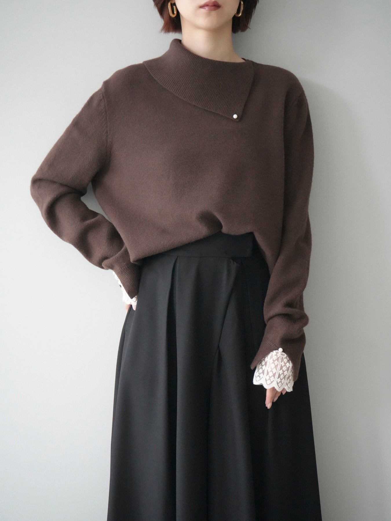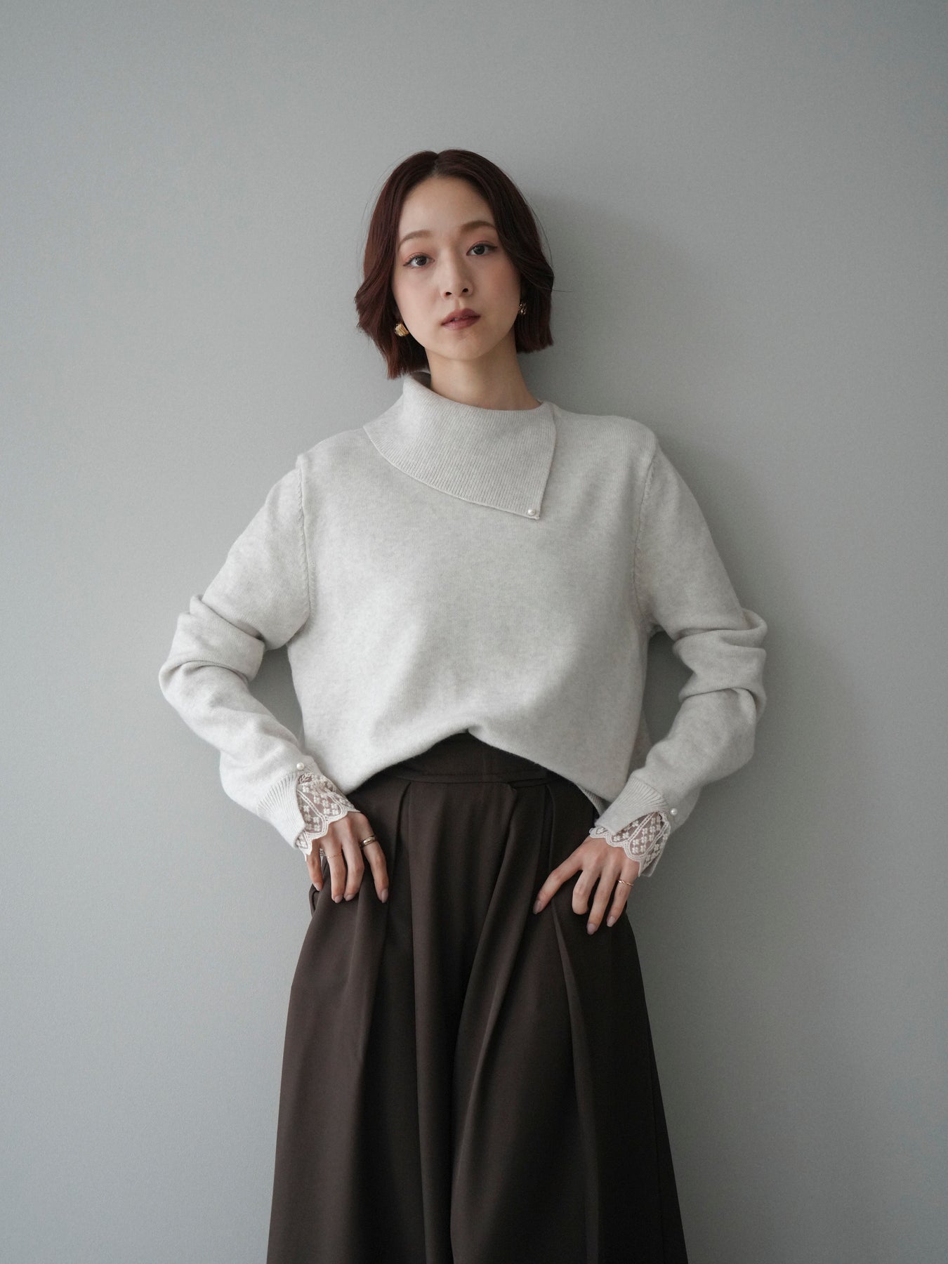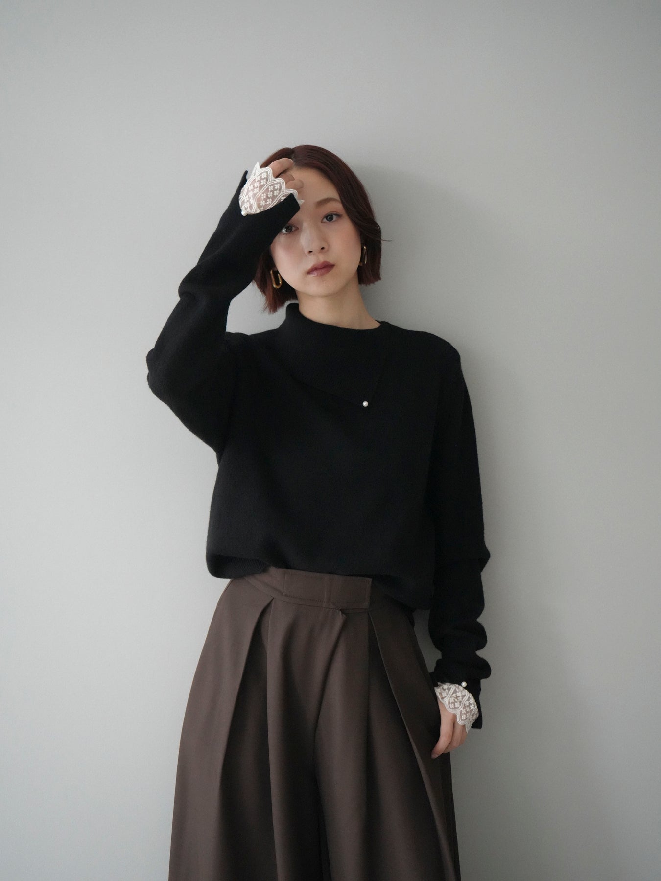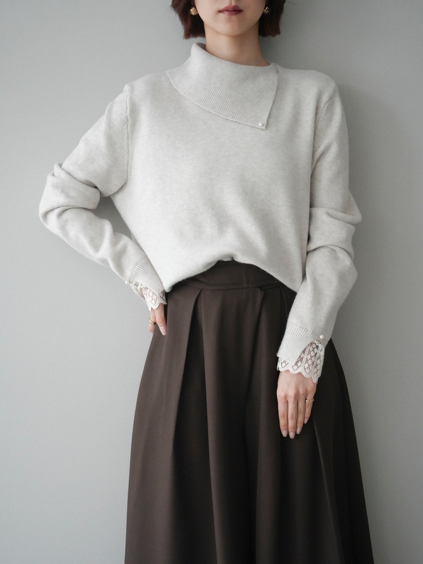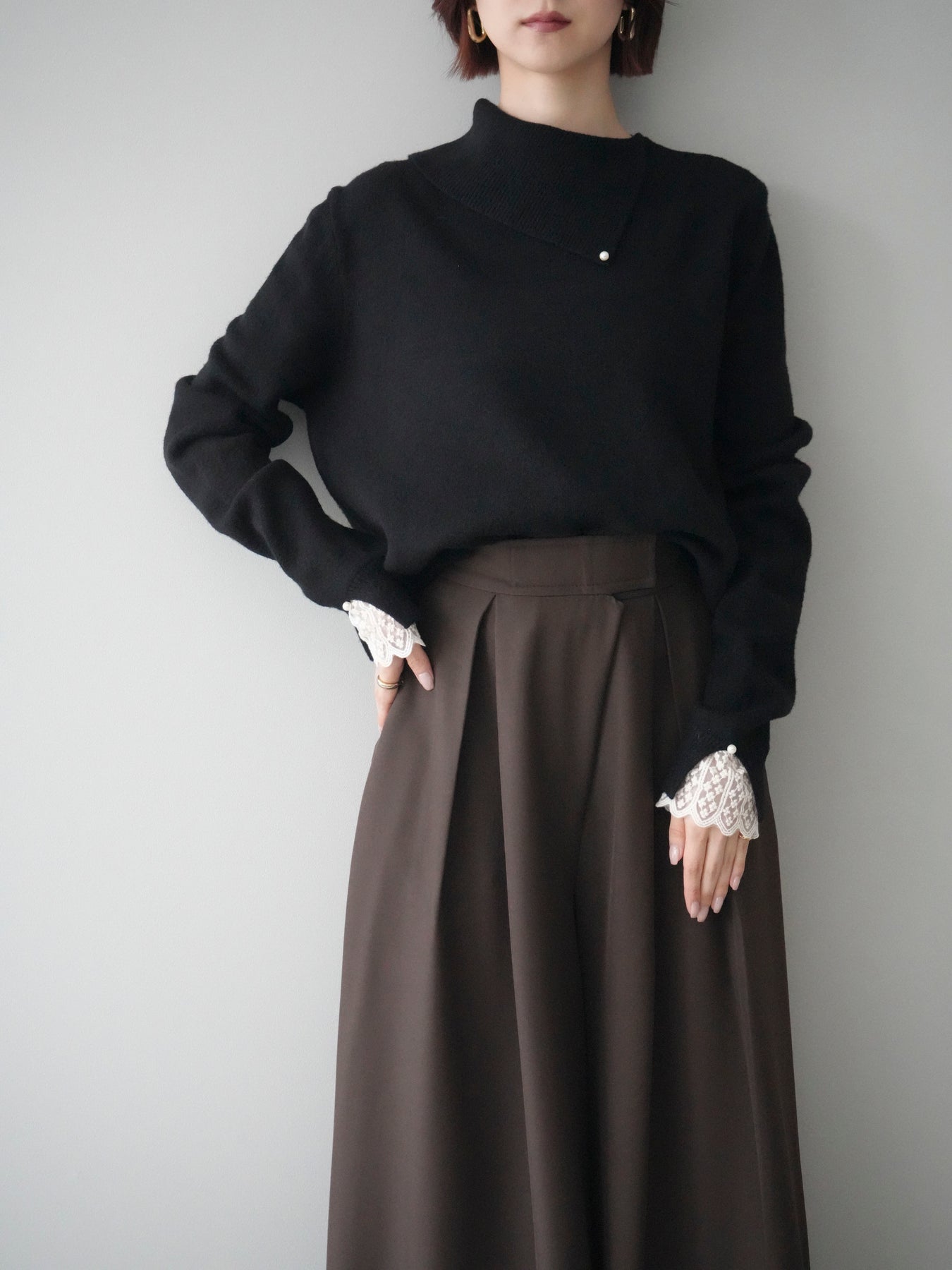 袖口のレースとさりげなく添えられたパールが華やかなアクセントになる配色ニットトップス。上品なディテールを取り入れながらも日常使いしやすいデザインで、1枚でフェミニンな印象を演出します。首元の配色とアシンメトリーデザインが表情を引き締め、コーディネートにさりげない個性をプラス。柔らかな風合いで着心地も良く、カジュアルからきれいめまで幅広く活躍する万能な一枚です。デイリーコーデに華やぎを添えるトップスをお探しの方におすすめ。 ※ボトムス、キャミソール(インナー)以外の商品は一律でインナーは付属していません。