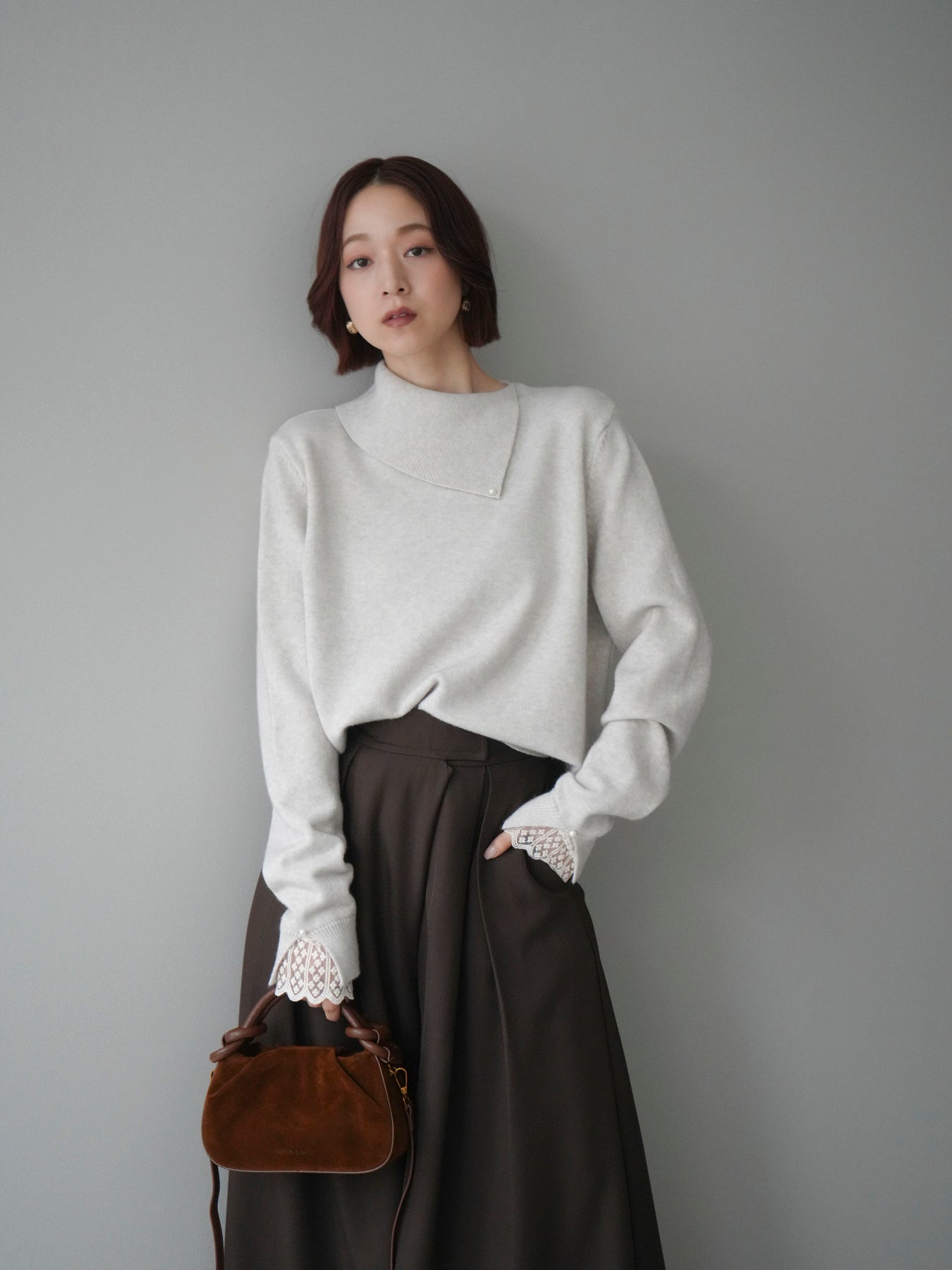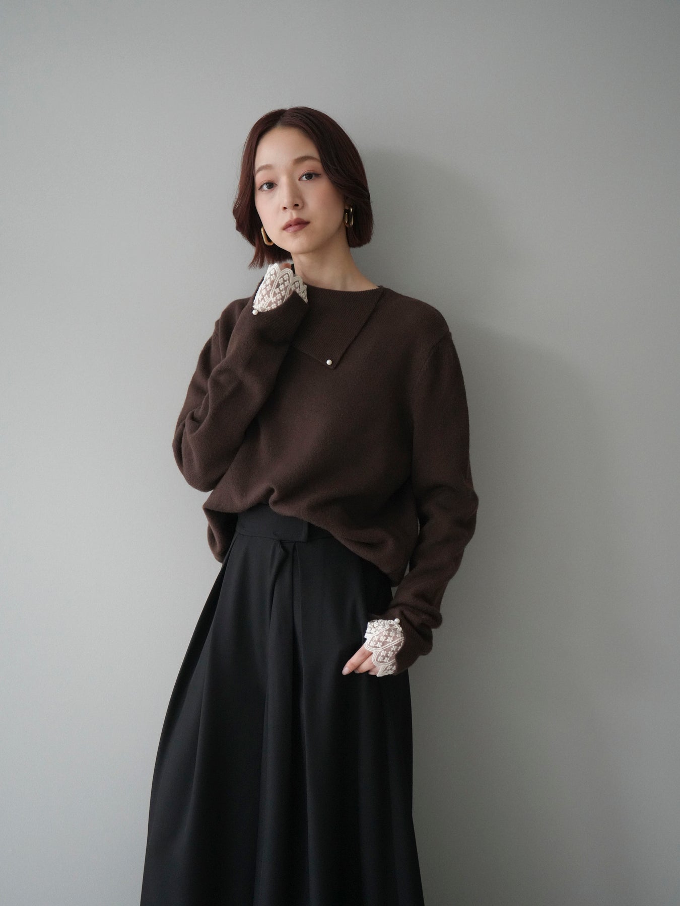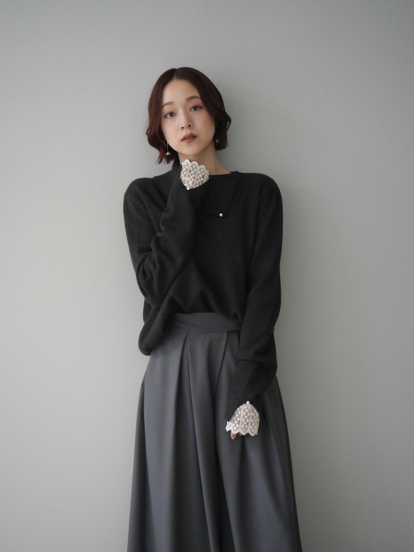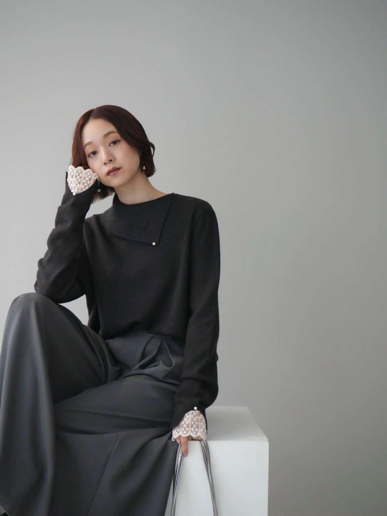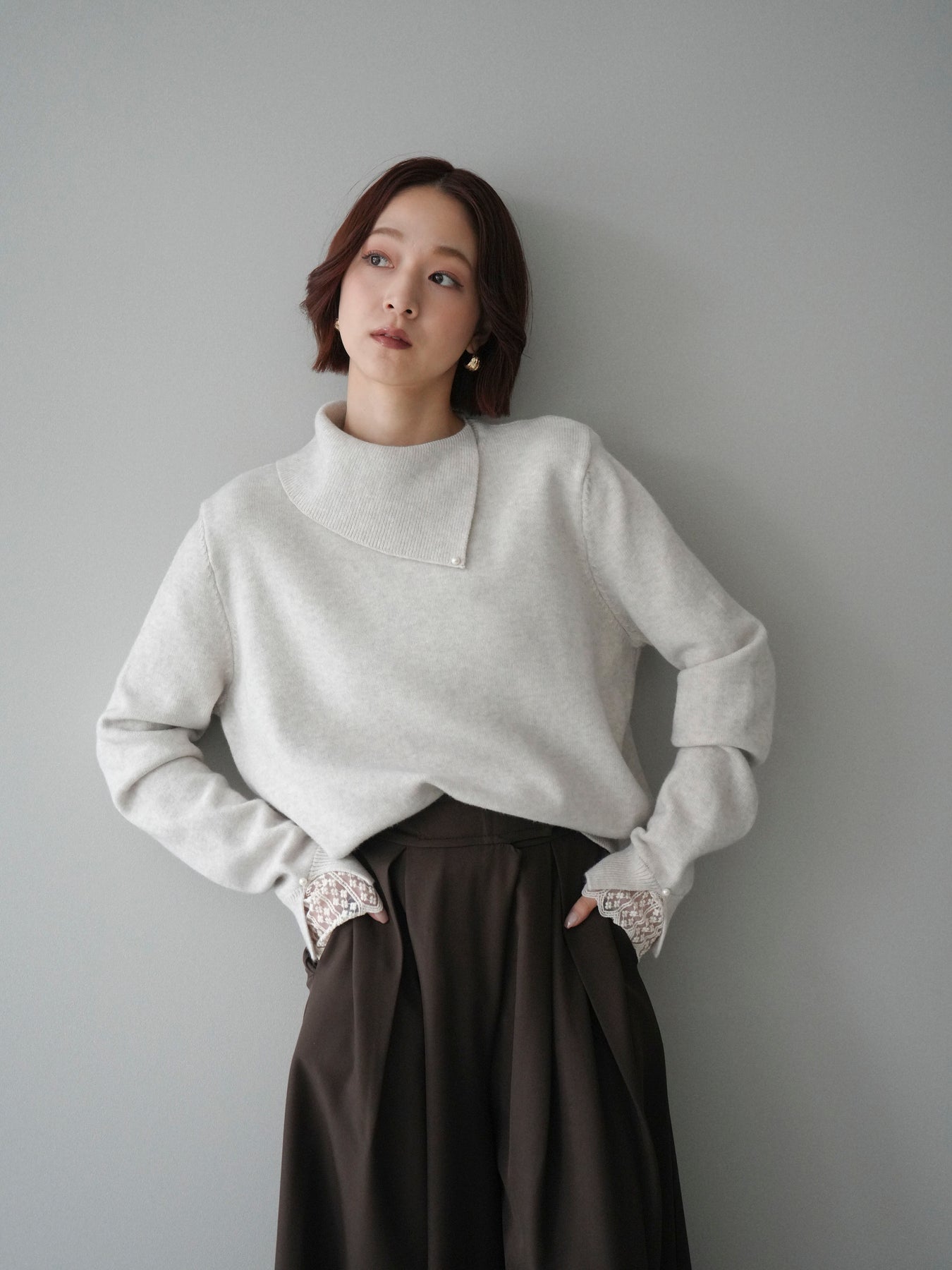 袖口のレースとさりげなく添えられたパールが華やかなアクセントになる配色ニットトップス。上品なディテールを取り入れながらも日常使いしやすいデザインで、1枚でフェミニンな印象を演出します。首元の配色とアシンメトリーデザインが表情を引き締め、コーディネートにさりげない個性をプラス。柔らかな風合いで着心地も良く、カジュアルからきれいめまで幅広く活躍する万能な一枚です。デイリーコーデに華やぎを添えるトップスをお探しの方におすすめ。 ※ボトムス、キャミソール(インナー)以外の商品は一律でインナーは付属していません。