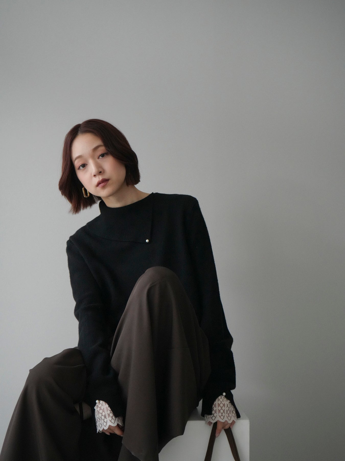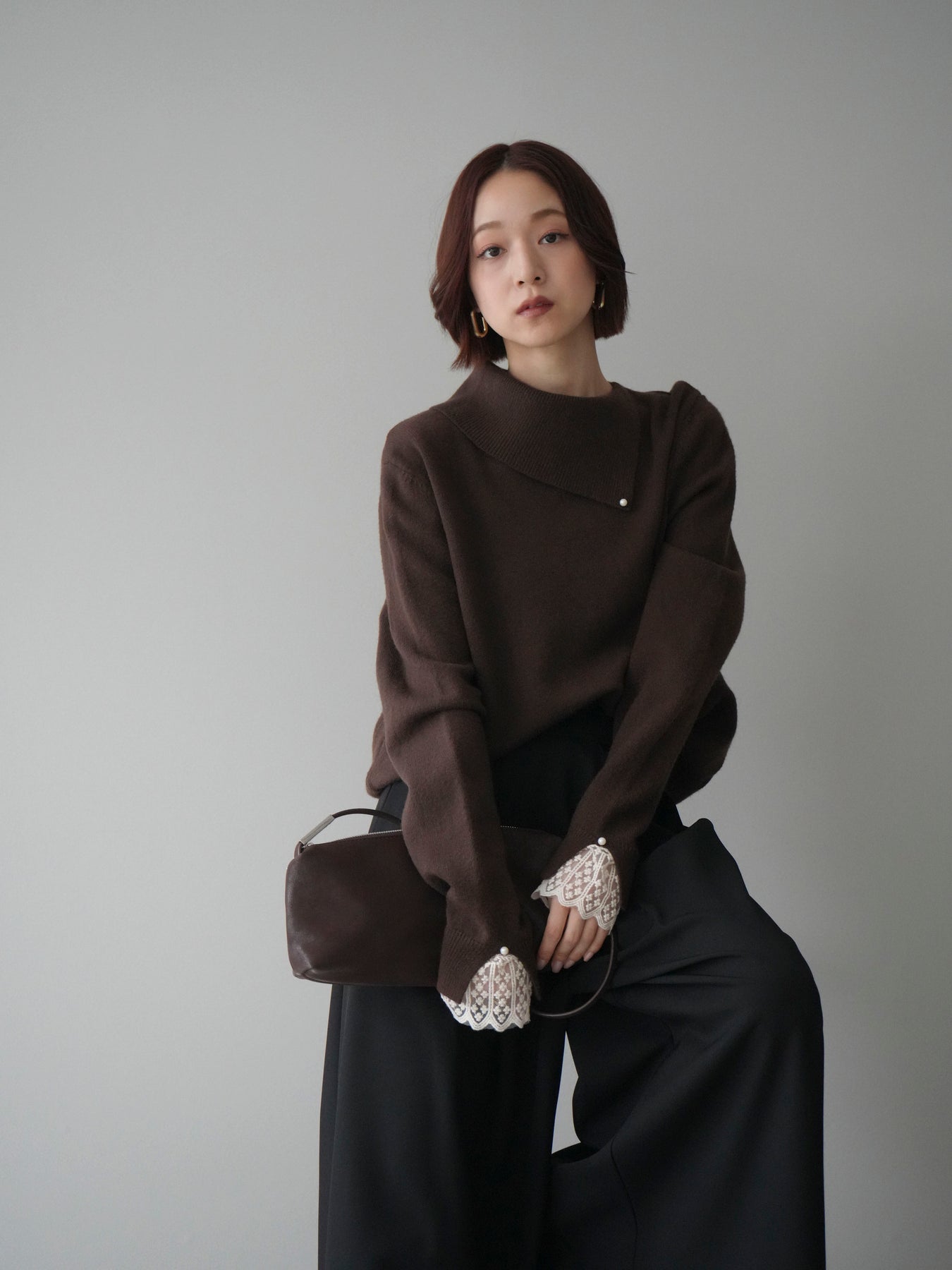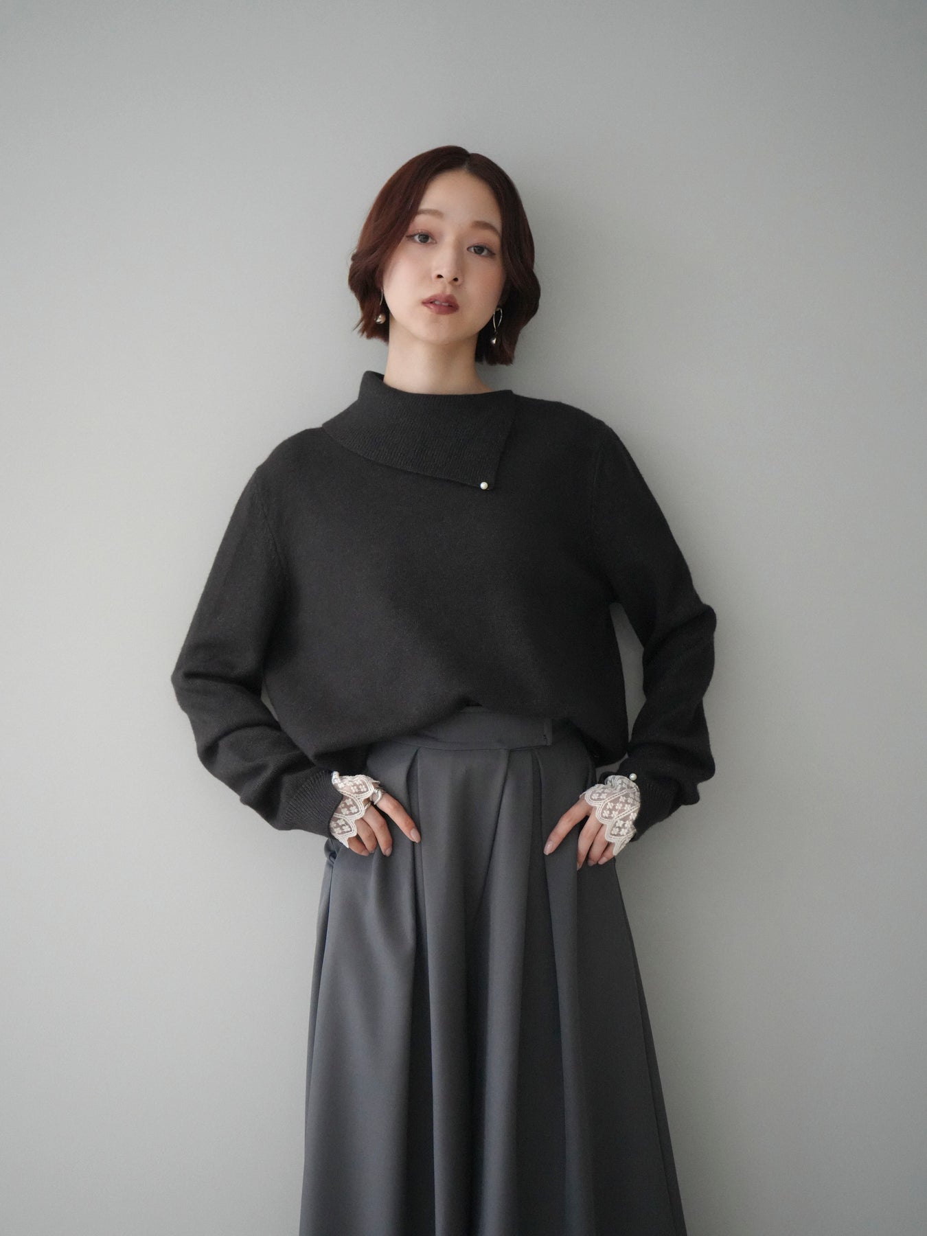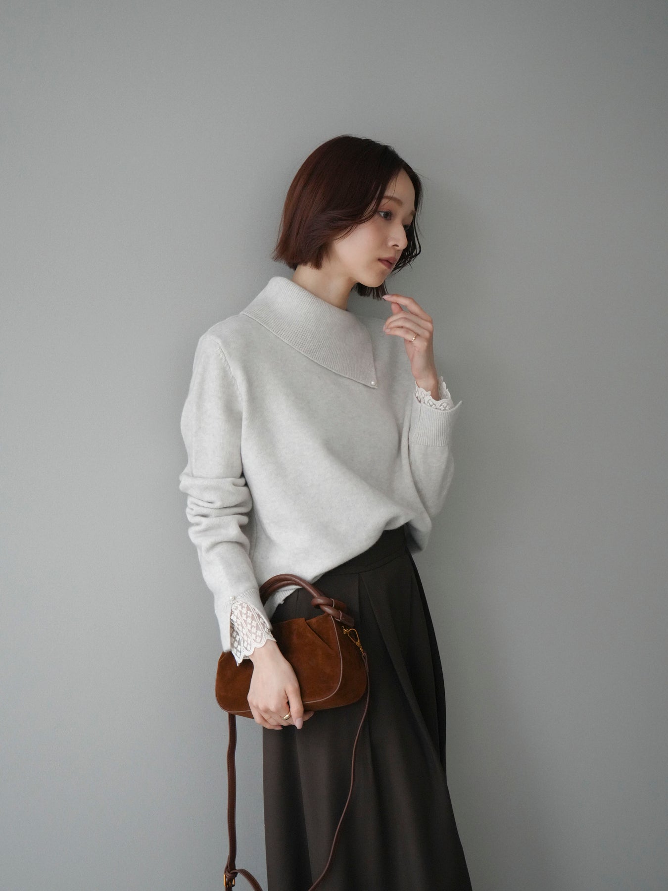 袖口のレースとさりげなく添えられたパールが華やかなアクセントになる配色ニットトップス。上品なディテールを取り入れながらも日常使いしやすいデザインで、1枚でフェミニンな印象を演出します。首元の配色とアシンメトリーデザインが表情を引き締め、コーディネートにさりげない個性をプラス。柔らかな風合いで着心地も良く、カジュアルからきれいめまで幅広く活躍する万能な一枚です。デイリーコーデに華やぎを添えるトップスをお探しの方におすすめ。 ※ボトムス、キャミソール(インナー)以外の商品は一律でインナーは付属していません。