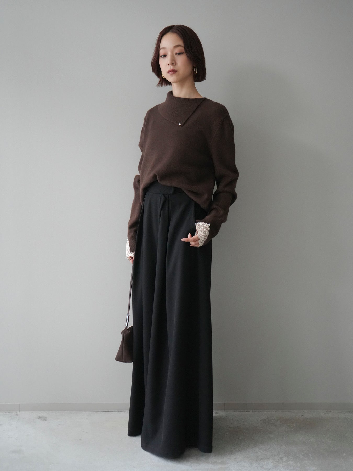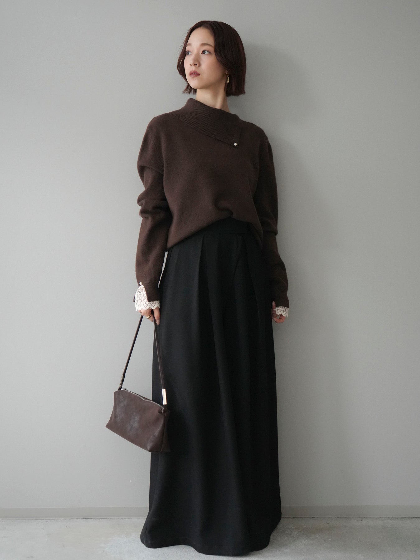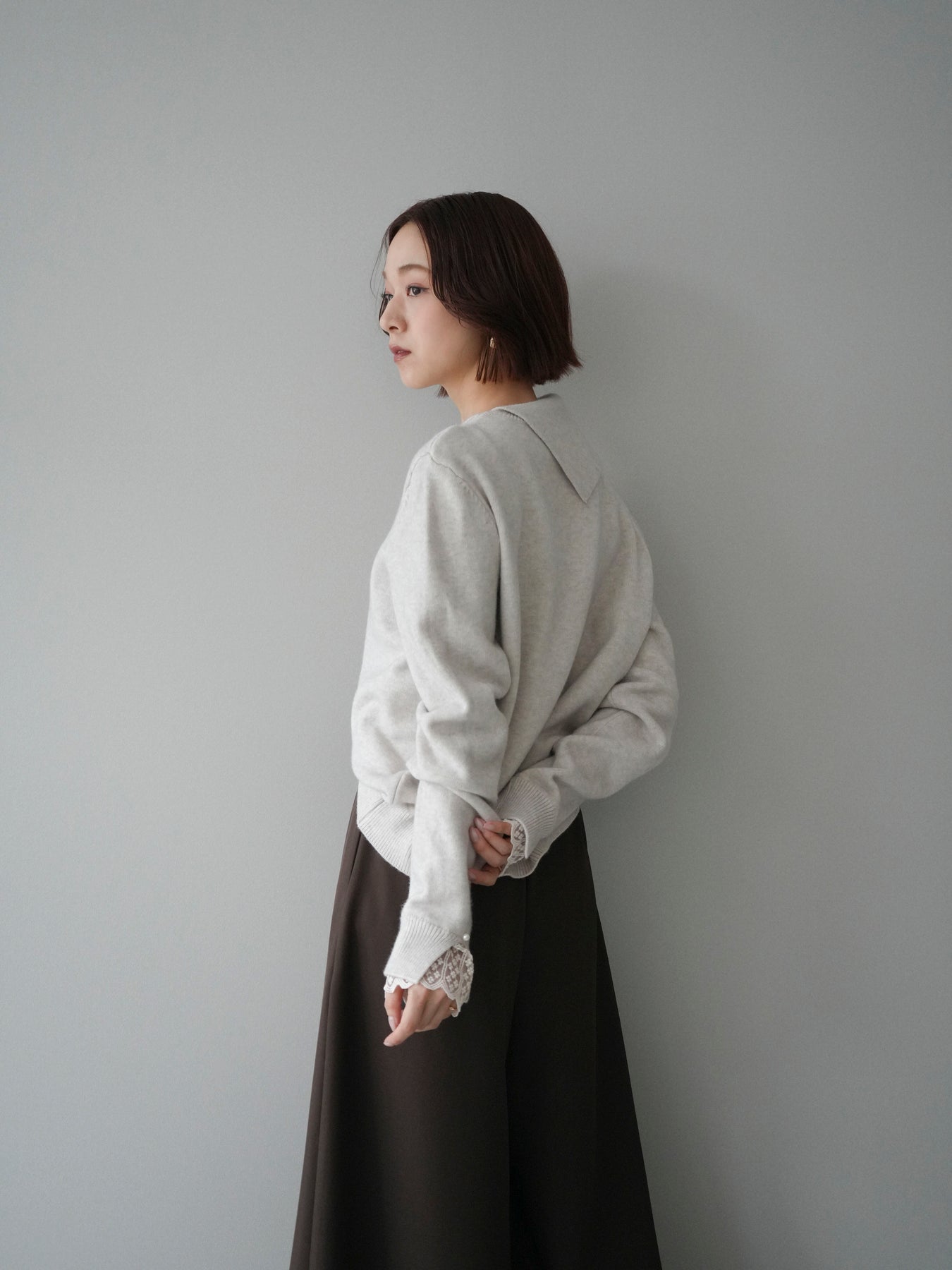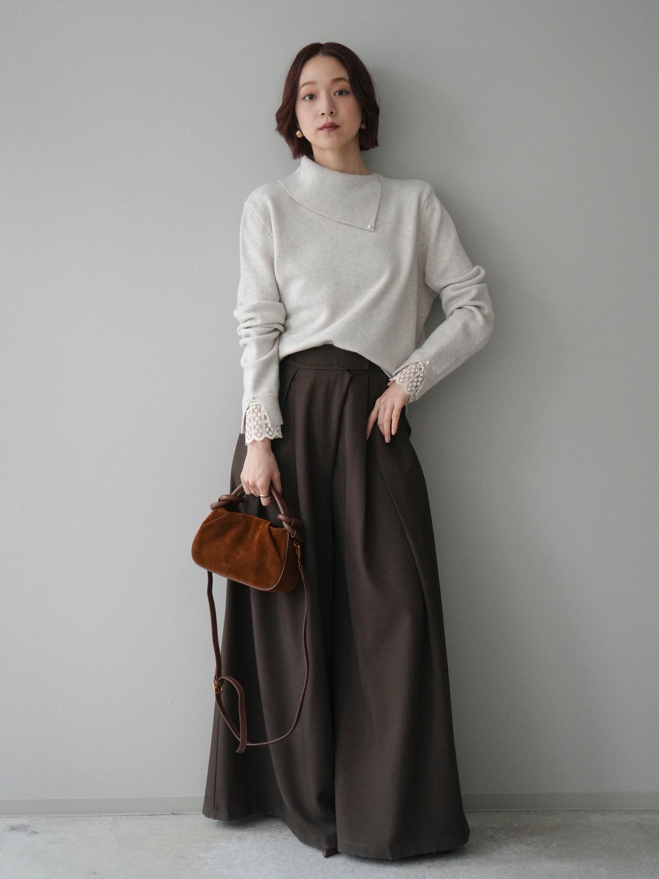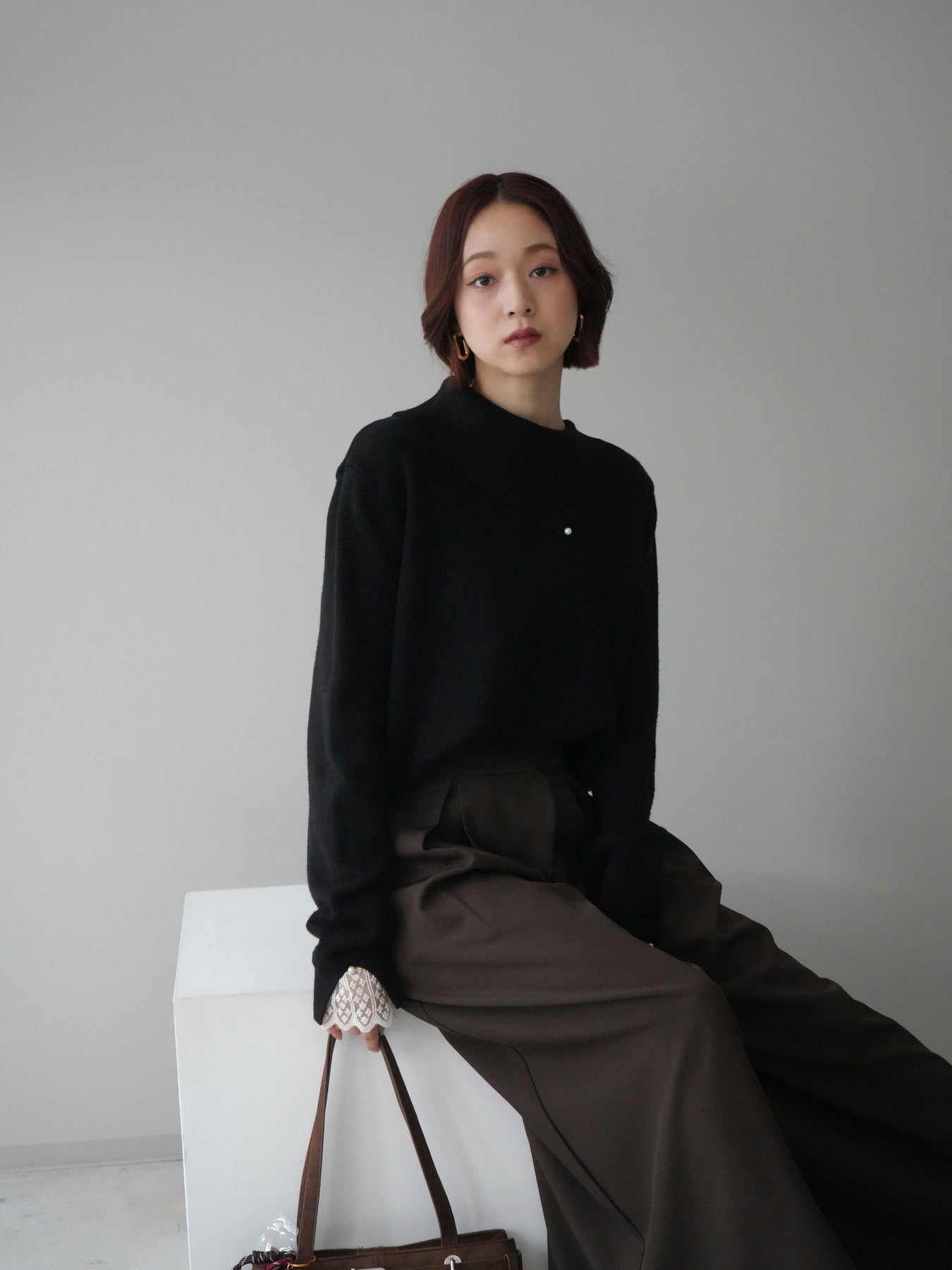 袖口のレースとさりげなく添えられたパールが華やかなアクセントになる配色ニットトップス。上品なディテールを取り入れながらも日常使いしやすいデザインで、1枚でフェミニンな印象を演出します。首元の配色とアシンメトリーデザインが表情を引き締め、コーディネートにさりげない個性をプラス。柔らかな風合いで着心地も良く、カジュアルからきれいめまで幅広く活躍する万能な一枚です。デイリーコーデに華やぎを添えるトップスをお探しの方におすすめ。 ※ボトムス、キャミソール(インナー)以外の商品は一律でインナーは付属していません。