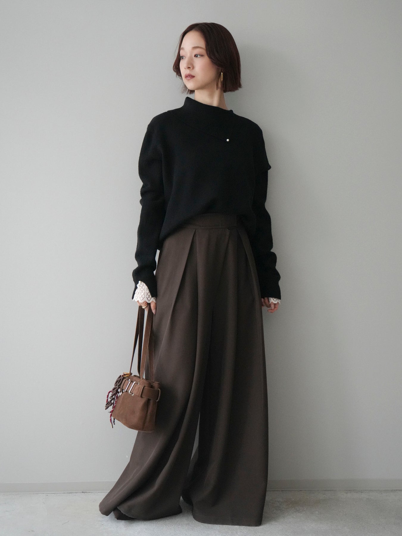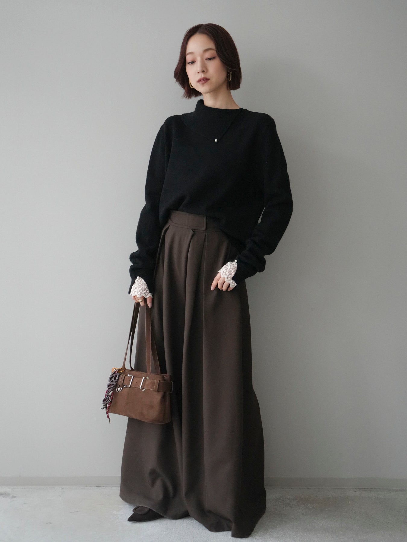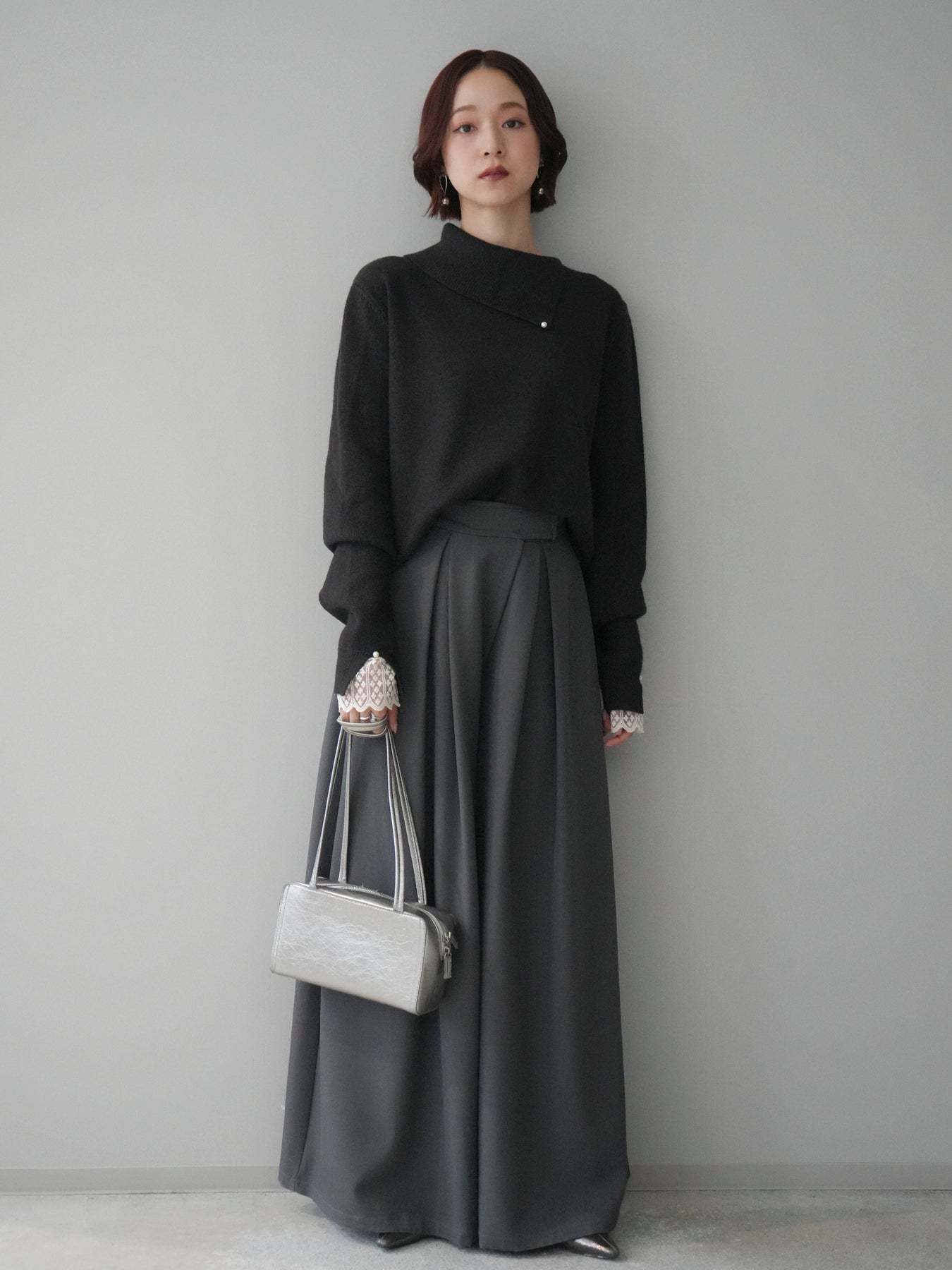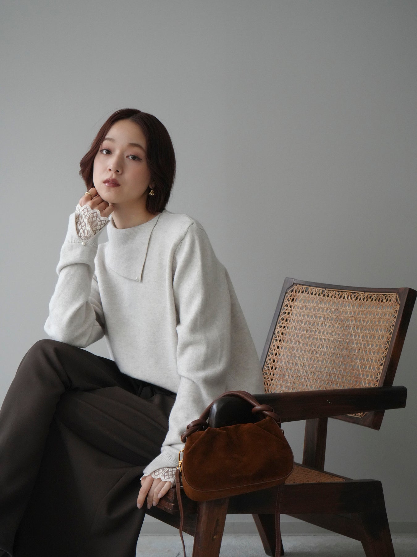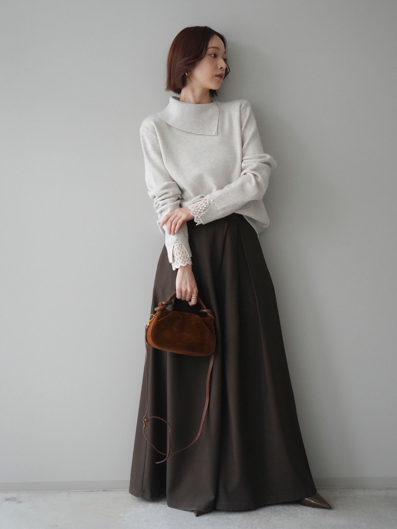 袖口のレースとさりげなく添えられたパールが華やかなアクセントになる配色ニットトップス。上品なディテールを取り入れながらも日常使いしやすいデザインで、1枚でフェミニンな印象を演出します。首元の配色とアシンメトリーデザインが表情を引き締め、コーディネートにさりげない個性をプラス。柔らかな風合いで着心地も良く、カジュアルからきれいめまで幅広く活躍する万能な一枚です。デイリーコーデに華やぎを添えるトップスをお探しの方におすすめ。 ※ボトムス、キャミソール(インナー)以外の商品は一律でインナーは付属していません。