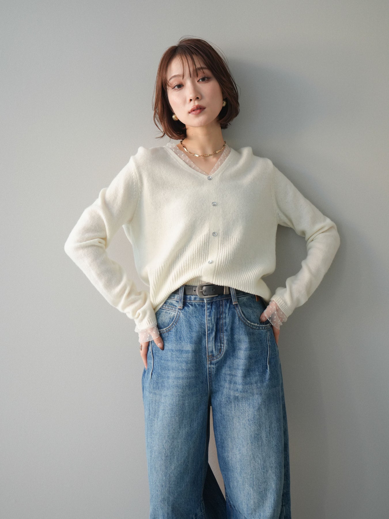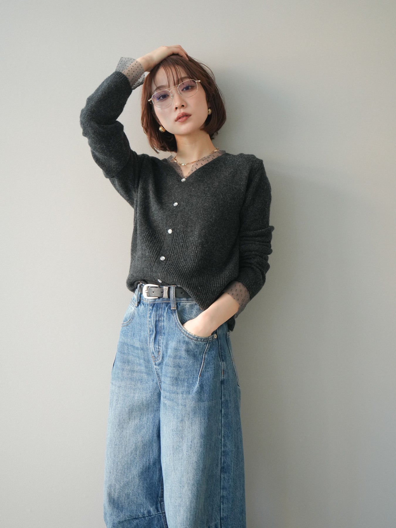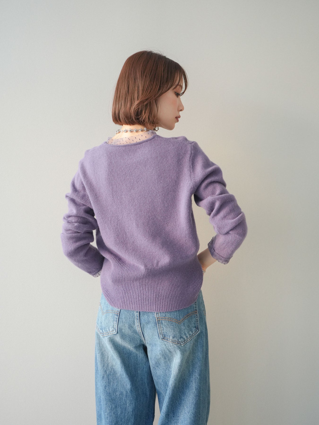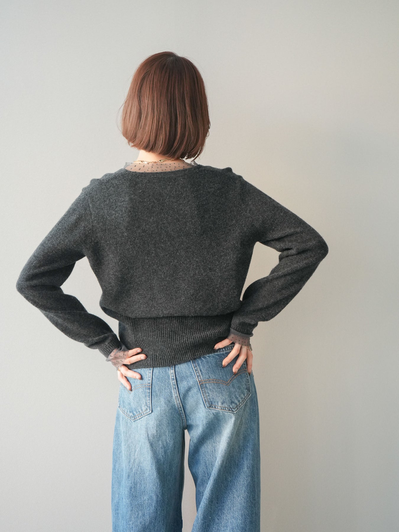 繊細なドットチュールを重ねたレイヤードデザインが、上品な華やかさを添えるニットトップス。襟元と袖口から覗くチュールが女性らしいニュアンスをプラスし、ボタンディテールが全体をすっきりとまとめてくれます。柔らかく肌ざわりの良いニット素材で着心地も快適。シルエットは程よくゆとりがありつつも品よく見えるバランスに仕上げており、シンプルなボトムと合わせるだけでスタイリングが完成します。デイリーから特別なシーンまで幅広く使える、着映えトップスです。 ※ボトムス、キャミソール(インナー)以外の商品は一律でインナーは付属していません。