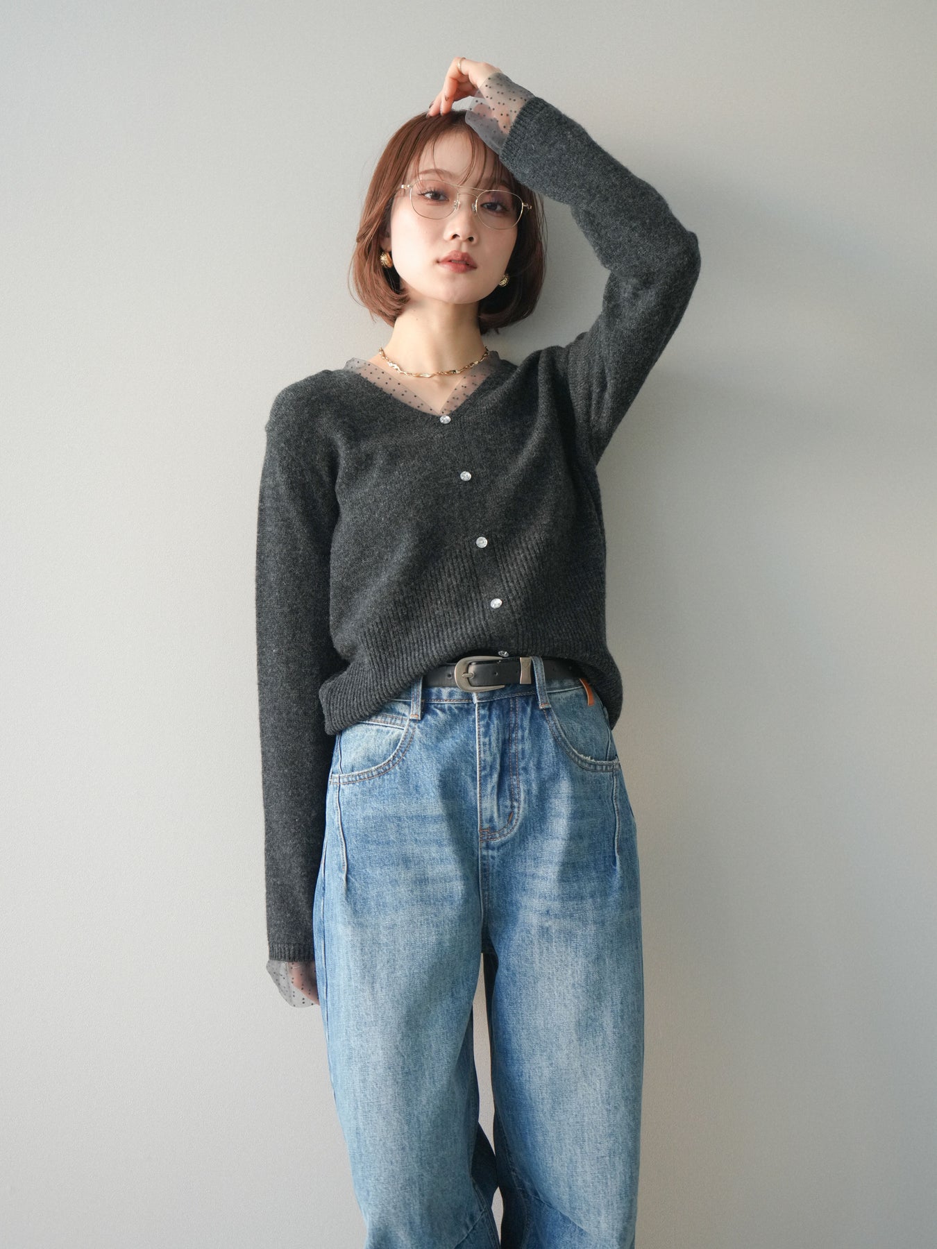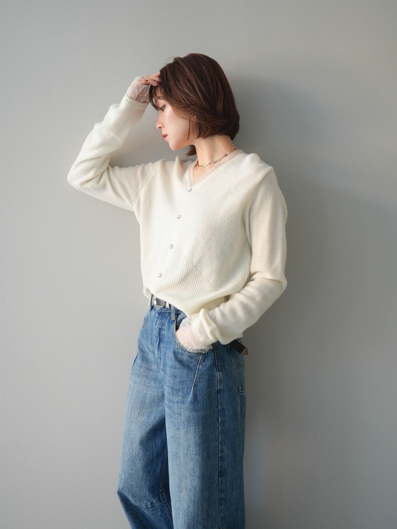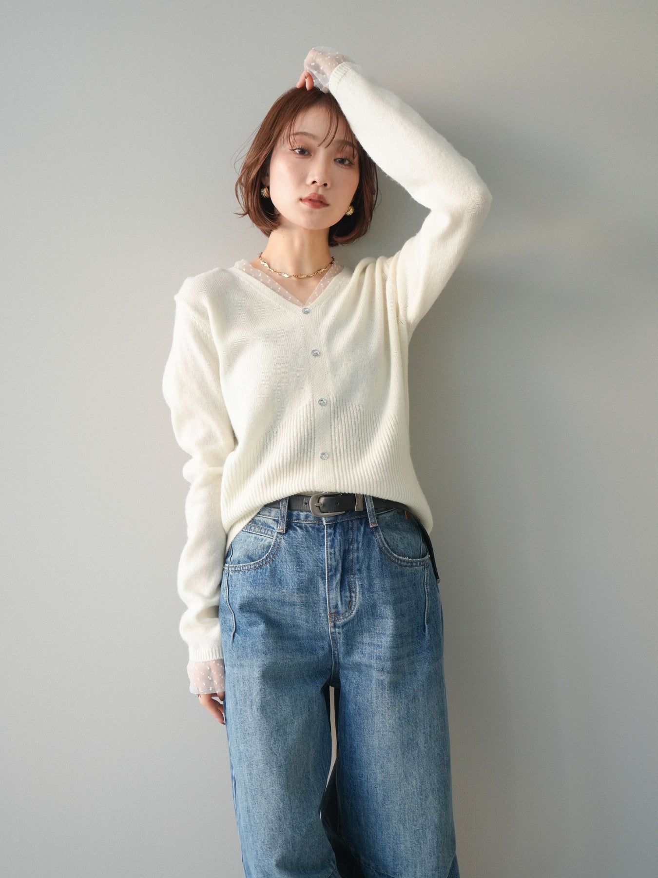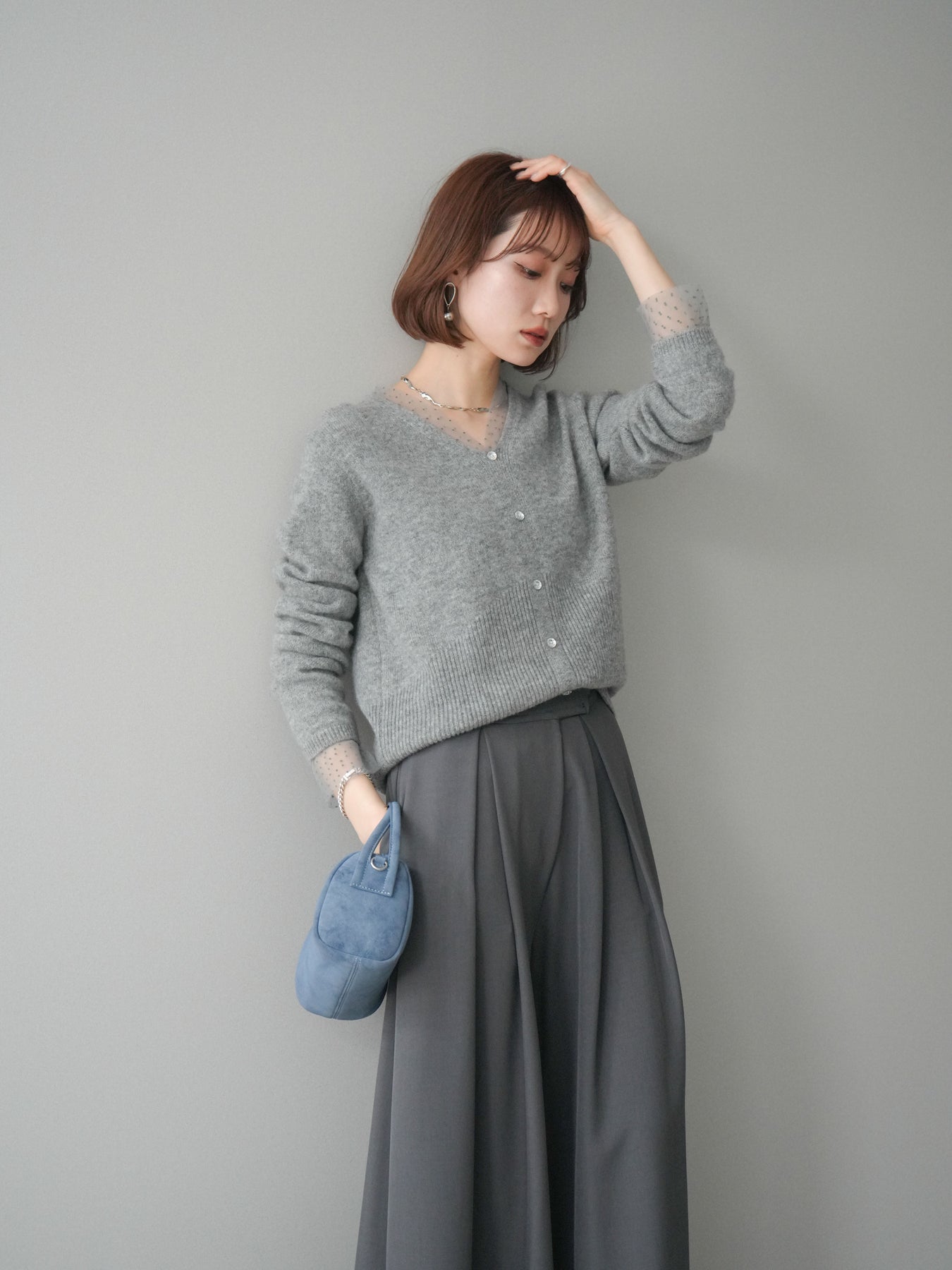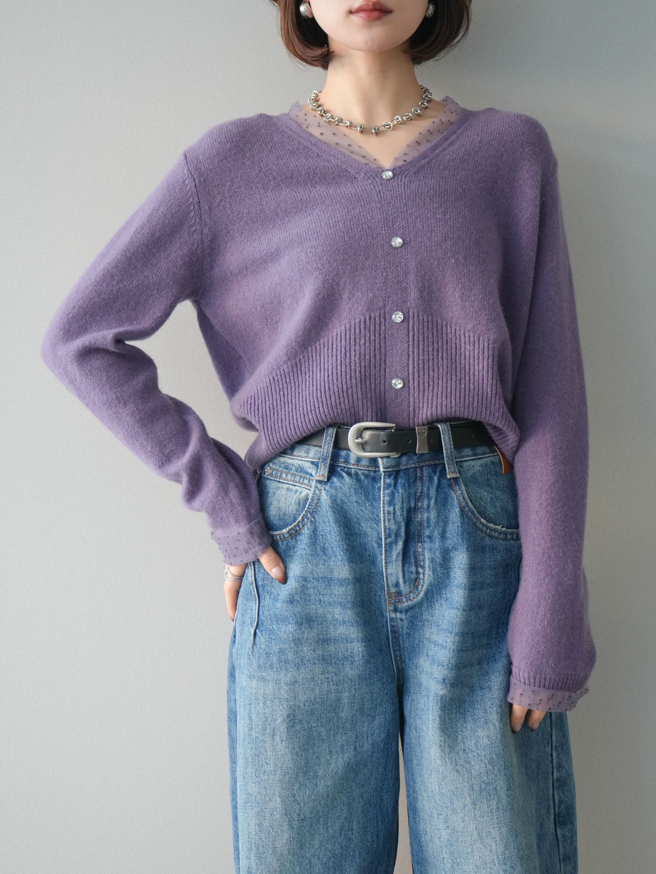 ◆ [予約]ドットチュールレイヤードボタンニットトップス
