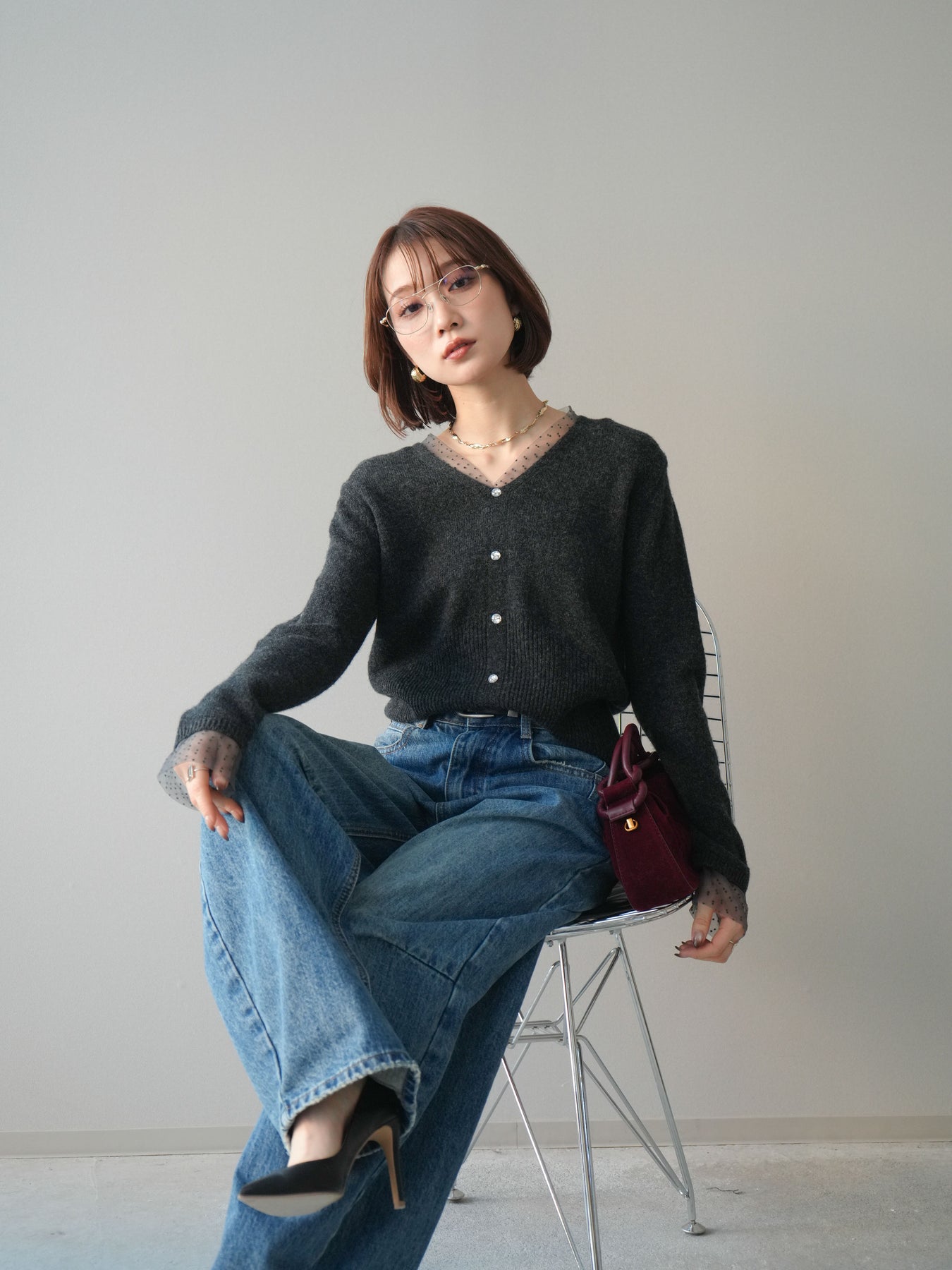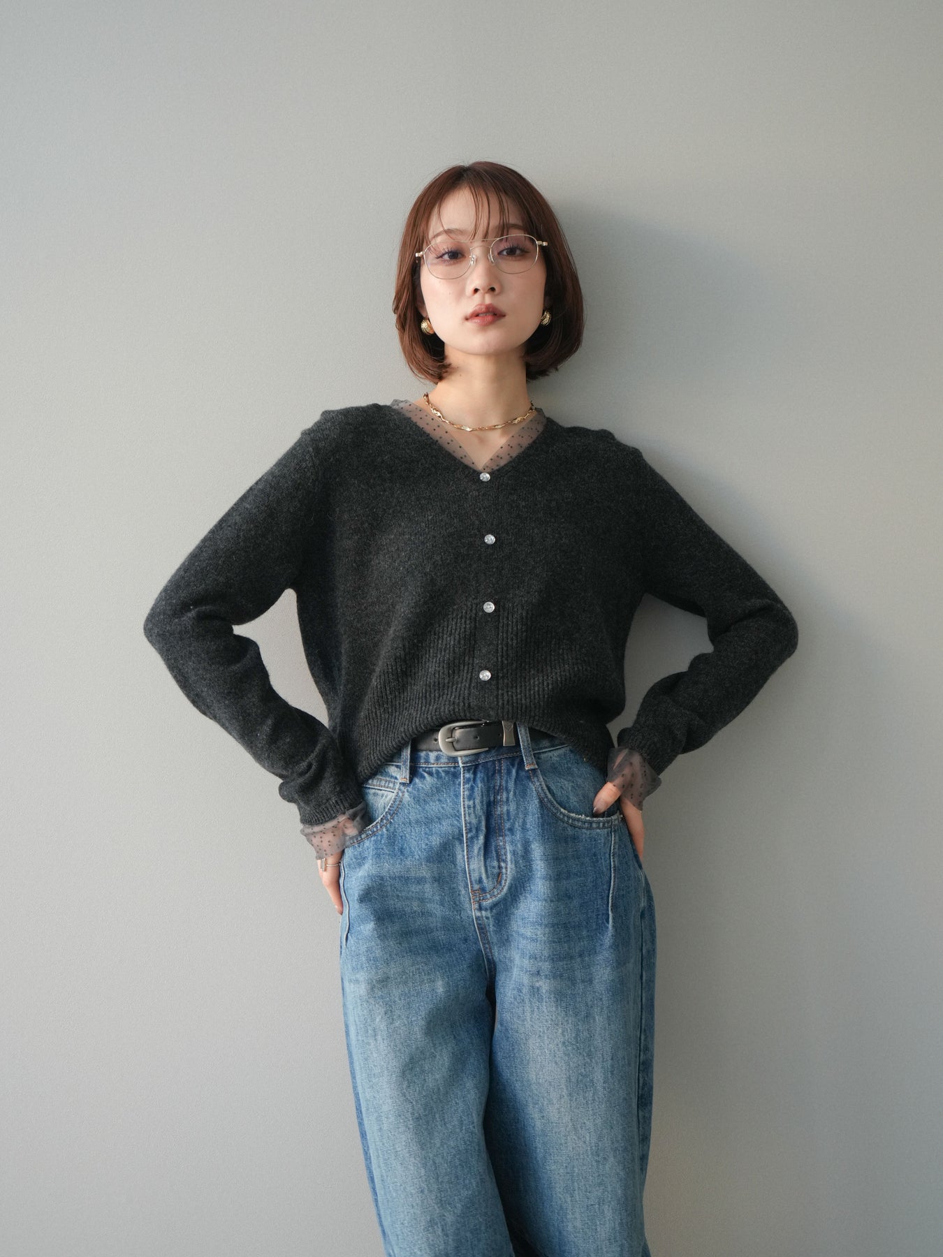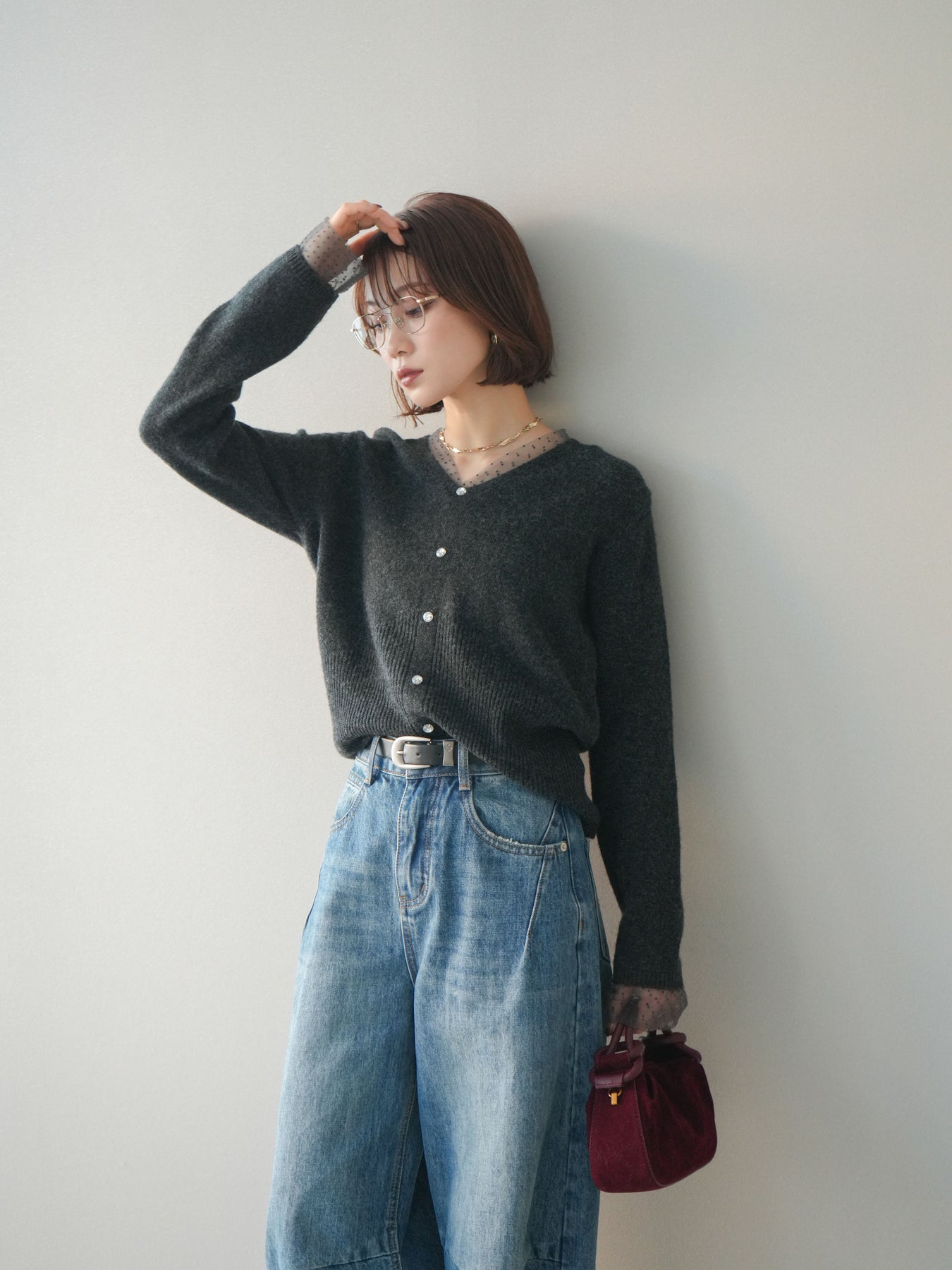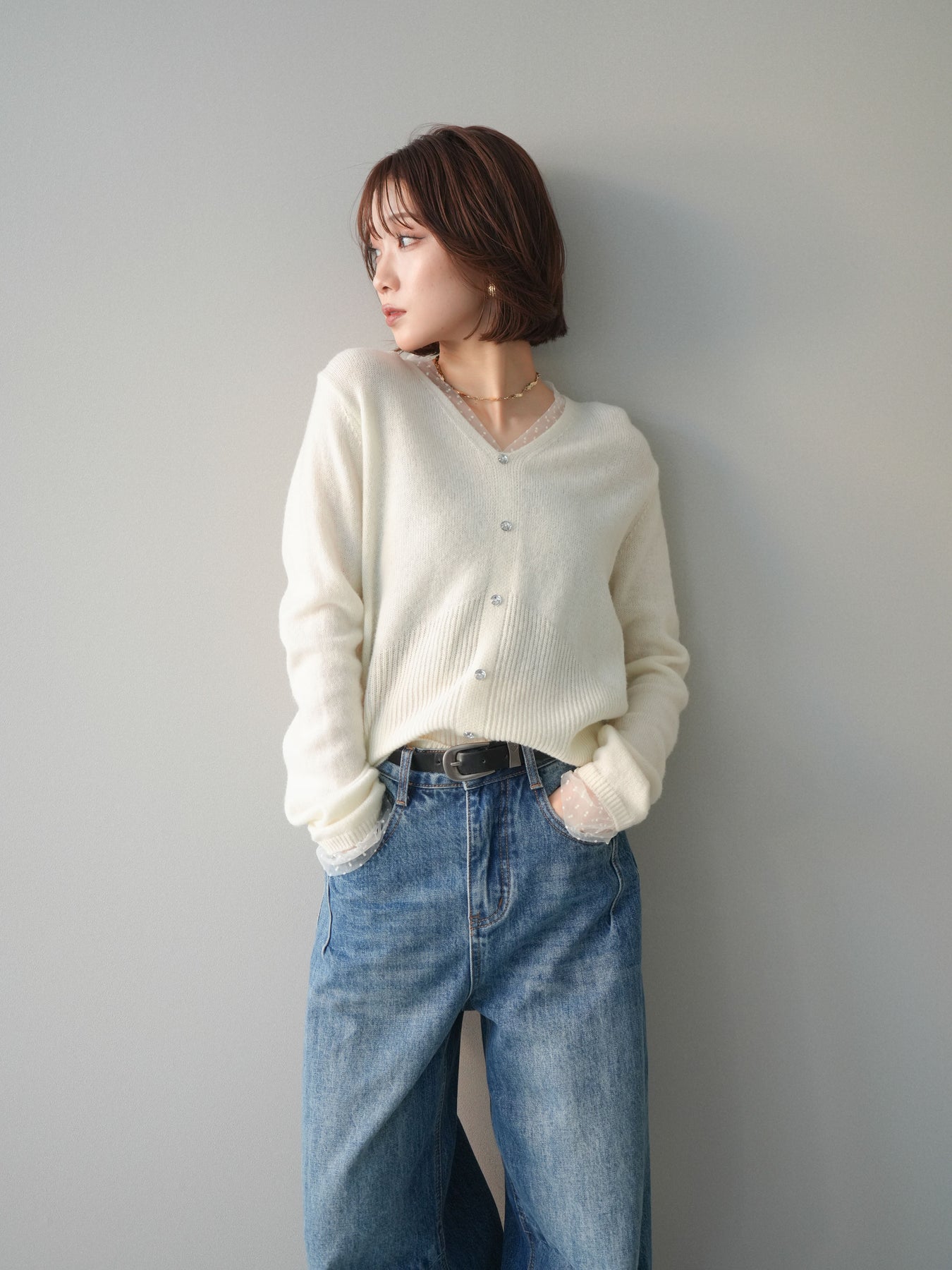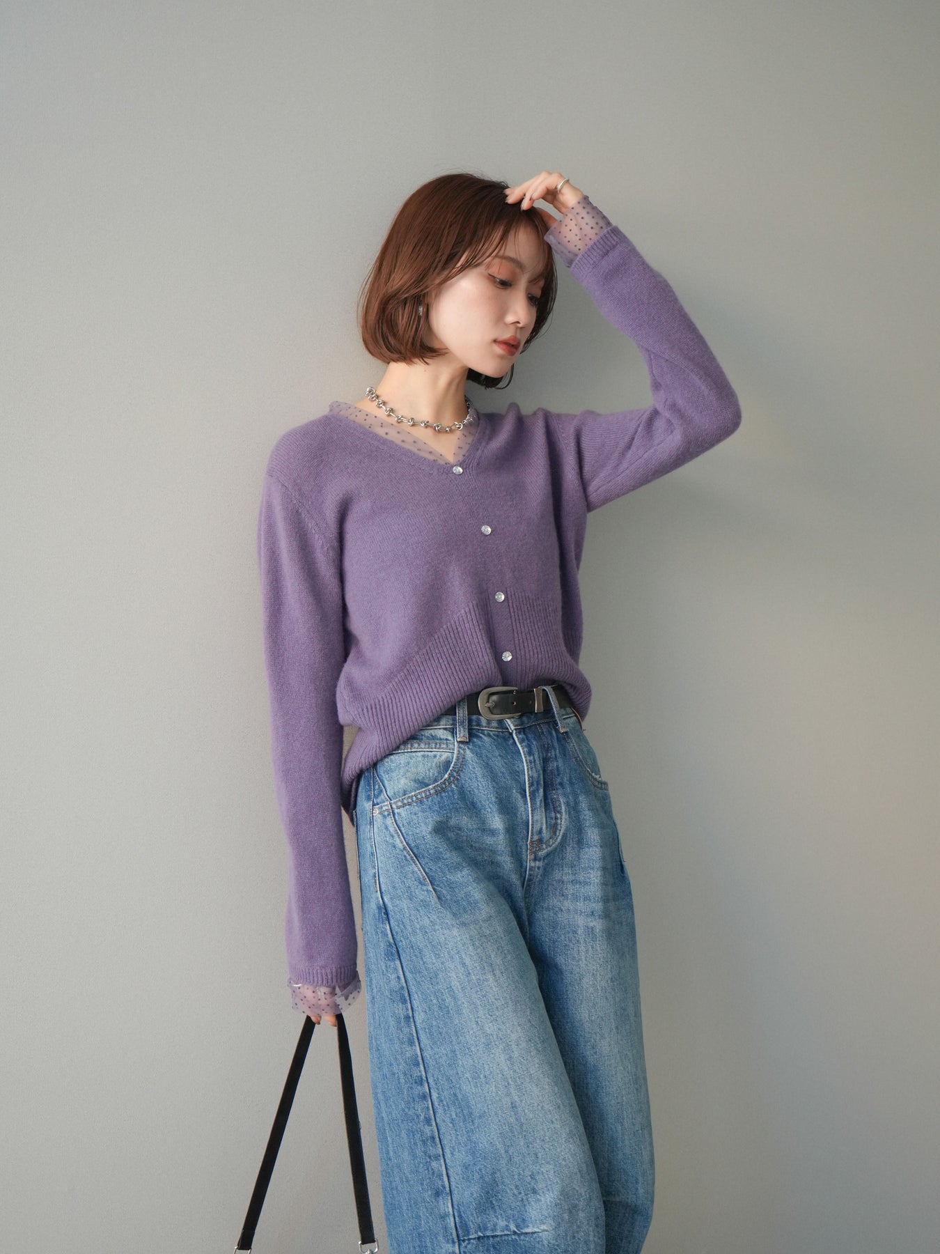◆ [予約]ドットチュールレイヤードボタンニットトップス