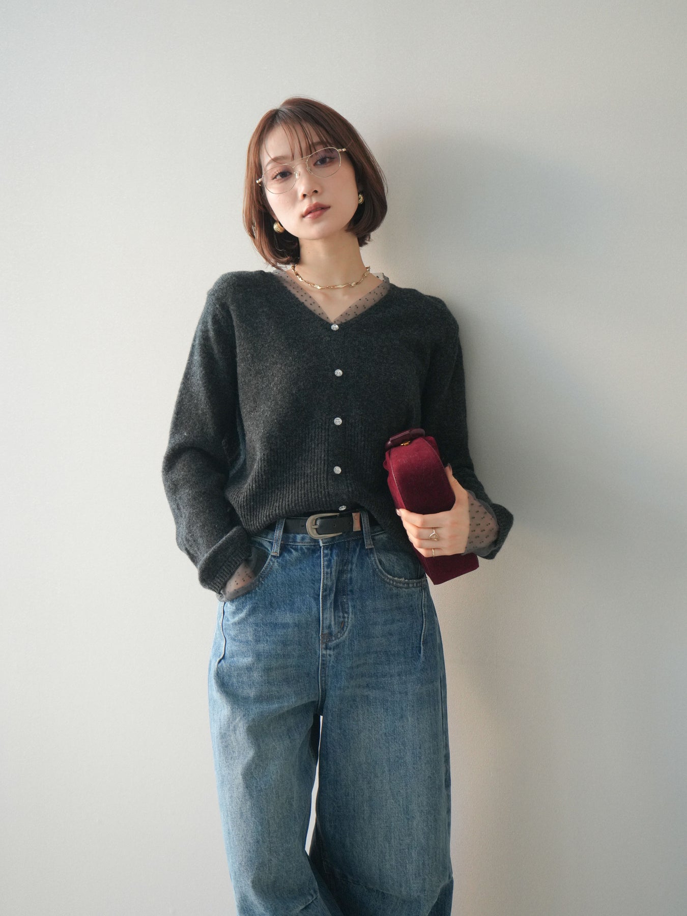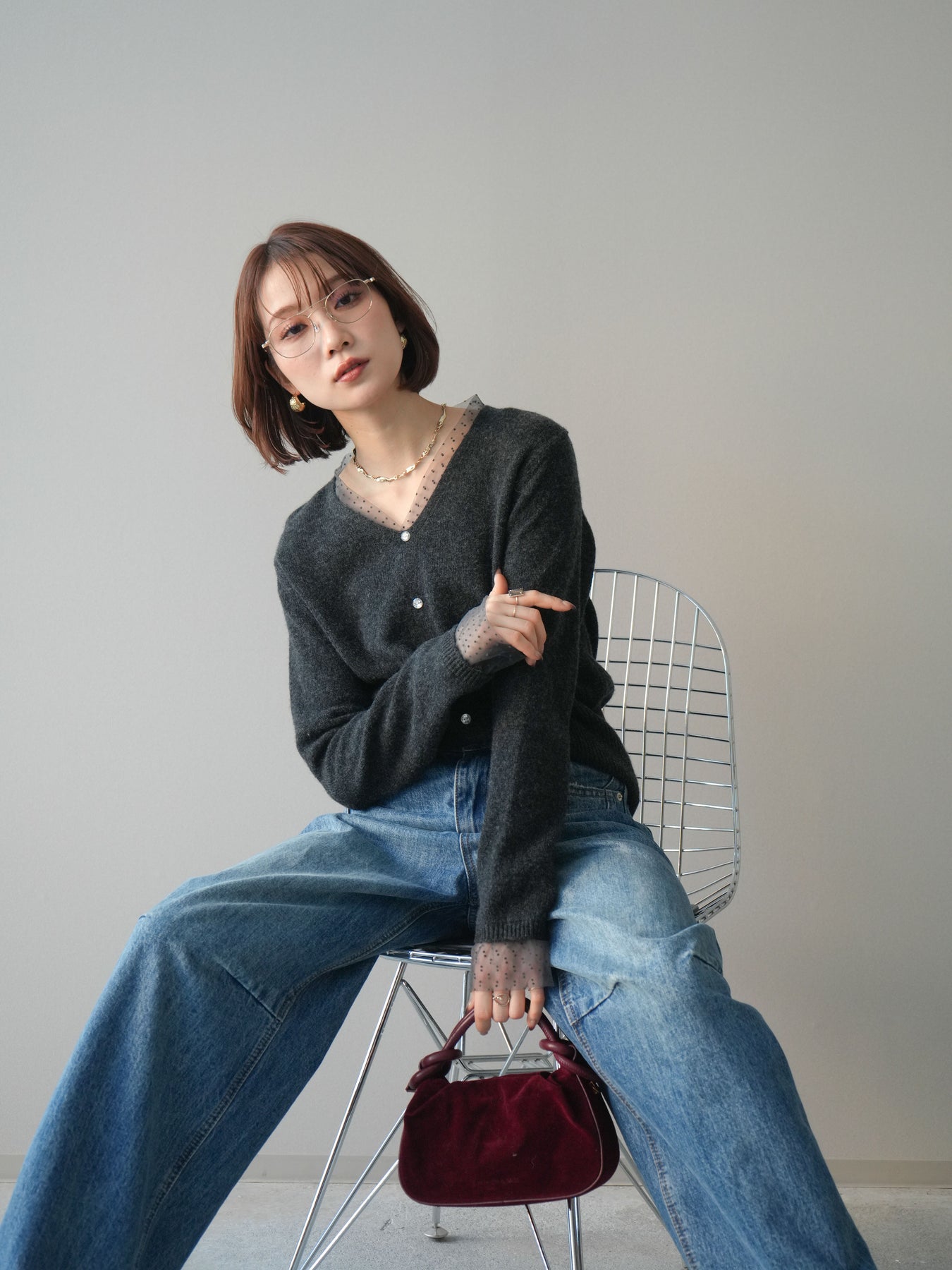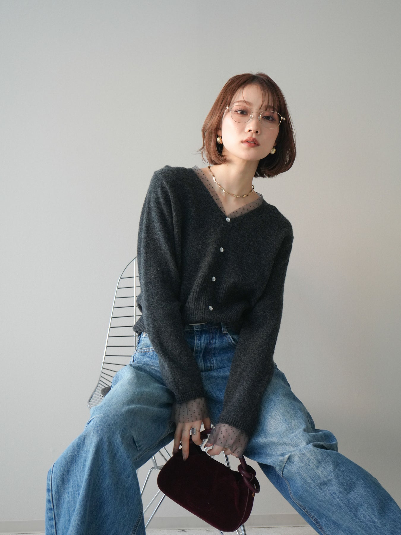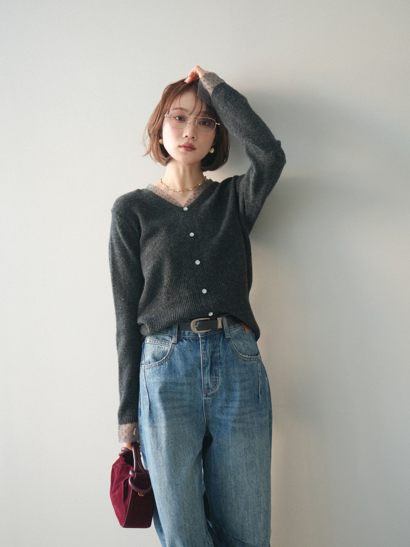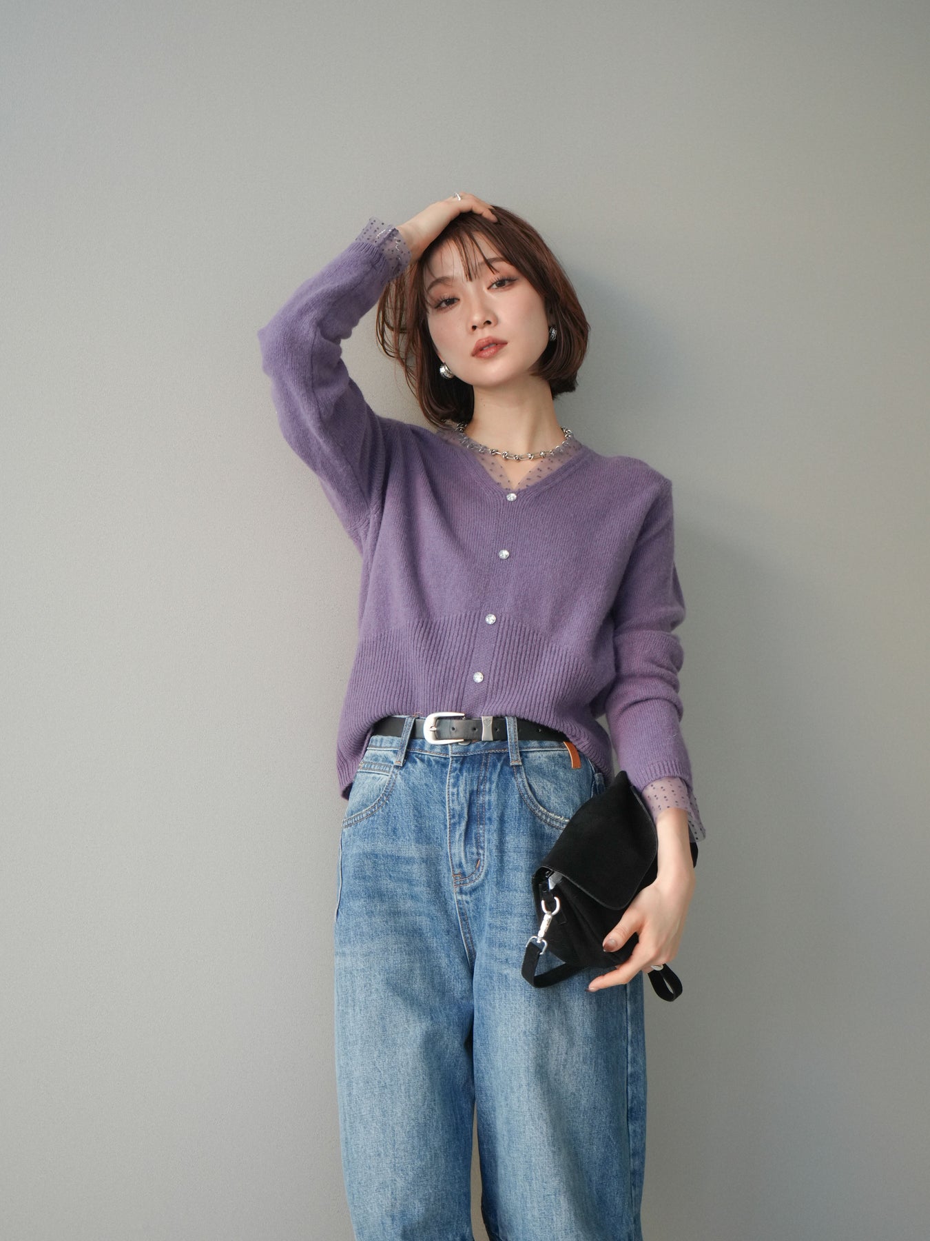 ◆ [予約]ドットチュールレイヤードボタンニットトップス