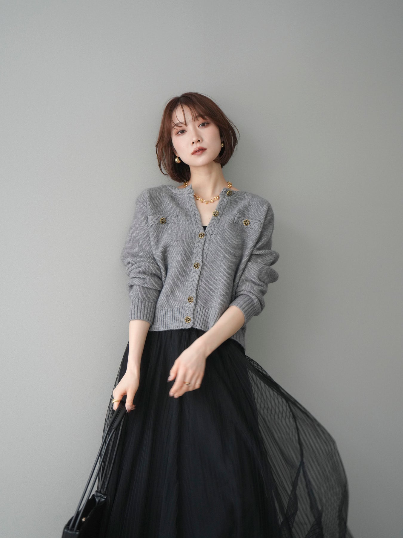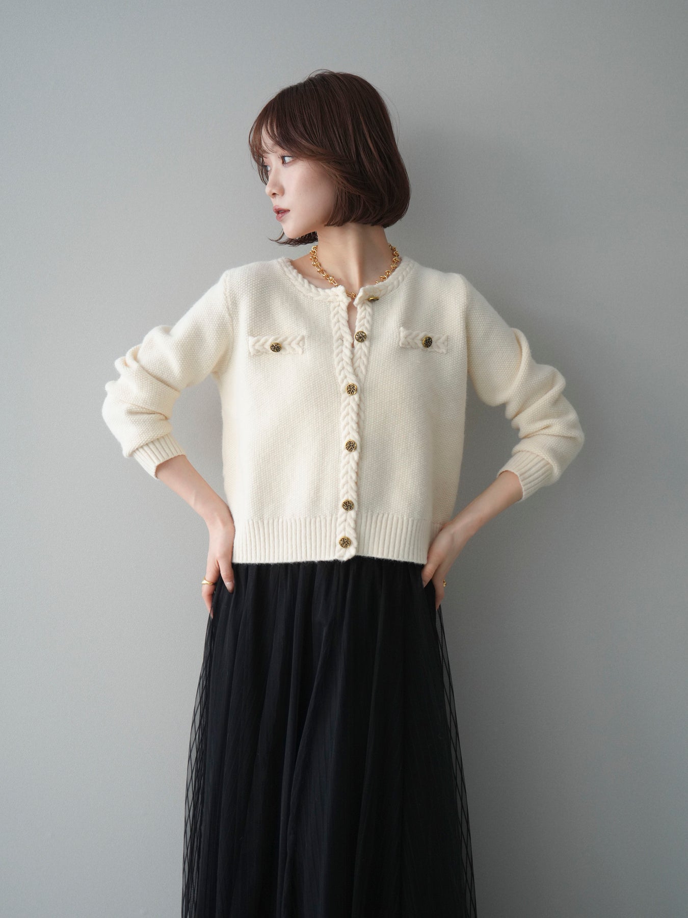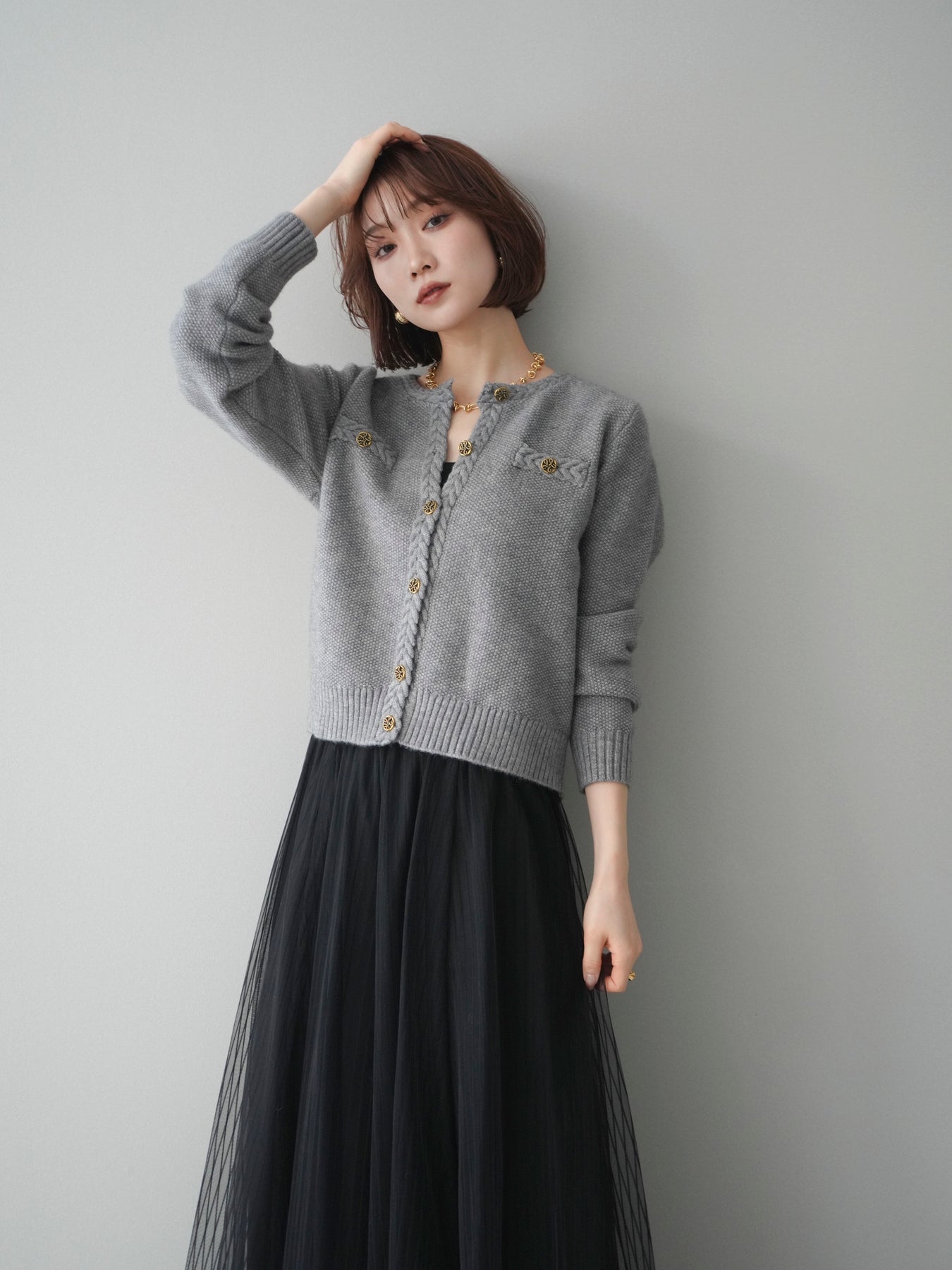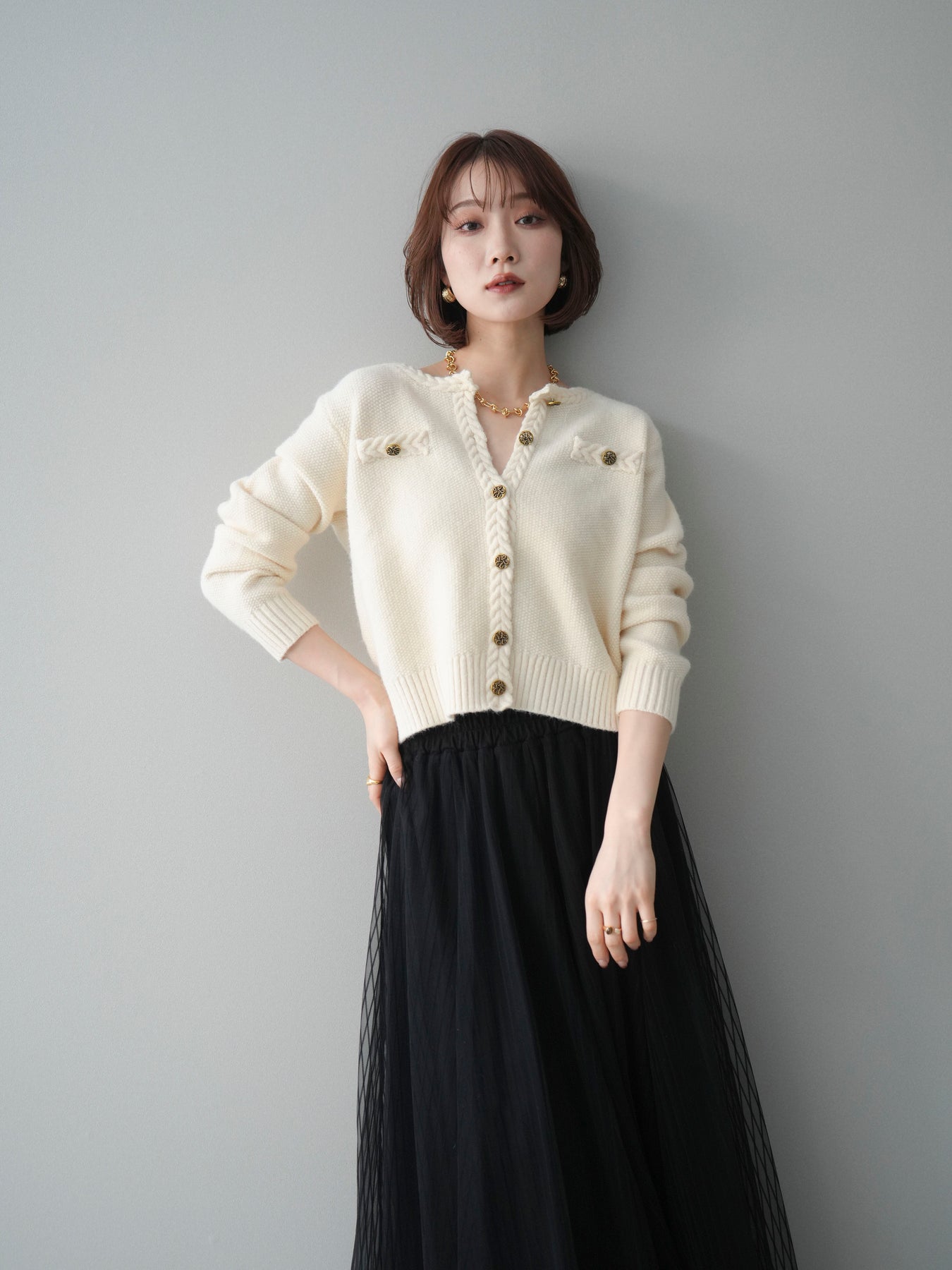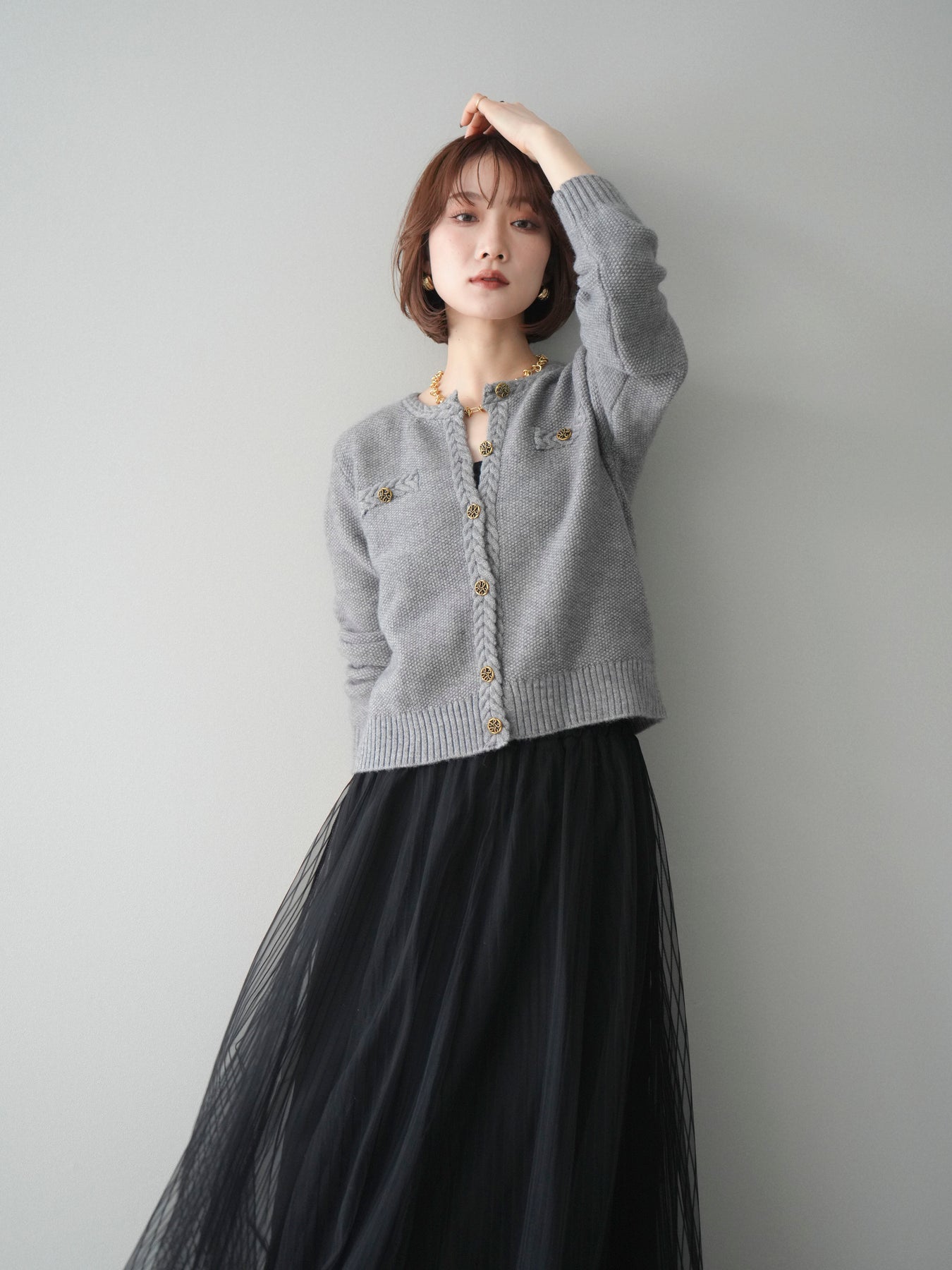 フロントに施した編みこみデザインと、アンティーク調のボタンが上品なアクセントになるニットカーディガン。表面にほどよい凹凸のある編地があたたかみをプラスし、シンプルながらも存在感のある一枚に仕上げています。程よくゆとりのあるシルエットで着心地が良く、羽織りとしてもボタンを閉めてトップス風にも活躍。デイリーのスタイリングに取り入れやすく、クラシックなムードを楽しめる大人のためのカーディガンです。 ※ボトムス、キャミソール(インナー)以外の商品は一律でインナーは付属していません。