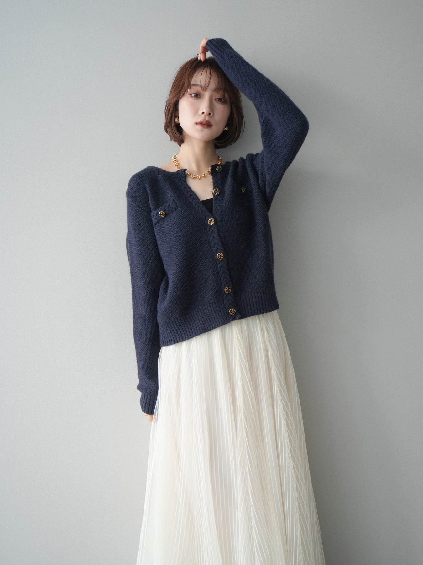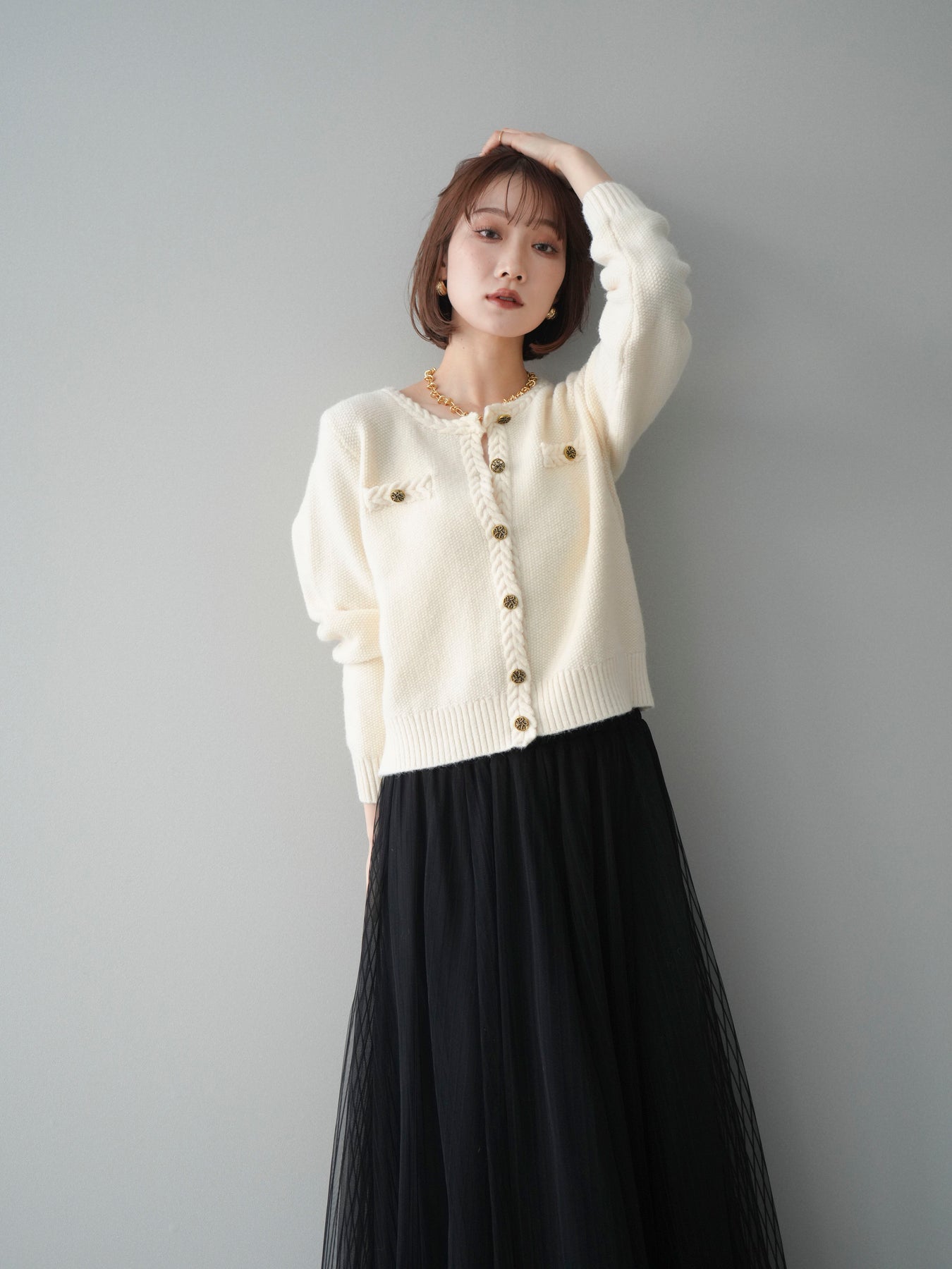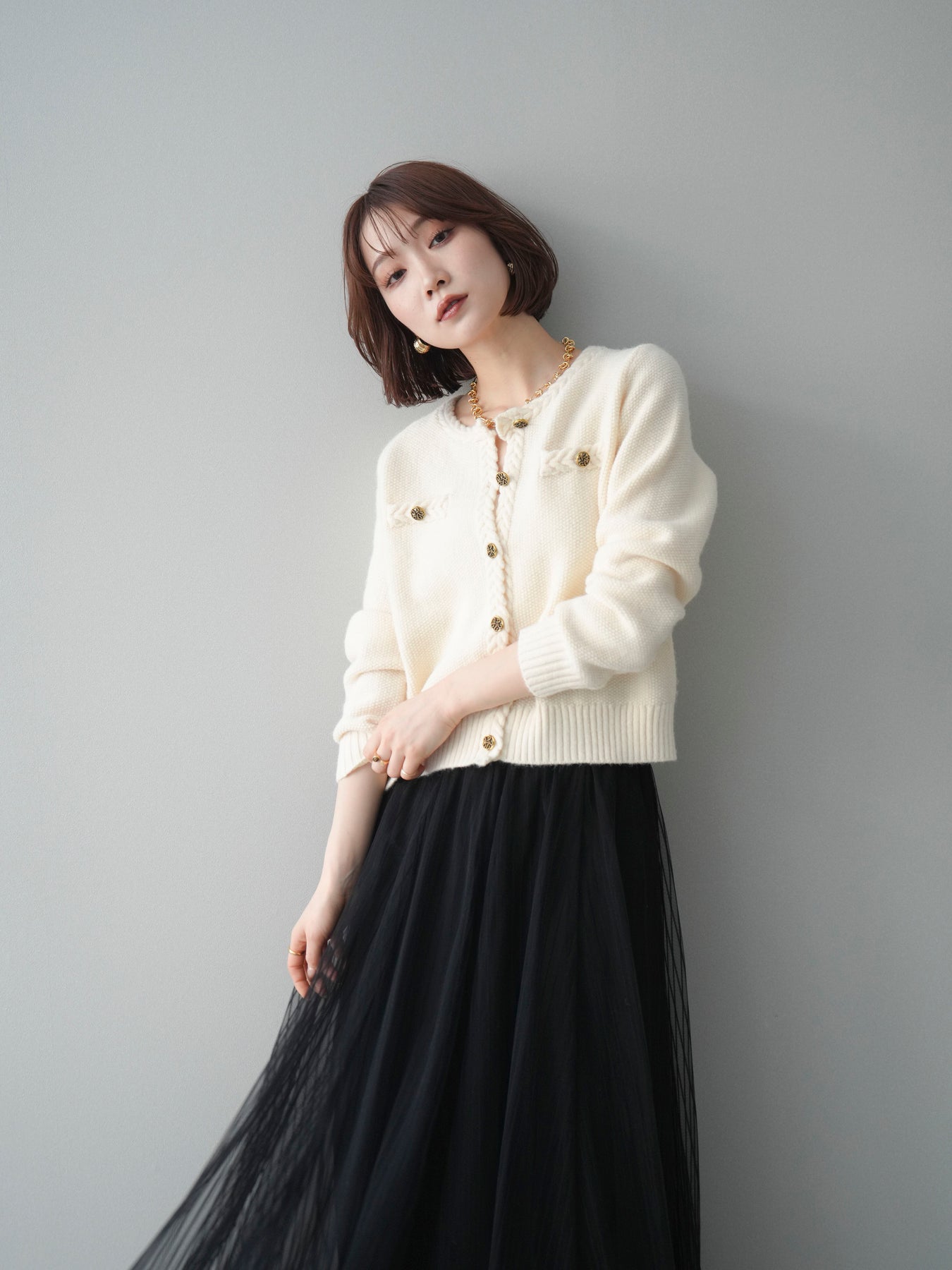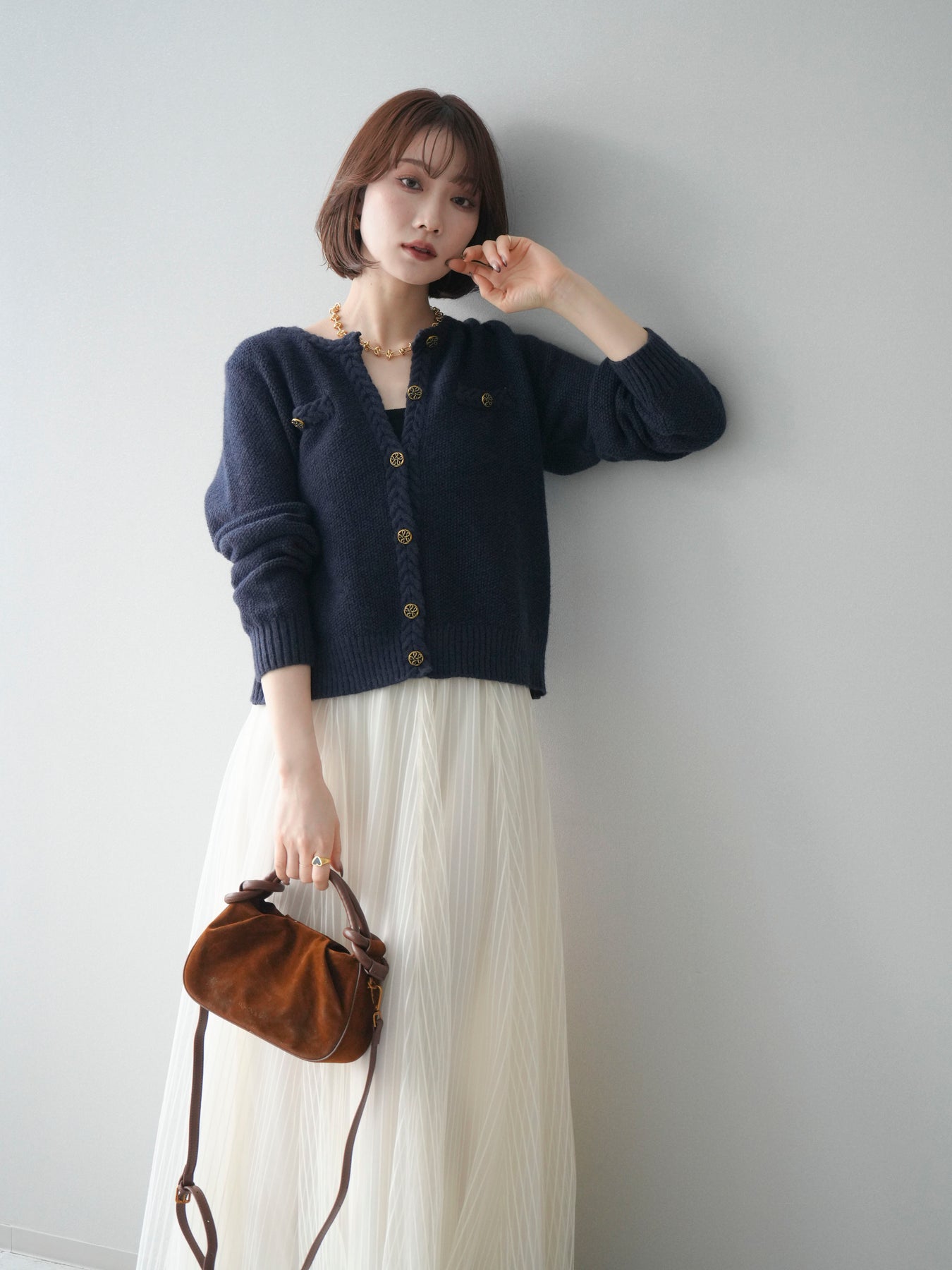 フロントに施した編みこみデザインと、アンティーク調のボタンが上品なアクセントになるニットカーディガン。表面にほどよい凹凸のある編地があたたかみをプラスし、シンプルながらも存在感のある一枚に仕上げています。程よくゆとりのあるシルエットで着心地が良く、羽織りとしてもボタンを閉めてトップス風にも活躍。デイリーのスタイリングに取り入れやすく、クラシックなムードを楽しめる大人のためのカーディガンです。 ※ボトムス、キャミソール(インナー)以外の商品は一律でインナーは付属していません。
