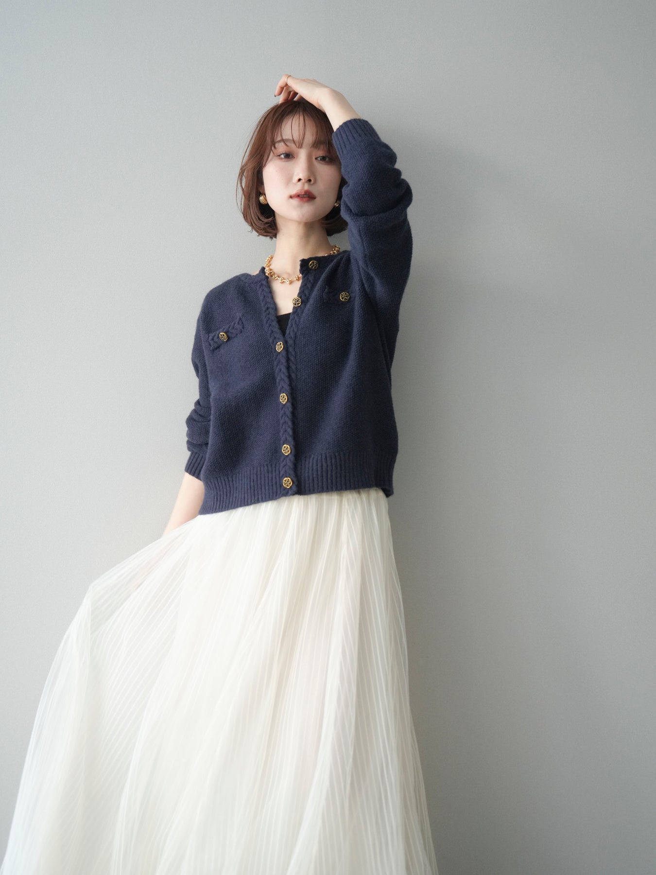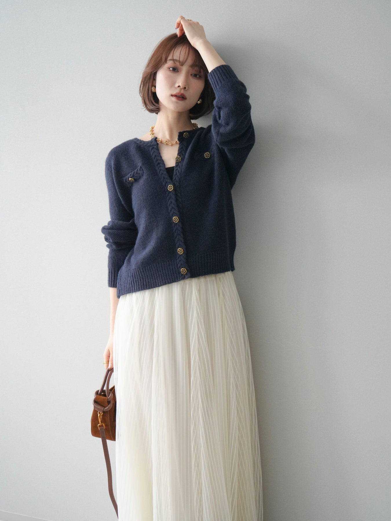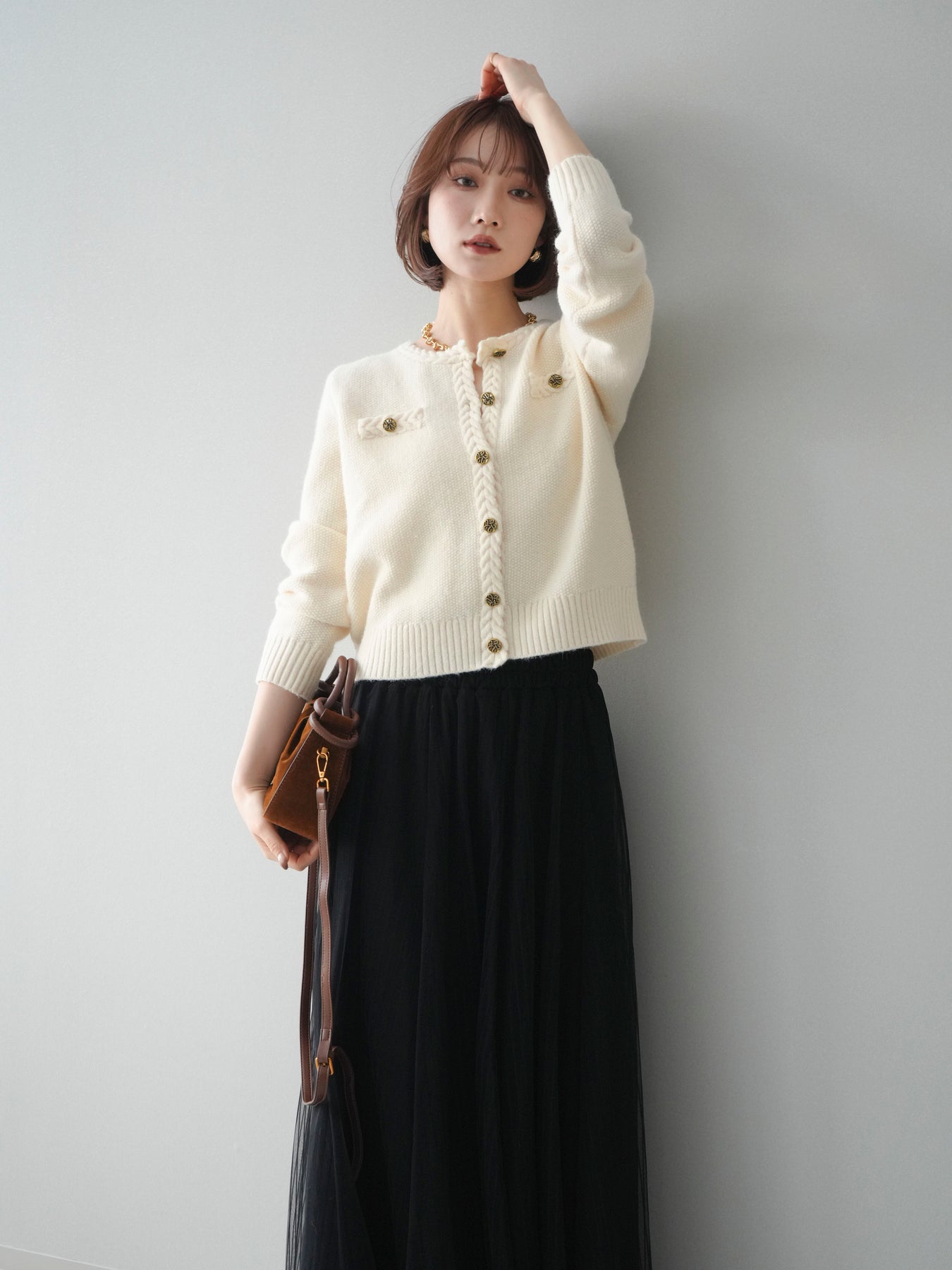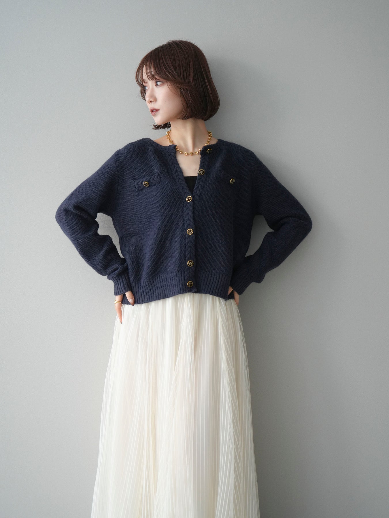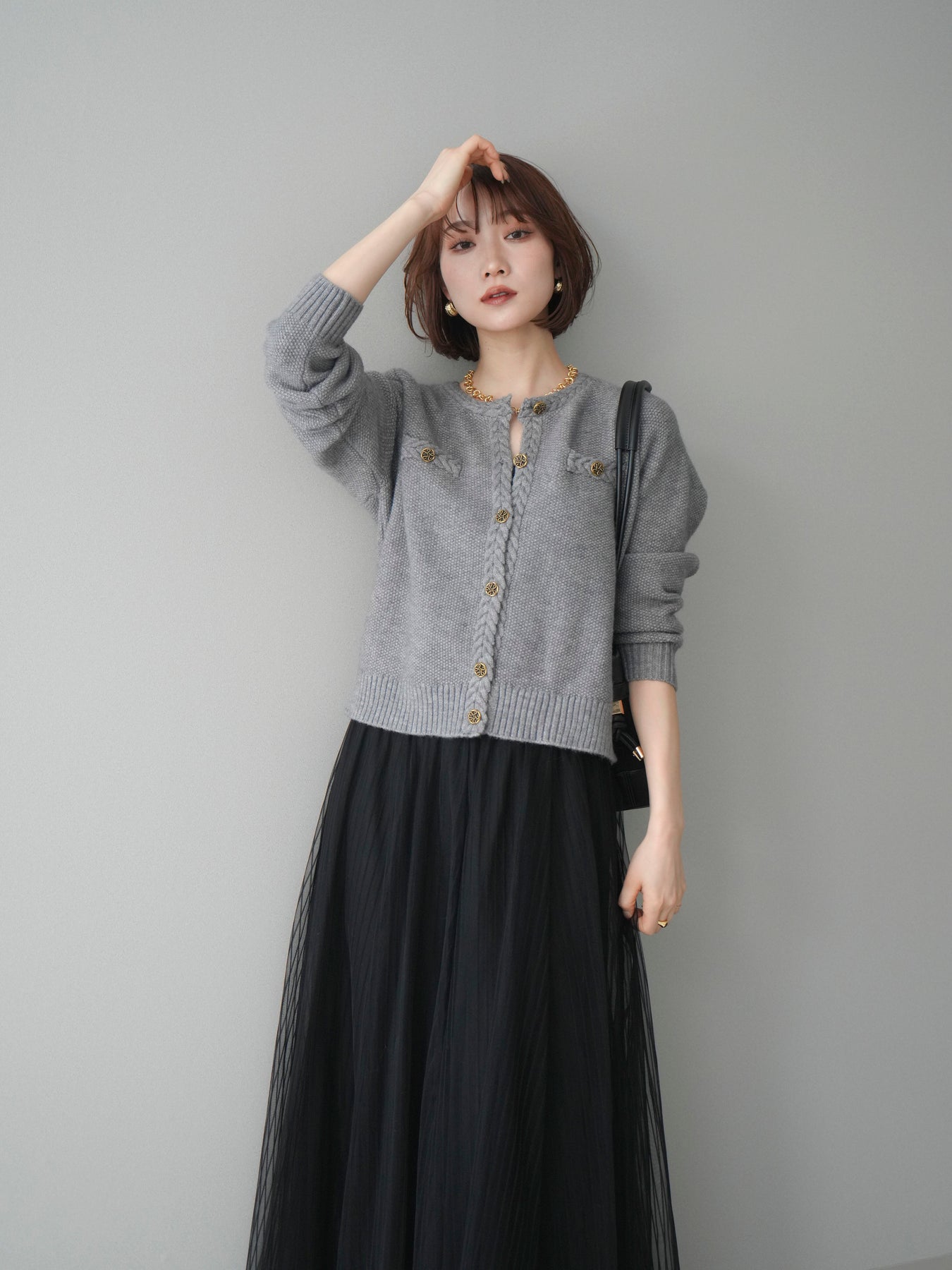 フロントに施した編みこみデザインと、アンティーク調のボタンが上品なアクセントになるニットカーディガン。表面にほどよい凹凸のある編地があたたかみをプラスし、シンプルながらも存在感のある一枚に仕上げています。程よくゆとりのあるシルエットで着心地が良く、羽織りとしてもボタンを閉めてトップス風にも活躍。デイリーのスタイリングに取り入れやすく、クラシックなムードを楽しめる大人のためのカーディガンです。 ※ボトムス、キャミソール(インナー)以外の商品は一律でインナーは付属していません。