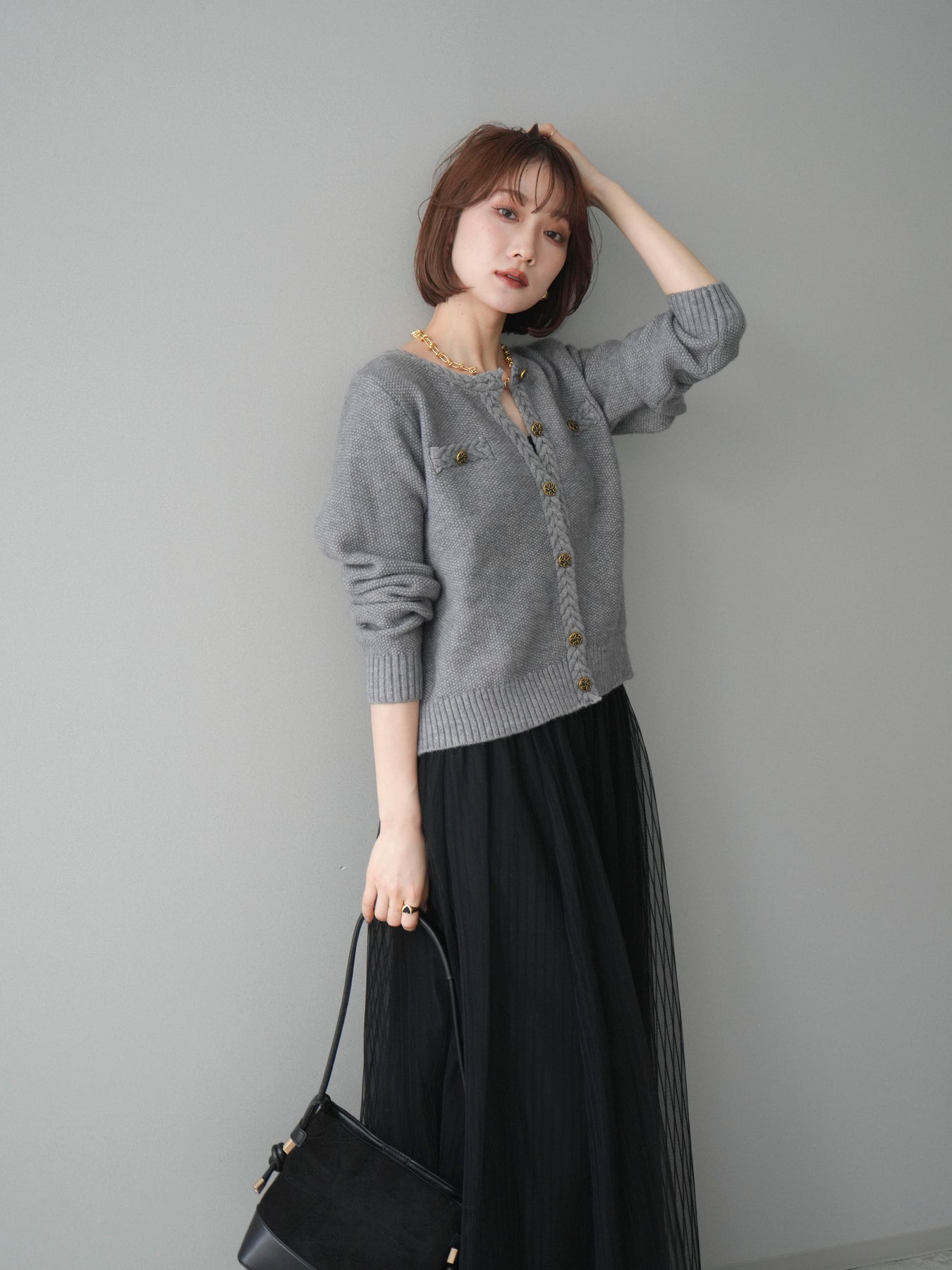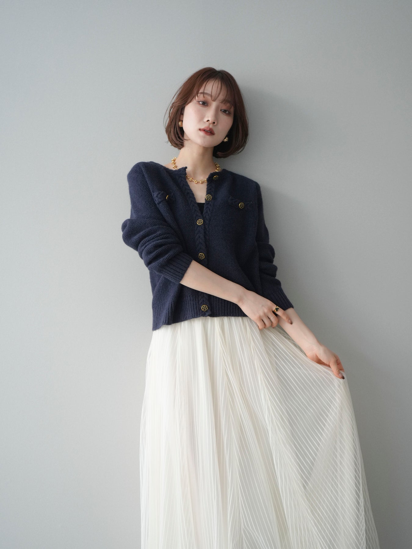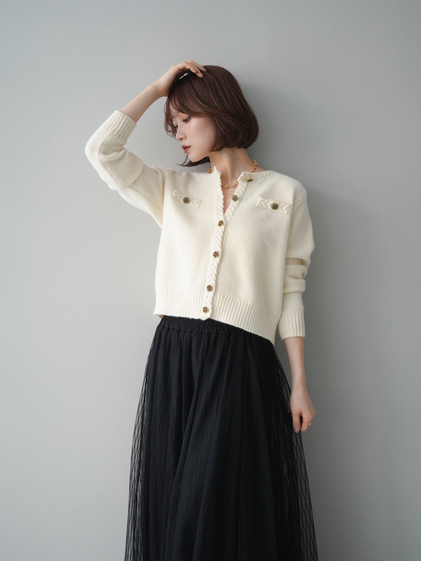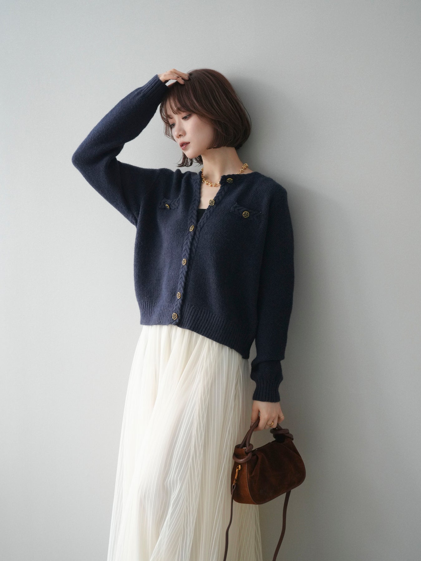 フロントに施した編みこみデザインと、アンティーク調のボタンが上品なアクセントになるニットカーディガン。表面にほどよい凹凸のある編地があたたかみをプラスし、シンプルながらも存在感のある一枚に仕上げています。程よくゆとりのあるシルエットで着心地が良く、羽織りとしてもボタンを閉めてトップス風にも活躍。デイリーのスタイリングに取り入れやすく、クラシックなムードを楽しめる大人のためのカーディガンです。 ※ボトムス、キャミソール(インナー)以外の商品は一律でインナーは付属していません。