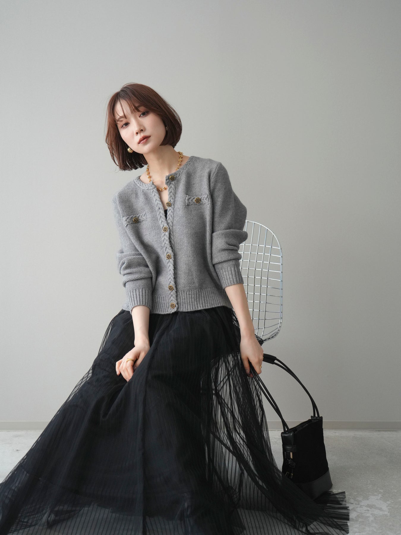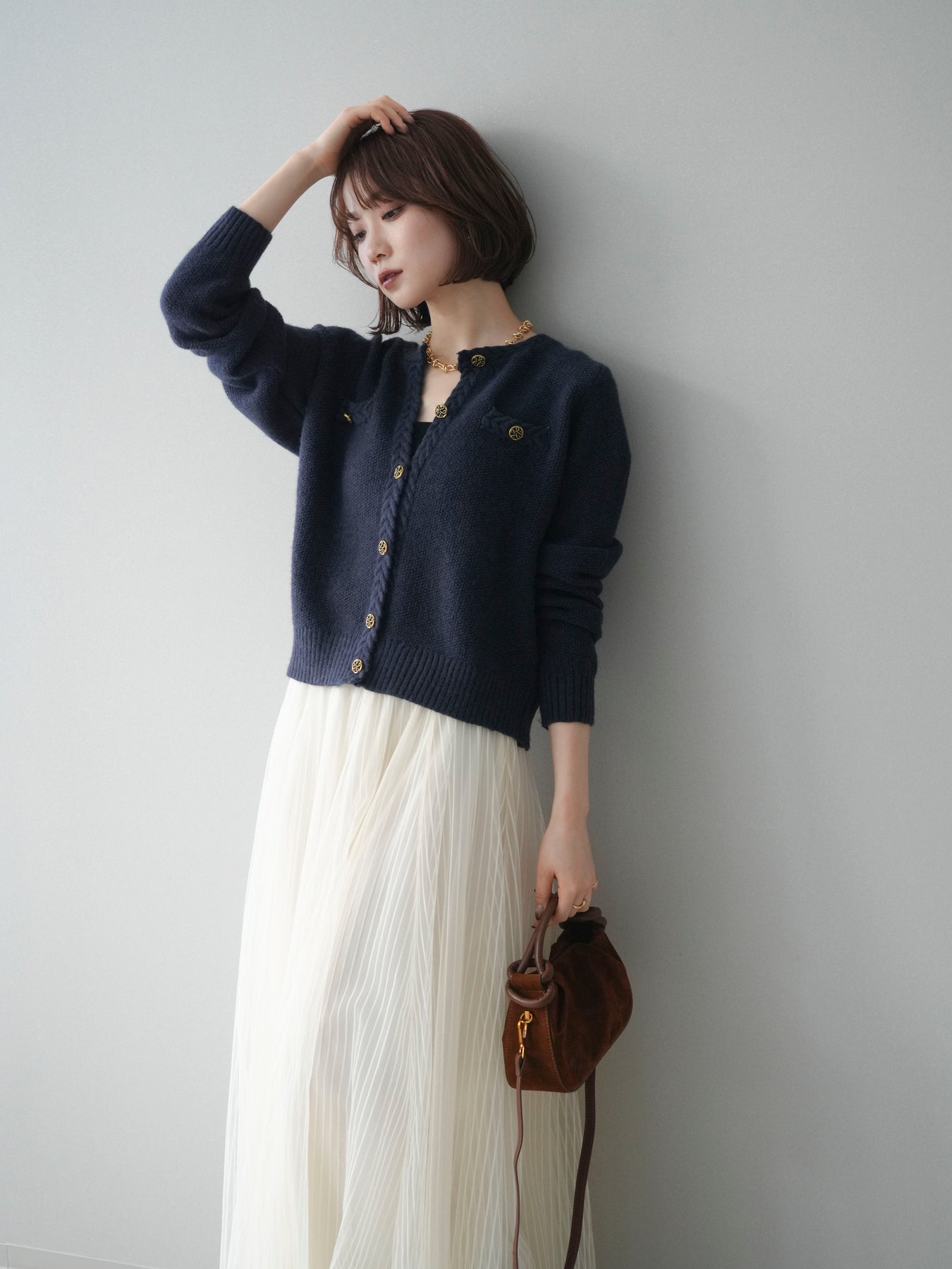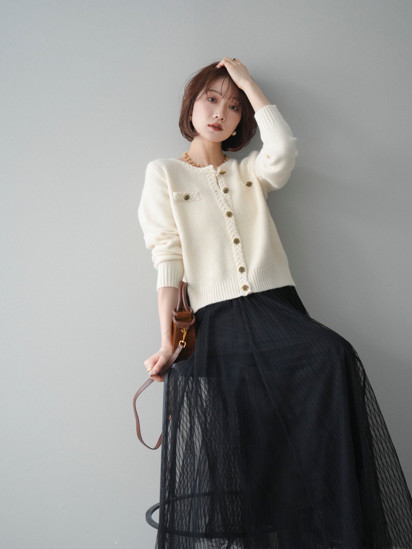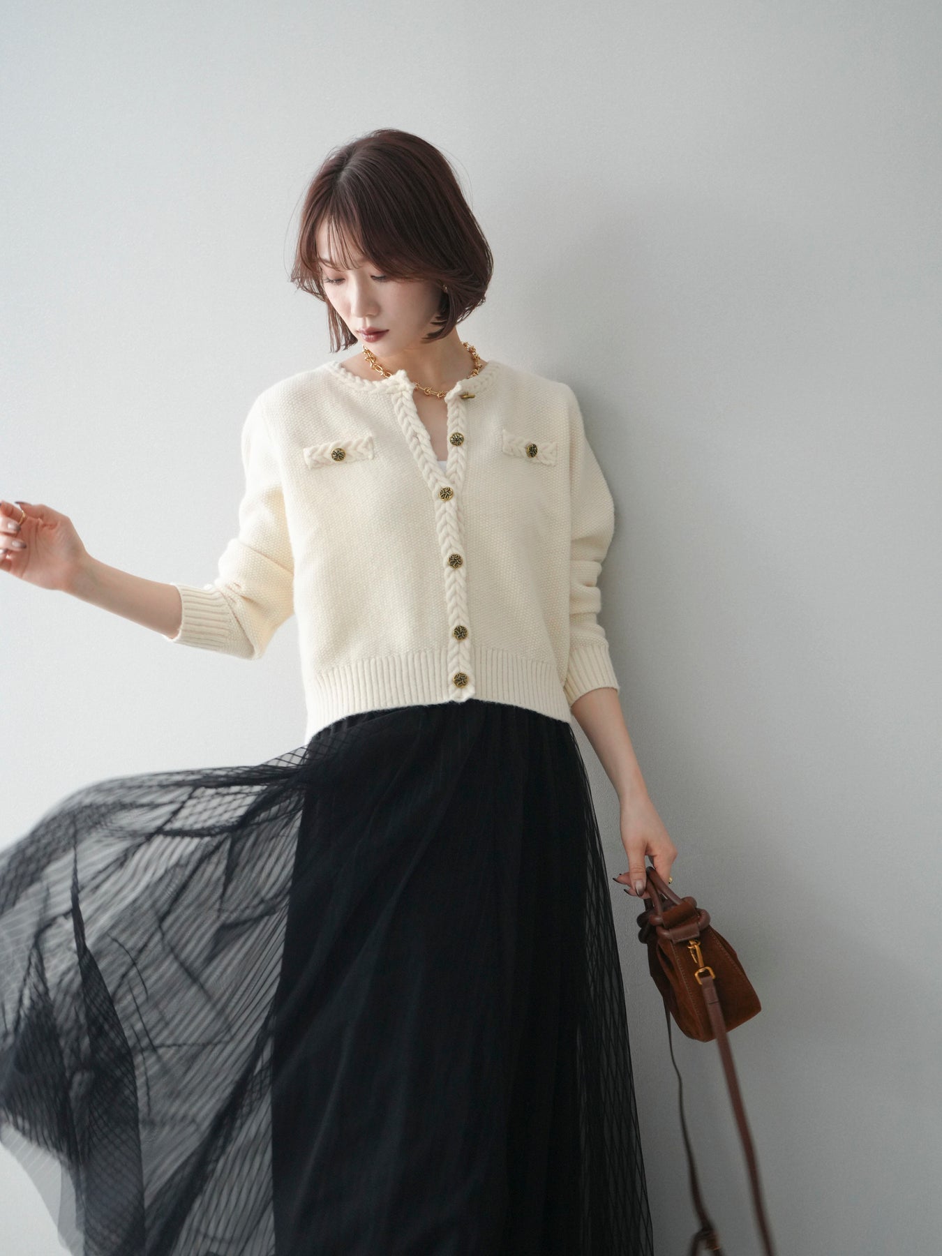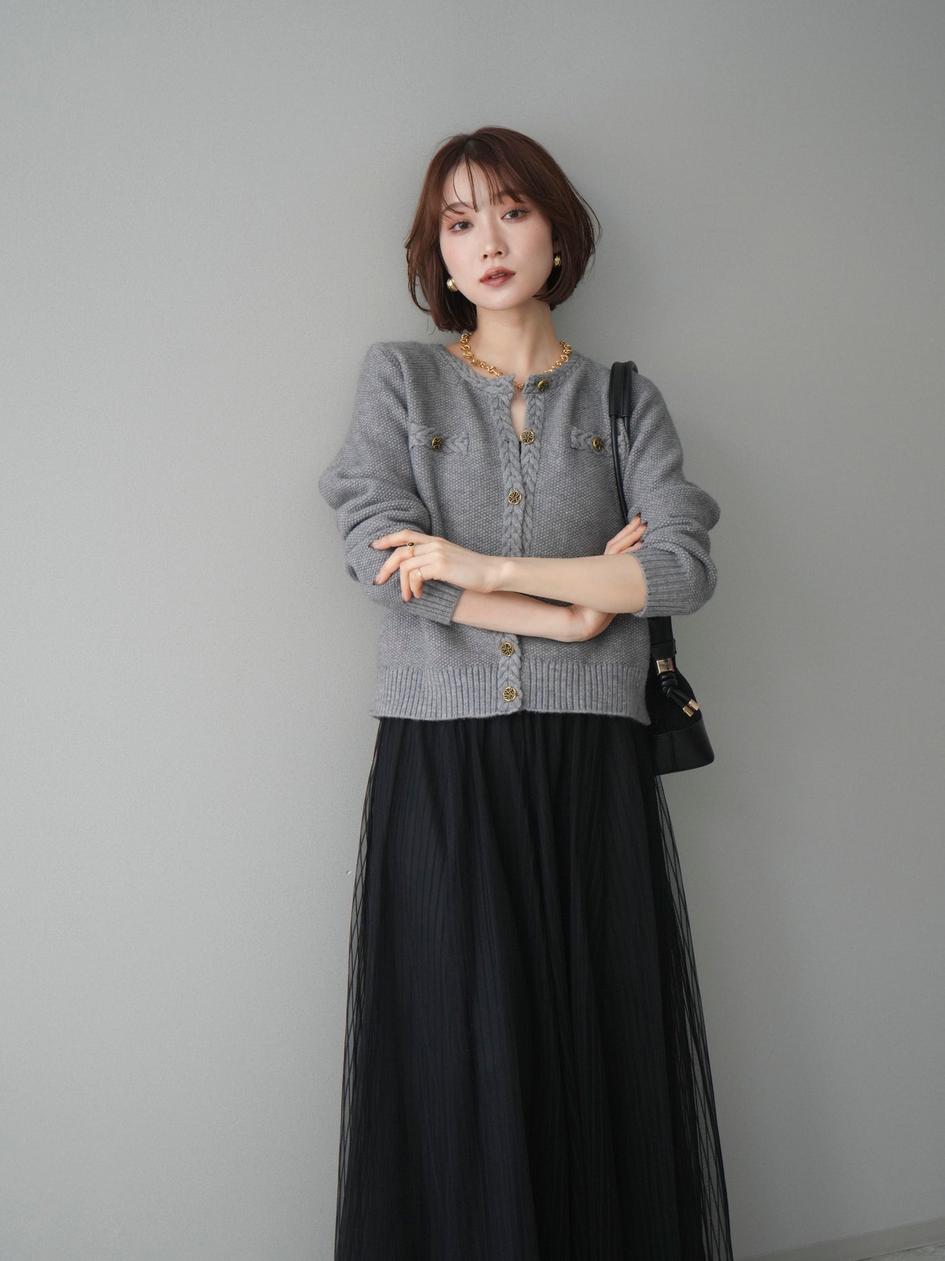 フロントに施した編みこみデザインと、アンティーク調のボタンが上品なアクセントになるニットカーディガン。表面にほどよい凹凸のある編地があたたかみをプラスし、シンプルながらも存在感のある一枚に仕上げています。程よくゆとりのあるシルエットで着心地が良く、羽織りとしてもボタンを閉めてトップス風にも活躍。デイリーのスタイリングに取り入れやすく、クラシックなムードを楽しめる大人のためのカーディガンです。 ※ボトムス、キャミソール(インナー)以外の商品は一律でインナーは付属していません。