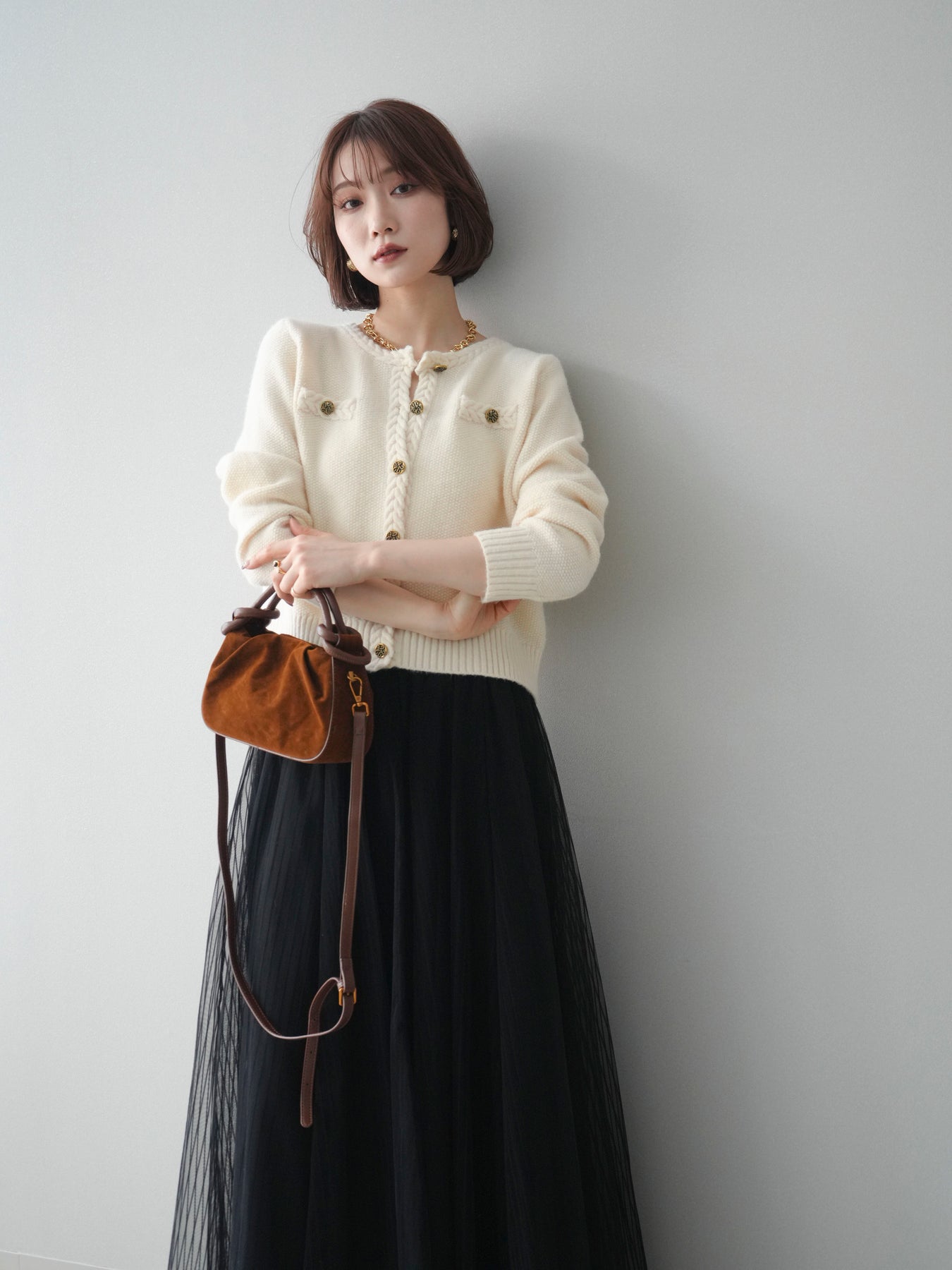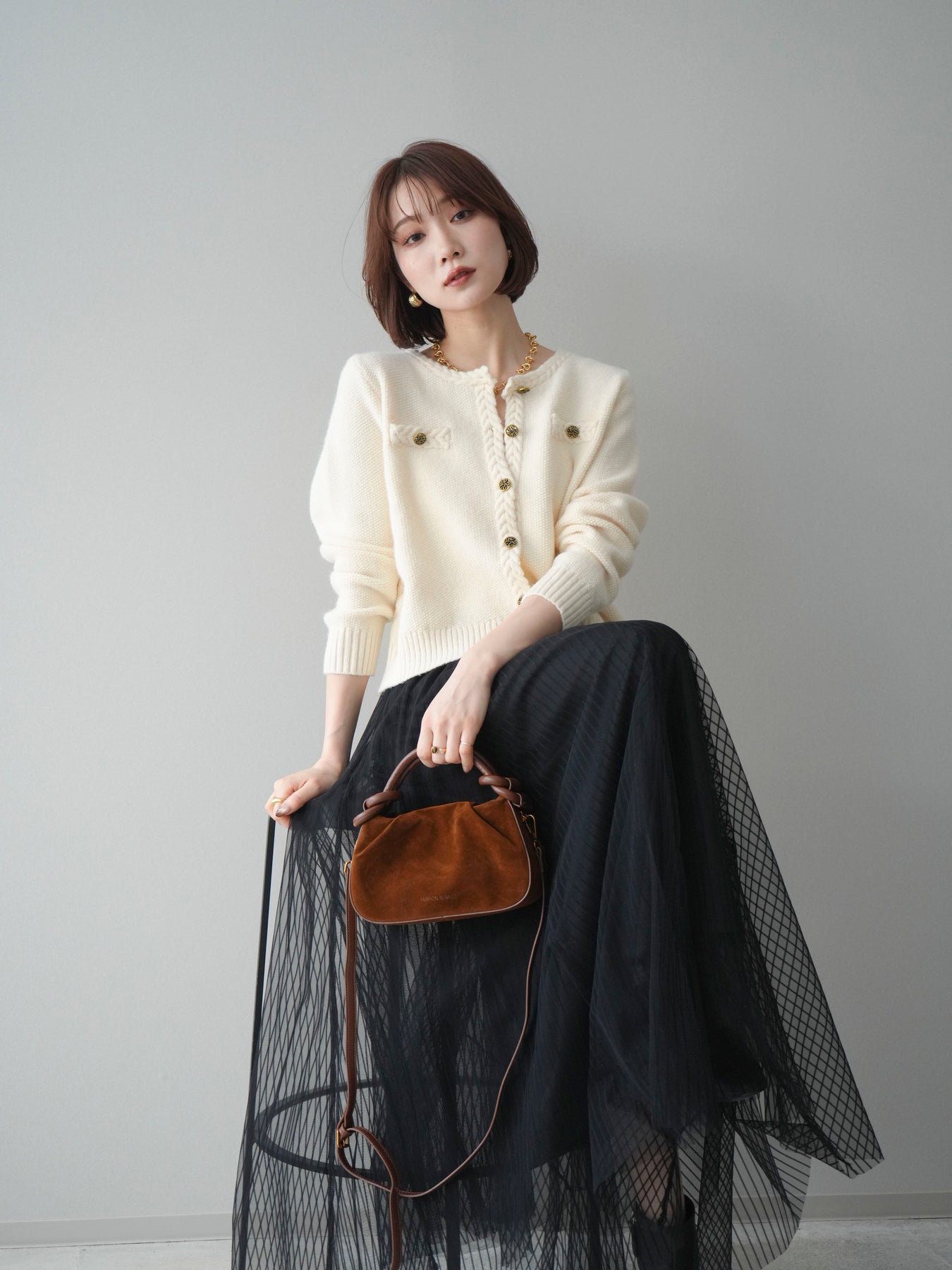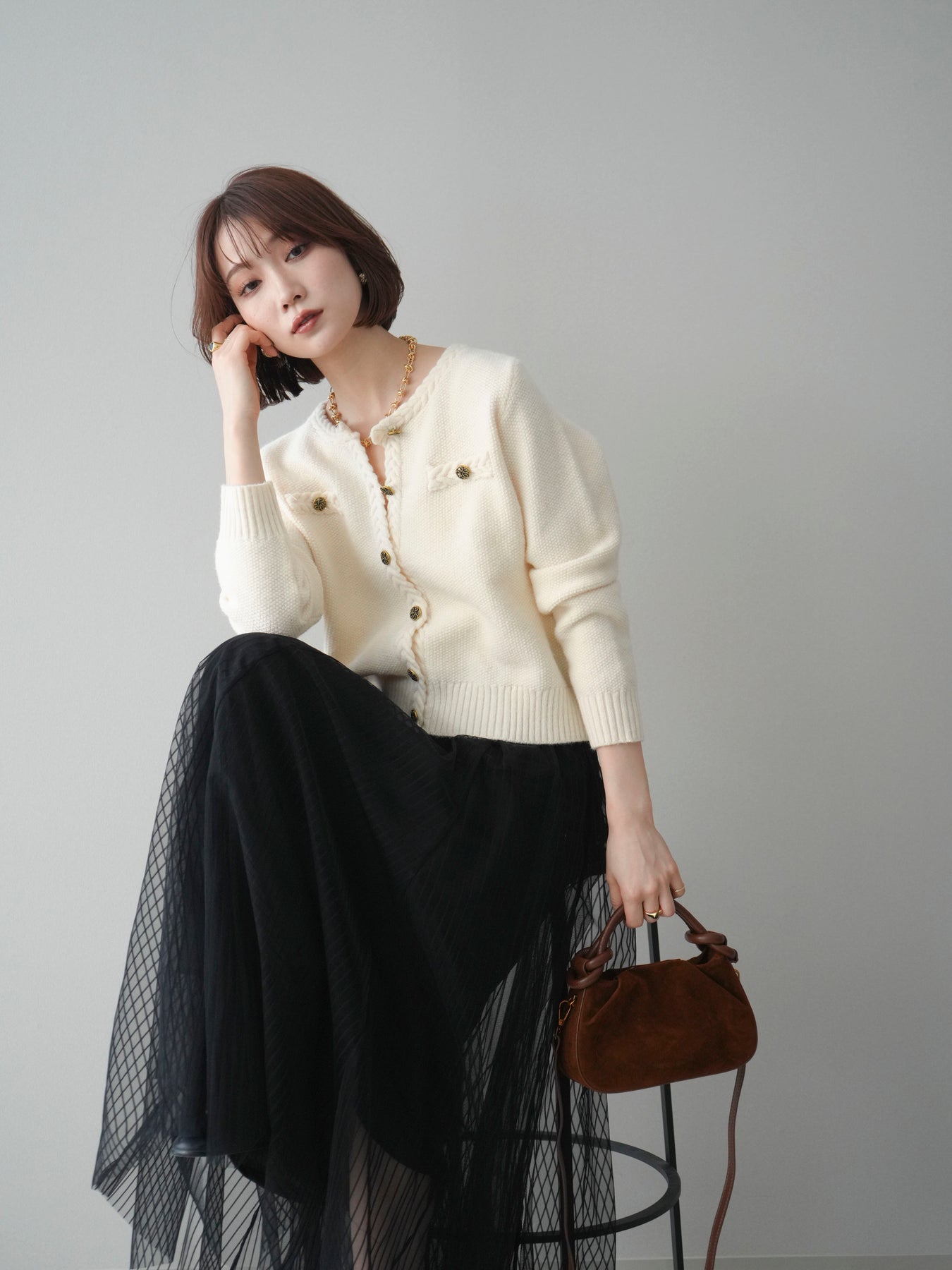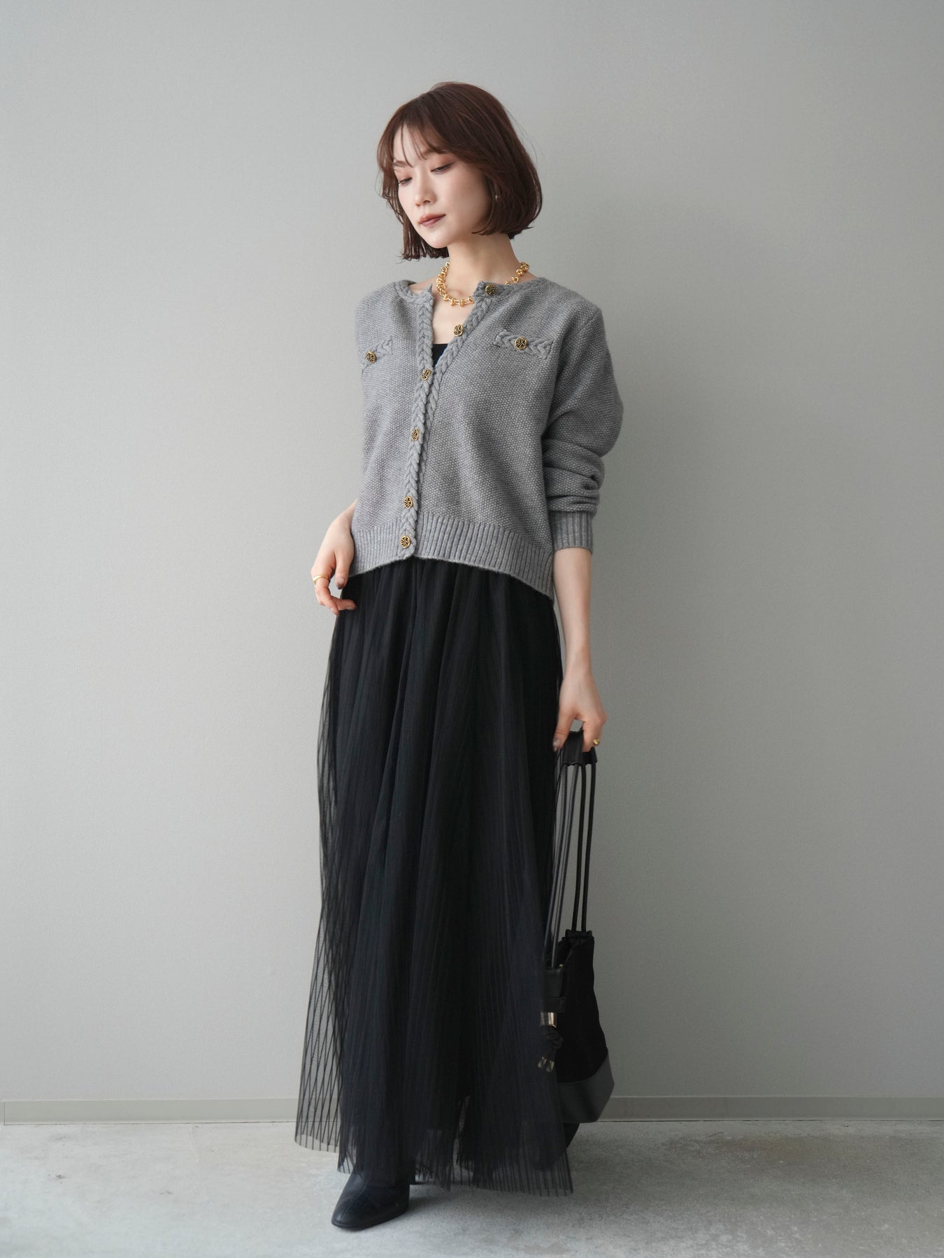 フロントに施した編みこみデザインと、アンティーク調のボタンが上品なアクセントになるニットカーディガン。表面にほどよい凹凸のある編地があたたかみをプラスし、シンプルながらも存在感のある一枚に仕上げています。程よくゆとりのあるシルエットで着心地が良く、羽織りとしてもボタンを閉めてトップス風にも活躍。デイリーのスタイリングに取り入れやすく、クラシックなムードを楽しめる大人のためのカーディガンです。 ※ボトムス、キャミソール(インナー)以外の商品は一律でインナーは付属していません。
