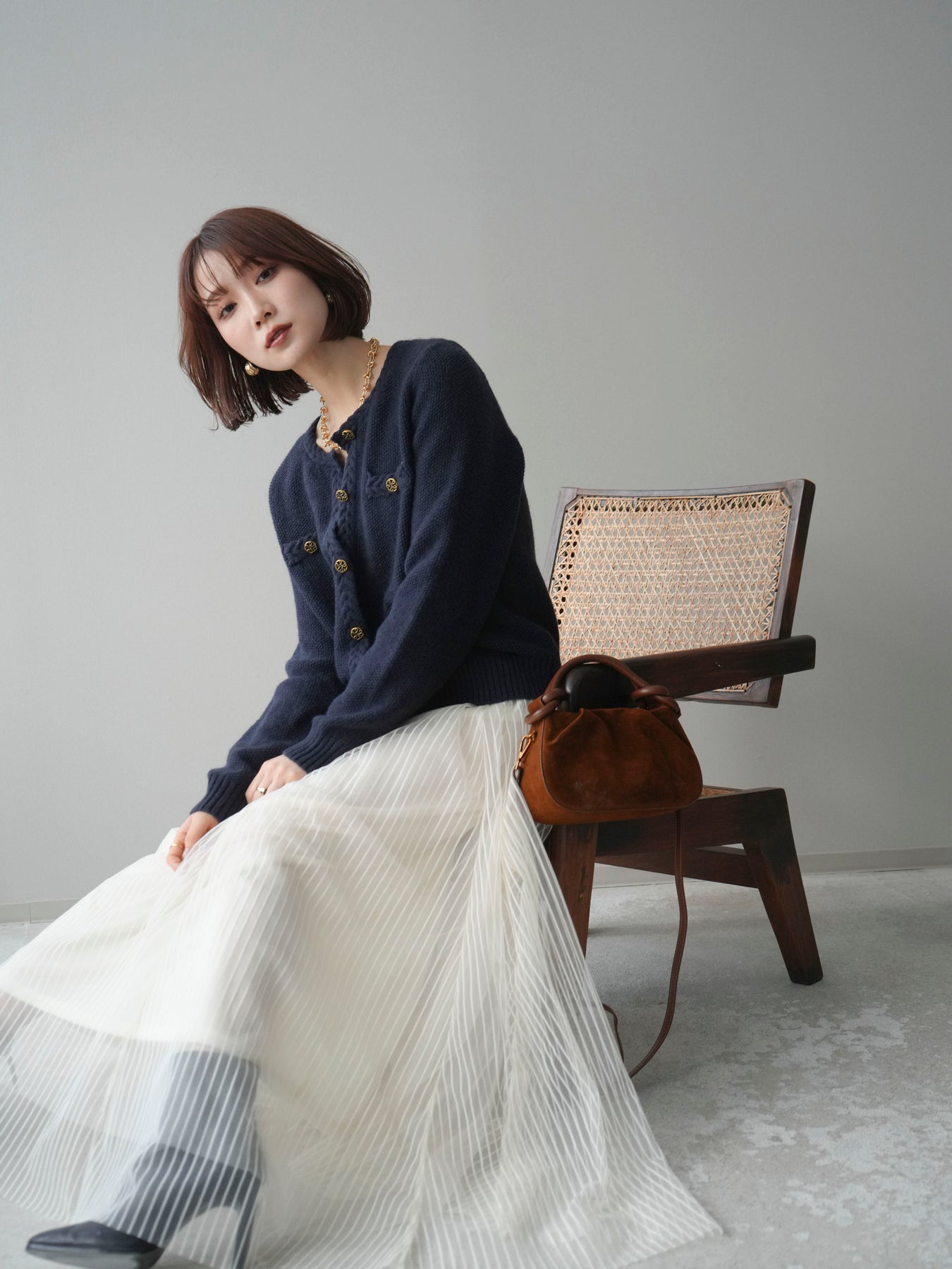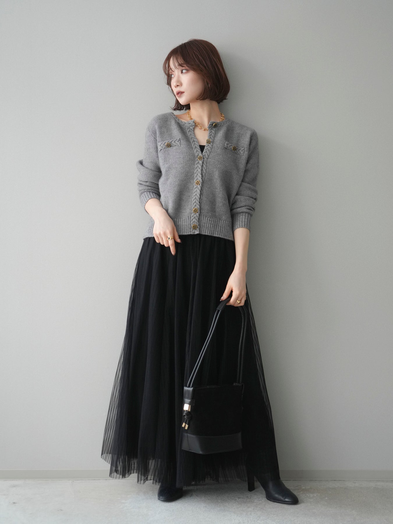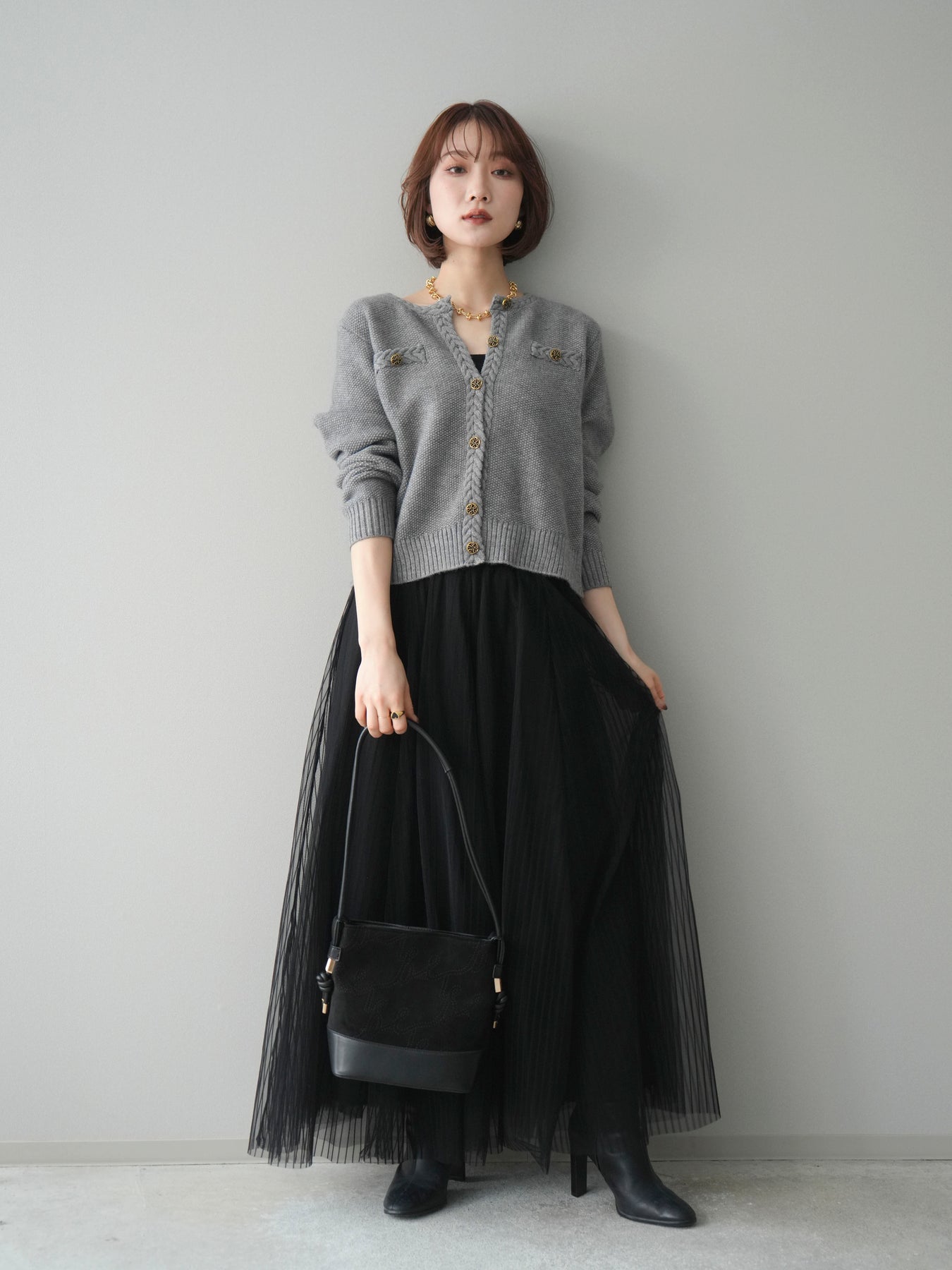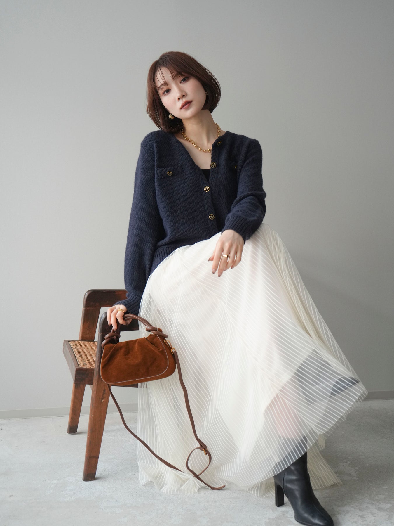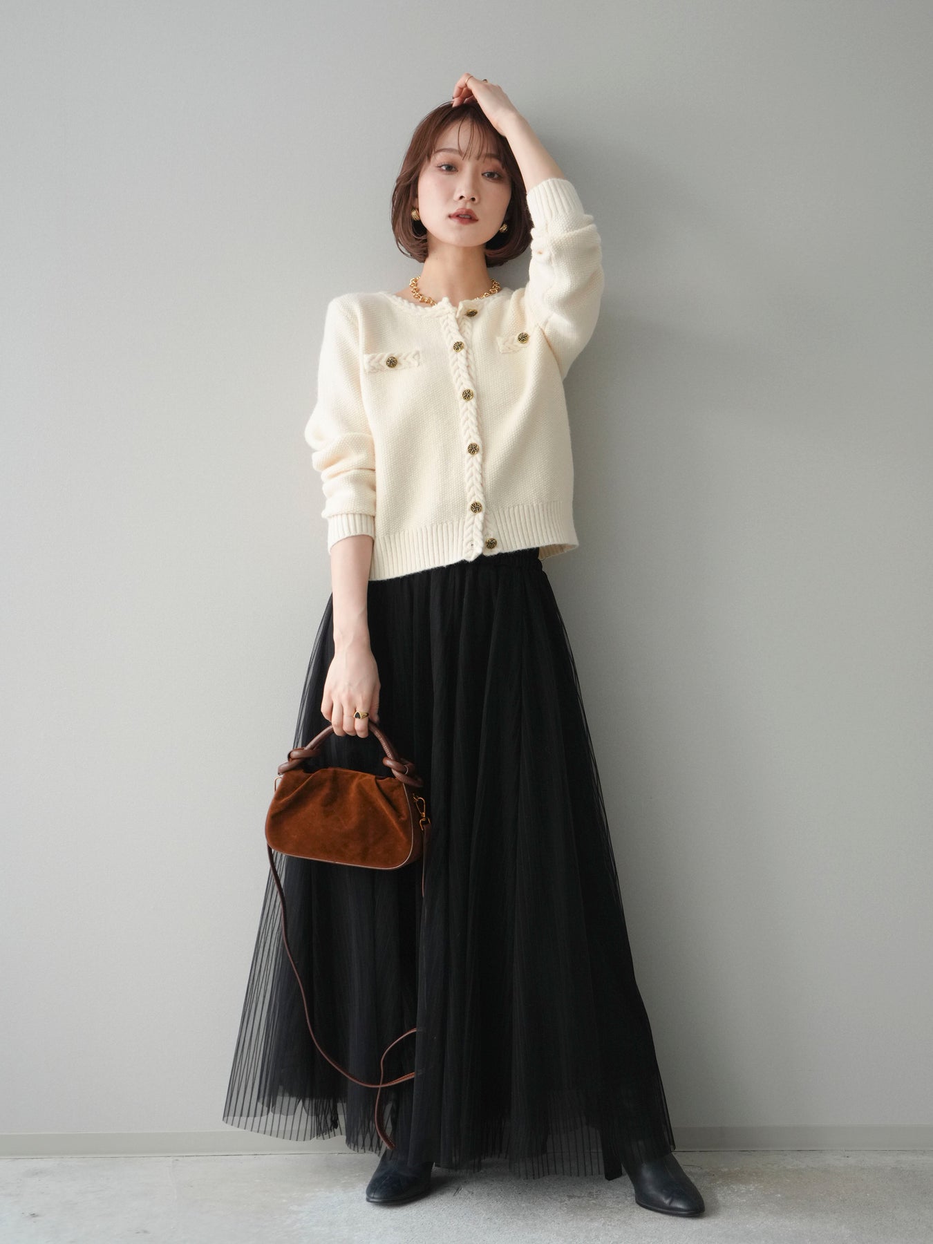 フロントに施した編みこみデザインと、アンティーク調のボタンが上品なアクセントになるニットカーディガン。表面にほどよい凹凸のある編地があたたかみをプラスし、シンプルながらも存在感のある一枚に仕上げています。程よくゆとりのあるシルエットで着心地が良く、羽織りとしてもボタンを閉めてトップス風にも活躍。デイリーのスタイリングに取り入れやすく、クラシックなムードを楽しめる大人のためのカーディガンです。 ※ボトムス、キャミソール(インナー)以外の商品は一律でインナーは付属していません。