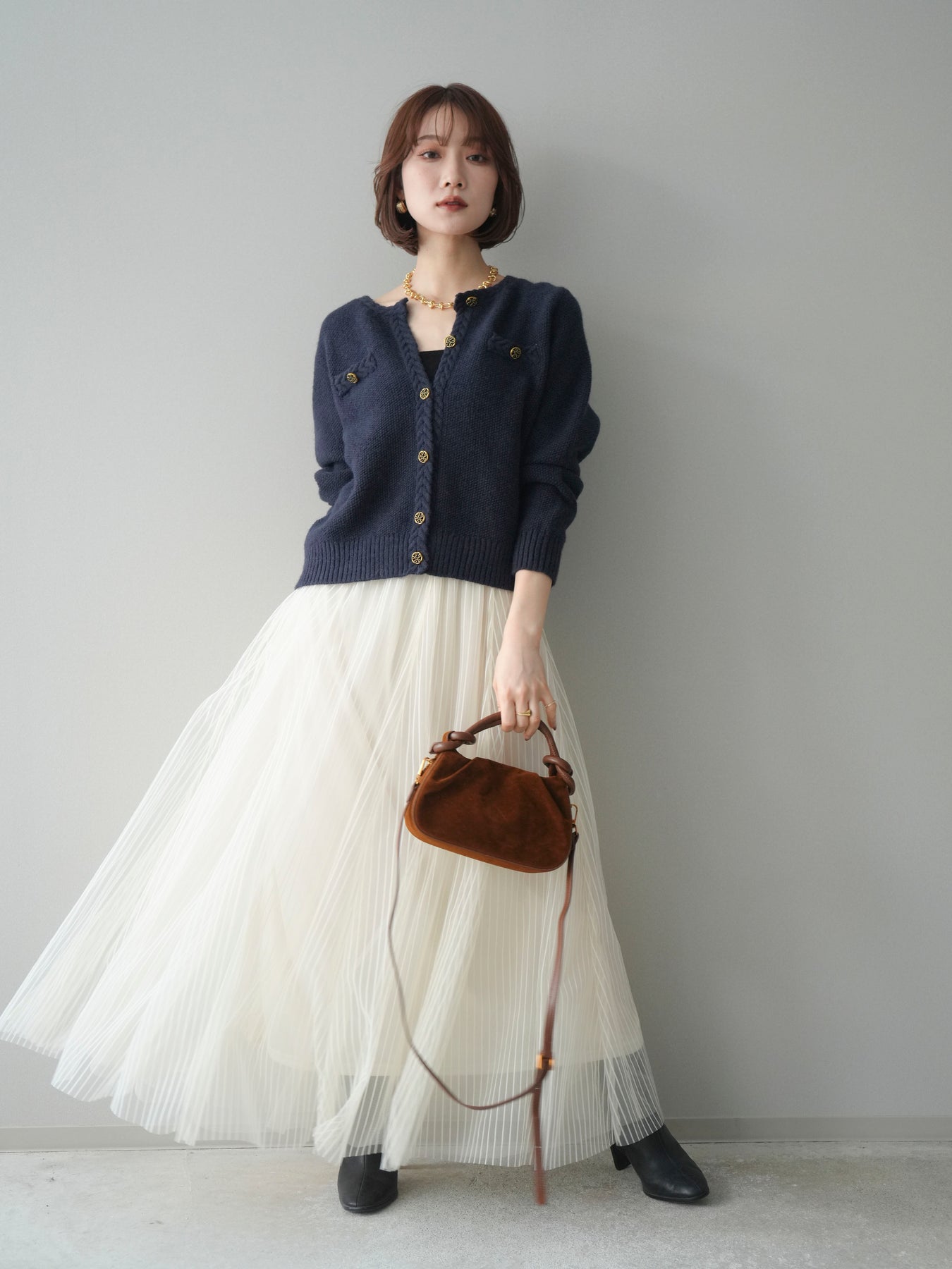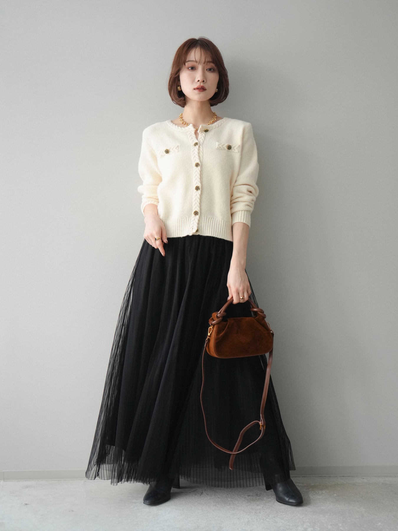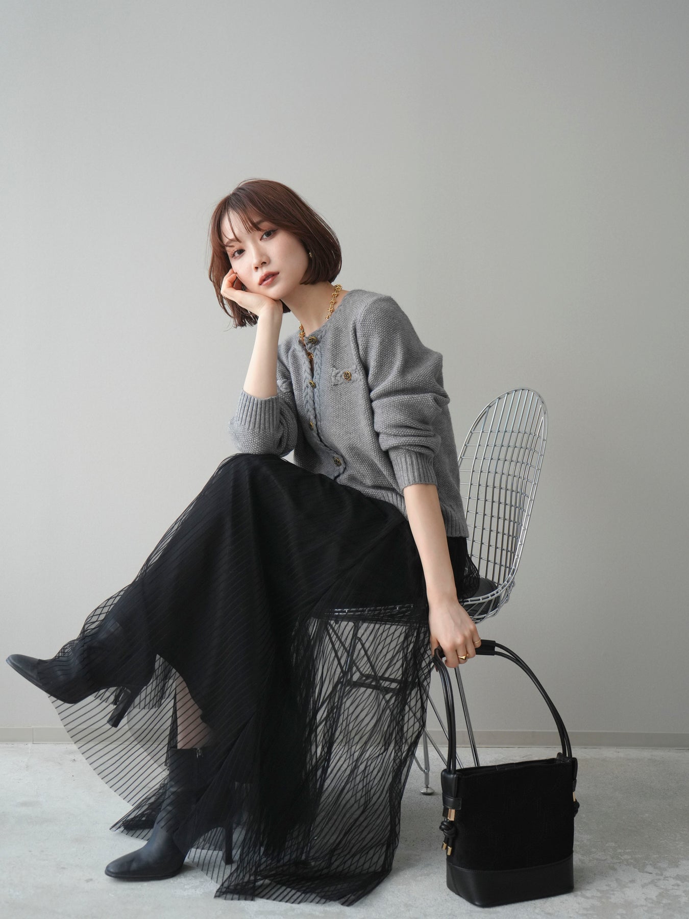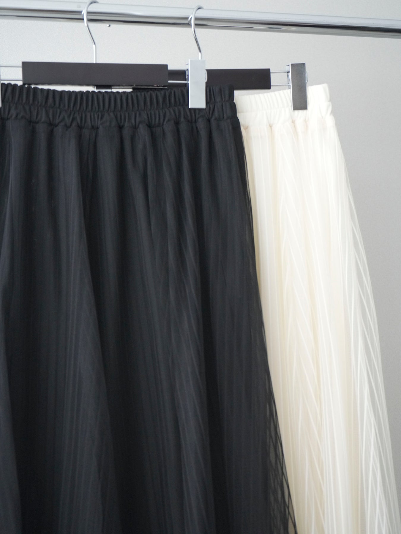 軽やかなチュール素材にストライププリーツを施した、華やかさと上品さを兼ね備えたボリュームスカート。程よい透け感と揺れが女性らしいシルエットを引き立て、動くたびにふわりと広がる表情が魅力です。ウエストはゴム仕様でストレスのない穿き心地ながら、広がりすぎない絶妙なボリューム感でバランスよく着こなせる仕上がりに。シンプルなトップスを合わせるだけで存在感のあるスタイルが完成し、特別なシーンからデイリーまで幅広く使える万能アイテムです。