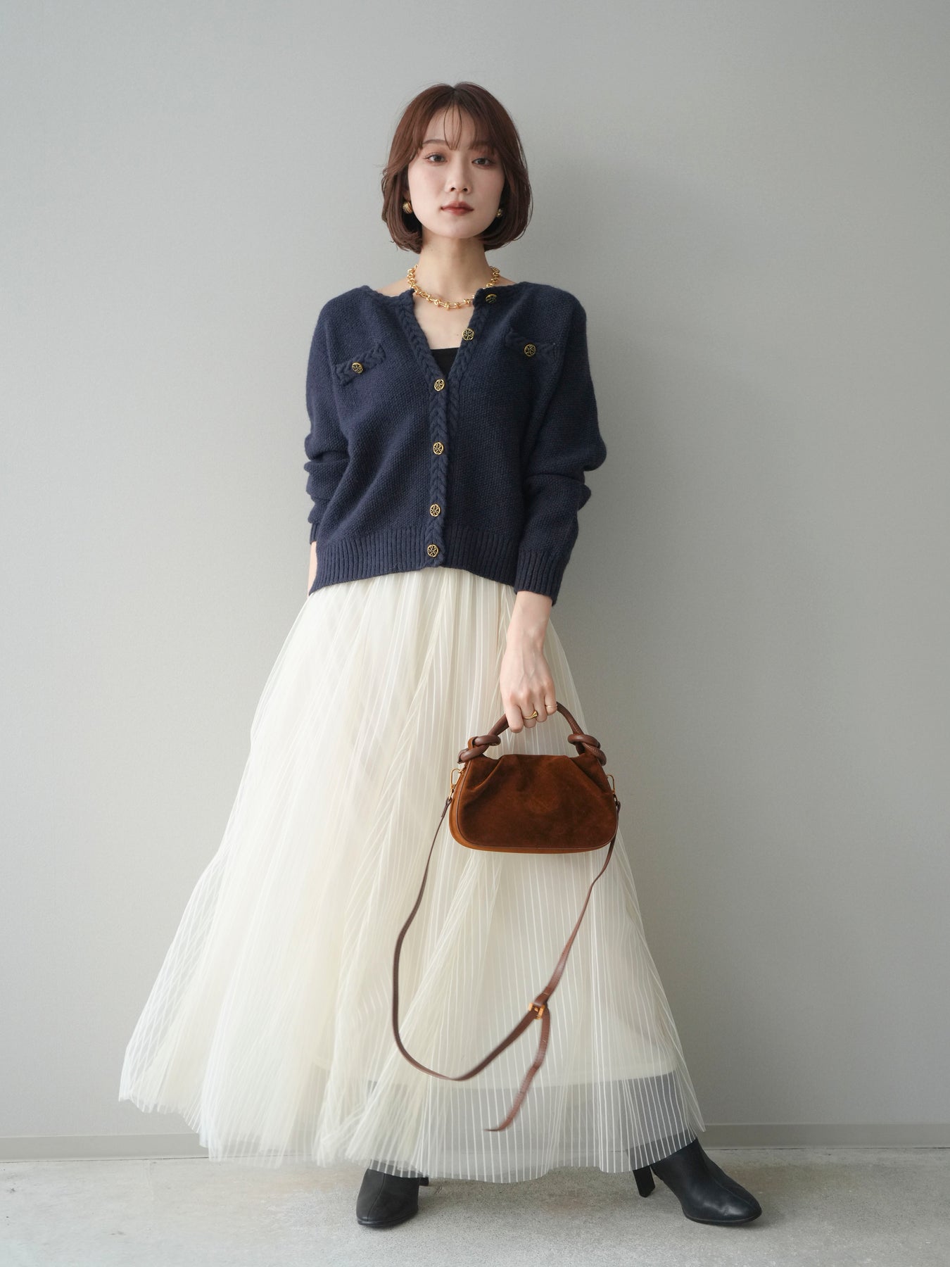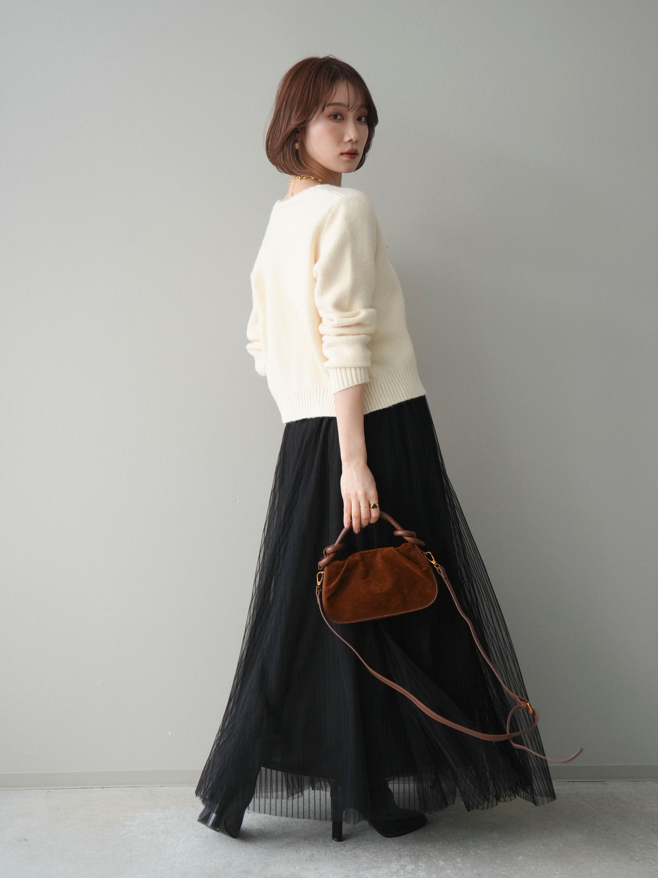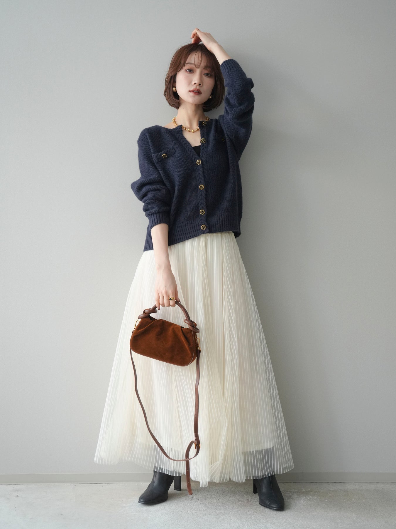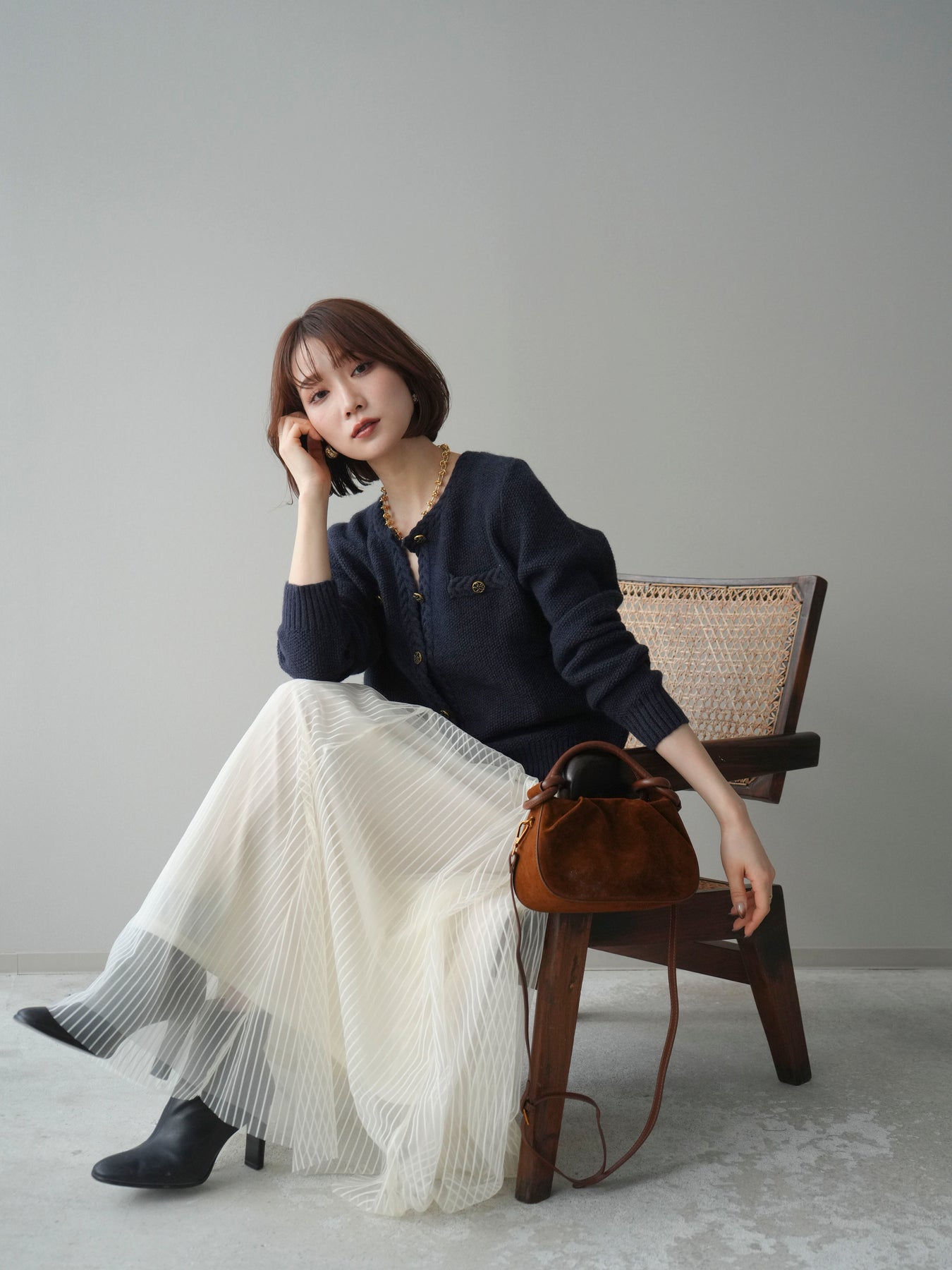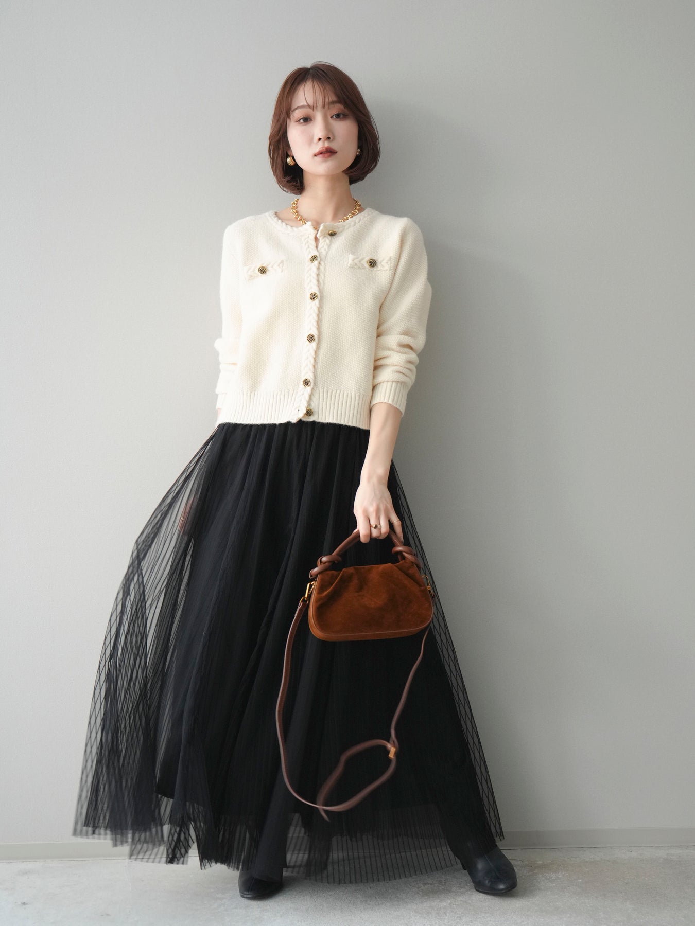 軽やかなチュール素材にストライププリーツを施した、華やかさと上品さを兼ね備えたボリュームスカート。程よい透け感と揺れが女性らしいシルエットを引き立て、動くたびにふわりと広がる表情が魅力です。ウエストはゴム仕様でストレスのない穿き心地ながら、広がりすぎない絶妙なボリューム感でバランスよく着こなせる仕上がりに。シンプルなトップスを合わせるだけで存在感のあるスタイルが完成し、特別なシーンからデイリーまで幅広く使える万能アイテムです。