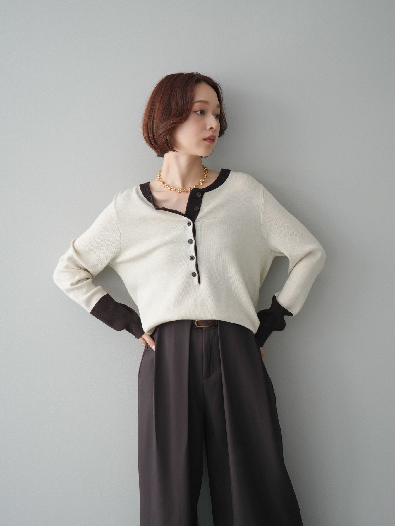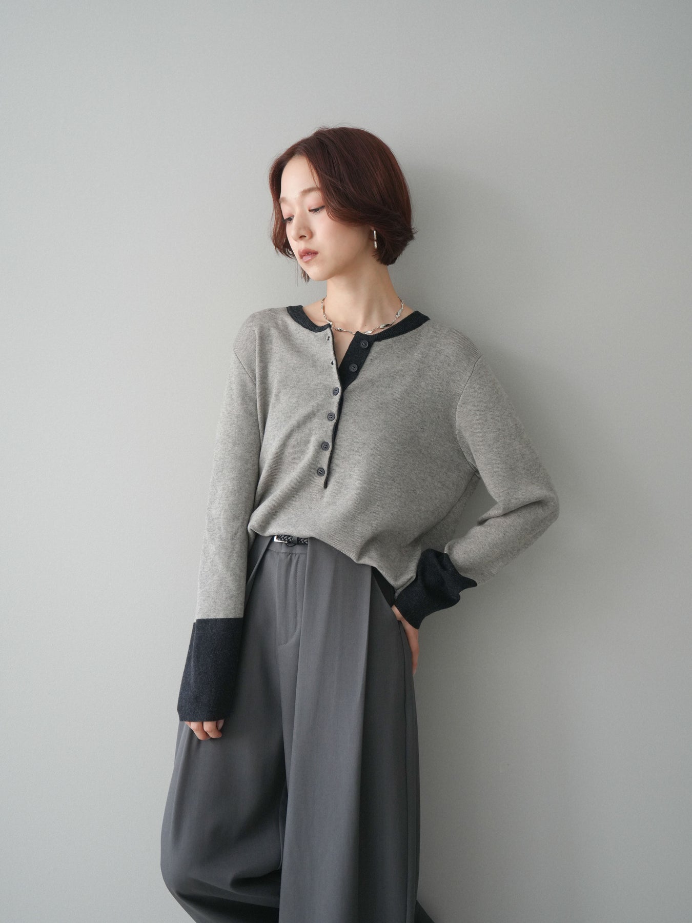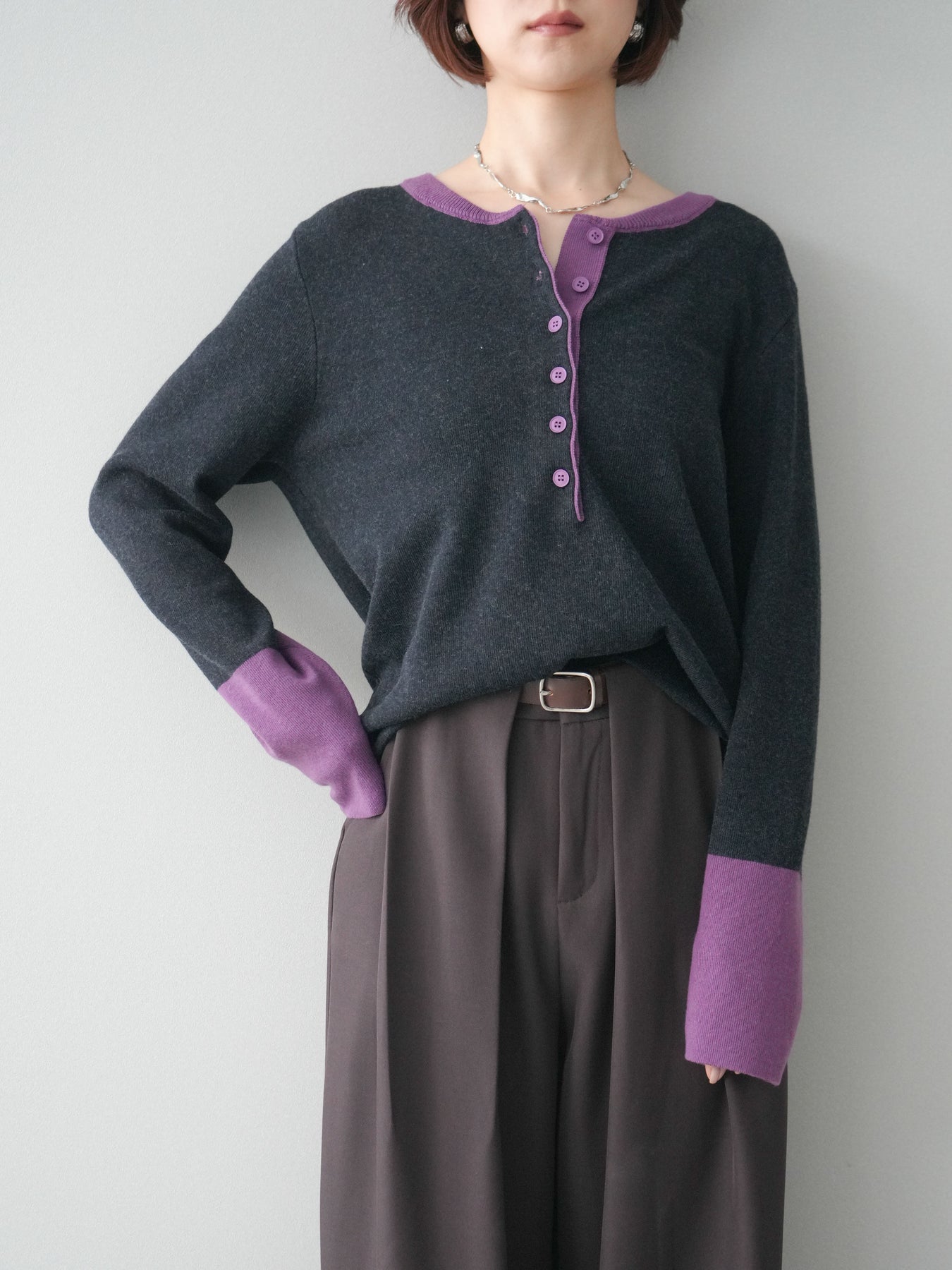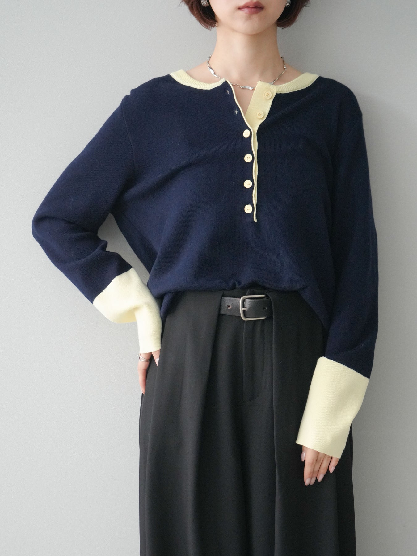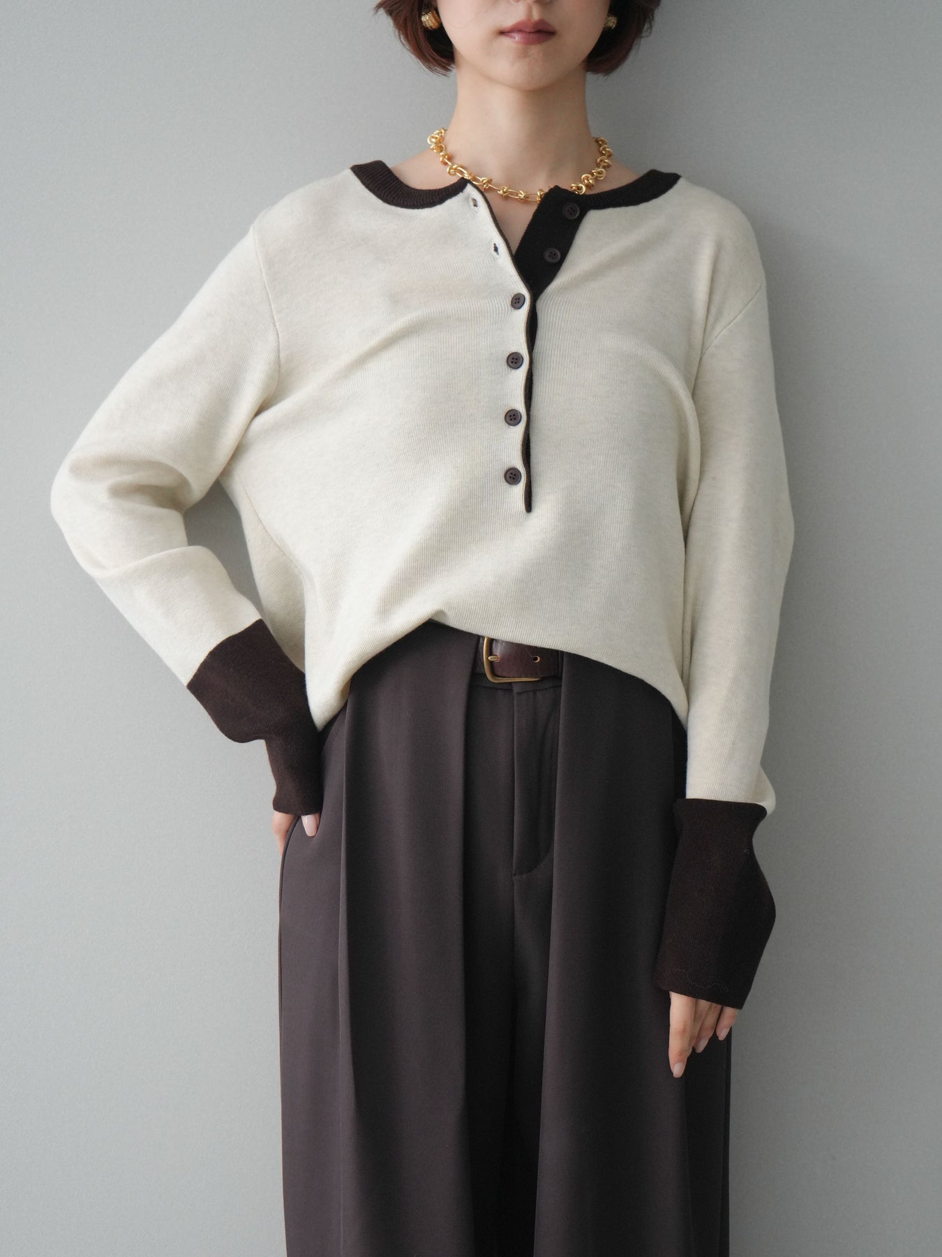 ヘンリーネックに配色ディテールをプラスし、シンプルながらも表情豊かに仕上げたニットソー。さらりとした着心地の良い素材でデイリーに使いやすく、配色のネックラインと袖口がコーディネートのアクセントになります。程よいゆとりのシルエットがリラックス感をもたらし、インでもアウトでもバランスよくスタイリング可能。ボタンを閉めてすっきりと、開けて抜け感を出しても楽しめる万能トップスです。 ※ボトムス、キャミソール(インナー)以外の商品は一律でインナーは付属していません。