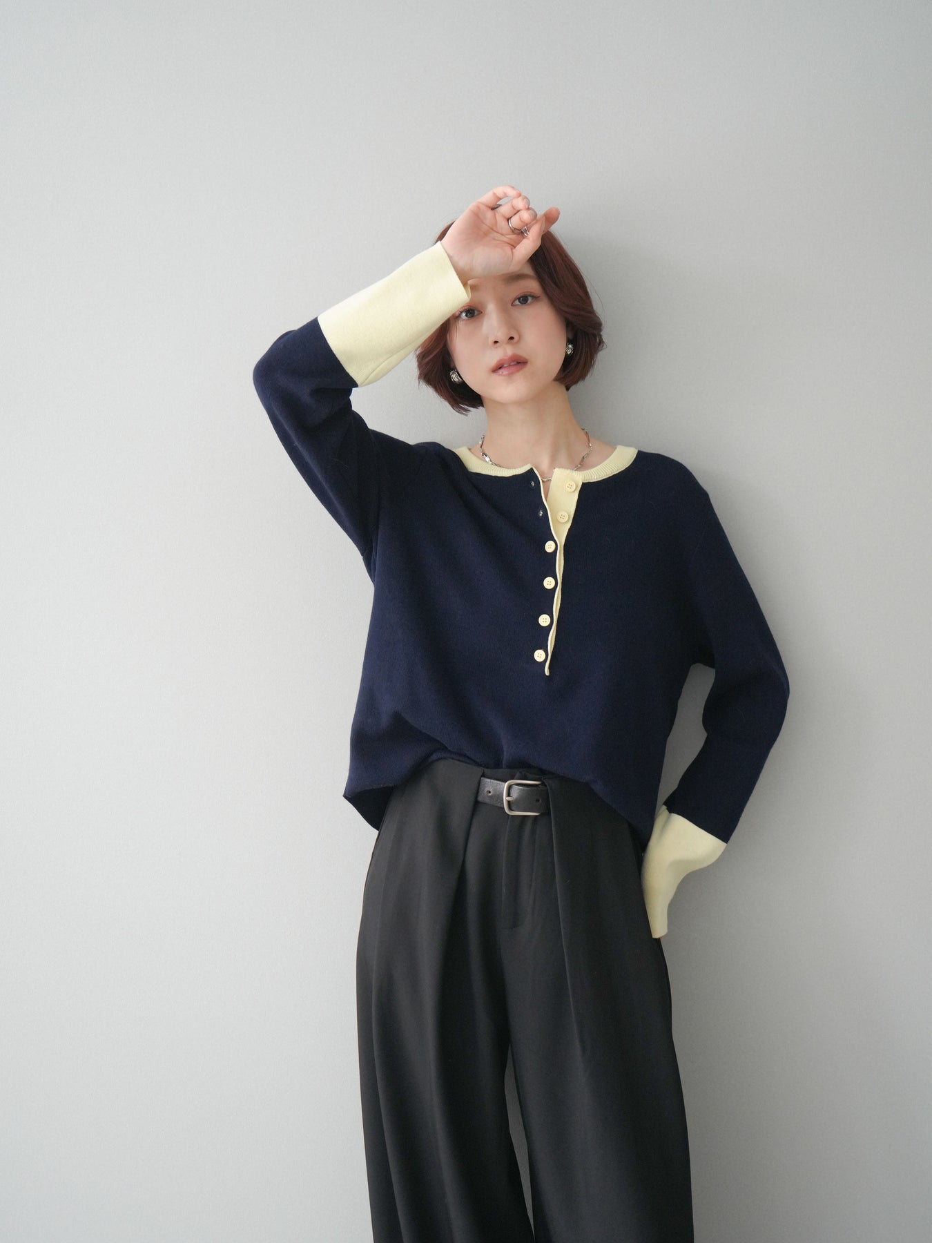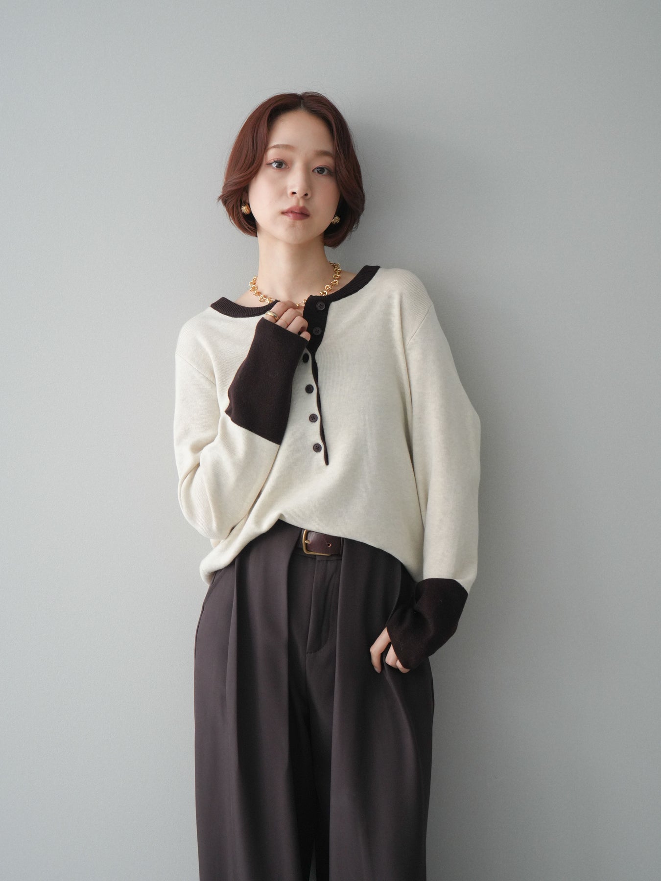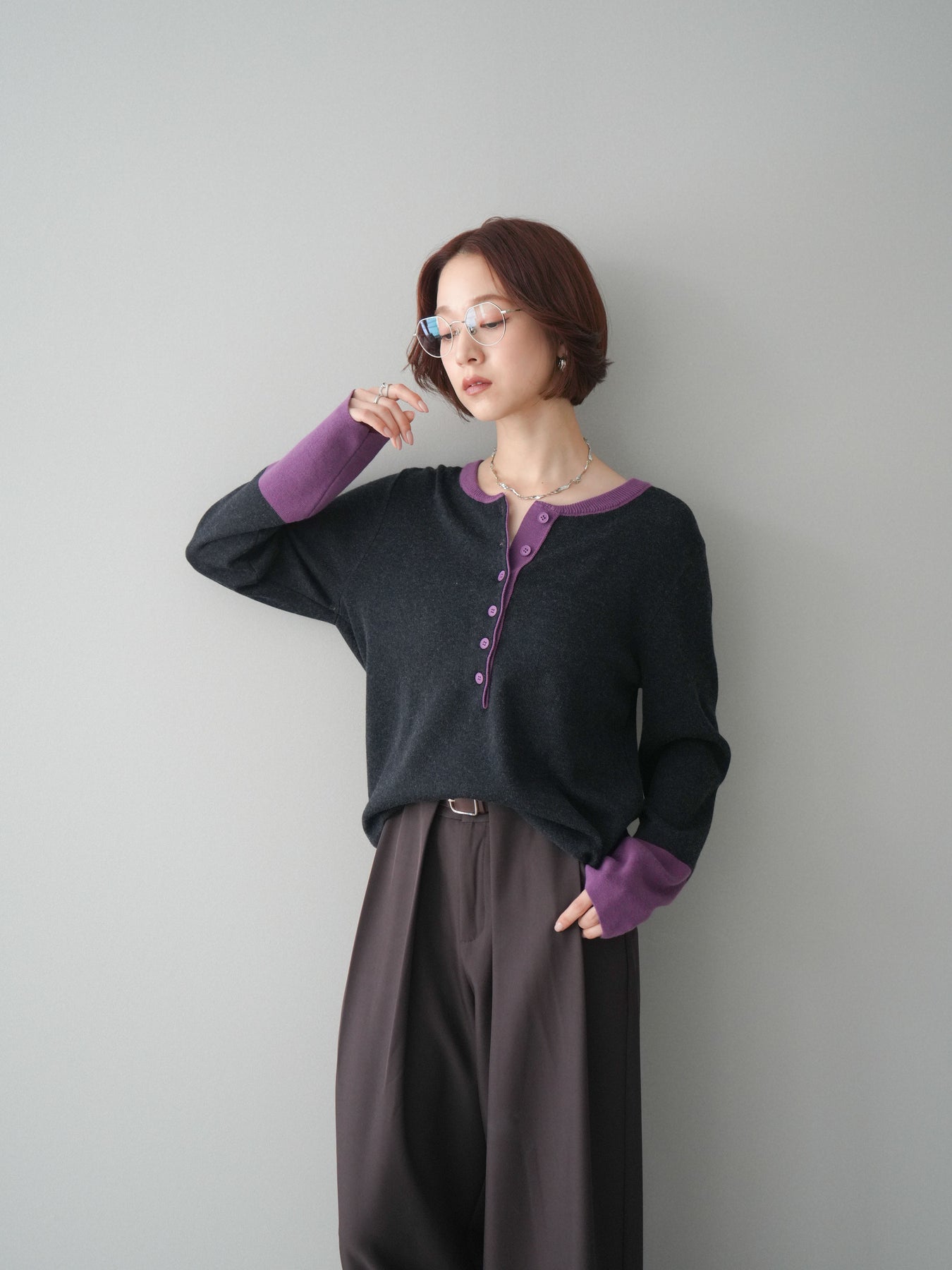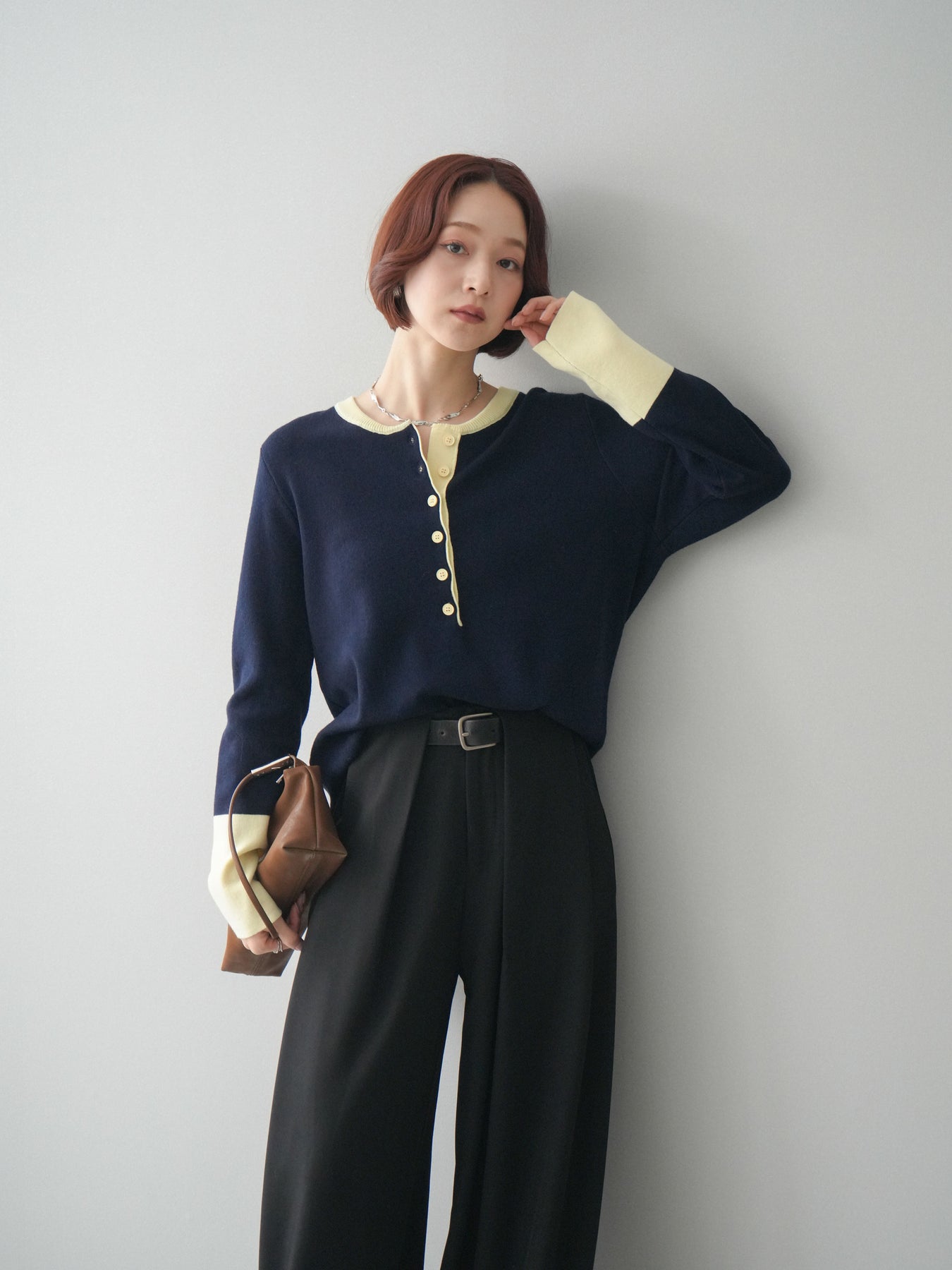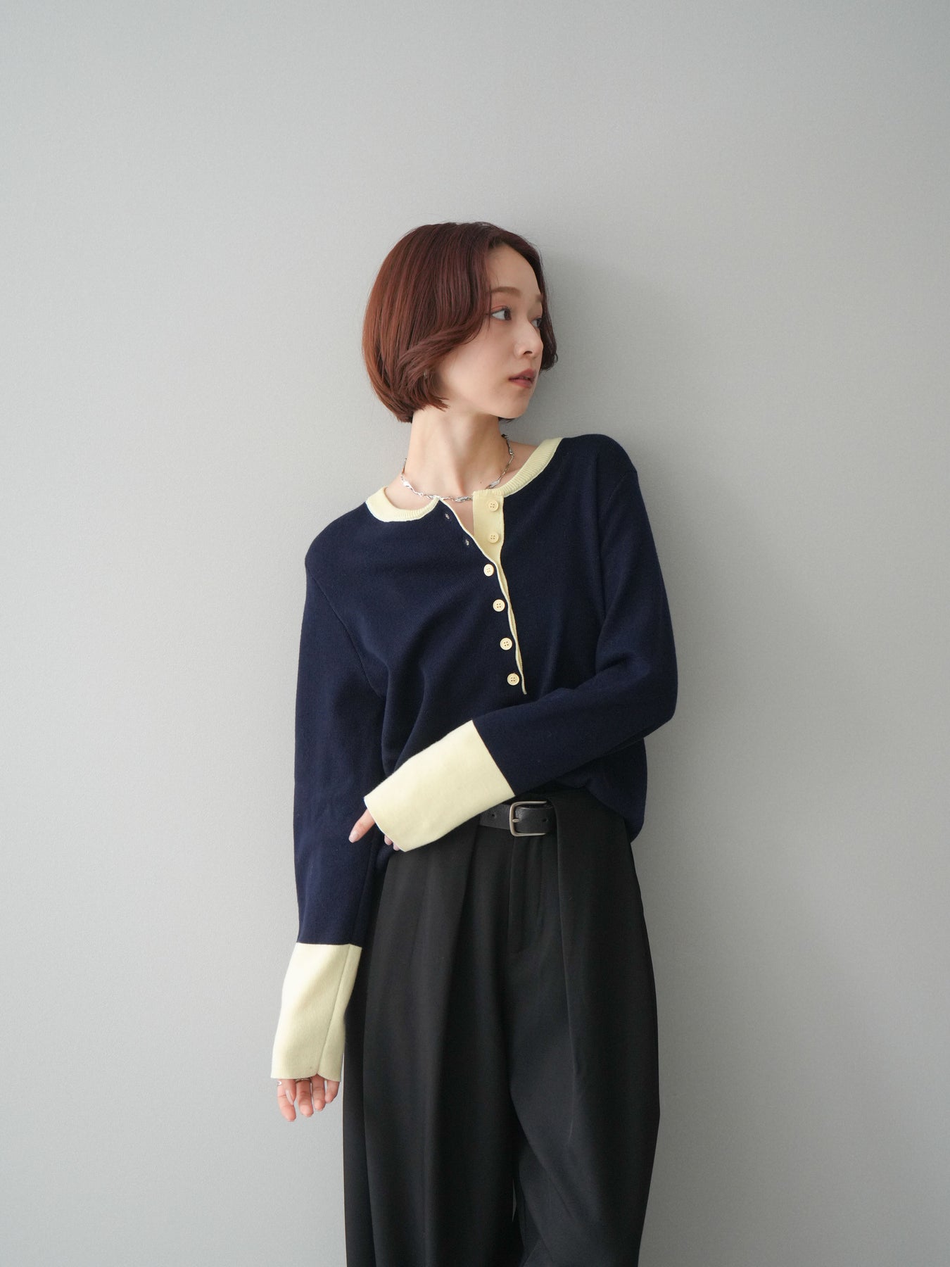 ヘンリーネックに配色ディテールをプラスし、シンプルながらも表情豊かに仕上げたニットソー。さらりとした着心地の良い素材でデイリーに使いやすく、配色のネックラインと袖口がコーディネートのアクセントになります。程よいゆとりのシルエットがリラックス感をもたらし、インでもアウトでもバランスよくスタイリング可能。ボタンを閉めてすっきりと、開けて抜け感を出しても楽しめる万能トップスです。 ※ボトムス、キャミソール(インナー)以外の商品は一律でインナーは付属していません。