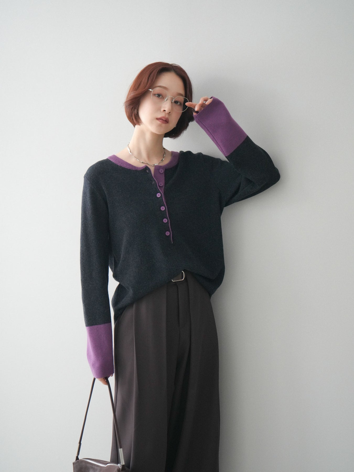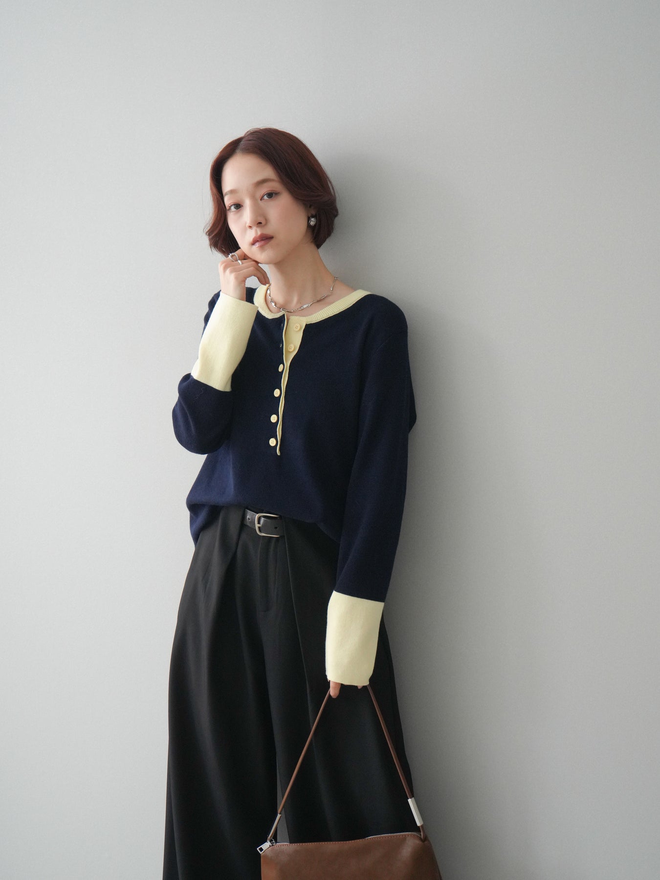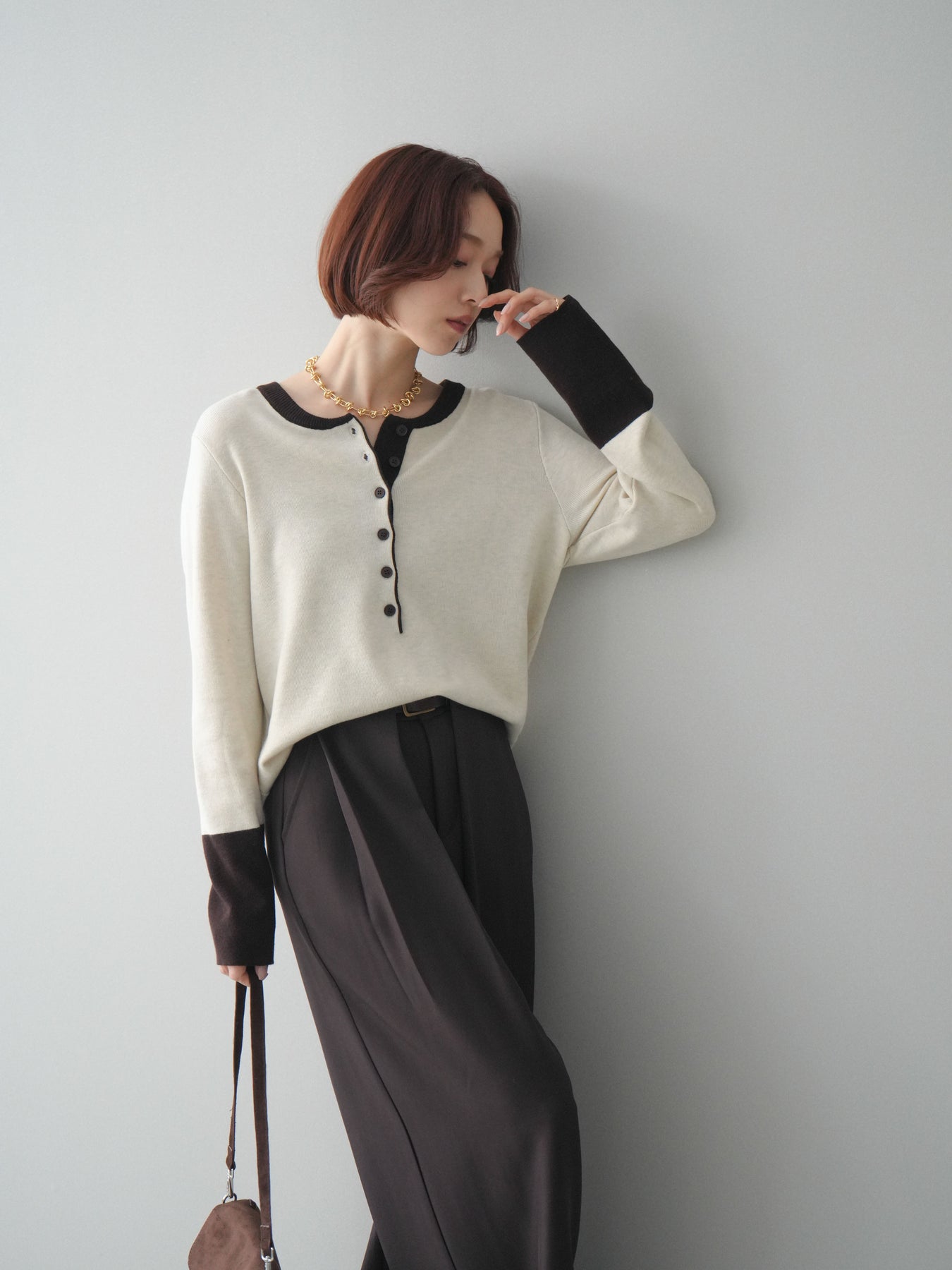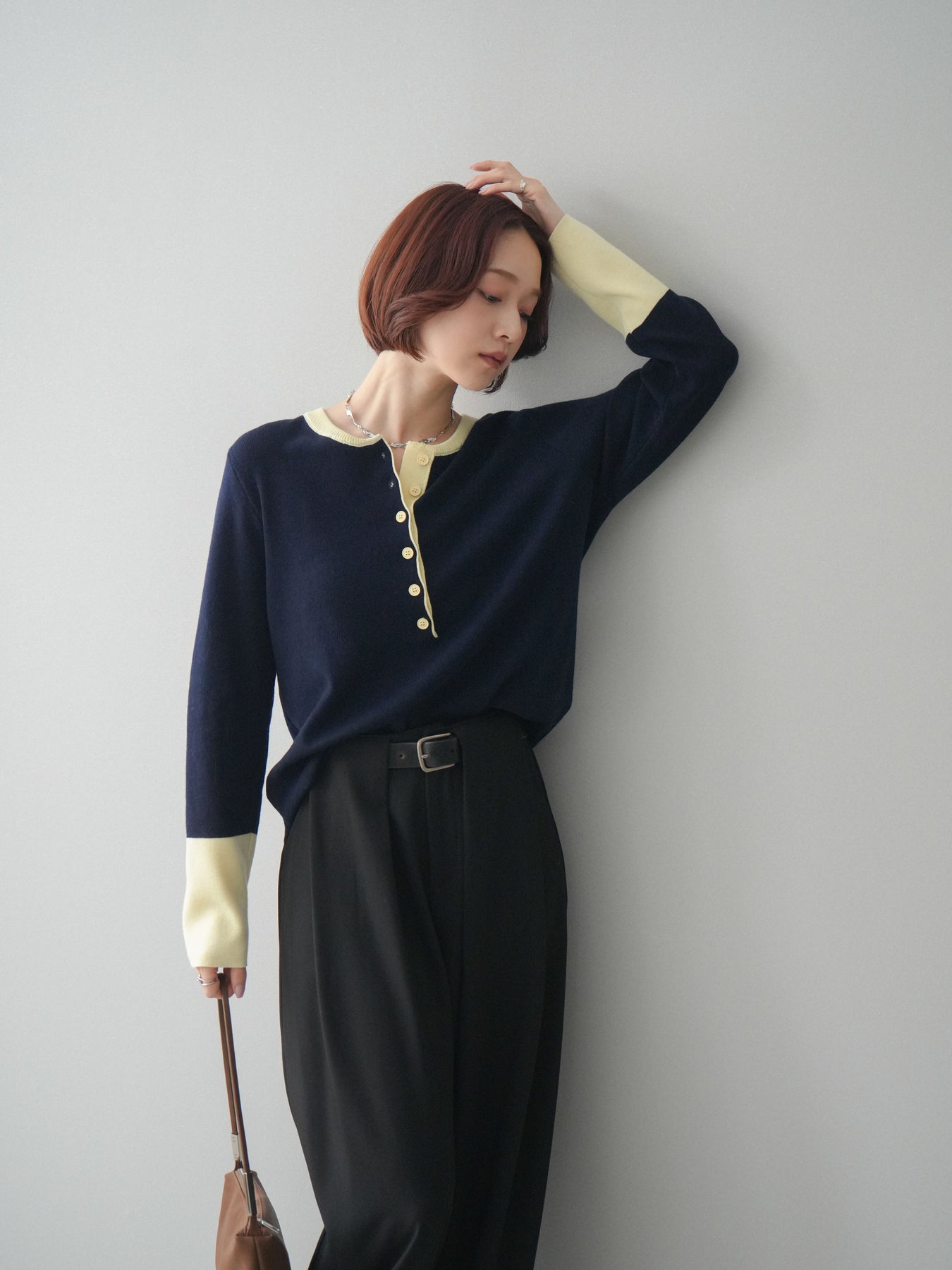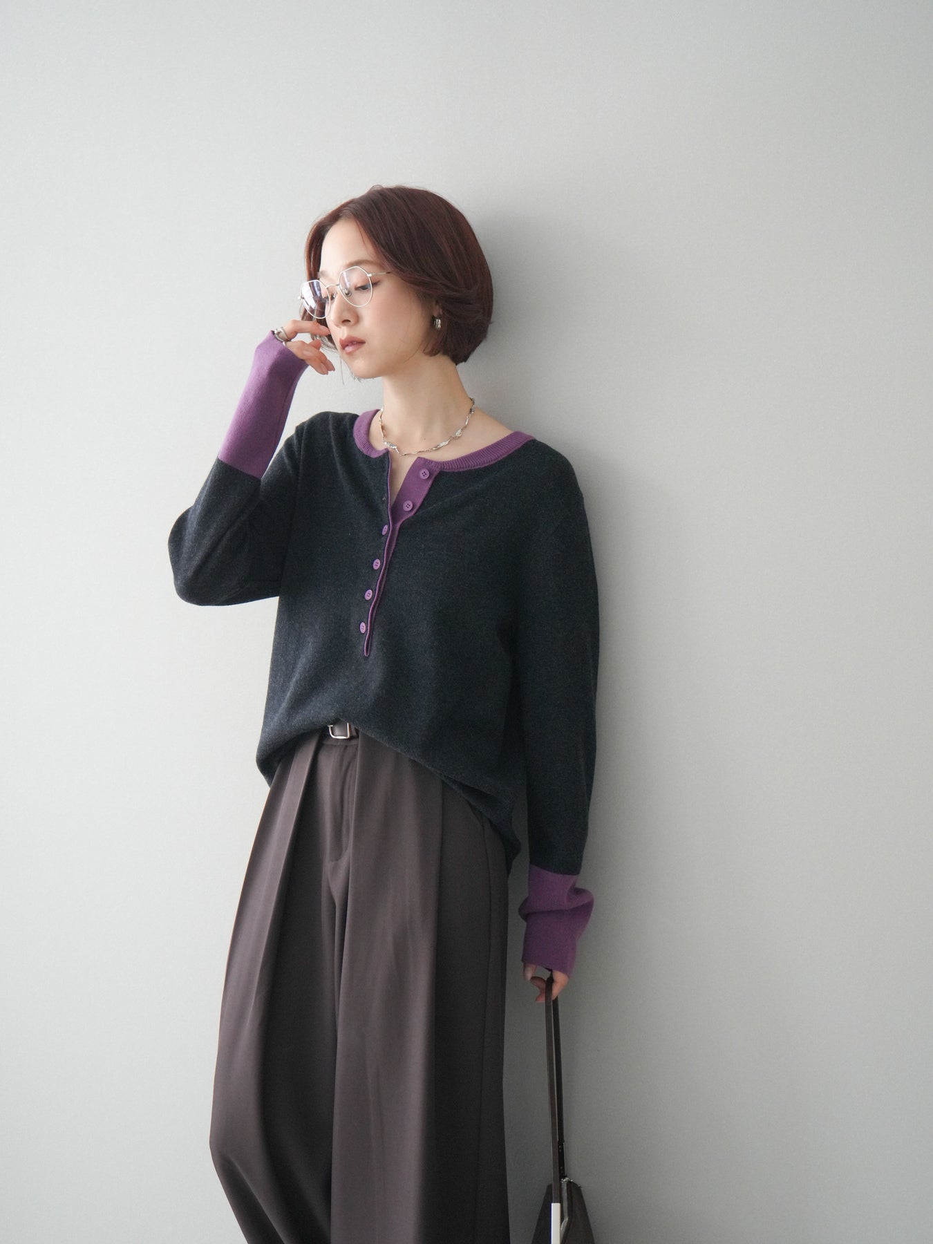 ヘンリーネックに配色ディテールをプラスし、シンプルながらも表情豊かに仕上げたニットソー。さらりとした着心地の良い素材でデイリーに使いやすく、配色のネックラインと袖口がコーディネートのアクセントになります。程よいゆとりのシルエットがリラックス感をもたらし、インでもアウトでもバランスよくスタイリング可能。ボタンを閉めてすっきりと、開けて抜け感を出しても楽しめる万能トップスです。 ※ボトムス、キャミソール(インナー)以外の商品は一律でインナーは付属していません。