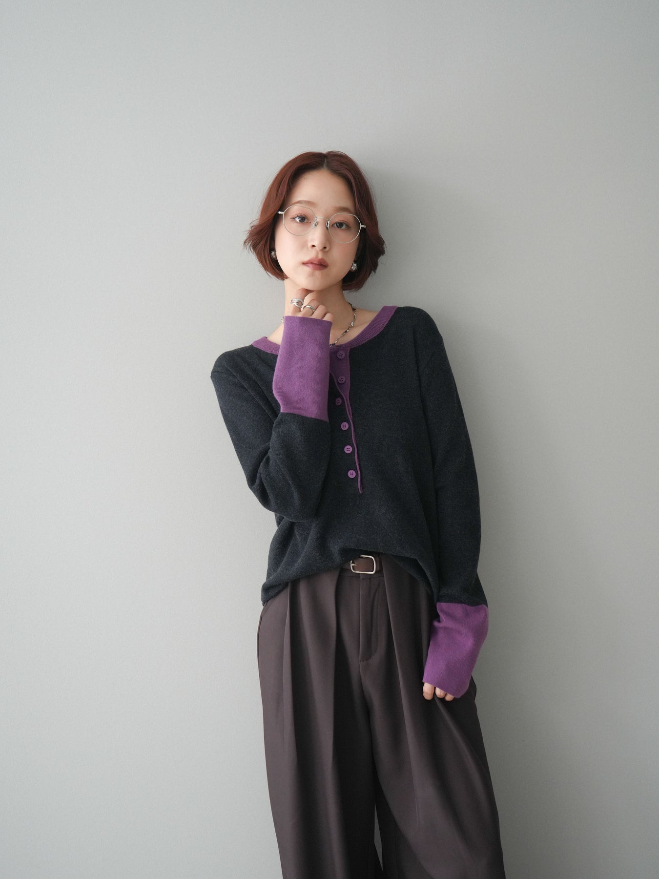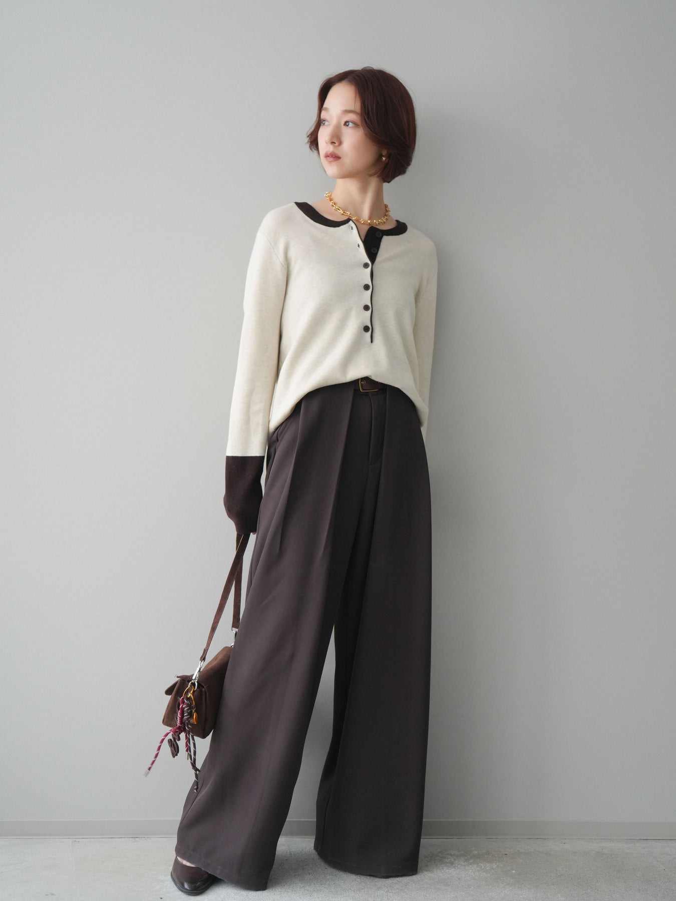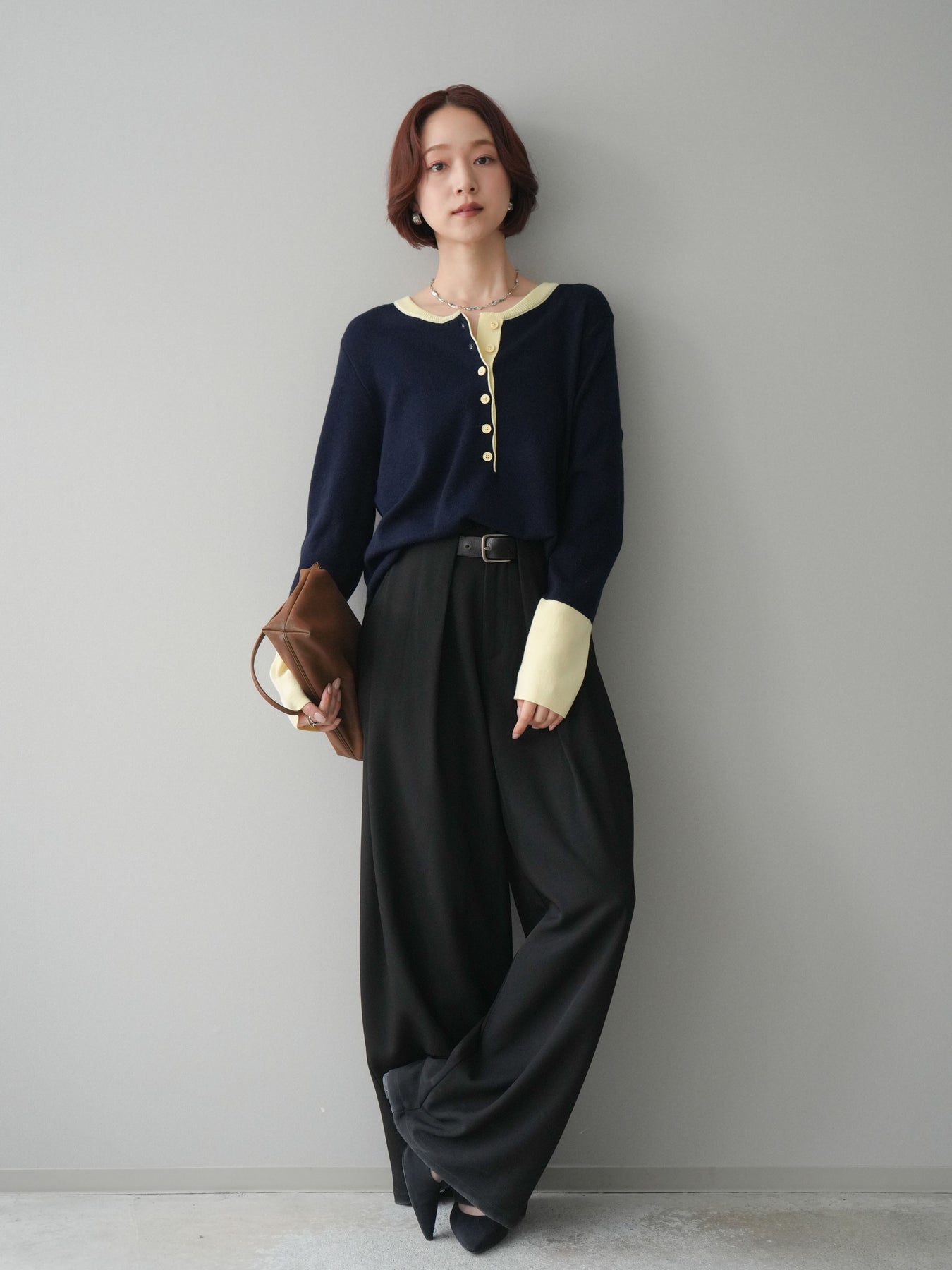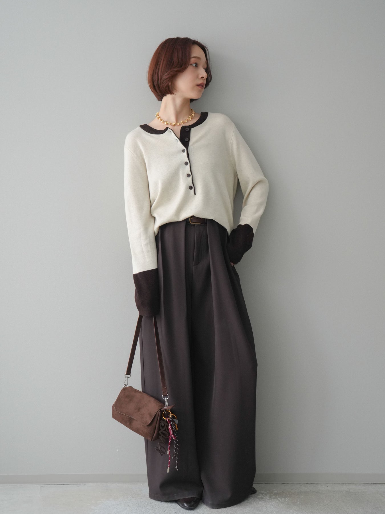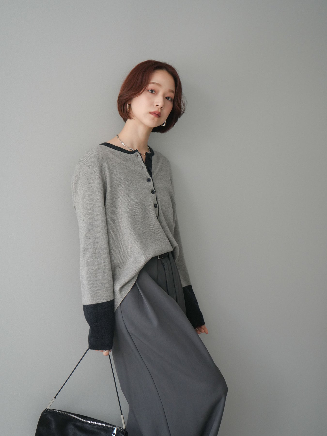 ヘンリーネックに配色ディテールをプラスし、シンプルながらも表情豊かに仕上げたニットソー。さらりとした着心地の良い素材でデイリーに使いやすく、配色のネックラインと袖口がコーディネートのアクセントになります。程よいゆとりのシルエットがリラックス感をもたらし、インでもアウトでもバランスよくスタイリング可能。ボタンを閉めてすっきりと、開けて抜け感を出しても楽しめる万能トップスです。 ※ボトムス、キャミソール(インナー)以外の商品は一律でインナーは付属していません。