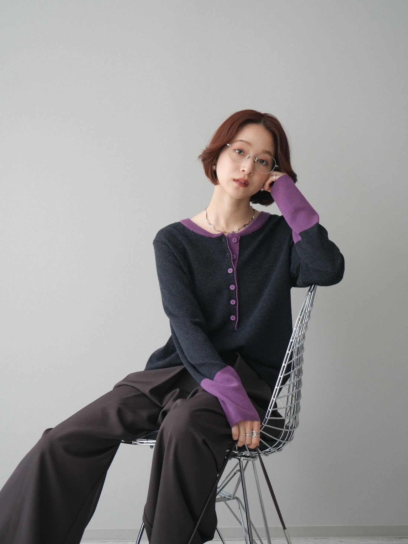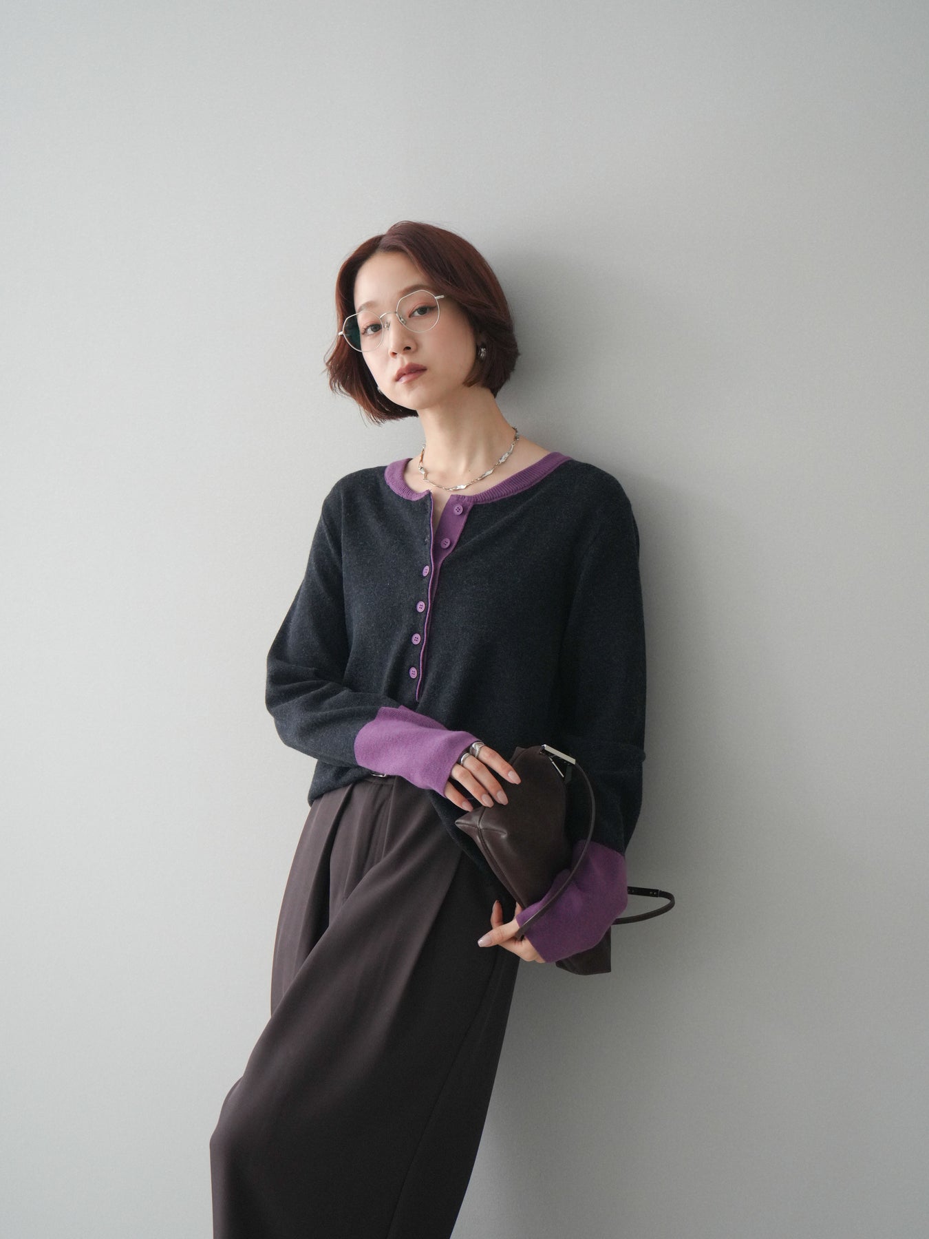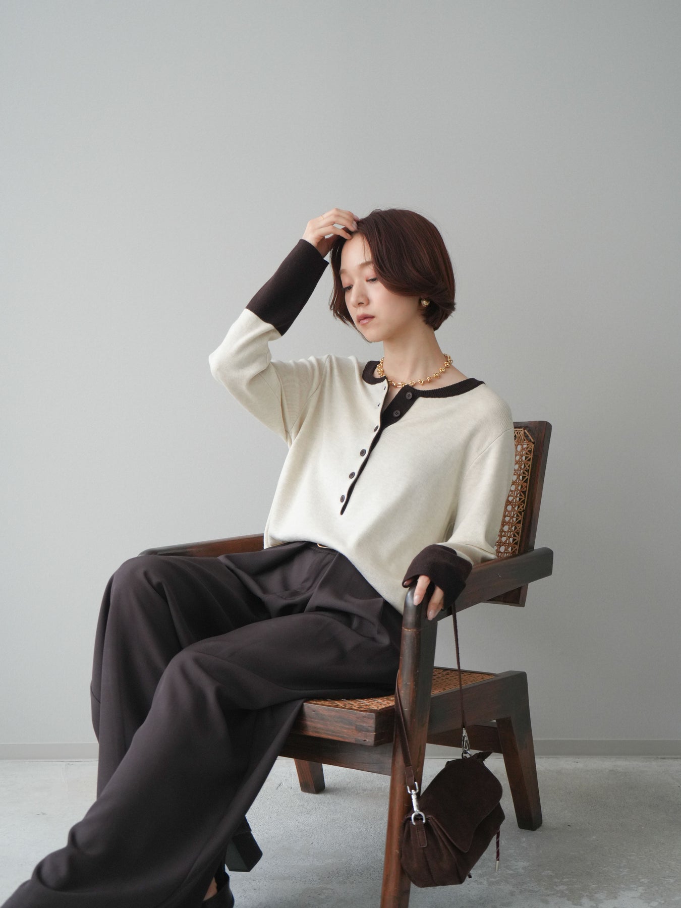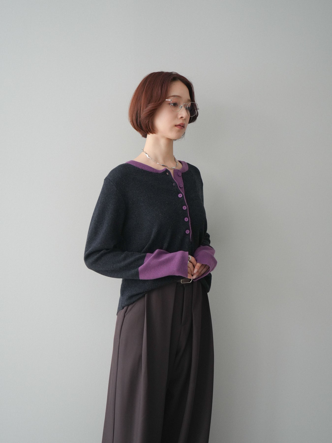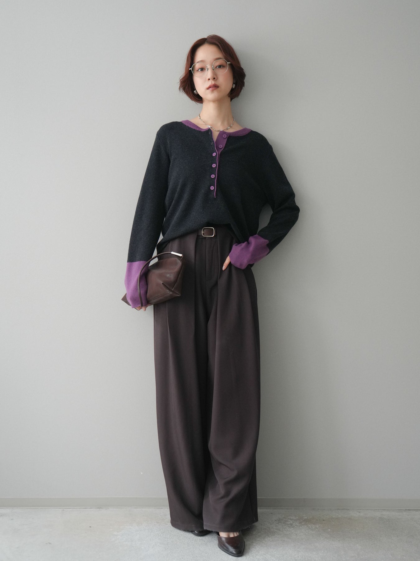 ヘンリーネックに配色ディテールをプラスし、シンプルながらも表情豊かに仕上げたニットソー。さらりとした着心地の良い素材でデイリーに使いやすく、配色のネックラインと袖口がコーディネートのアクセントになります。程よいゆとりのシルエットがリラックス感をもたらし、インでもアウトでもバランスよくスタイリング可能。ボタンを閉めてすっきりと、開けて抜け感を出しても楽しめる万能トップスです。 ※ボトムス、キャミソール(インナー)以外の商品は一律でインナーは付属していません。