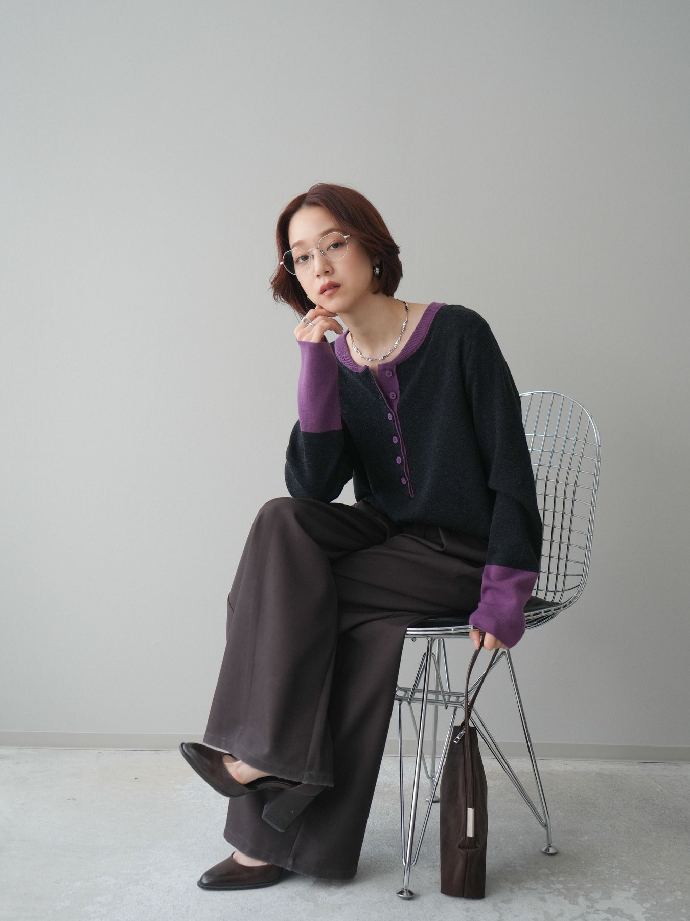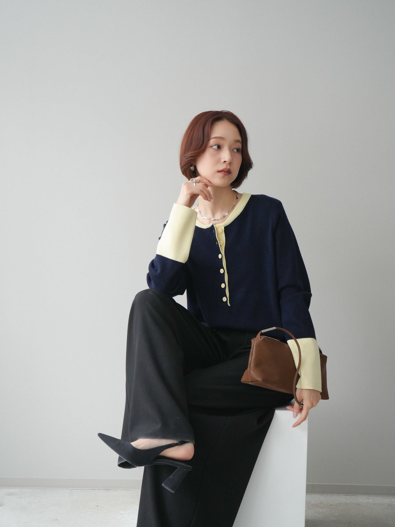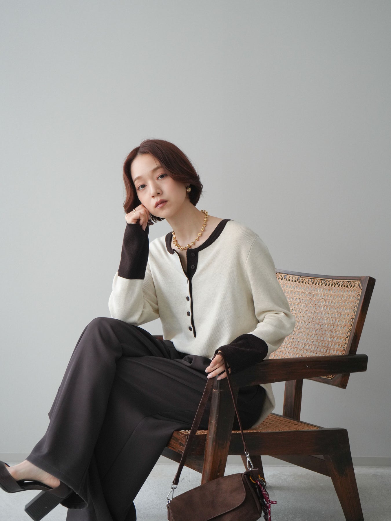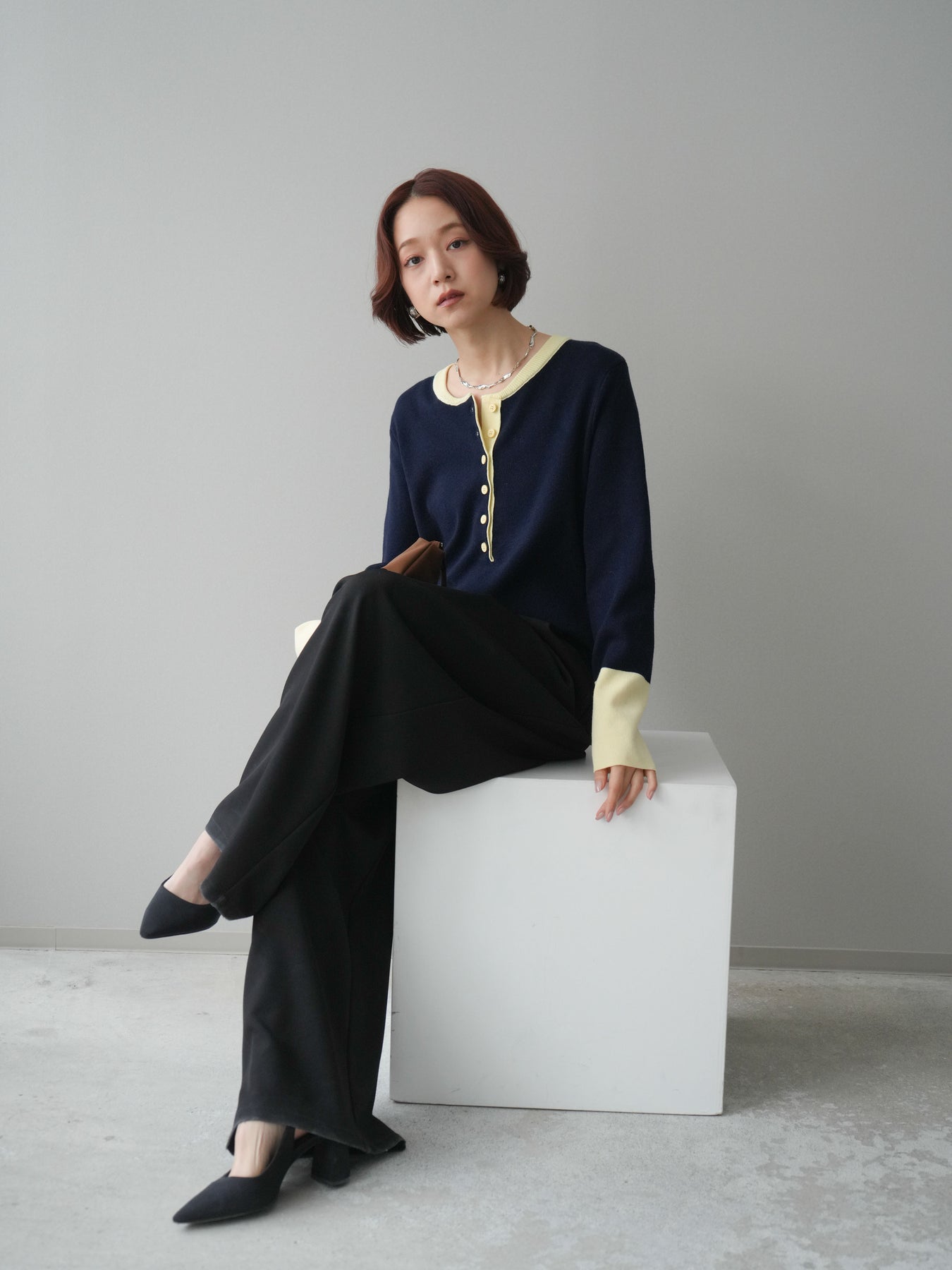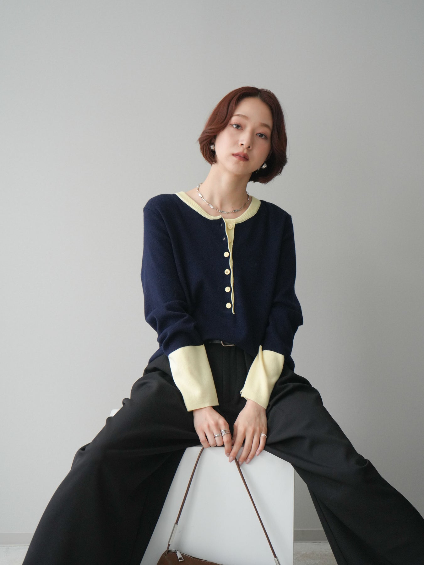 ヘンリーネックに配色ディテールをプラスし、シンプルながらも表情豊かに仕上げたニットソー。さらりとした着心地の良い素材でデイリーに使いやすく、配色のネックラインと袖口がコーディネートのアクセントになります。程よいゆとりのシルエットがリラックス感をもたらし、インでもアウトでもバランスよくスタイリング可能。ボタンを閉めてすっきりと、開けて抜け感を出しても楽しめる万能トップスです。 ※ボトムス、キャミソール(インナー)以外の商品は一律でインナーは付属していません。