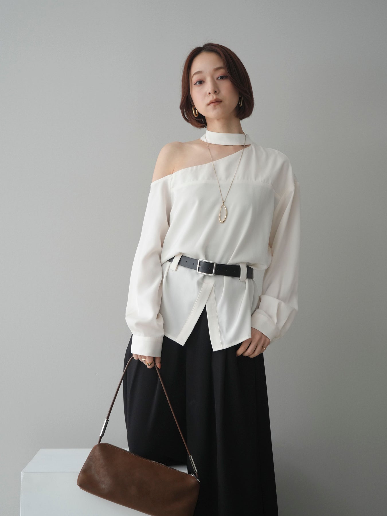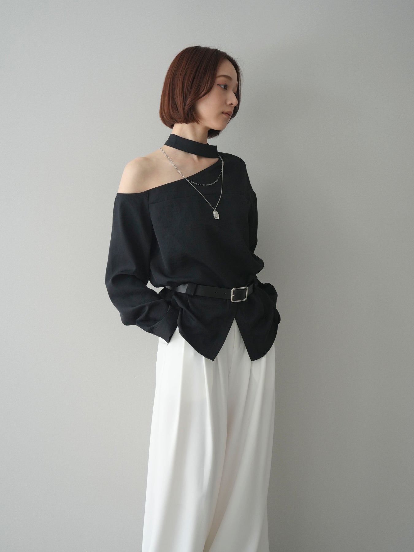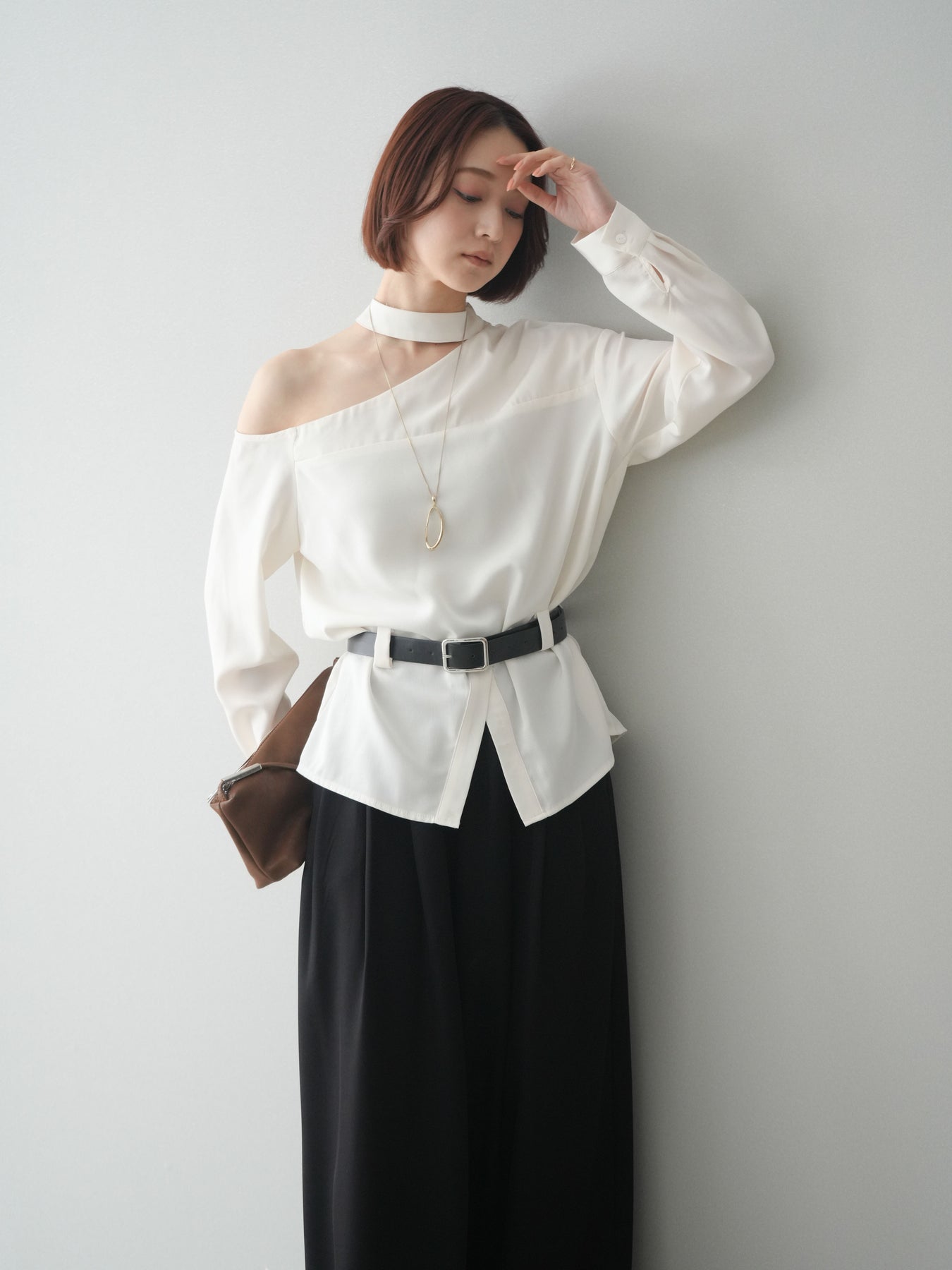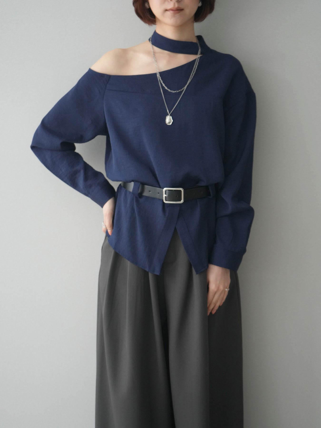 ◆ [予約]ベルト付ワンショルダースリットブラウス