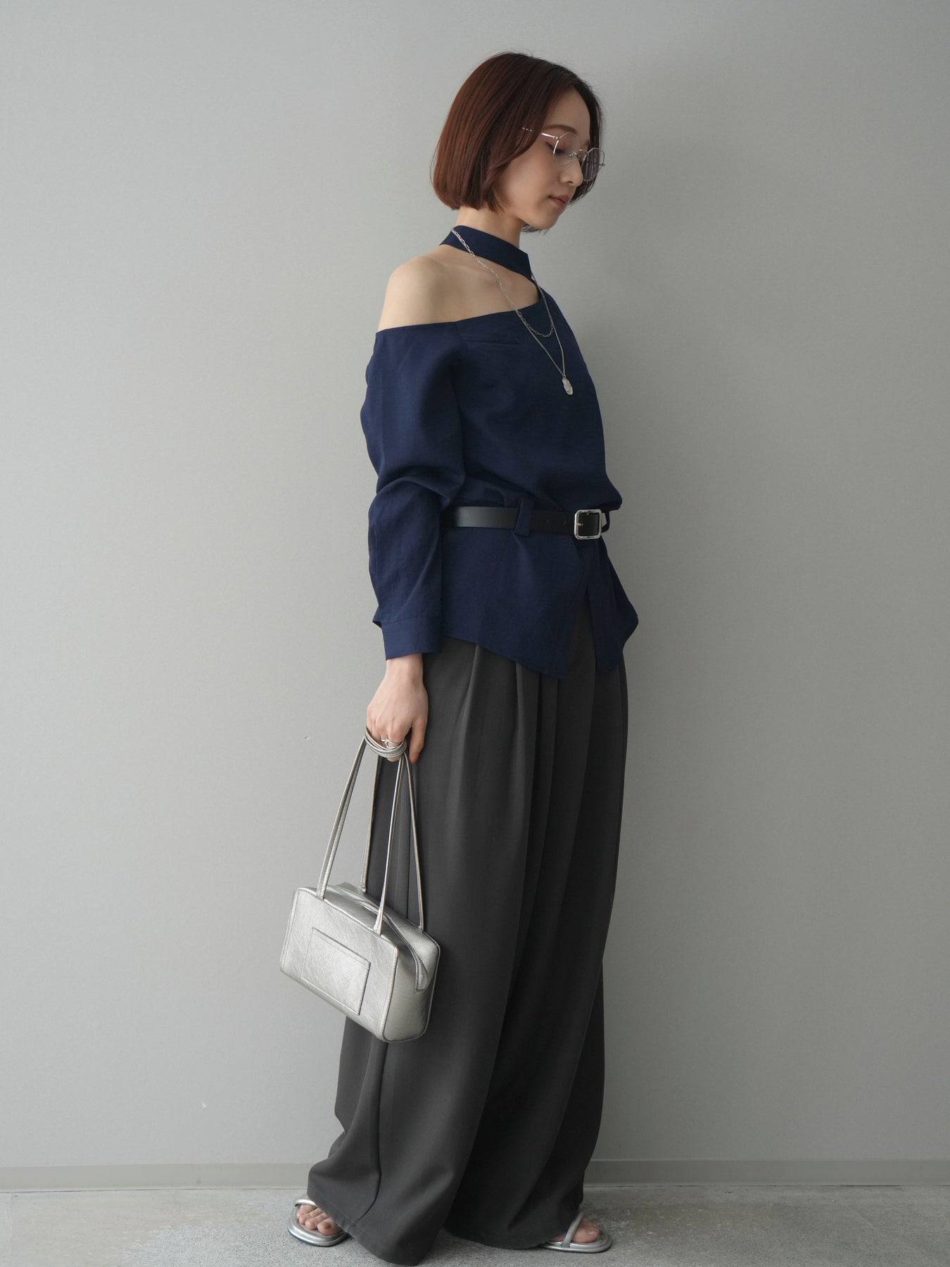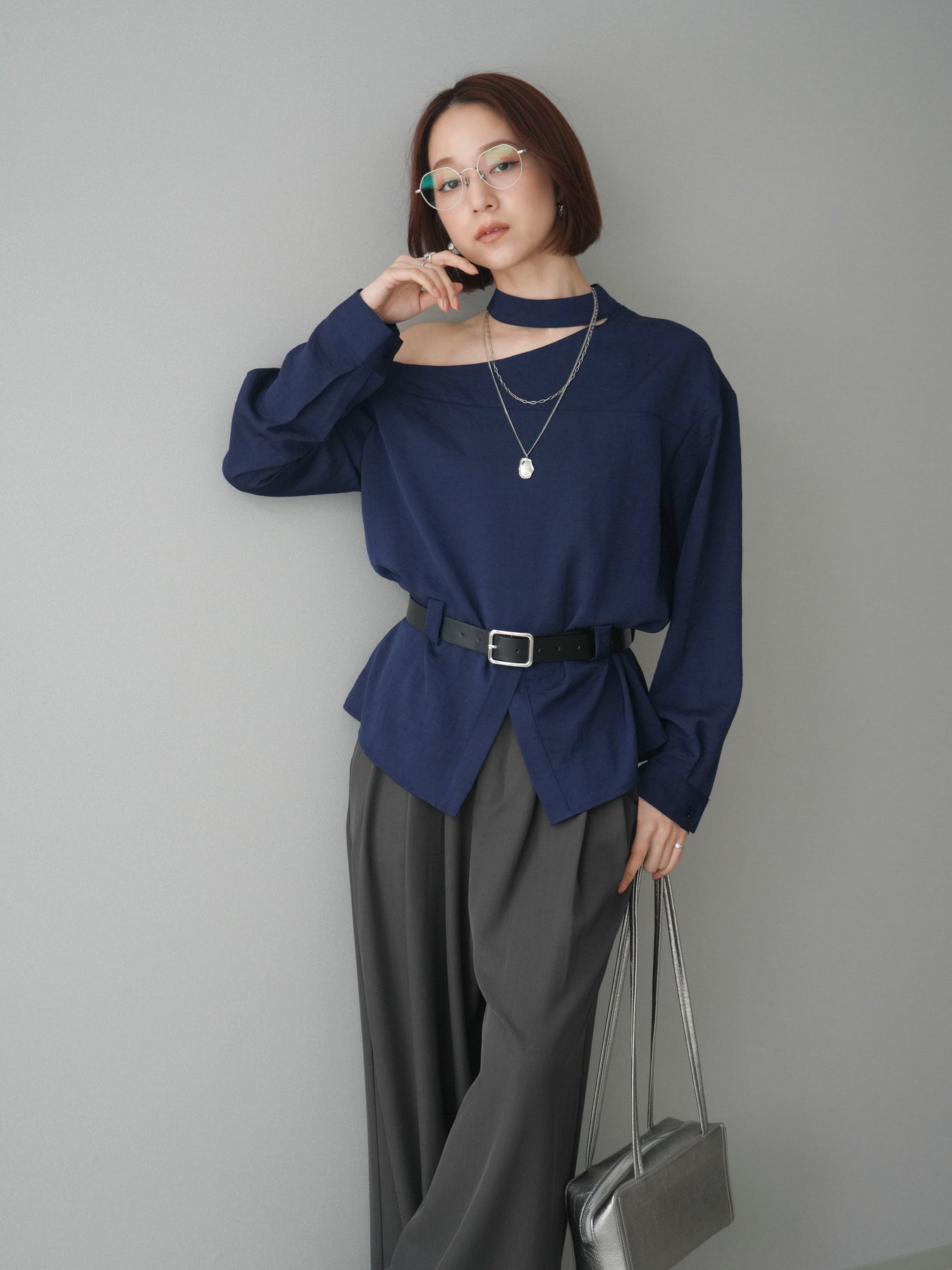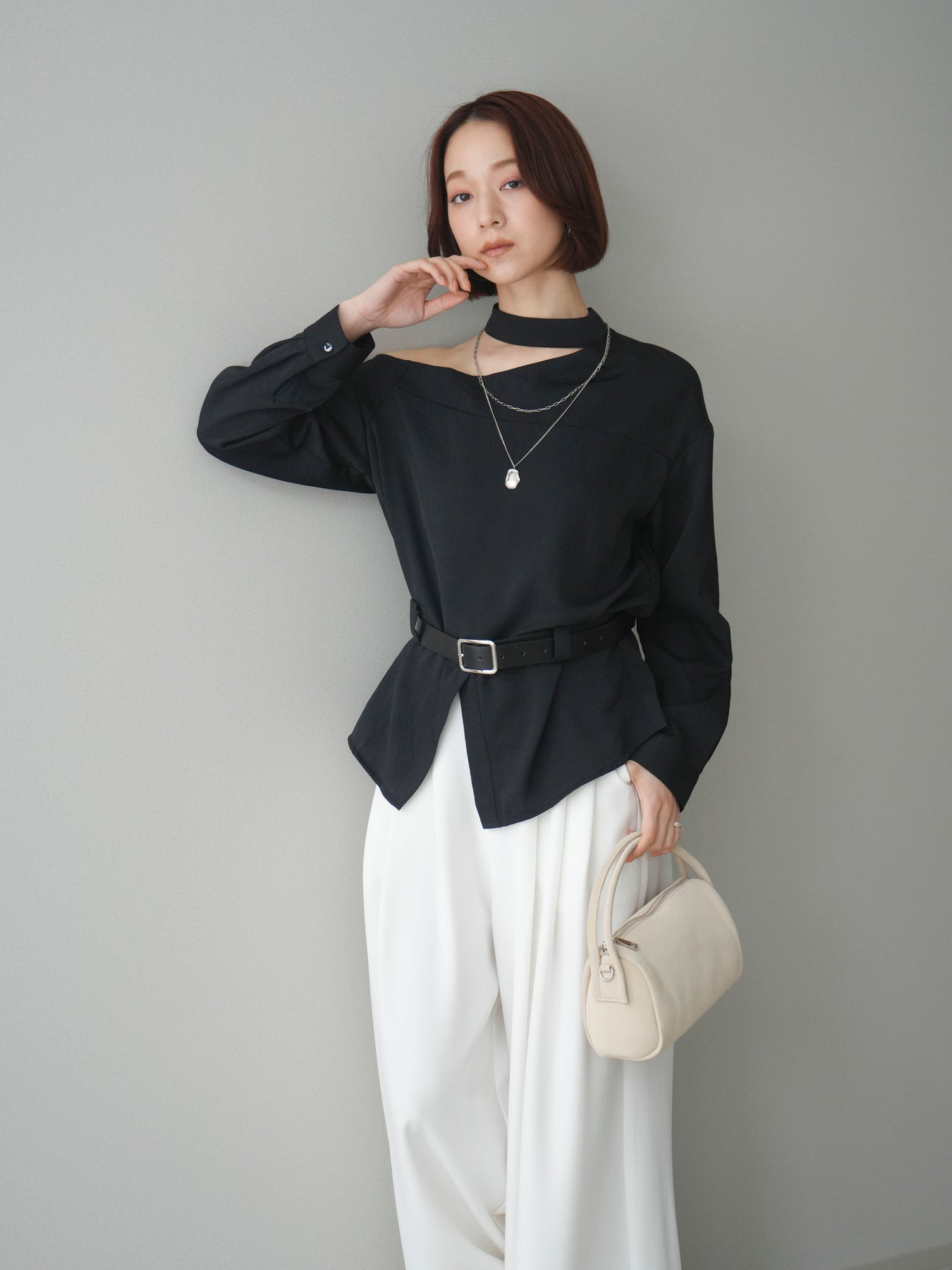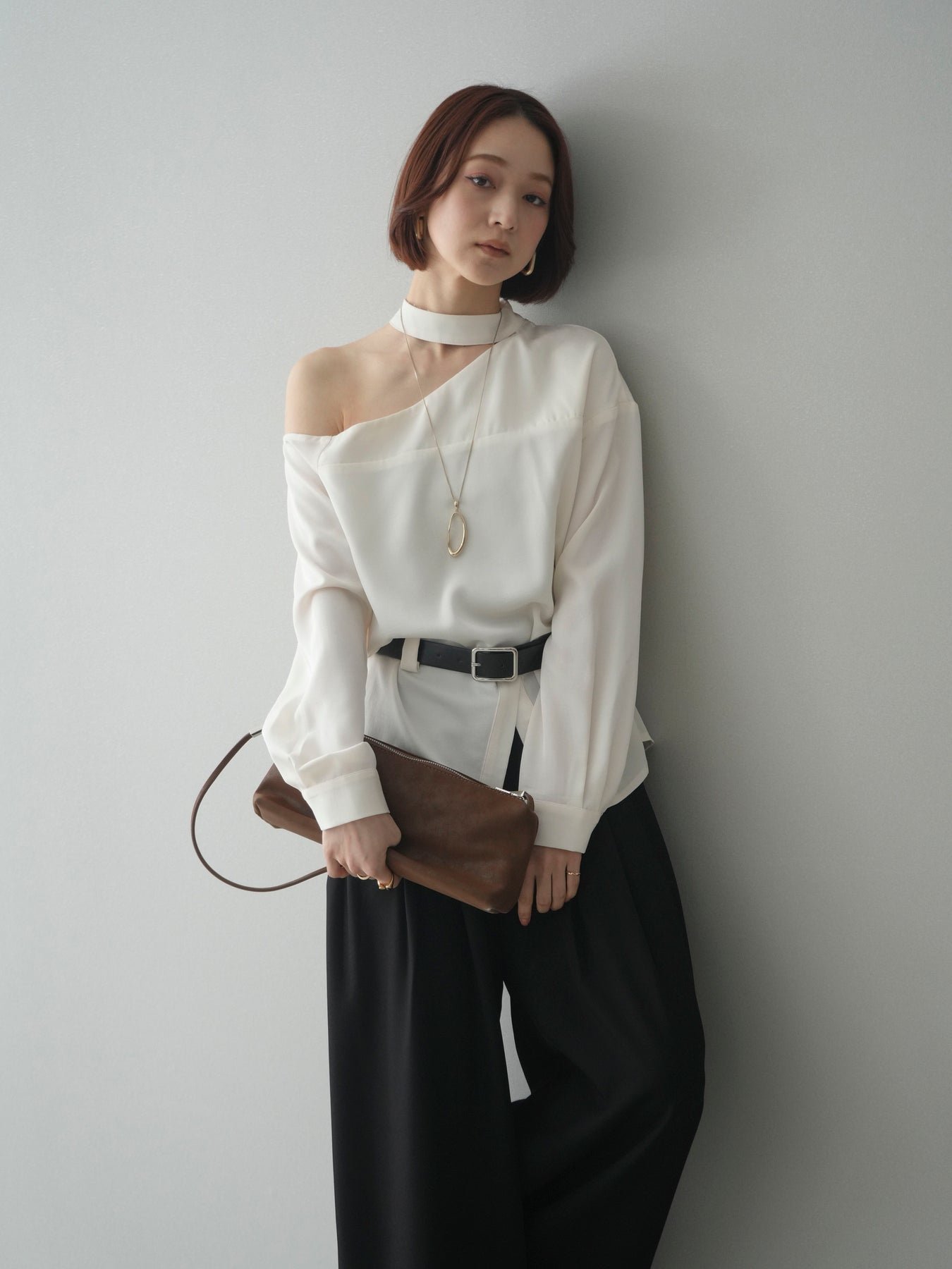 ◆ [予約]ベルト付ワンショルダースリットブラウス