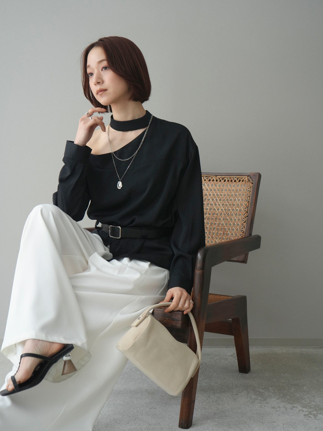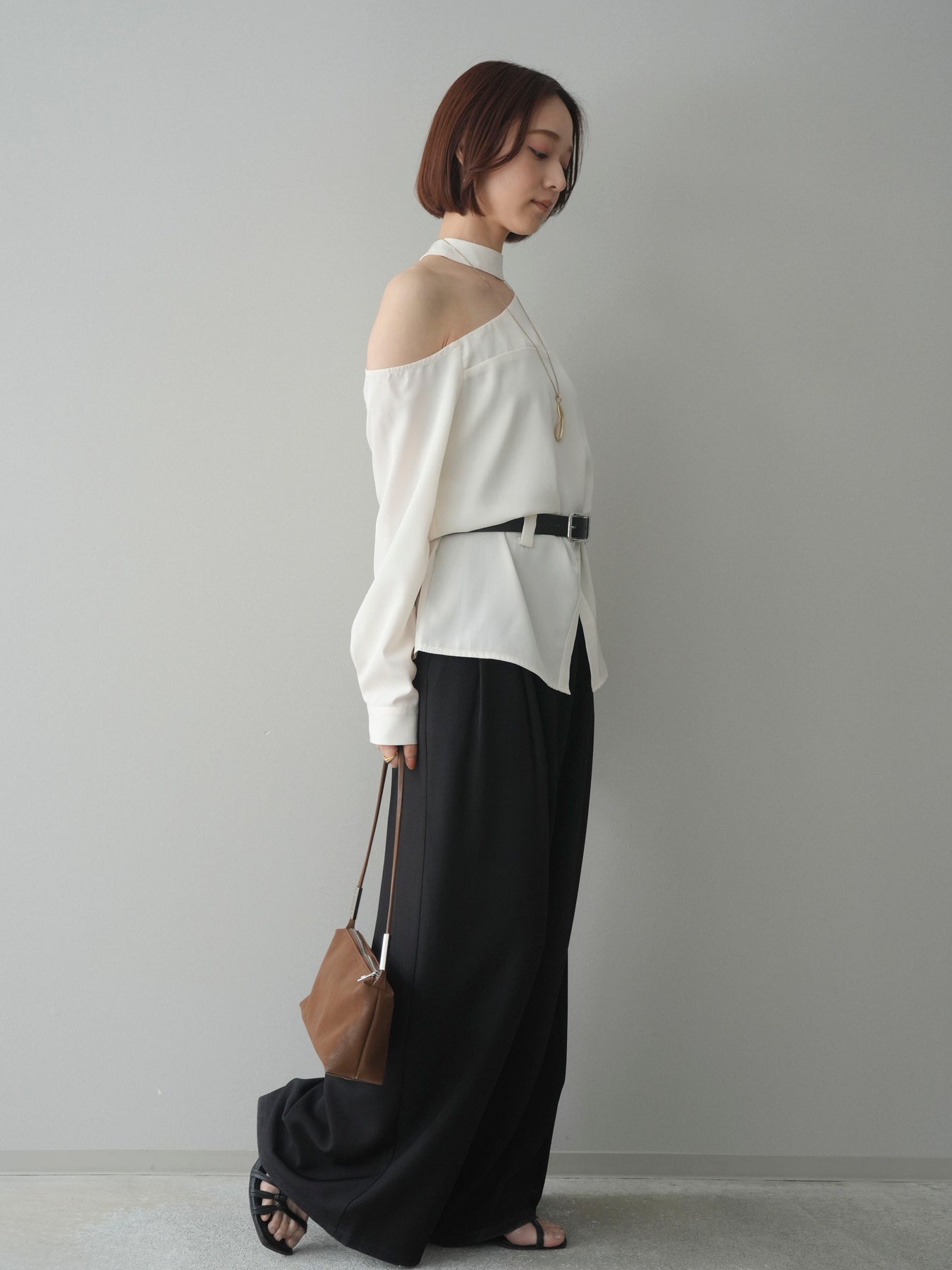 程よい肌見せが叶うワンショルダーデザインが印象的なブラウス。首元のストラップディテールがアクセントとなり、シンプルながらもモードな雰囲気を演出します。ウエストマークできるベルト付きで、シルエットにメリハリをプラス。裾のスリットが抜け感を与え、スカートにもパンツにもバランスよく合わせていただける一枚です。 ※ボトムス、キャミソール(インナー)以外の商品は一律でインナーは付属していません