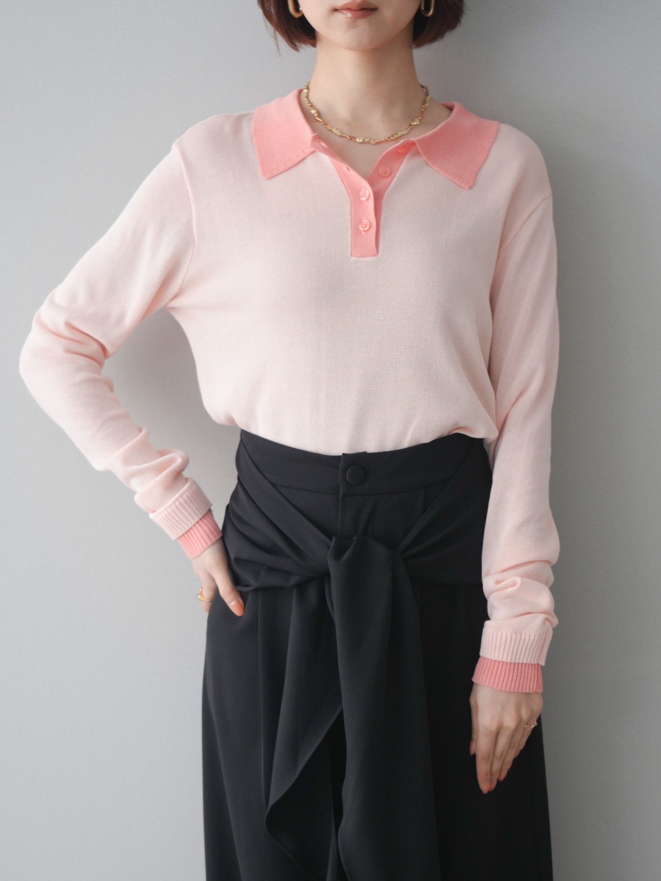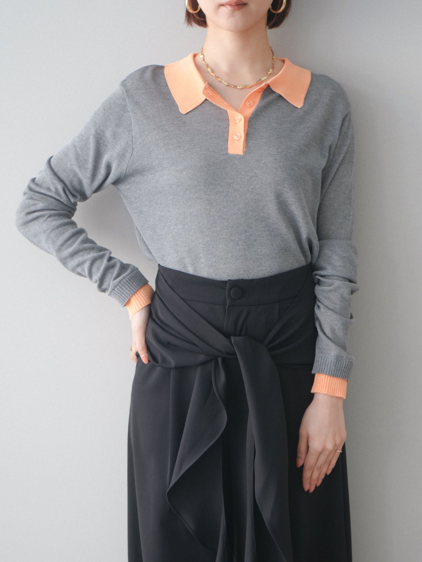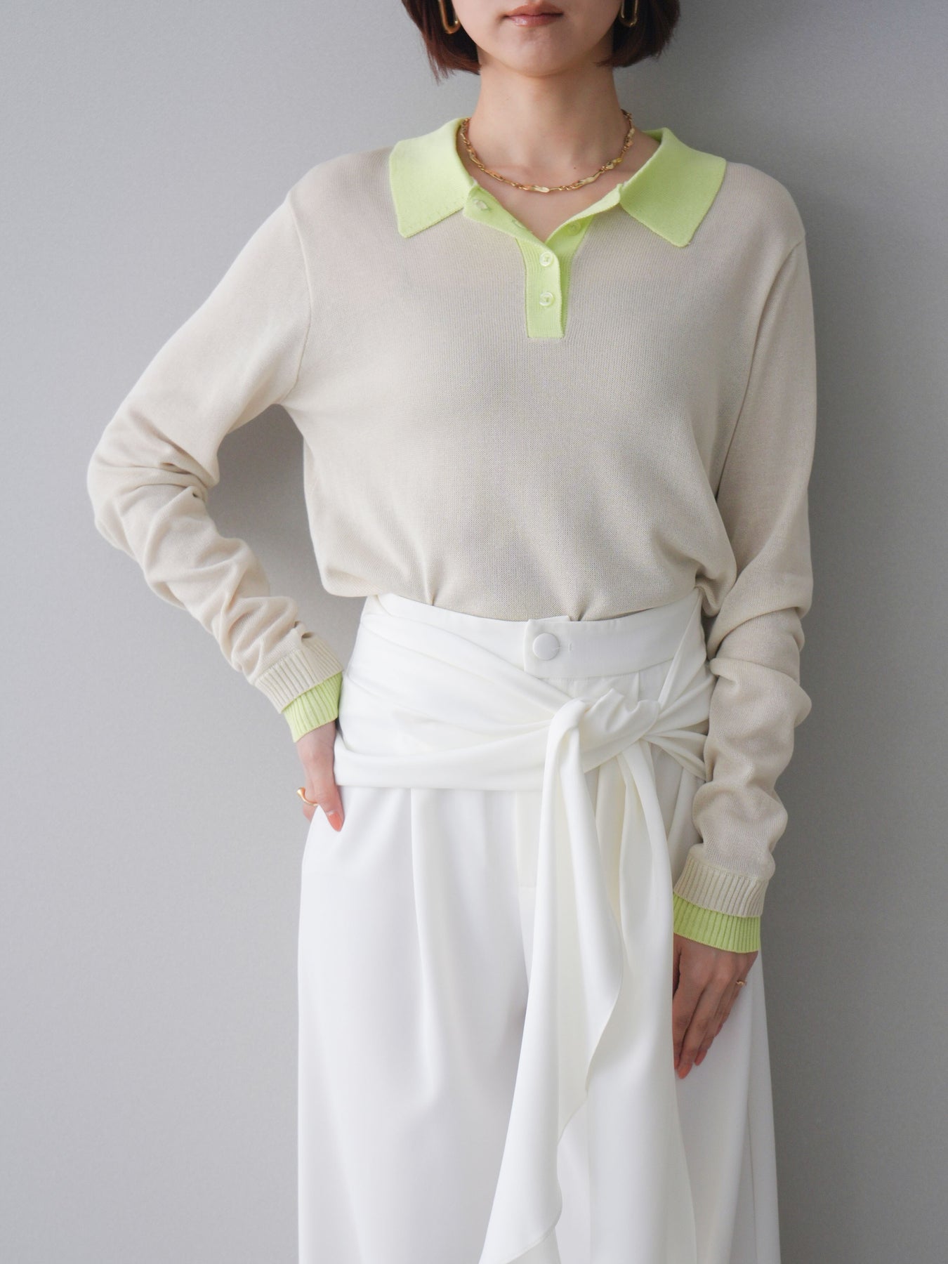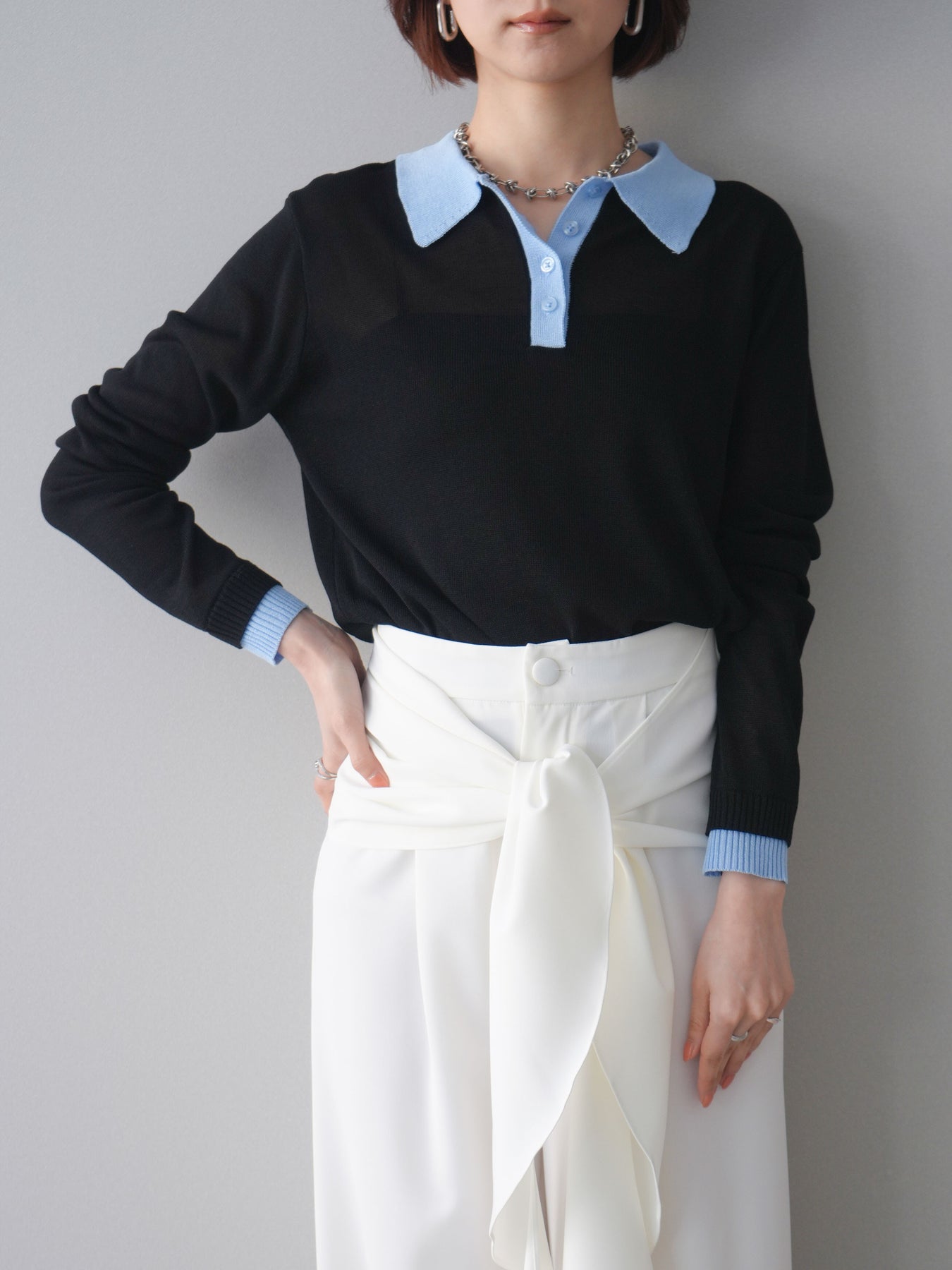 シアーな質感が軽やかな印象を与える配色デザインシアーポロニット。襟元や前立て、袖口に施したコントラストカラーがさりげないアクセントになり、シンプルながらも目を惹く一枚に仕上がっています。程よくゆとりのあるシルエットで抜け感を演出し、ボタンを開けてラフに着こなすのもおすすめ。デニムやスラックス、スカートまで幅広いボトムスと相性が良く、コーディネートに新鮮さをプラスしてくれるアイテムです。