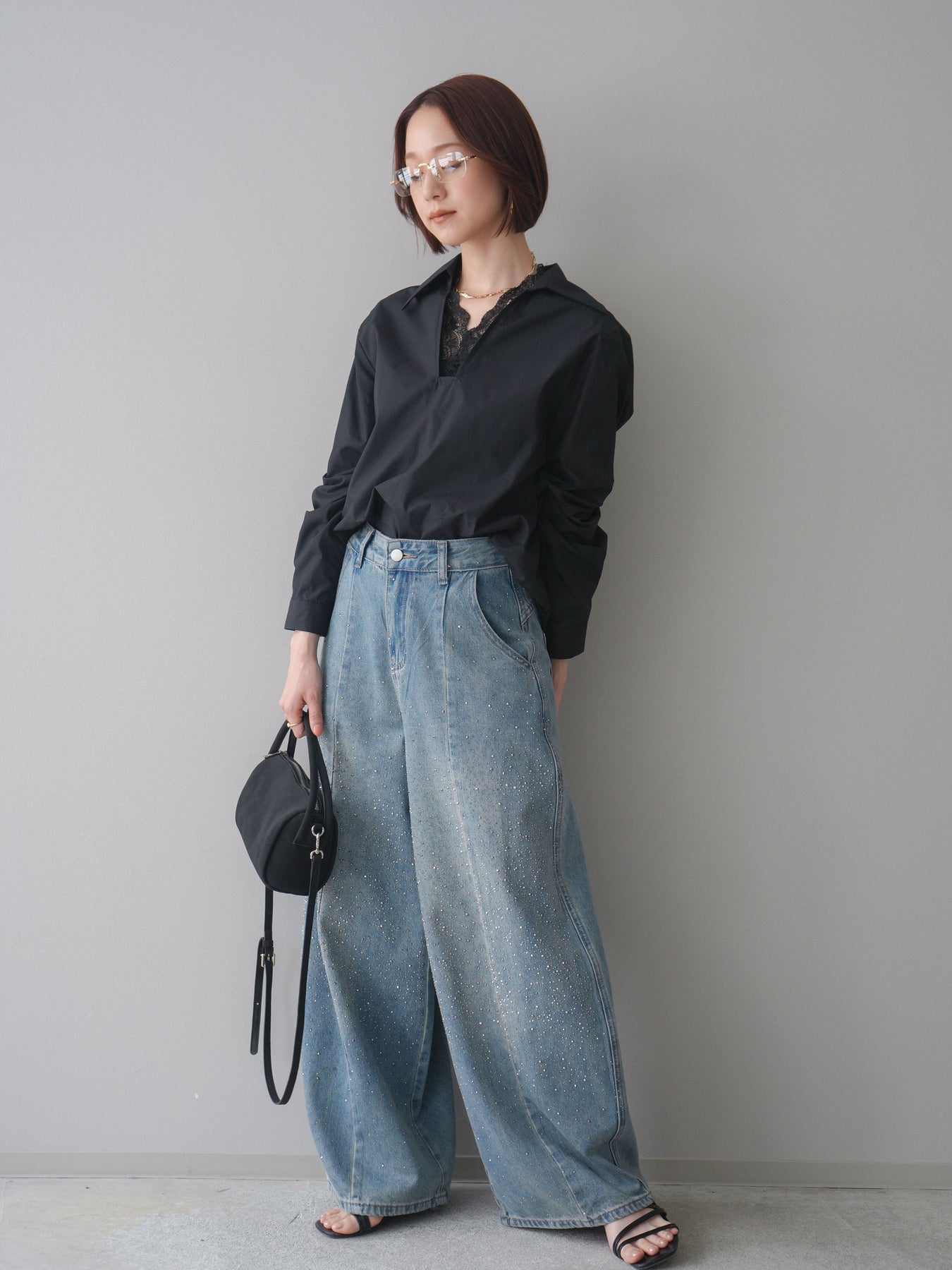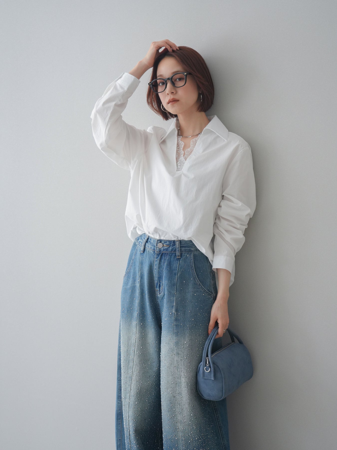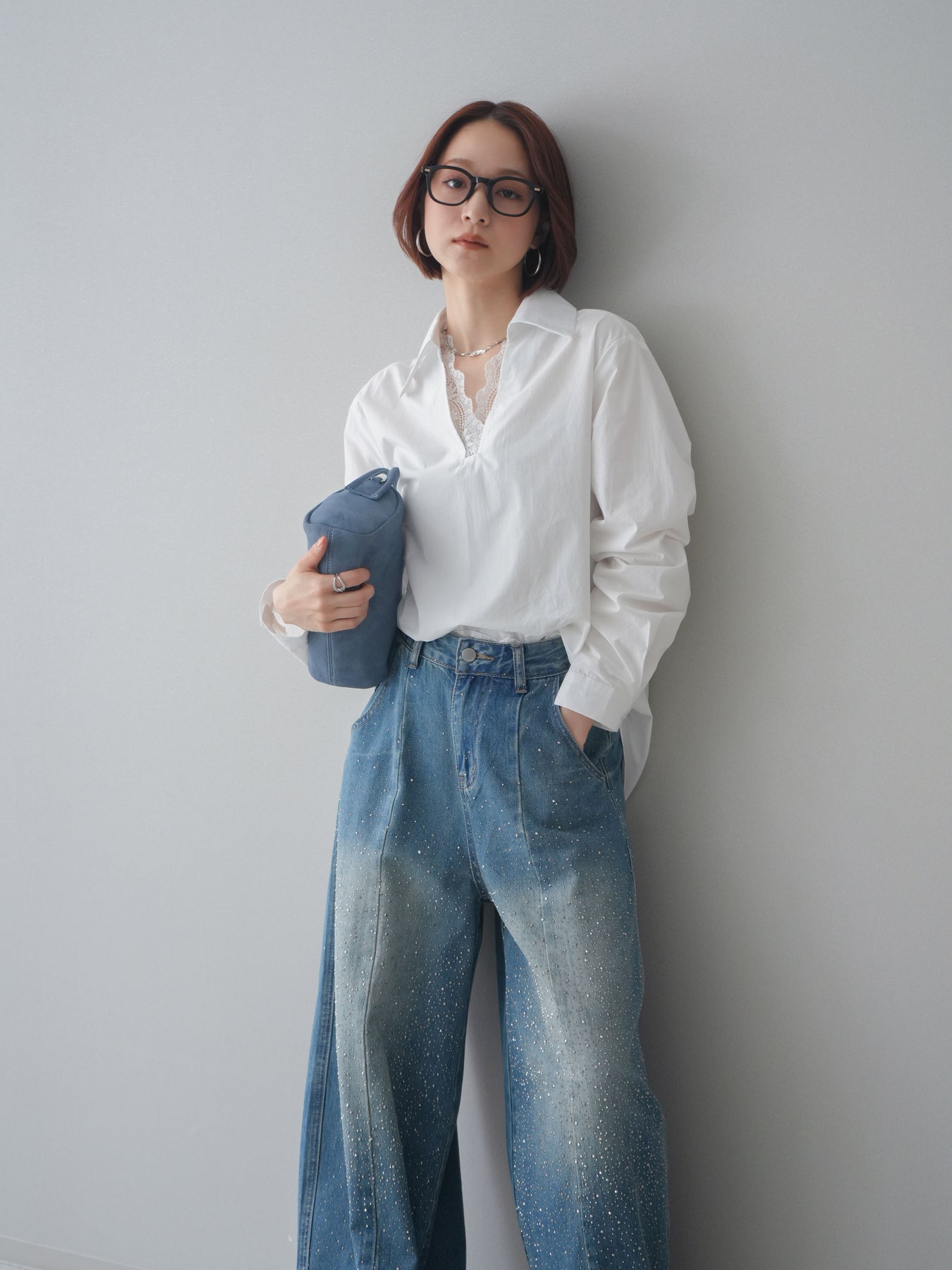 [SET]レースネックスキッパーブラウス+フロントビジューカーブデニムパンツ(2set)